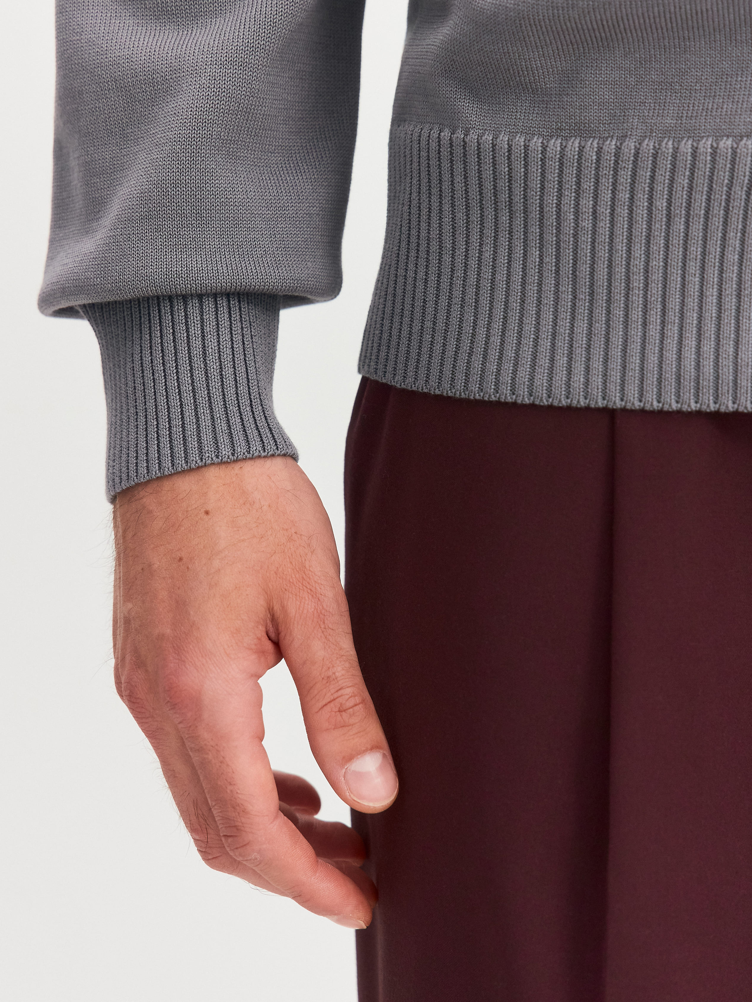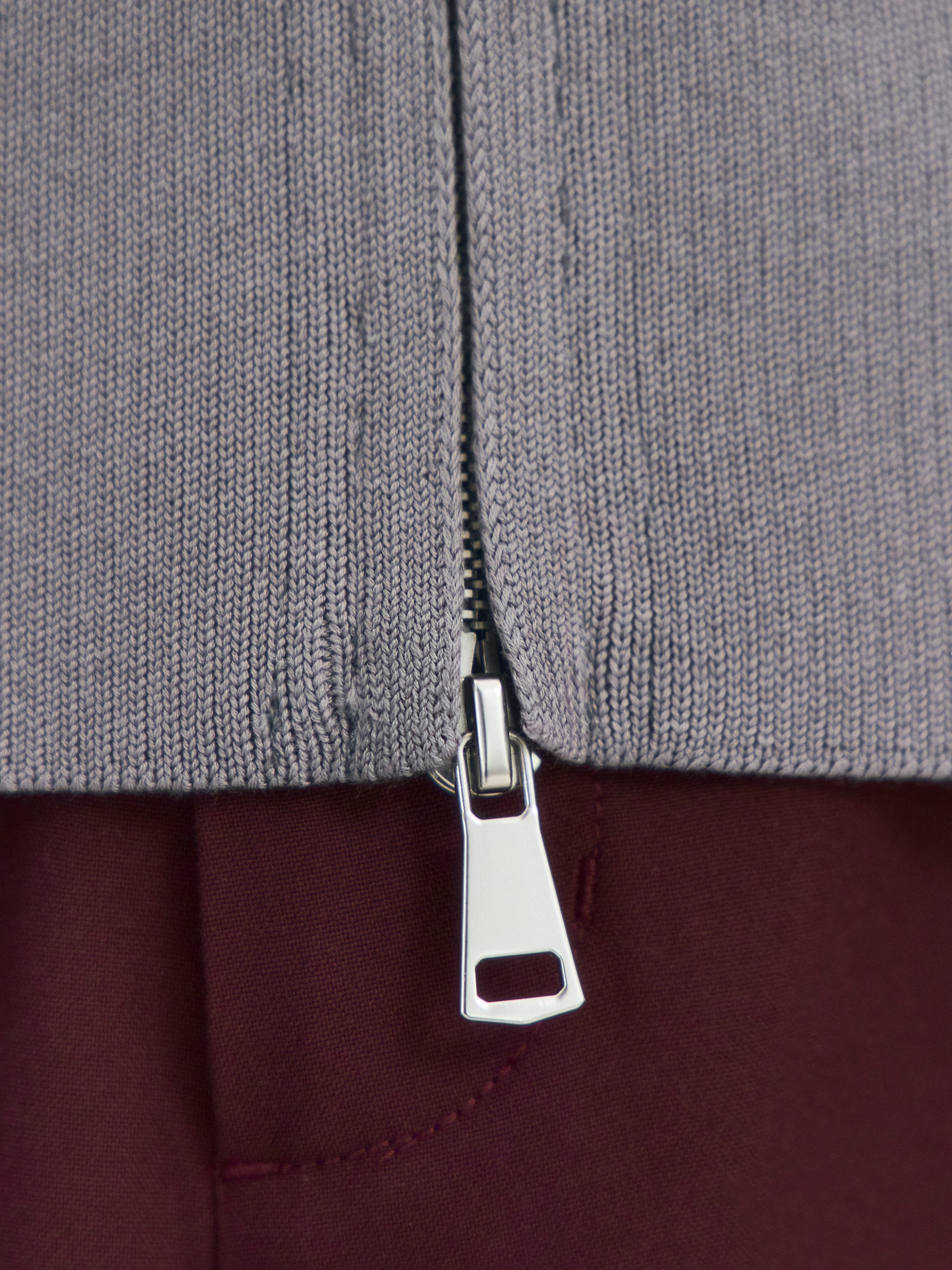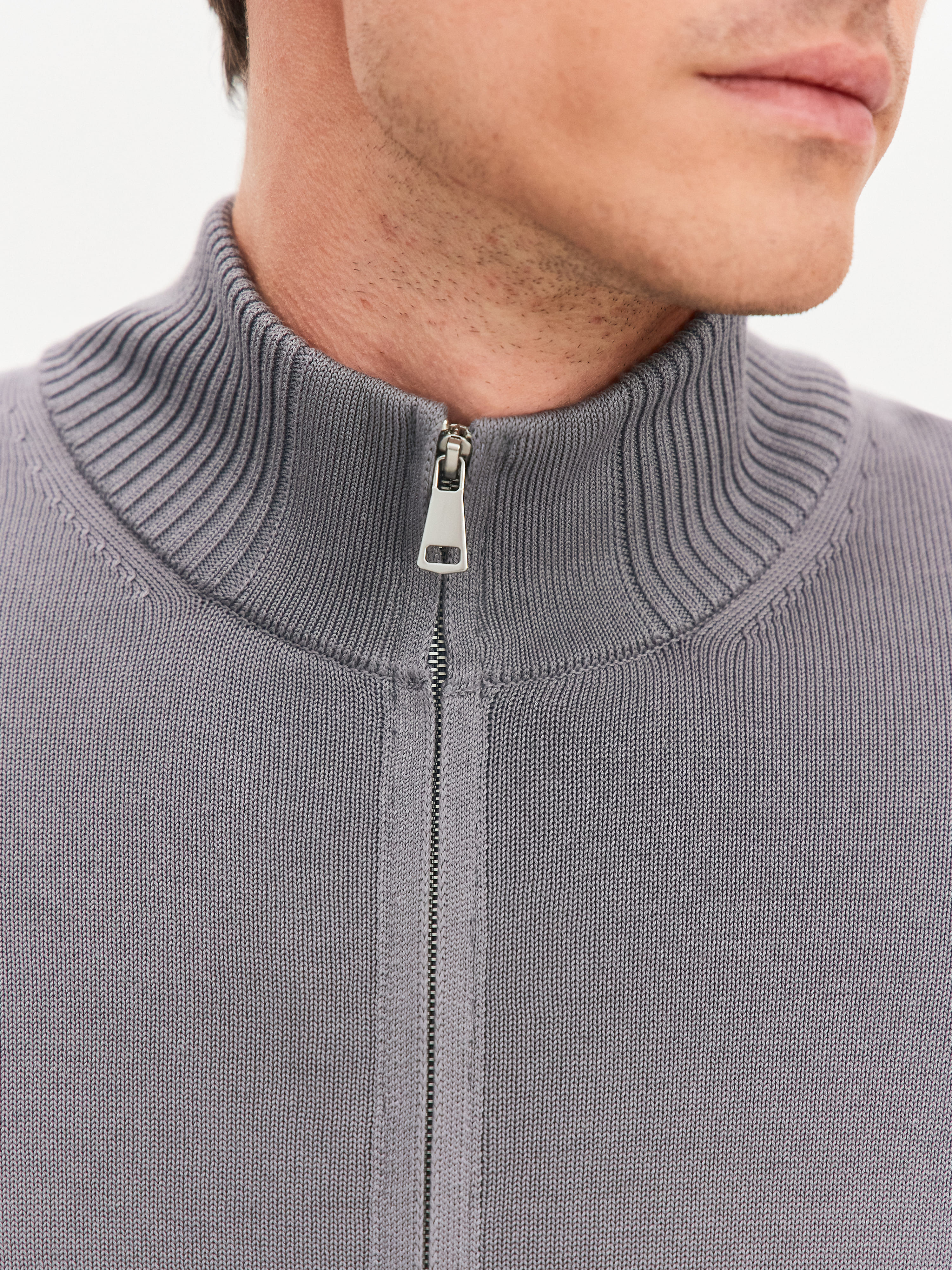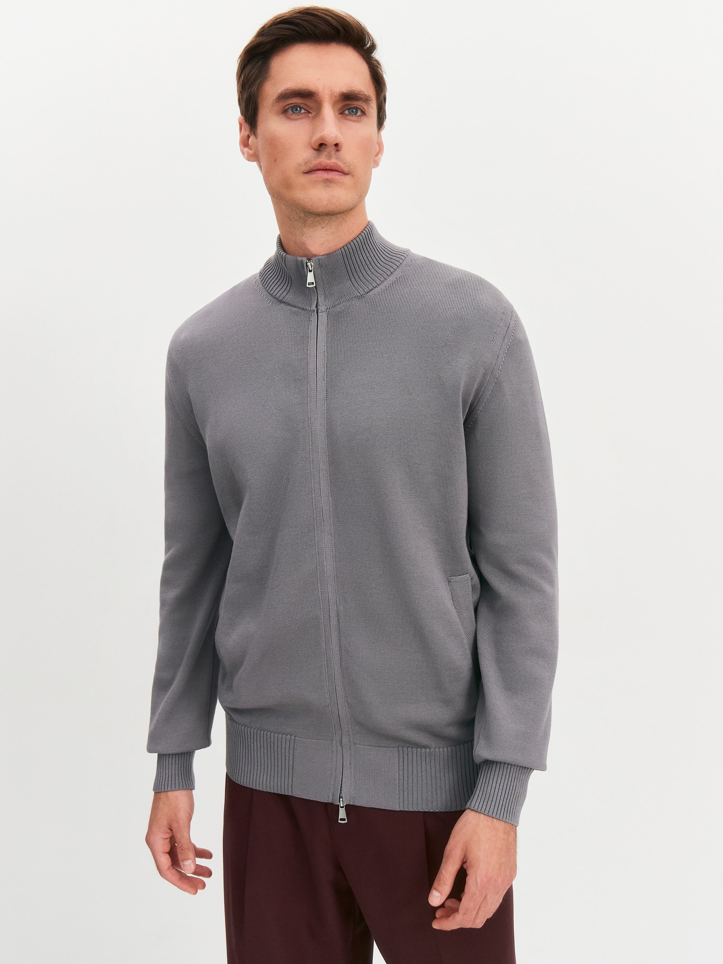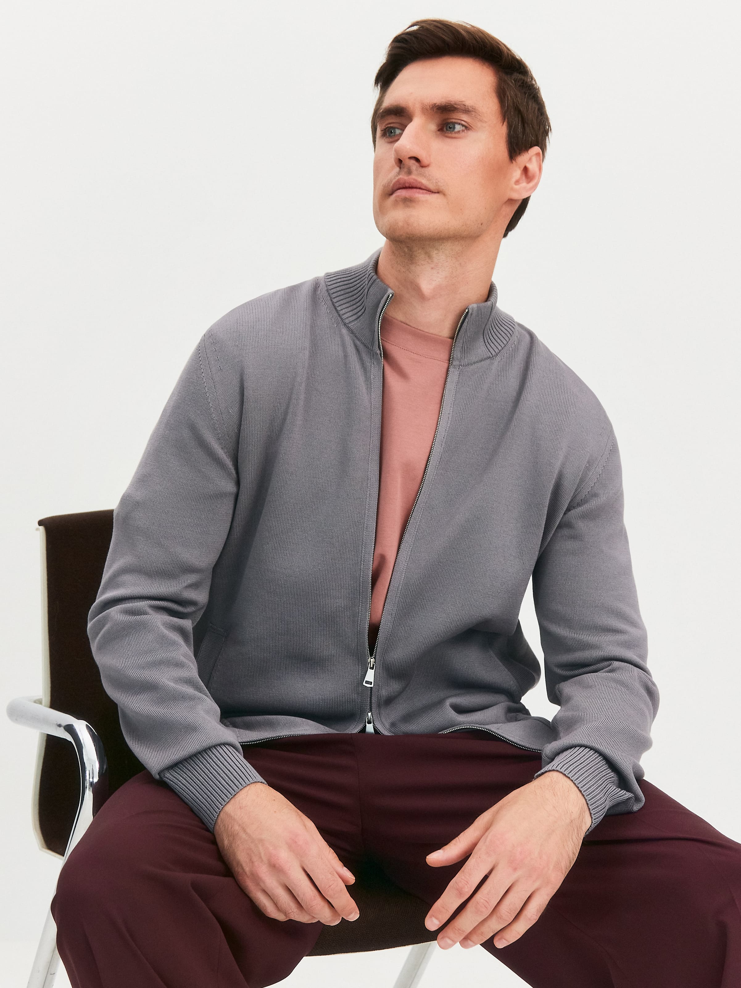 Хлопковый кардиган из гладкого трикотажа с застежкой на металлическую молнию. Дополнен двухслойным воротником стойкой и парой вместительных карманов, оформленных листочкой. Низ изделия собран на широкую эластичную резинку. Манжеты с плотным обхватом комфортно сдвигаются вверх по линии запястья, позволяя регулировать длину рукава. Свободный крой оставляет достаточно места для любимой футболки или офисной рубашки. Двухзамковая молния расстегивается в двух направлениях.