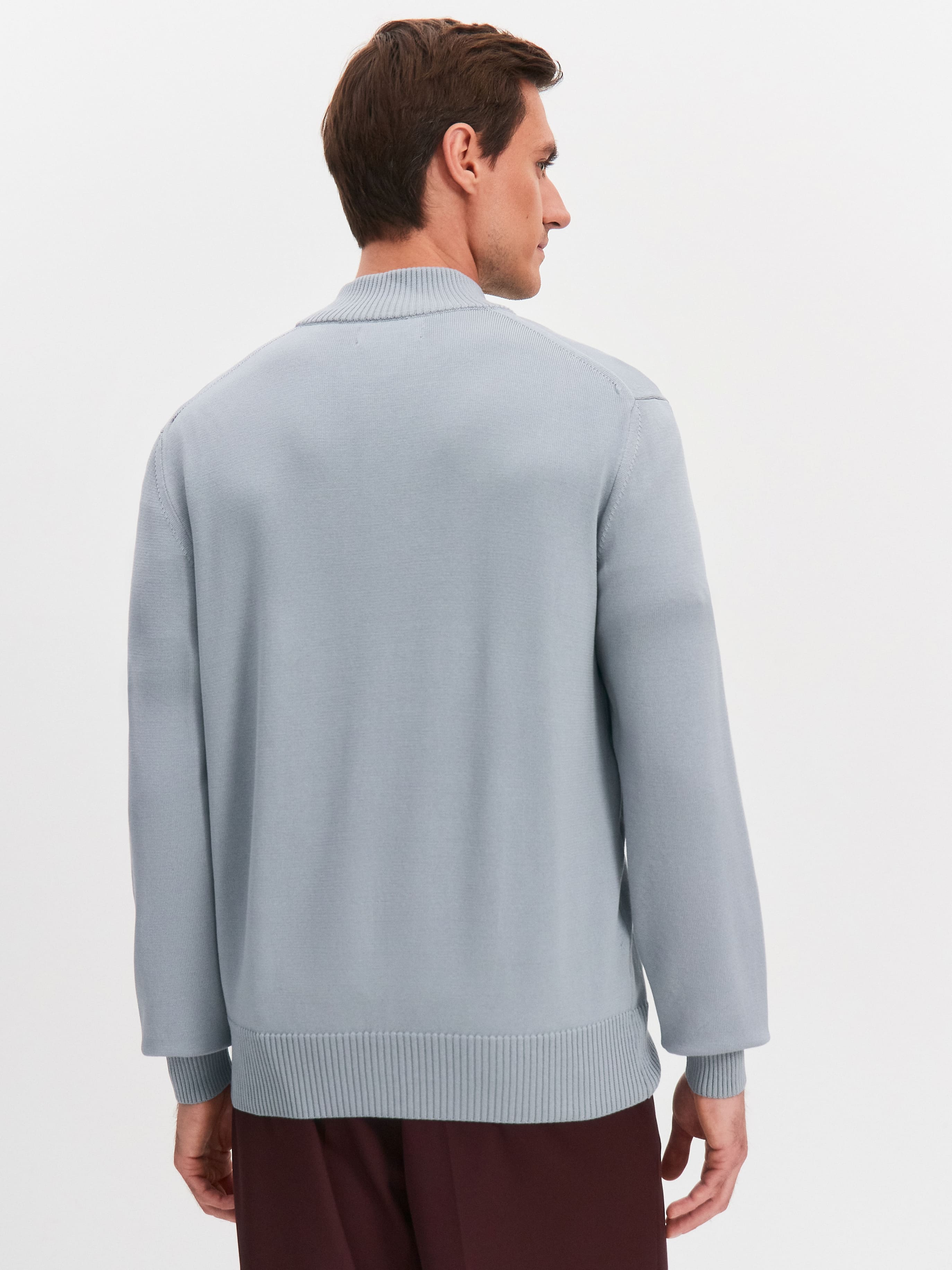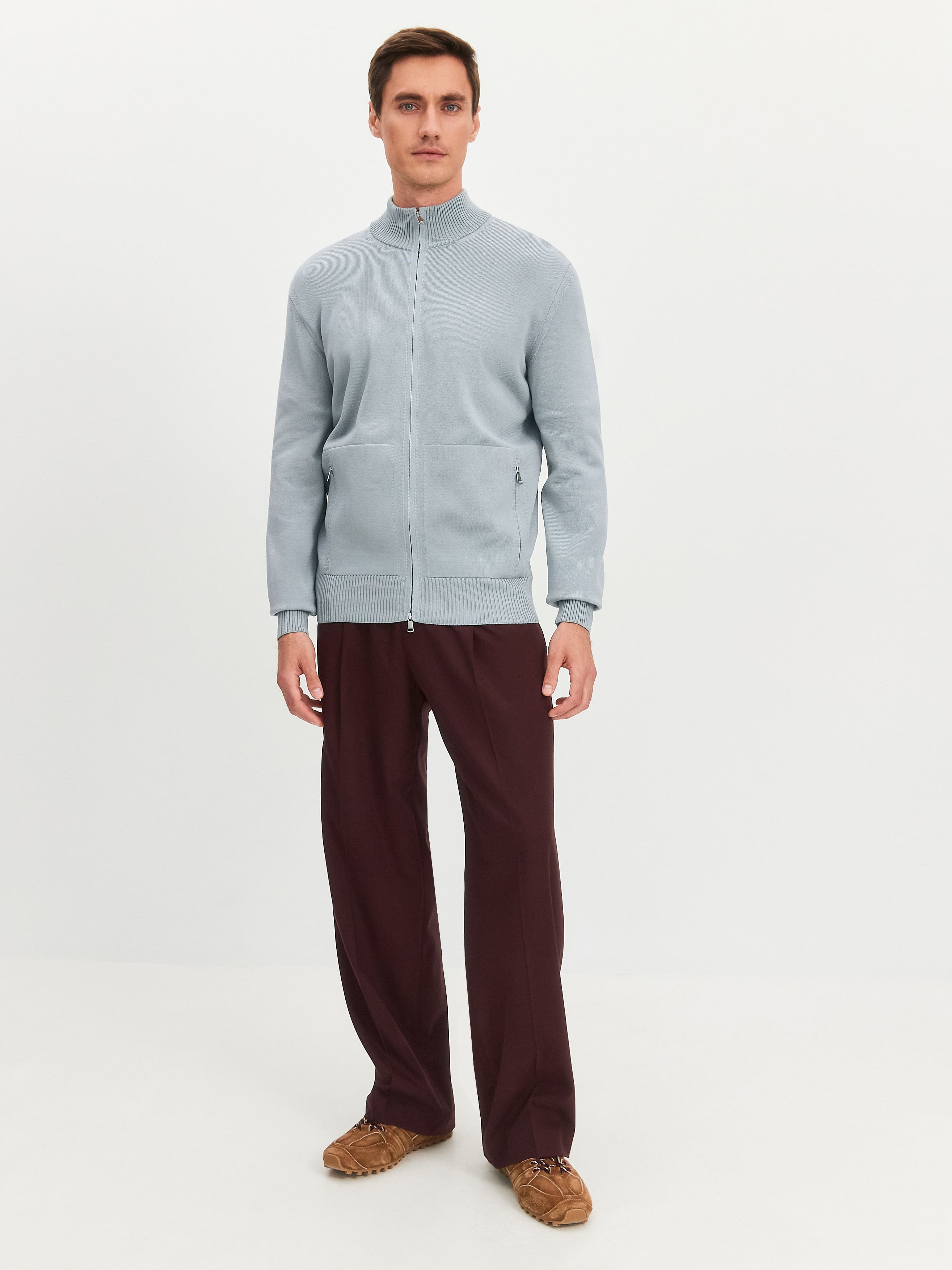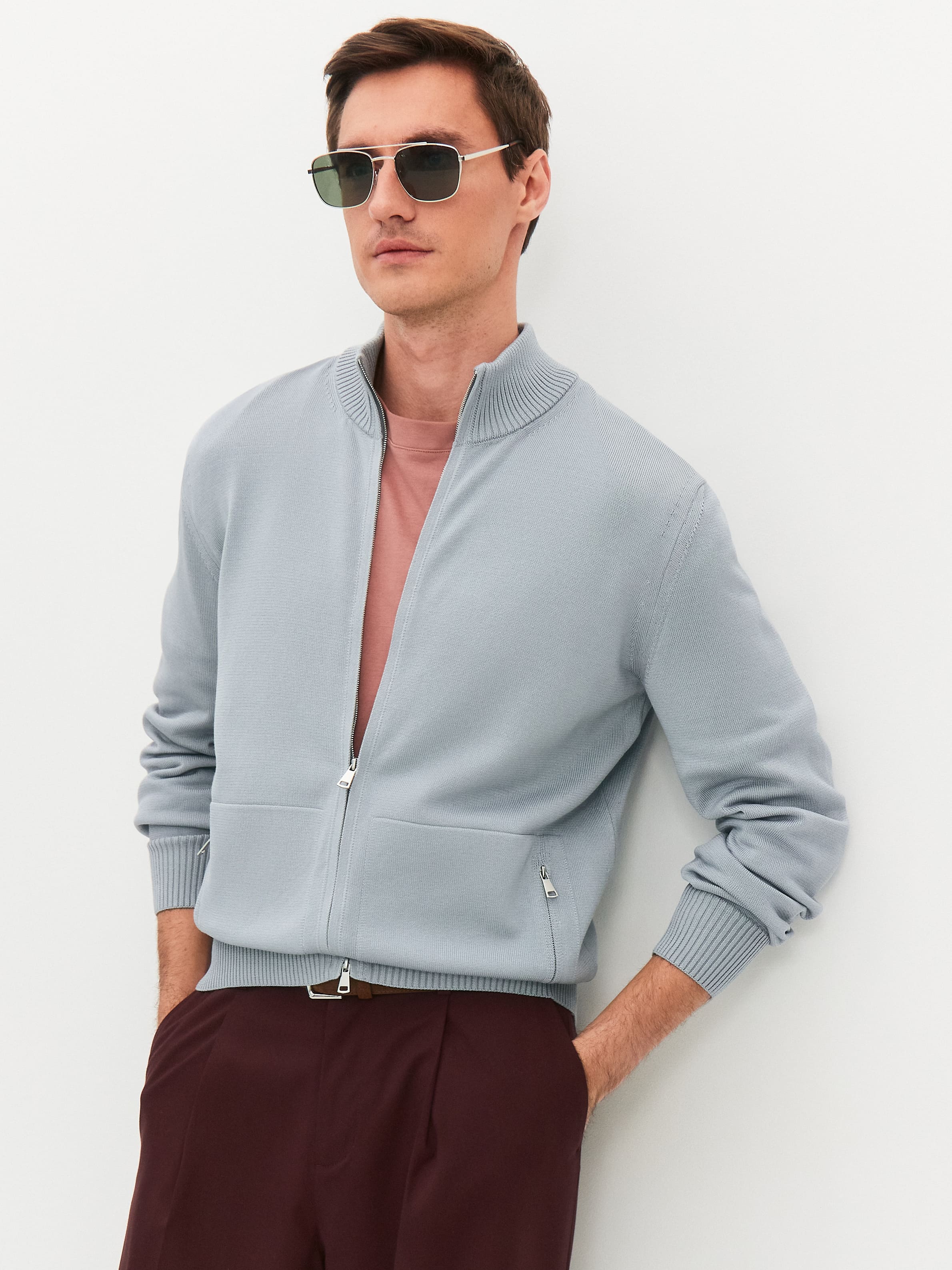 Мужской хлопковый кардиган на двухзамковой молнии. Универсальная модель для насыщенных будней и комфортного отпуска. Уплотненная двойная горловина обеспечивает мягкое прилегание к шее. Эластичные манжеты позволяют менять высоту рукава без подворота – резинку можно стягивать к локтю или по линии запястья. Маленькие акцентные штрихи – горизонтальная строчка на полочках и сложная конструкция прорезных карманов на металлической молнии. Трикотажное полотно связано в плотной, формоустойчивой технике. Кардиган надежно защищает от сквозняков и прохладных температур, сохраняя безупречную тактильность. Аккуратная резинка в нижней части – это фиксатор силуэта, который не позволяет трикотажу тянуться вниз.