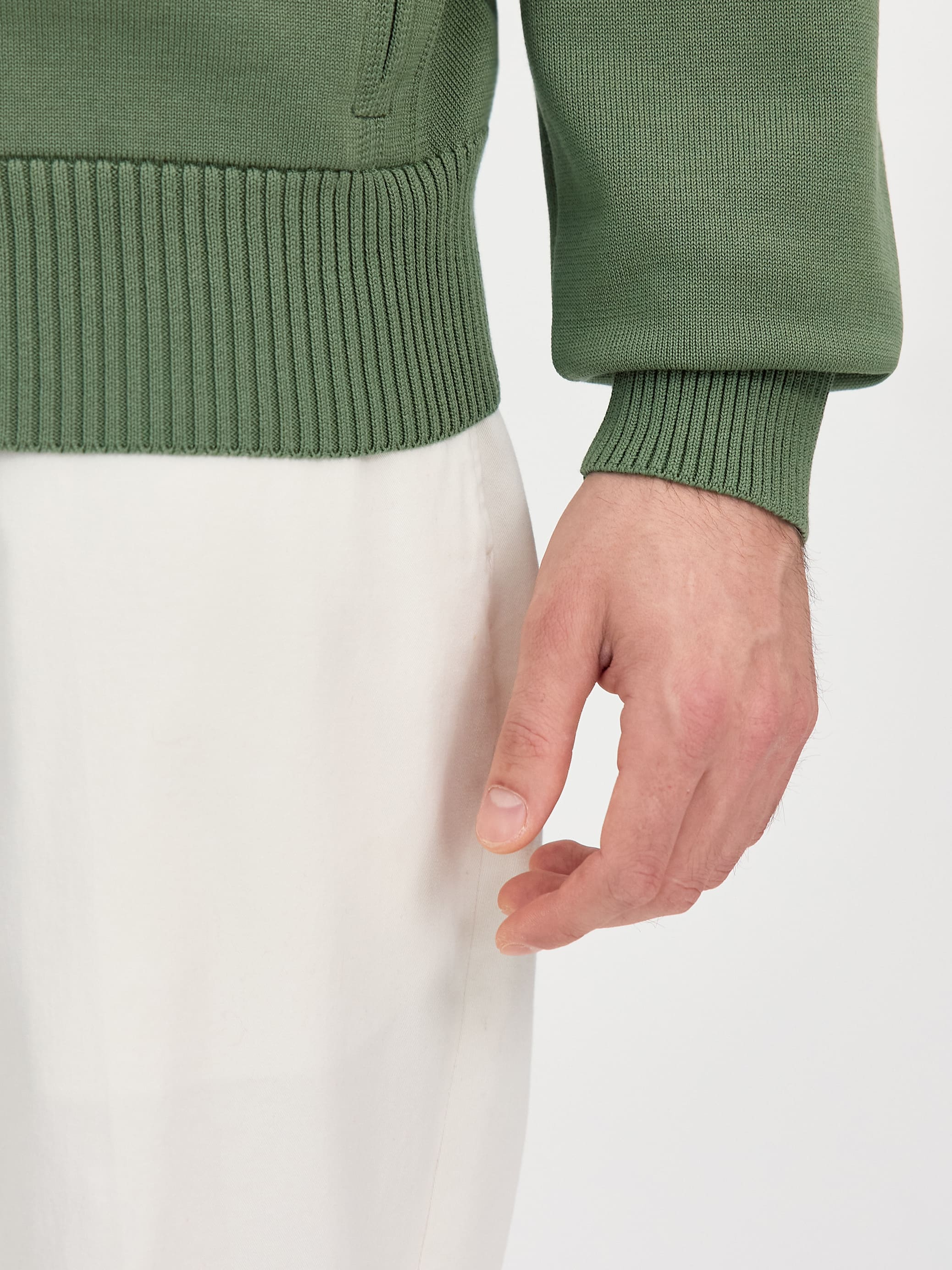 Мужской хлопковый кардиган на двухзамковой молнии. Универсальная модель для насыщенных будней и комфортного отпуска. Уплотненная двойная горловина обеспечивает мягкое прилегание к шее. Эластичные манжеты позволяют менять высоту рукава без подворота – резинку можно стягивать к локтю или по линии запястья. Маленькие акцентные штрихи – горизонтальная строчка на полочках и сложная конструкция прорезных карманов на металлической молнии. Трикотажное полотно связано в плотной, формоустойчивой технике. Кардиган надежно защищает от сквозняков и прохладных температур, сохраняя безупречную тактильность. Аккуратная резинка в нижней части – это фиксатор силуэта, который не позволяет трикотажу тянуться вниз.
