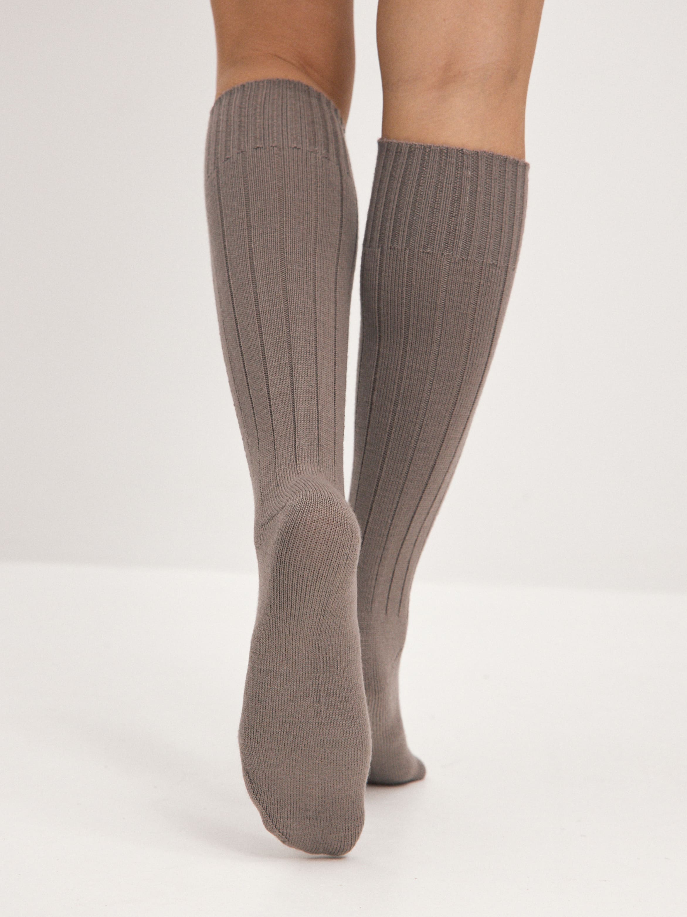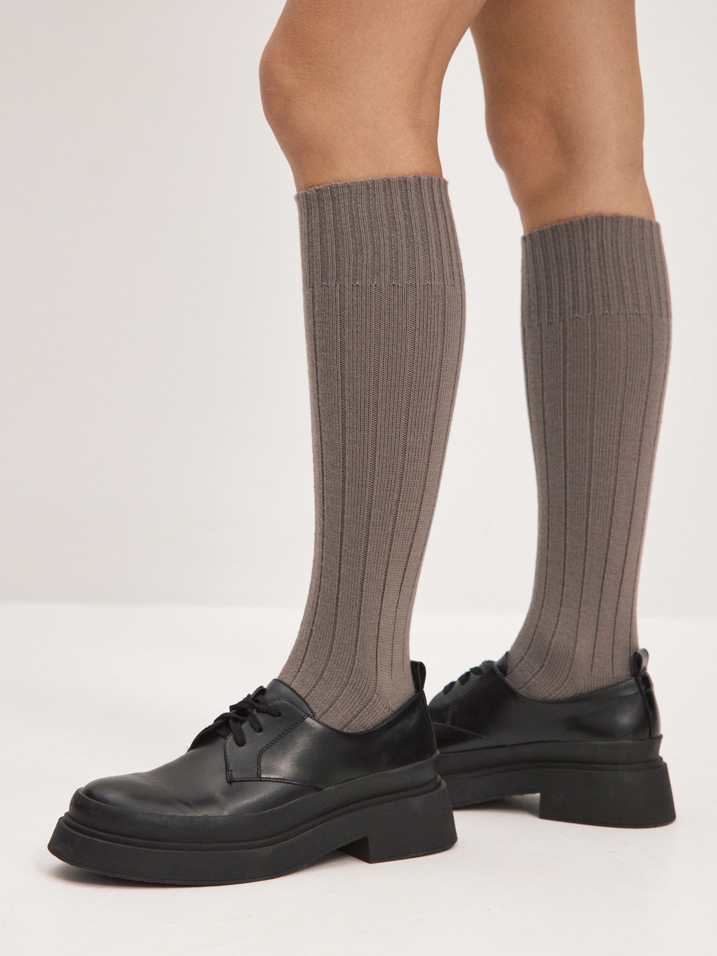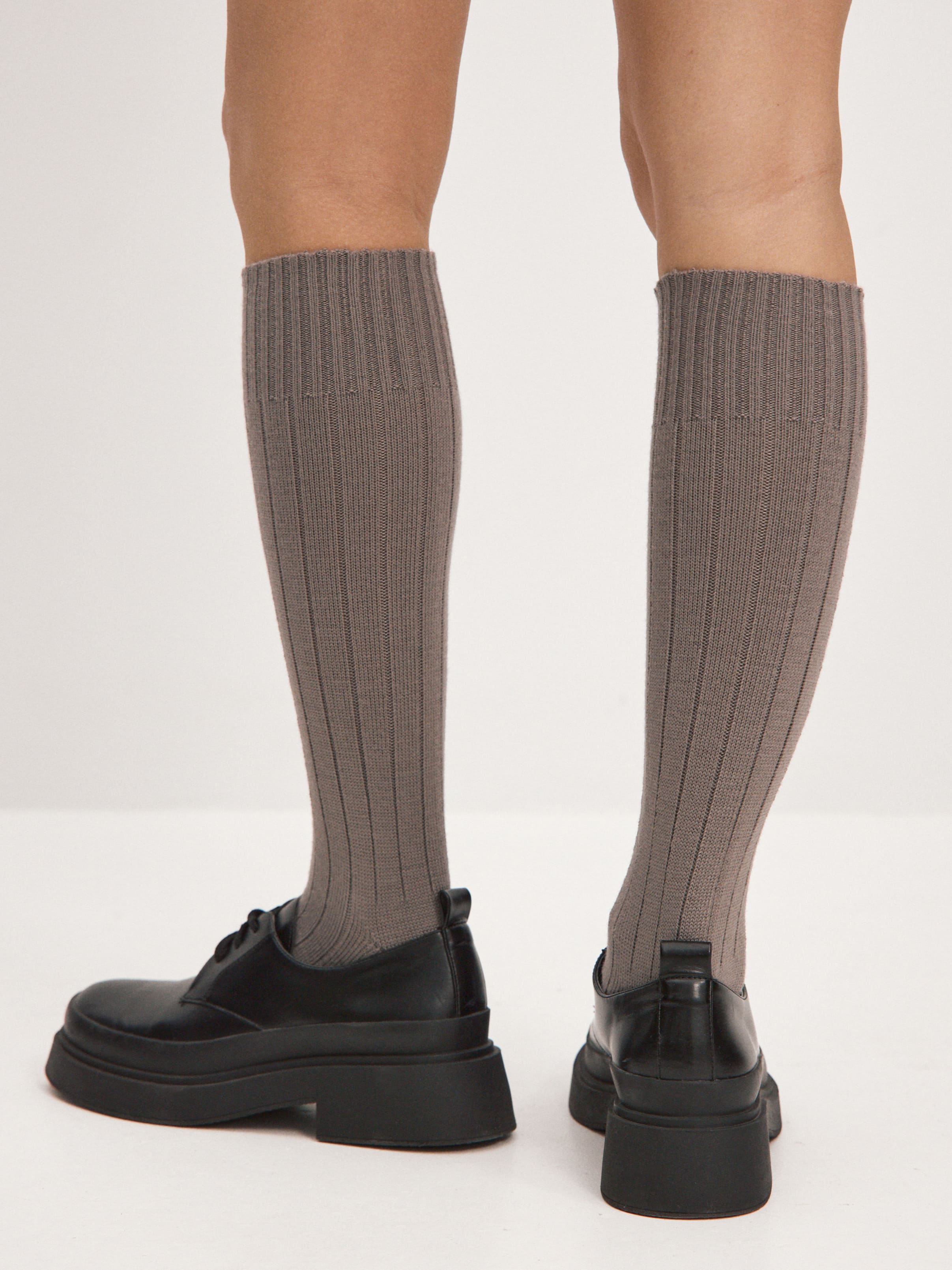 Гольфы из шелковистой мериносовой шерсти с уплотненным мыском и эластичной вязаной резинкой по краю. Выполнены в технике лапша, чтобы плотно облегать голень и не сползать в движении. Благодаря классической длине, корректируют настроение образа в нескольких направлениях. Приспущенные, собранные складкой или подвернутые гольфы отлично рифмуются с грубыми ботинками, кроссовками и ботильонами. Можно включить аксессуар в небанальный тандем с сапогами – выберите максимально контрастный оттенок трикотажа и позвольте верхней трети гольфа выглядывать из-под голенища обуви.