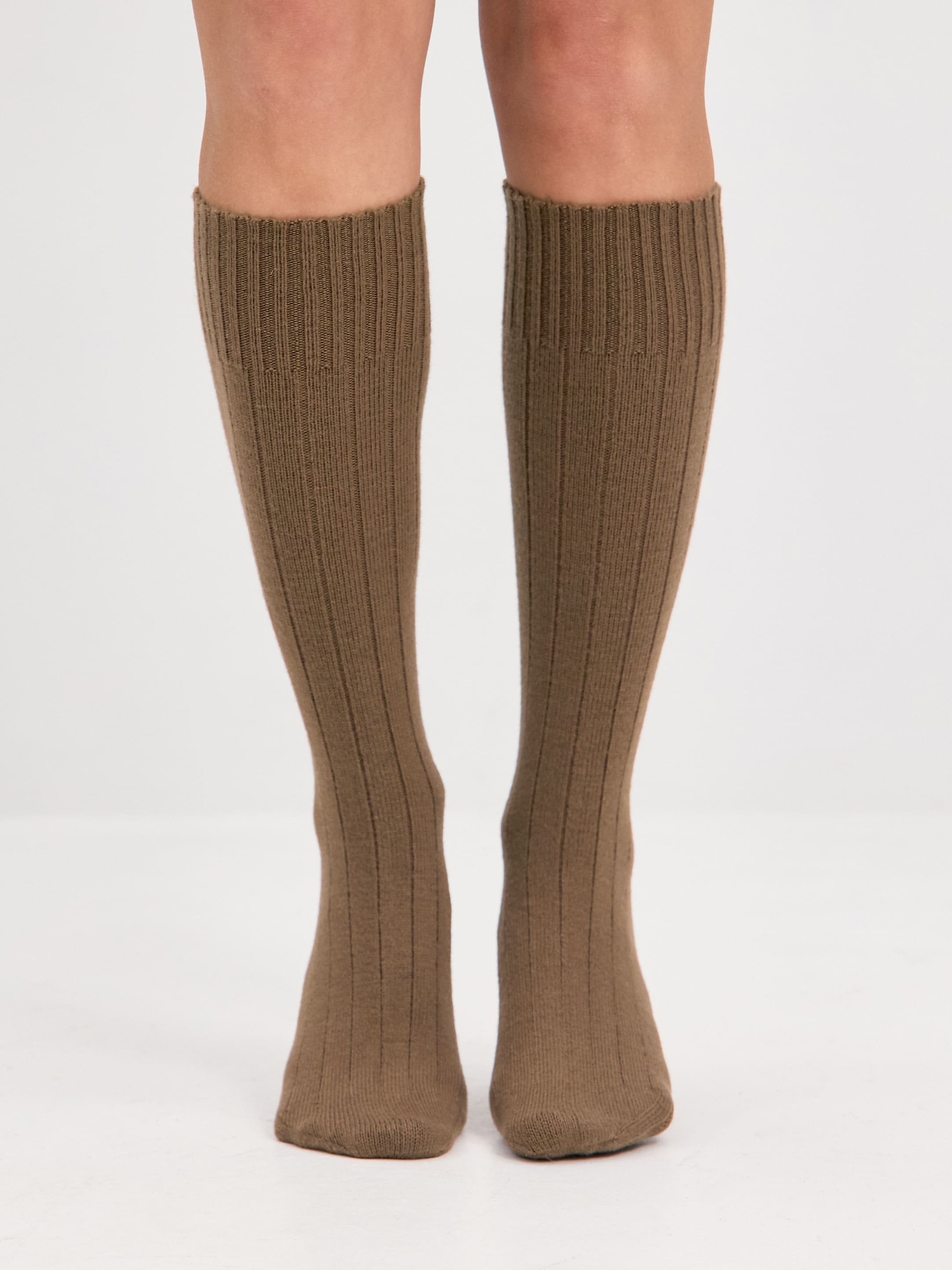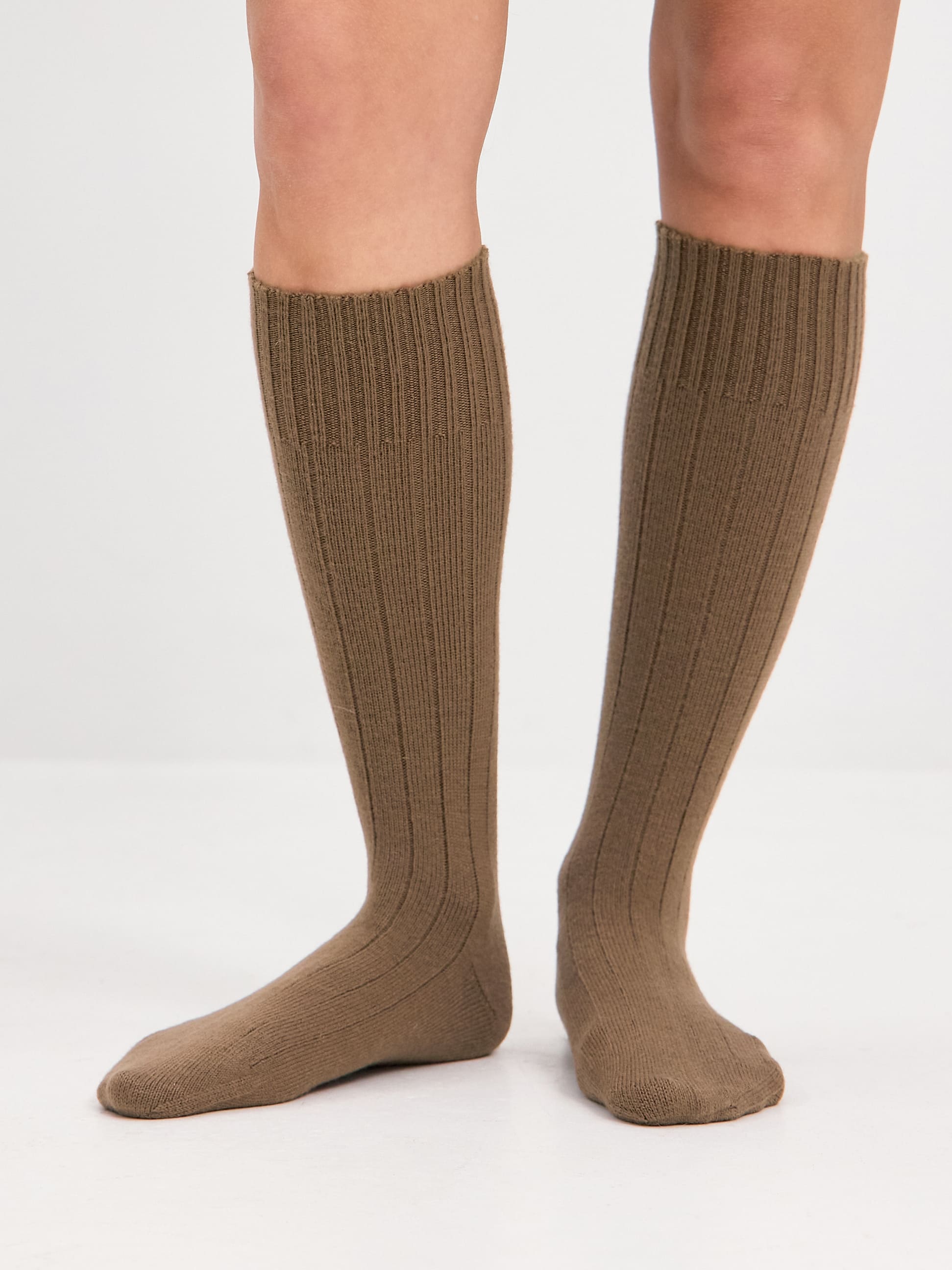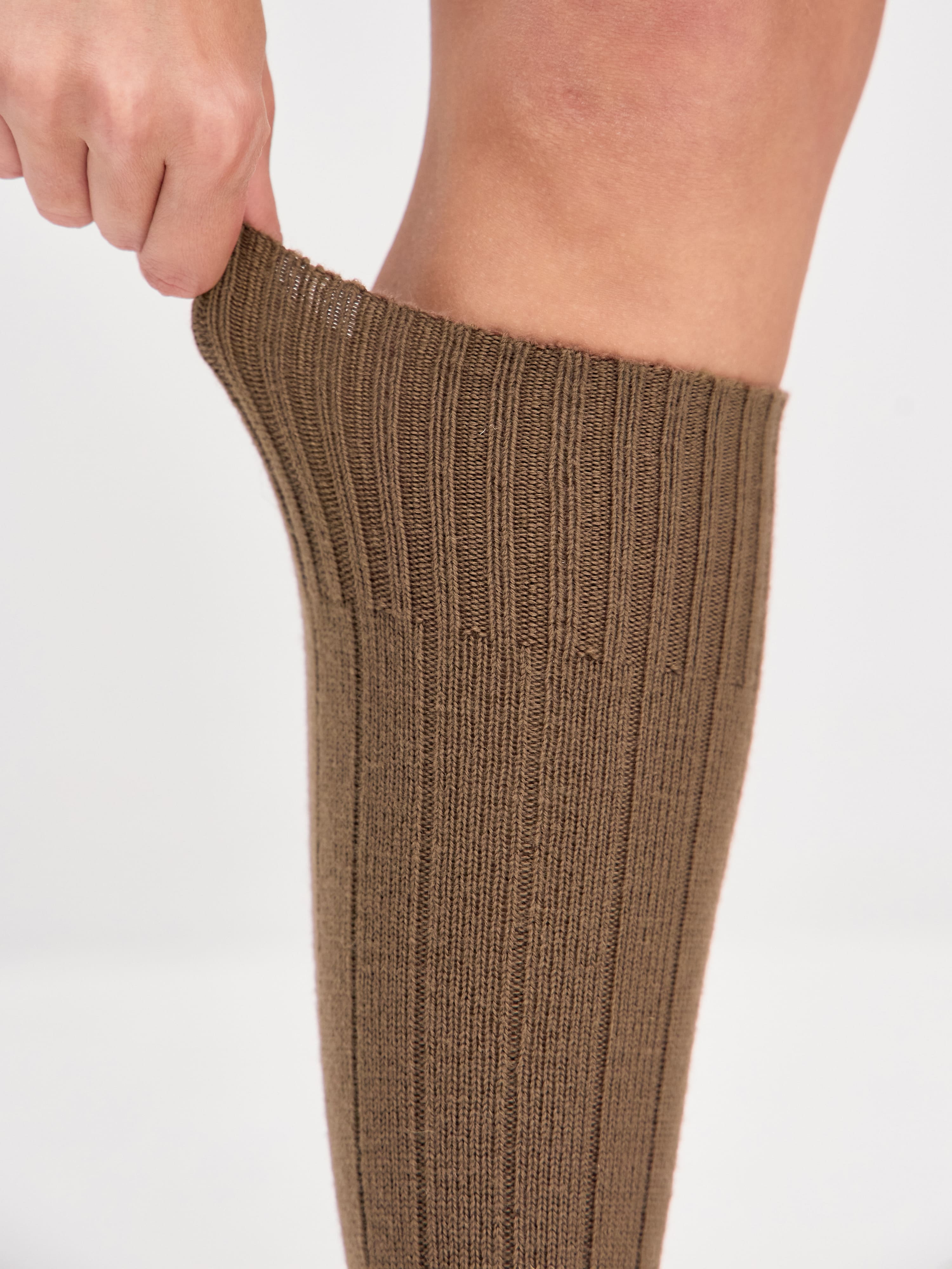 Гольфы из шелковистой мериносовой шерсти с уплотненным мыском и эластичной вязаной резинкой по краю. Выполнены в технике лапша, чтобы плотно облегать голень и не сползать в движении. Благодаря классической длине, корректируют настроение образа в нескольких направлениях. Приспущенные, собранные складкой или подвернутые гольфы отлично рифмуются с грубыми ботинками, кроссовками и ботильонами. Можно включить аксессуар в небанальный тандем с сапогами – выберите максимально контрастный оттенок трикотажа и позвольте верхней трети гольфа выглядывать из-под голенища обуви.