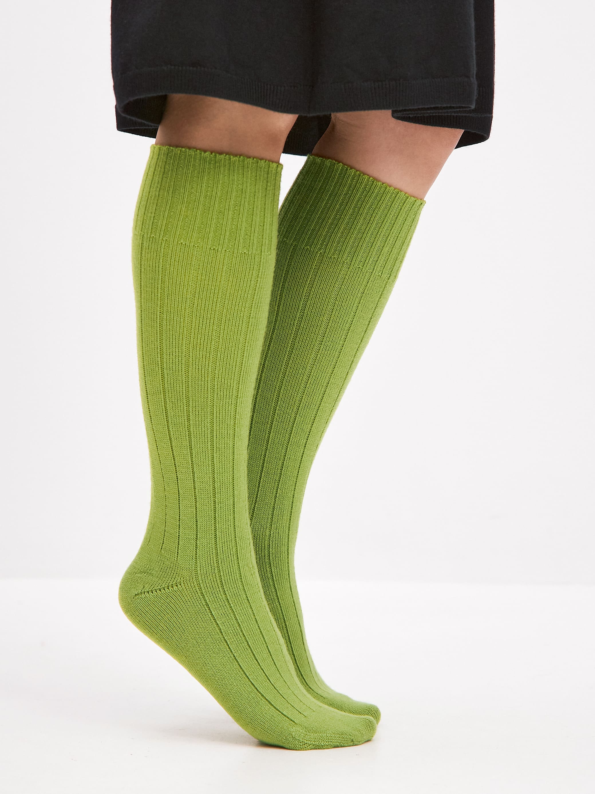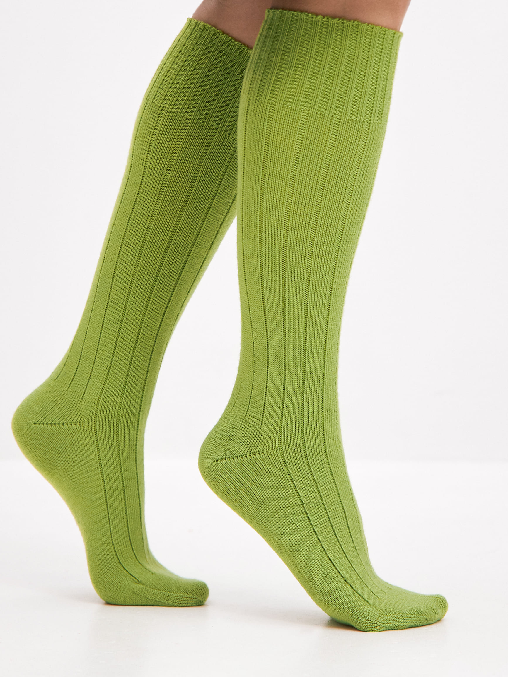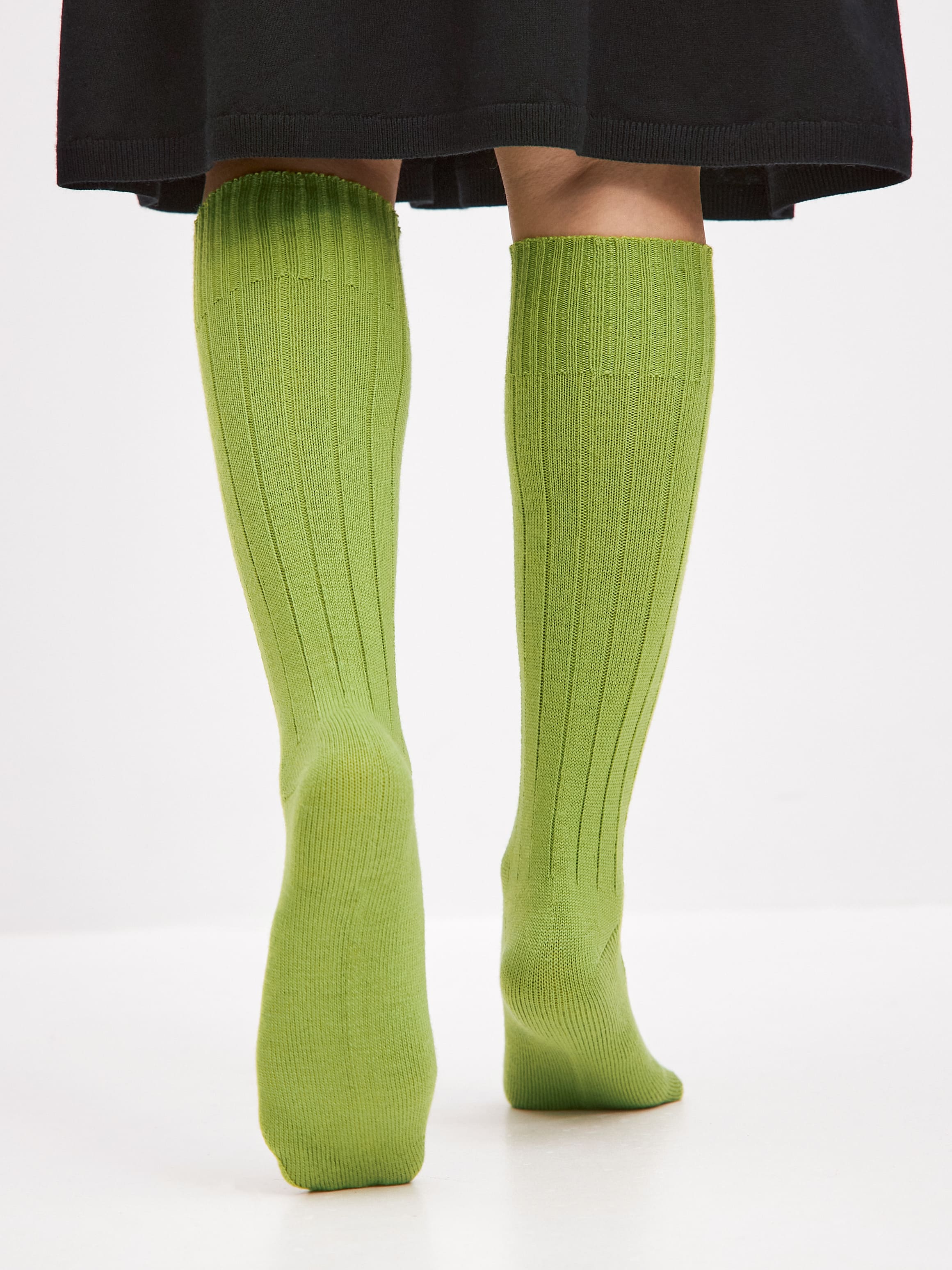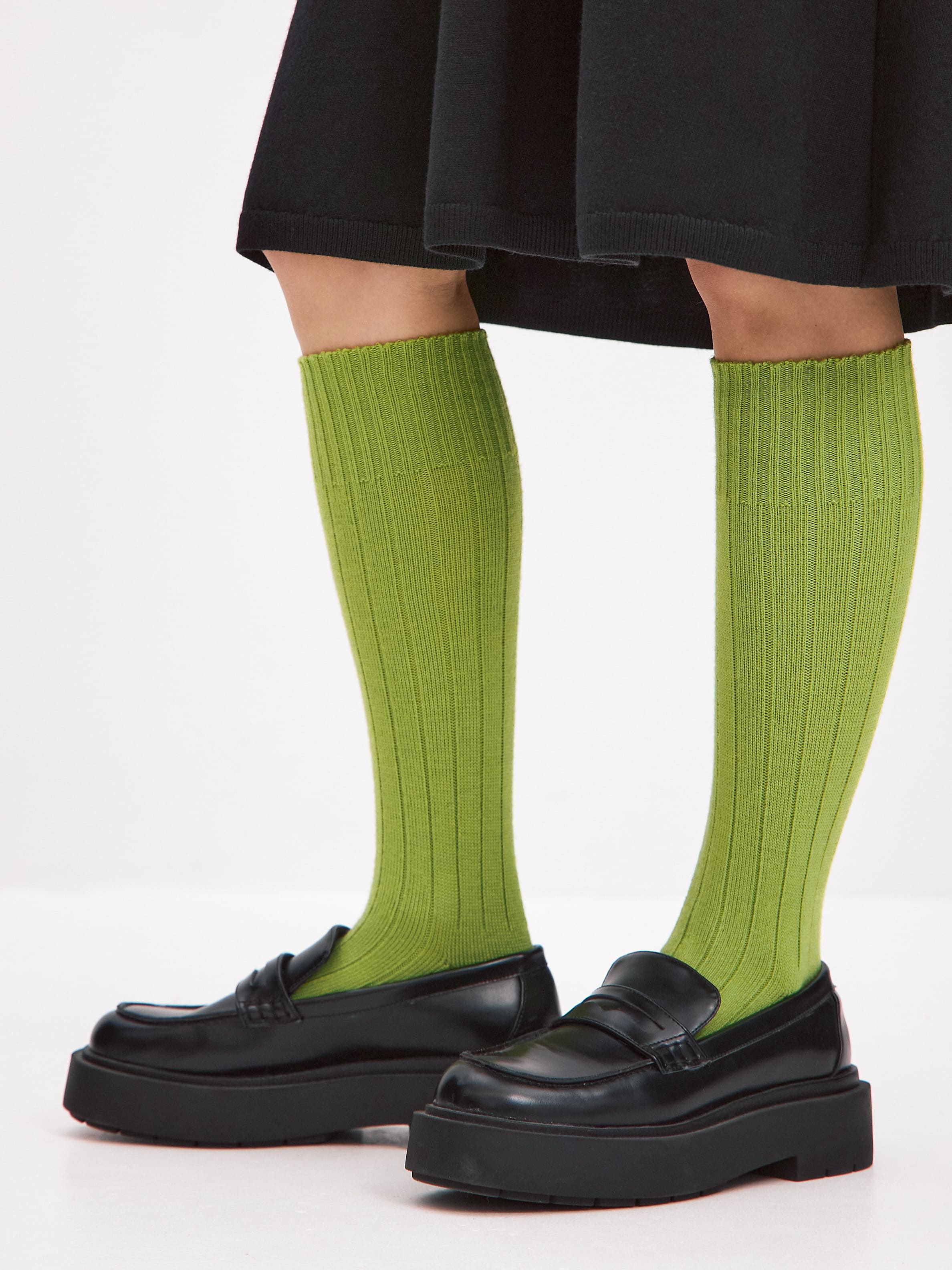 Гольфы из шелковистой мериносовой шерсти с уплотненным мыском и эластичной вязаной резинкой по краю. Выполнены в технике лапша, чтобы плотно облегать голень и не сползать в движении. Благодаря классической длине, корректируют настроение образа в нескольких направлениях. Приспущенные, собранные складкой или подвернутые гольфы отлично рифмуются с грубыми ботинками, кроссовками и ботильонами. Можно включить аксессуар в небанальный тандем с сапогами – выберите максимально контрастный оттенок трикотажа и позвольте верхней трети гольфа выглядывать из-под голенища обуви.