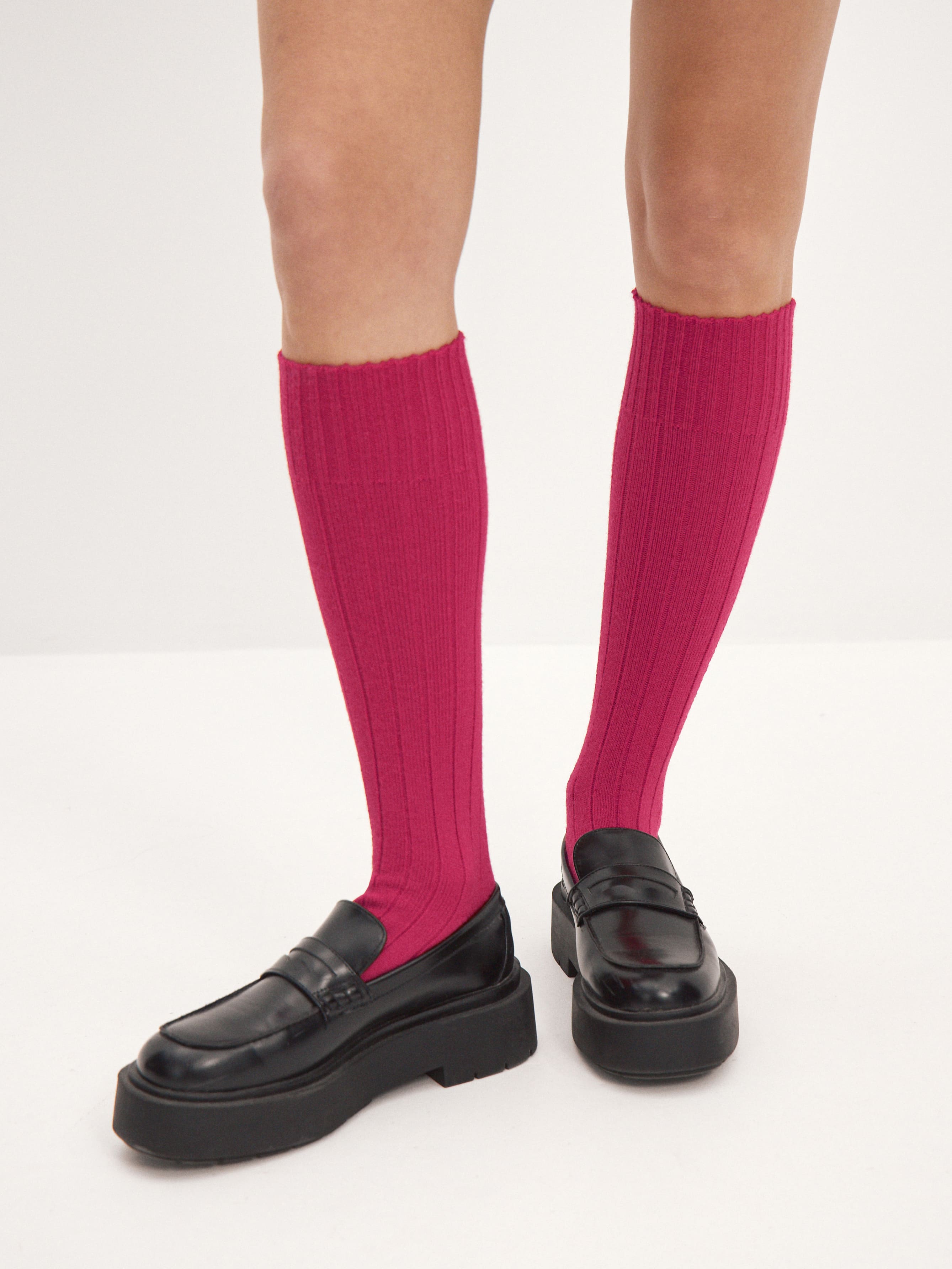 Гольфы из шелковистой мериносовой шерсти с уплотненным мыском и эластичной вязаной резинкой по краю. Выполнены в технике лапша, чтобы плотно облегать голень и не сползать в движении. Благодаря классической длине, корректируют настроение образа в нескольких направлениях. Приспущенные, собранные складкой или подвернутые гольфы отлично рифмуются с грубыми ботинками, кроссовками и ботильонами. Можно включить аксессуар в небанальный тандем с сапогами – выберите максимально контрастный оттенок трикотажа и позвольте верхней трети гольфа выглядывать из-под голенища обуви.