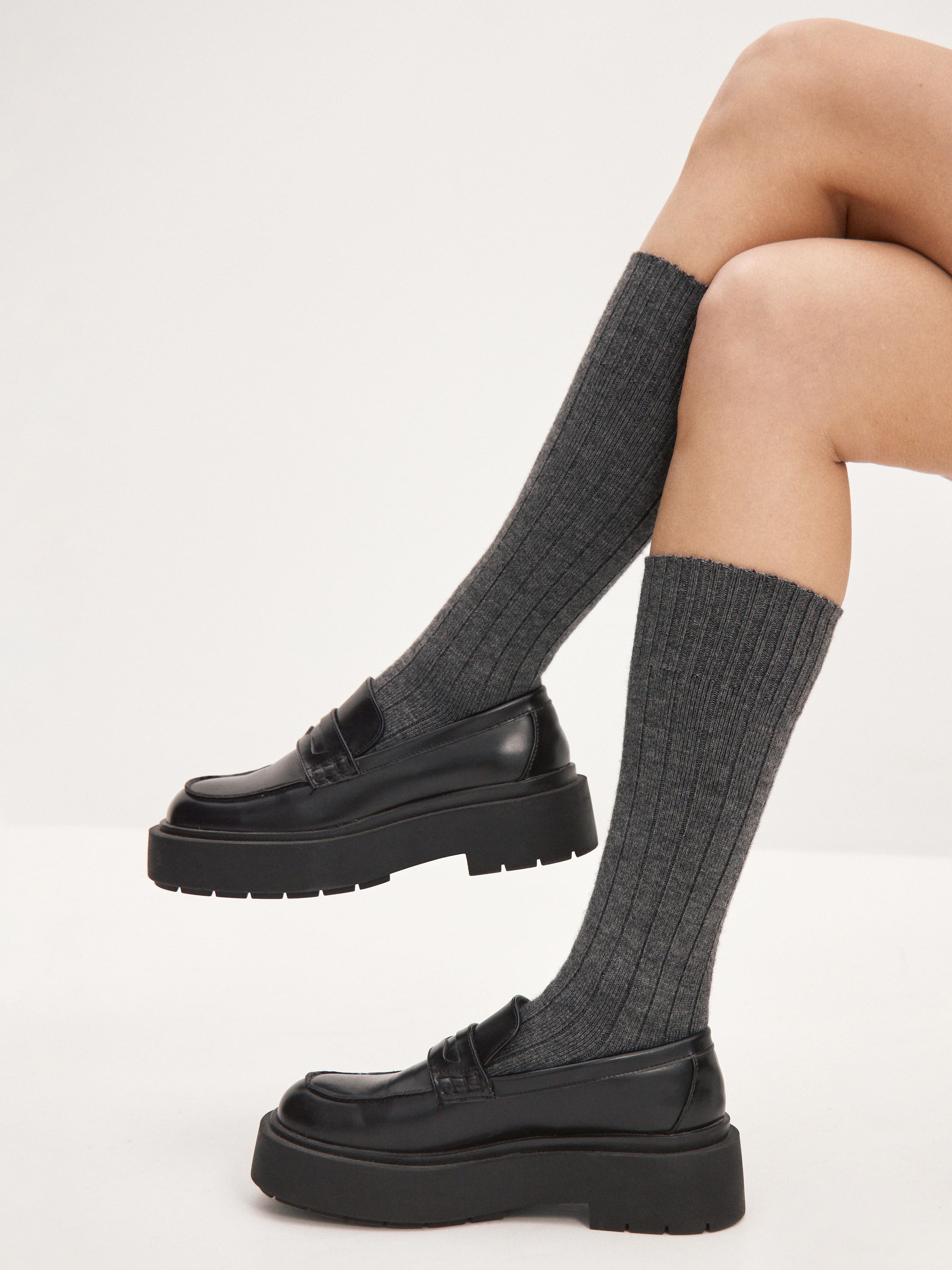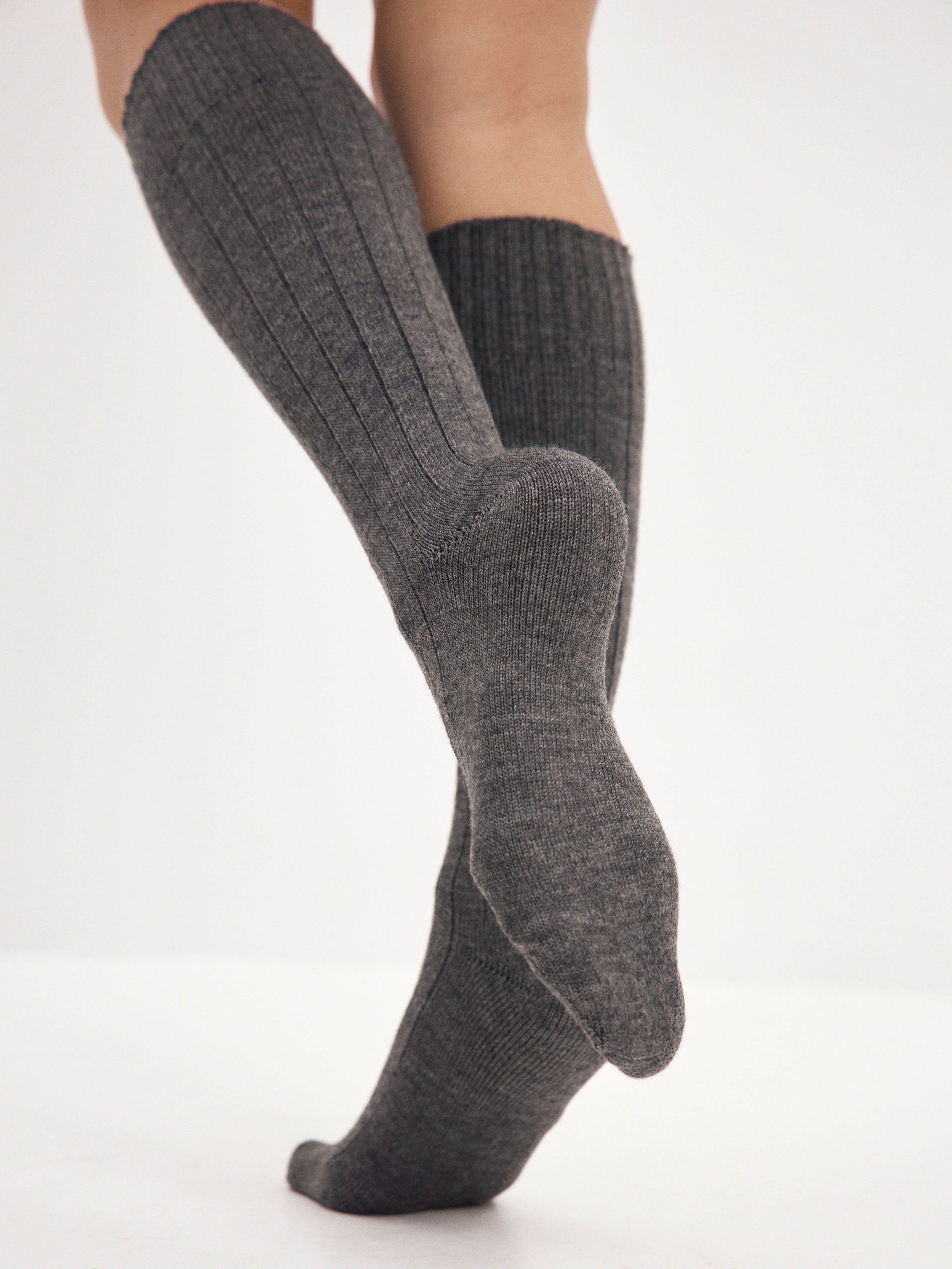 Гольфы из шелковистой мериносовой шерсти с уплотненным мыском и эластичной вязаной резинкой по краю. Выполнены в технике лапша, чтобы плотно облегать голень и не сползать в движении. Благодаря классической длине, корректируют настроение образа в нескольких направлениях. Приспущенные, собранные складкой или подвернутые гольфы отлично рифмуются с грубыми ботинками, кроссовками и ботильонами. Можно включить аксессуар в небанальный тандем с сапогами – выберите максимально контрастный оттенок трикотажа и позвольте верхней трети гольфа выглядывать из-под голенища обуви.