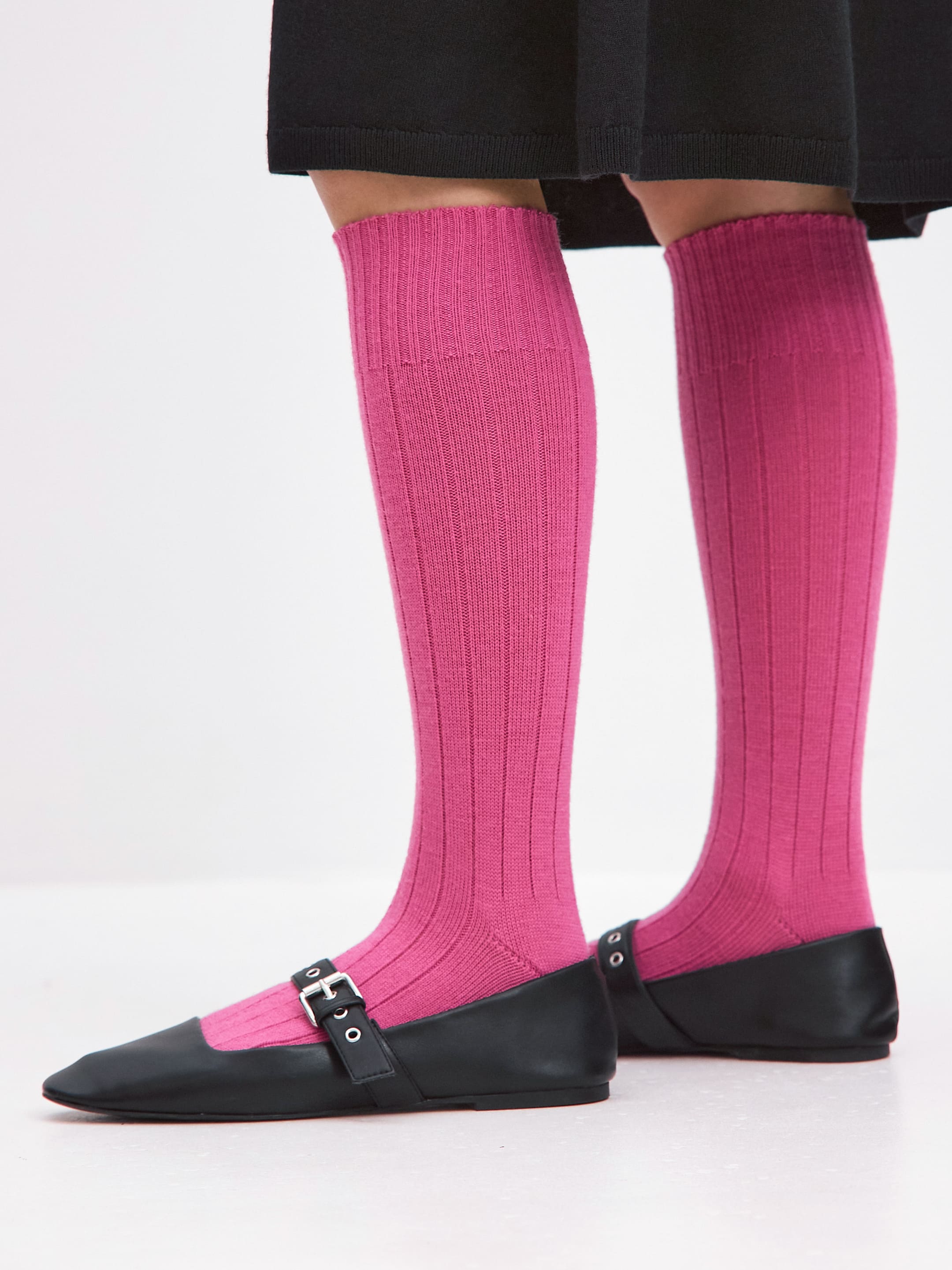 Гольфы из шелковистой мериносовой шерсти с уплотненным мыском и эластичной вязаной резинкой по краю. Выполнены в технике лапша, чтобы плотно облегать голень и не сползать в движении. Благодаря классической длине, корректируют настроение образа в нескольких направлениях. Приспущенные, собранные складкой или подвернутые гольфы отлично рифмуются с грубыми ботинками, кроссовками и ботильонами. Можно включить аксессуар в небанальный тандем с сапогами – выберите максимально контрастный оттенок трикотажа и позвольте верхней трети гольфа выглядывать из-под голенища обуви.