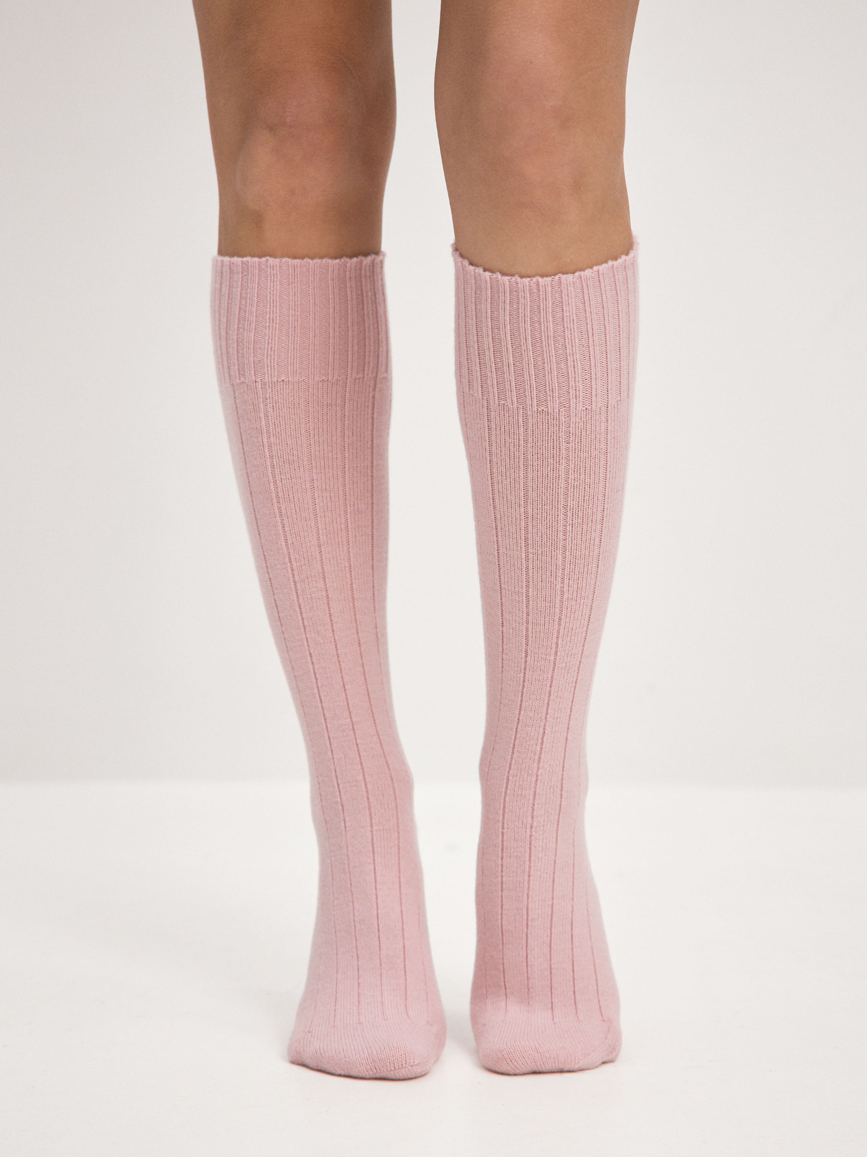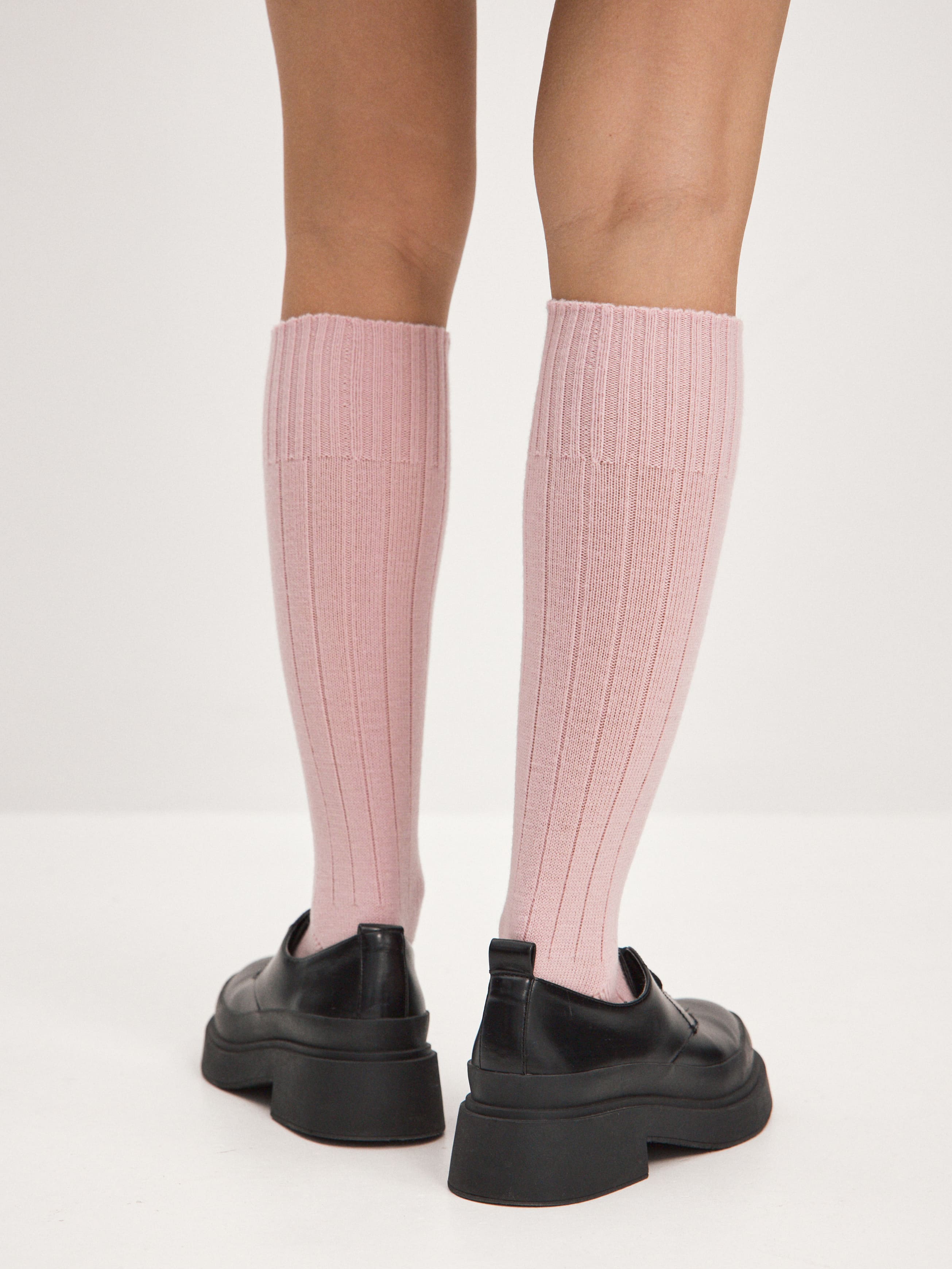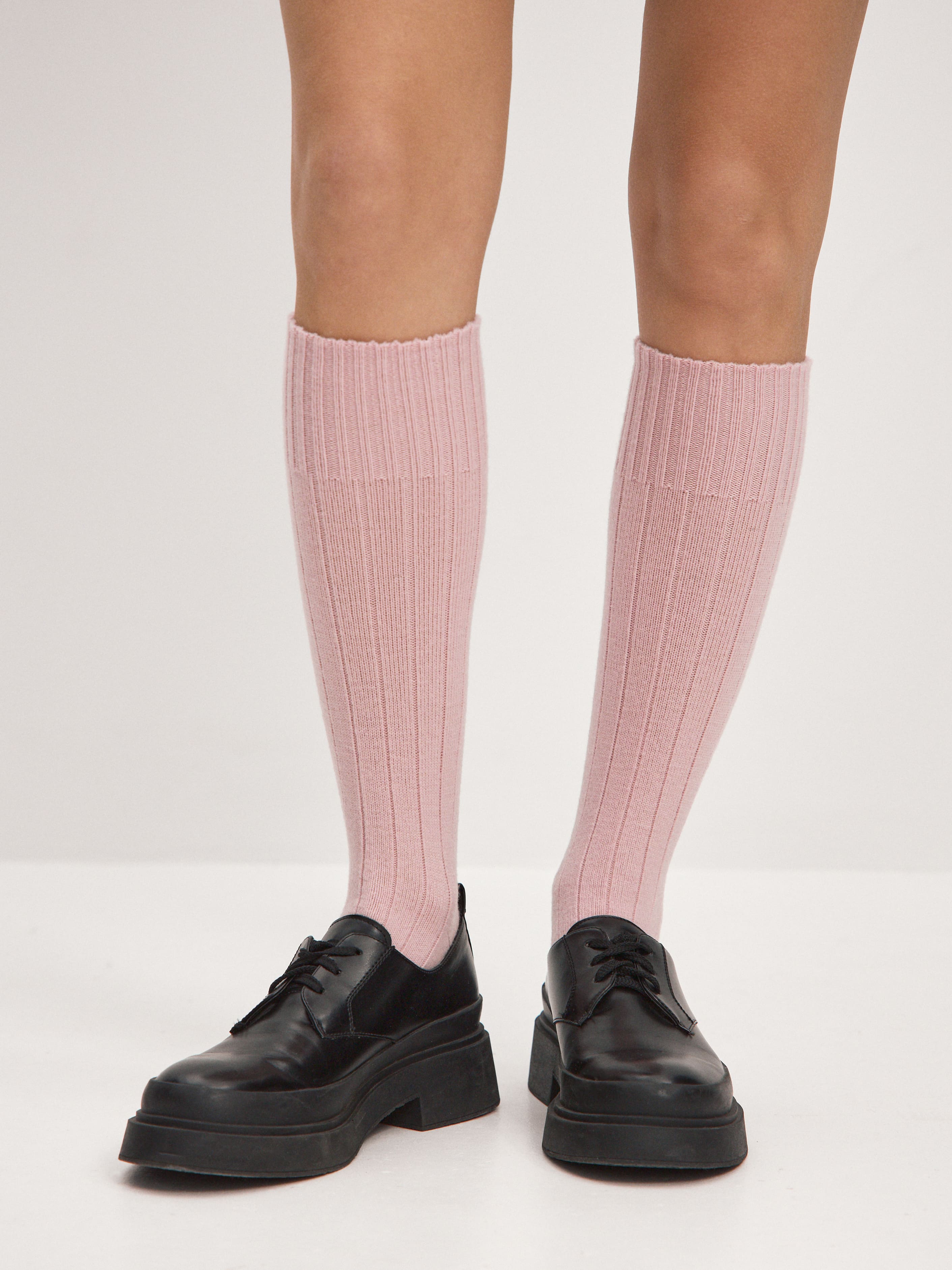 Гольфы из шелковистой мериносовой шерсти с уплотненным мыском и эластичной вязаной резинкой по краю. Выполнены в технике лапша, чтобы плотно облегать голень и не сползать в движении. Благодаря классической длине, корректируют настроение образа в нескольких направлениях. Приспущенные, собранные складкой или подвернутые гольфы отлично рифмуются с грубыми ботинками, кроссовками и ботильонами. Можно включить аксессуар в небанальный тандем с сапогами – выберите максимально контрастный оттенок трикотажа и позвольте верхней трети гольфа выглядывать из-под голенища обуви.