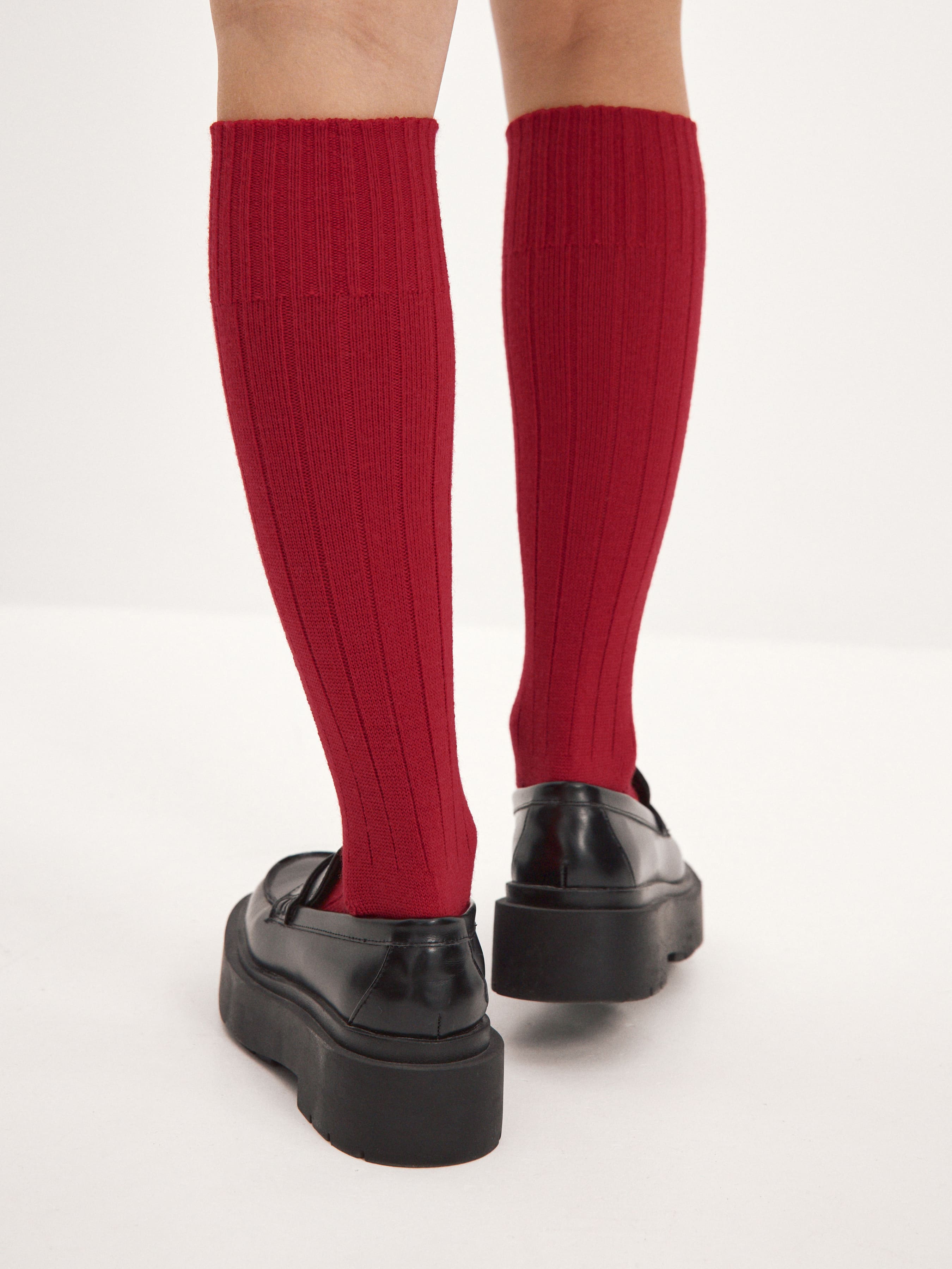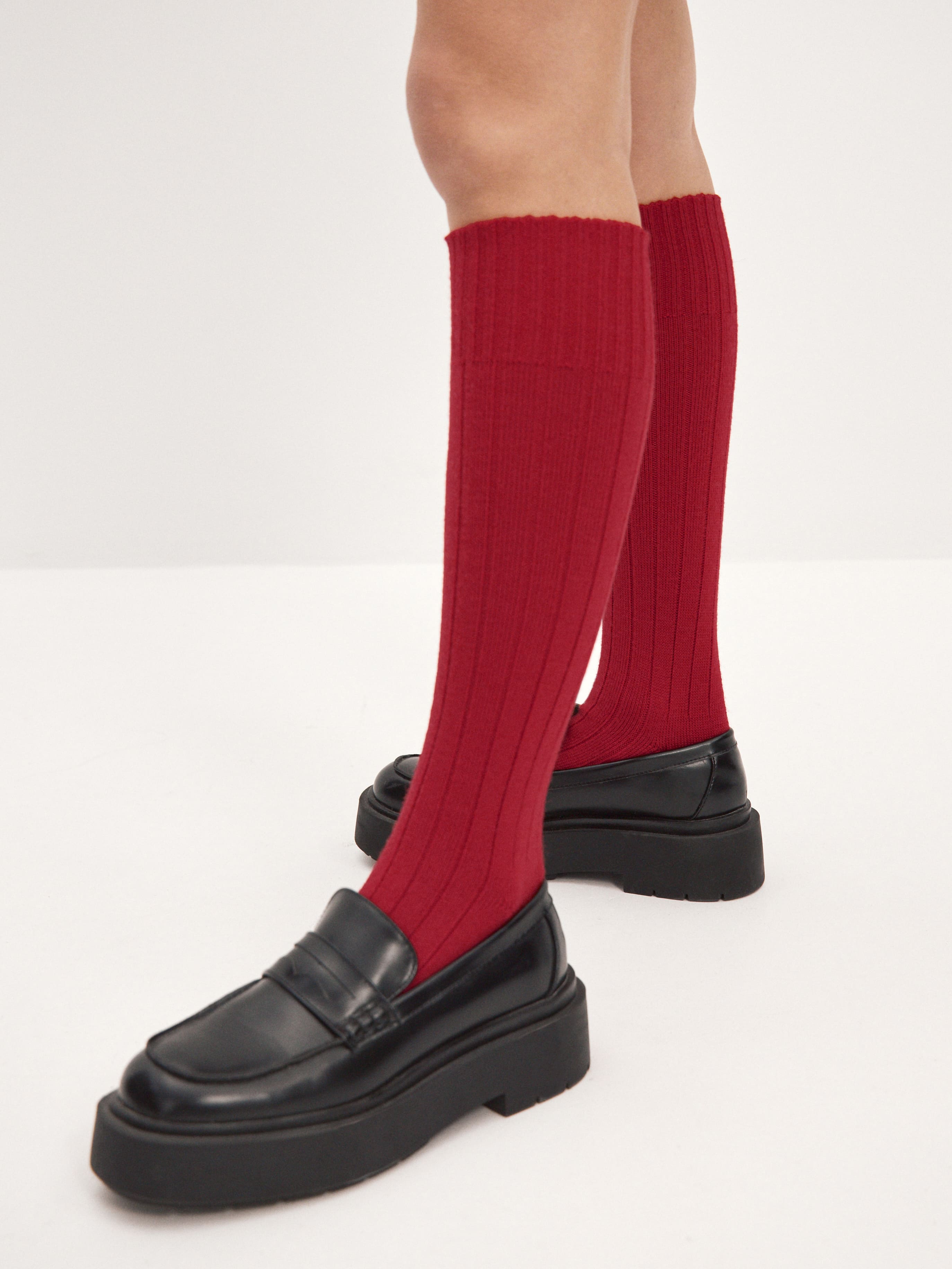 Гольфы из шелковистой мериносовой шерсти с уплотненным мыском и эластичной вязаной резинкой по краю. Выполнены в технике лапша, чтобы плотно облегать голень и не сползать в движении. Благодаря классической длине, корректируют настроение образа в нескольких направлениях. Приспущенные, собранные складкой или подвернутые гольфы отлично рифмуются с грубыми ботинками, кроссовками и ботильонами. Можно включить аксессуар в небанальный тандем с сапогами – выберите максимально контрастный оттенок трикотажа и позвольте верхней трети гольфа выглядывать из-под голенища обуви.