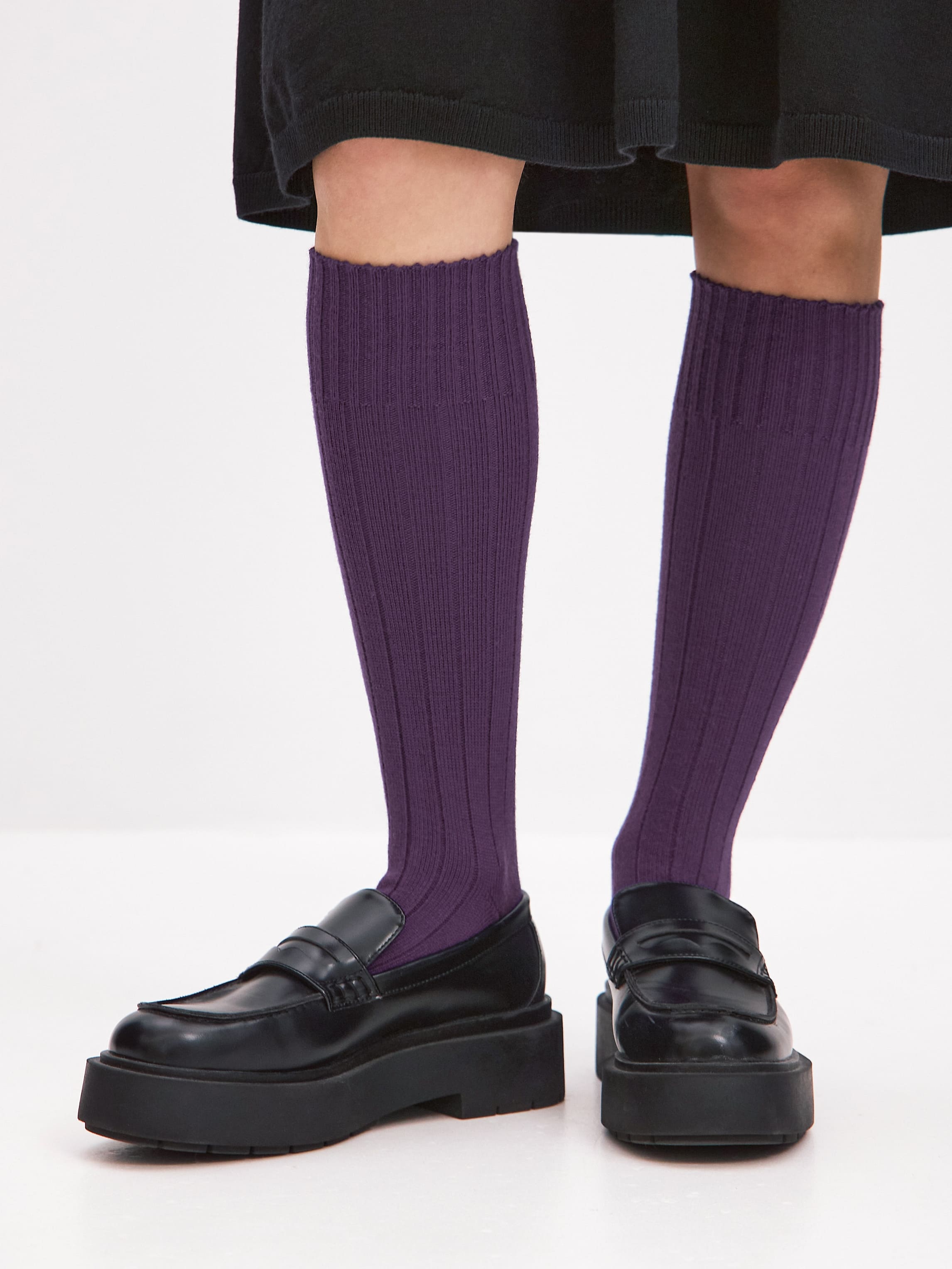 Гольфы из шелковистой мериносовой шерсти с уплотненным мыском и эластичной вязаной резинкой по краю. Выполнены в технике лапша, чтобы плотно облегать голень и не сползать в движении. Благодаря классической длине, корректируют настроение образа в нескольких направлениях. Приспущенные, собранные складкой или подвернутые гольфы отлично рифмуются с грубыми ботинками, кроссовками и ботильонами. Можно включить аксессуар в небанальный тандем с сапогами – выберите максимально контрастный оттенок трикотажа и позвольте верхней трети гольфа выглядывать из-под голенища обуви.