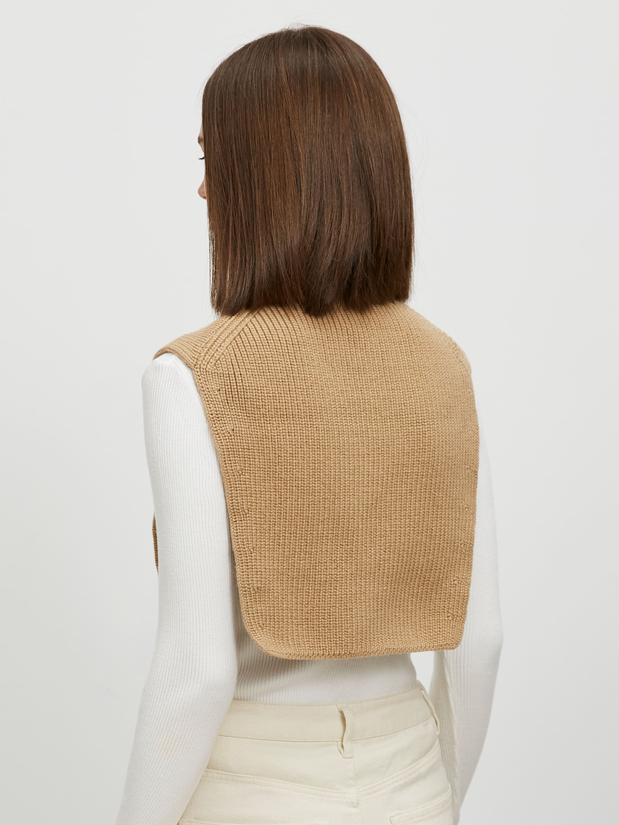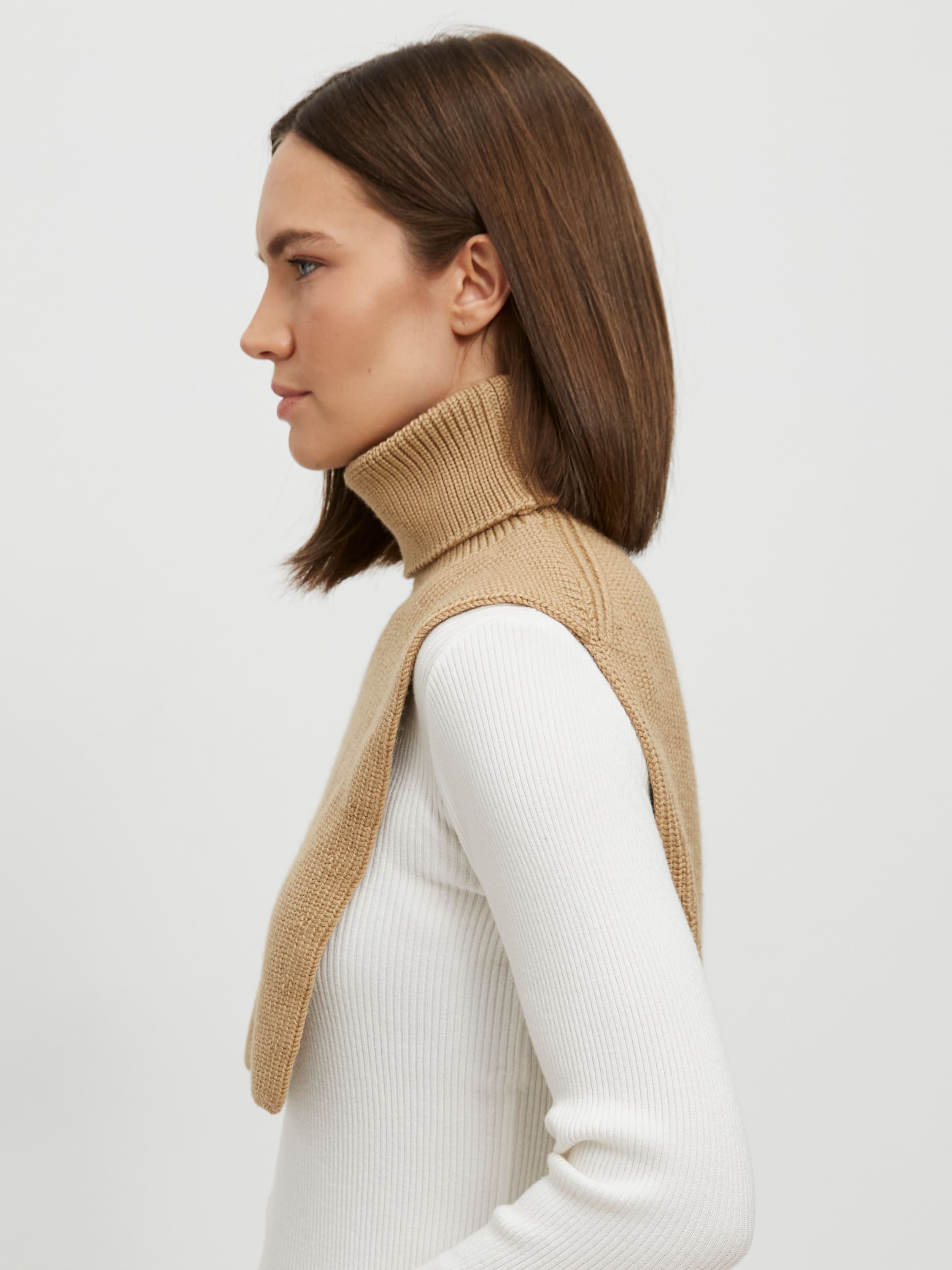 Мягкая манишка с воротником выступает альтернативой и джемперу, и шарфу в сезон осень/зима. Модель с горлом напоминает верхнюю часть свитера с воротом стойка.