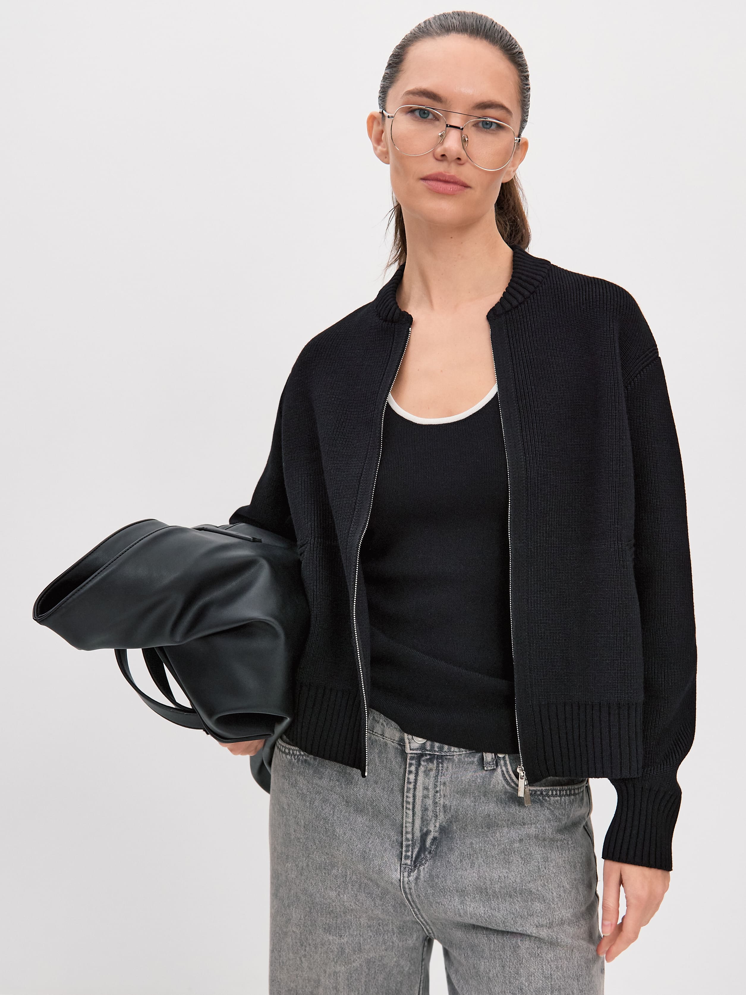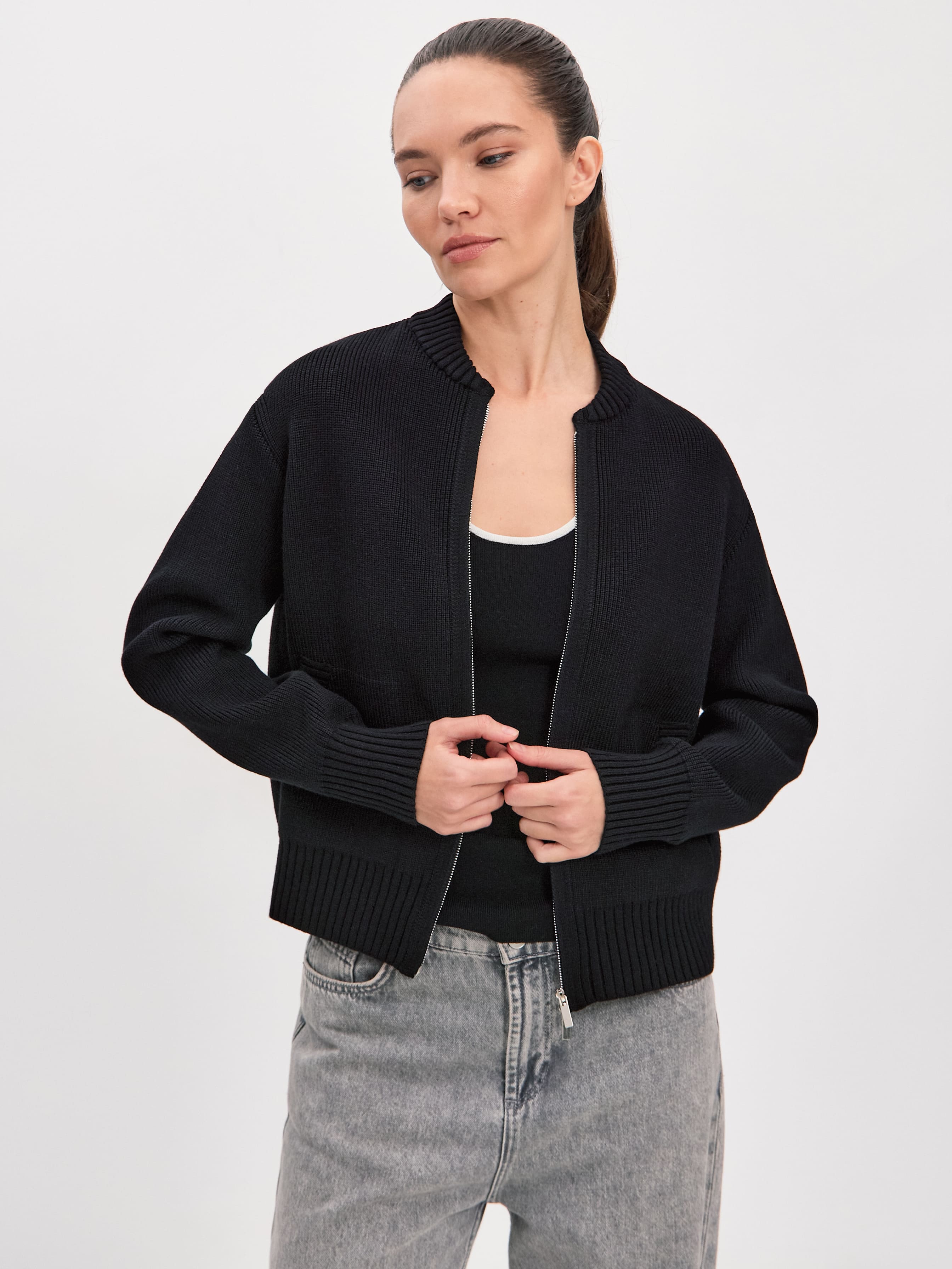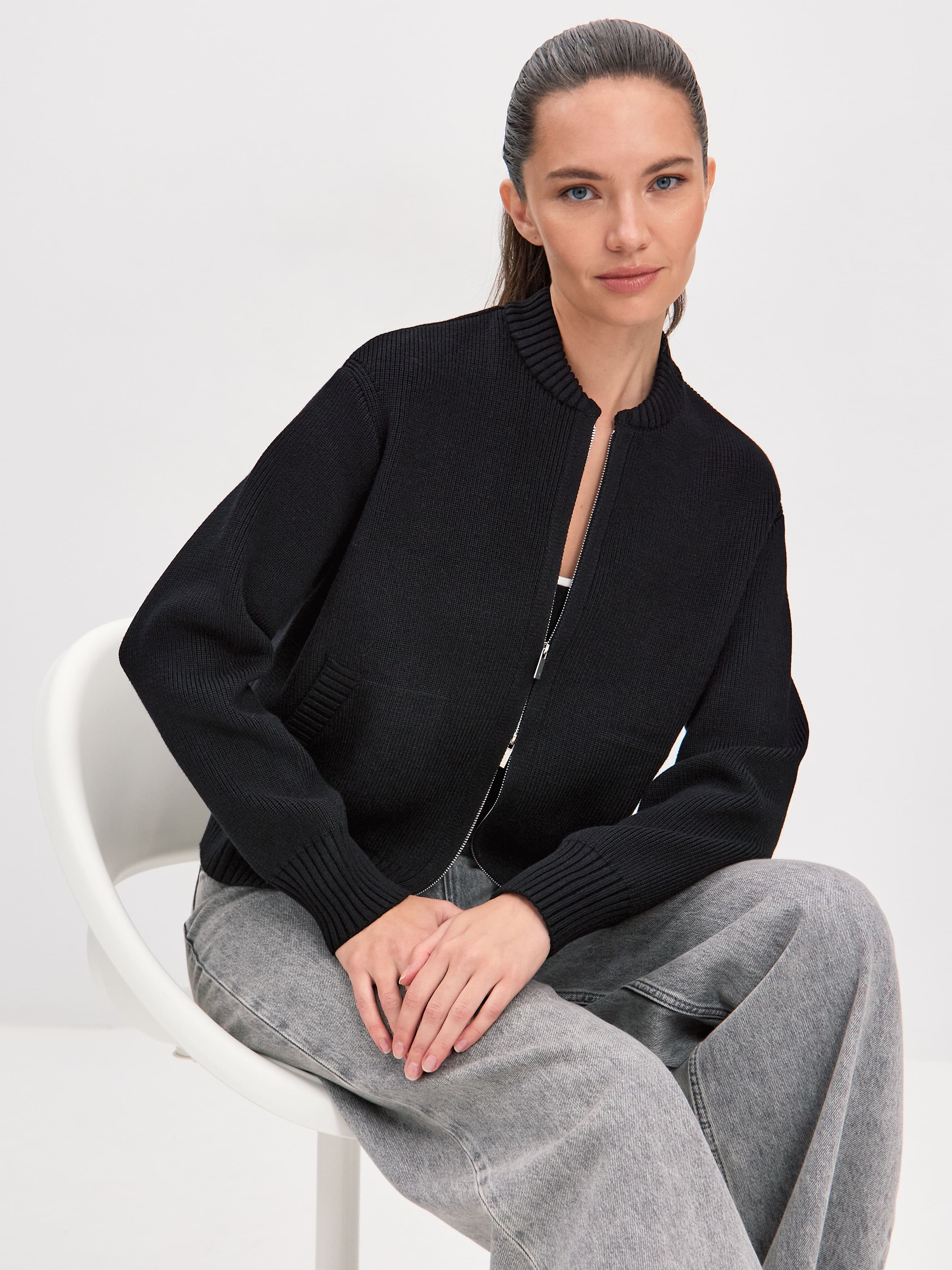 Мягкий бомбер из плотной хлопковой пряжи – приятный на ощупь, дышащий каждой петелькой, бережно хранящий тепло. Джемпер в меру объемный, усиленный добавкой из легкой вискозы и эластичного полиамида. Искусственные волокна помогают хлопку быстро восстанавливать форму. При этом они не снижают воздухопроницаемость и тактильность изделия. В качестве бонуса добавили двойную молнию, чтобы вы продолжили развивать идею сложных многослойных образов.