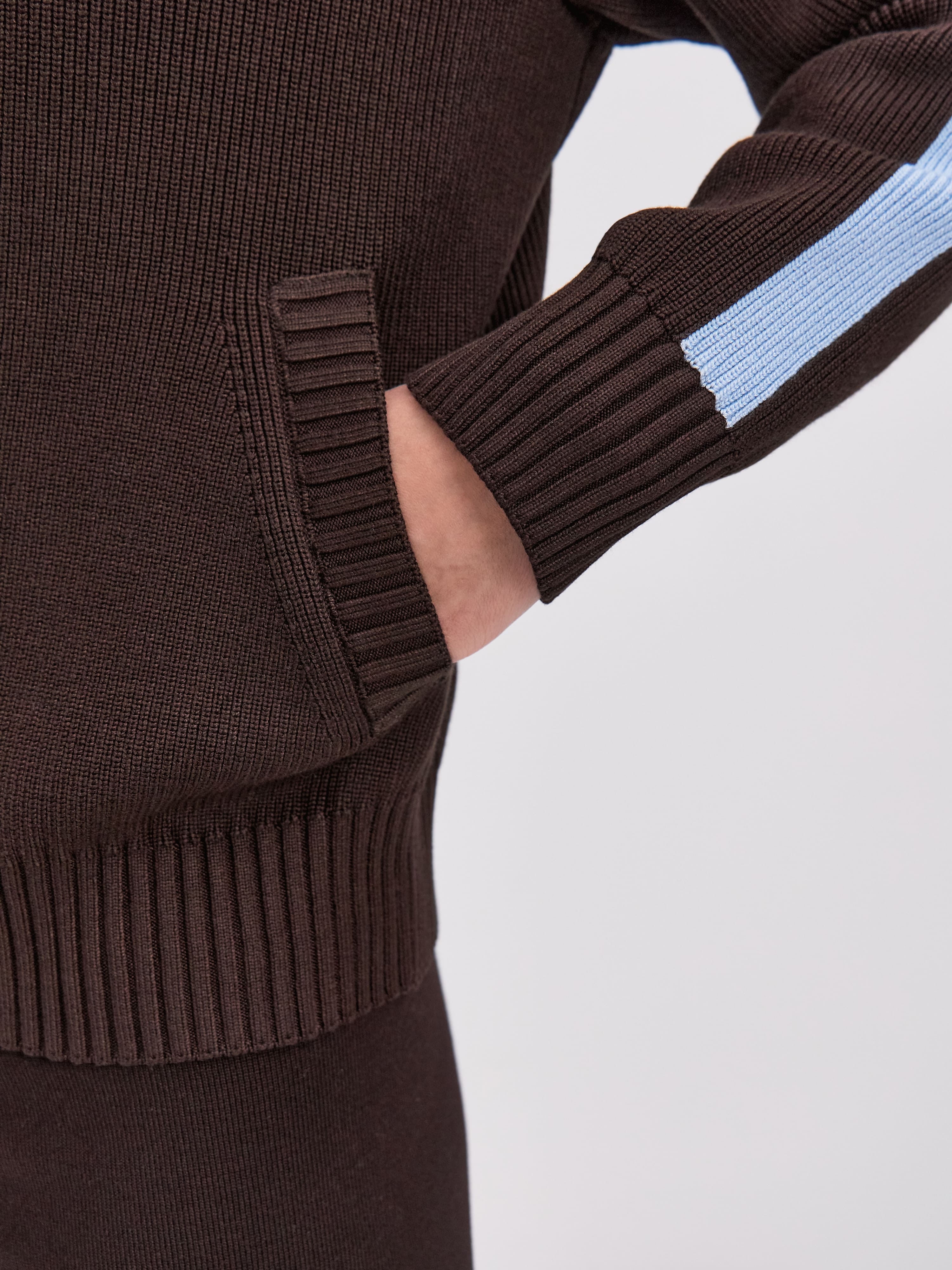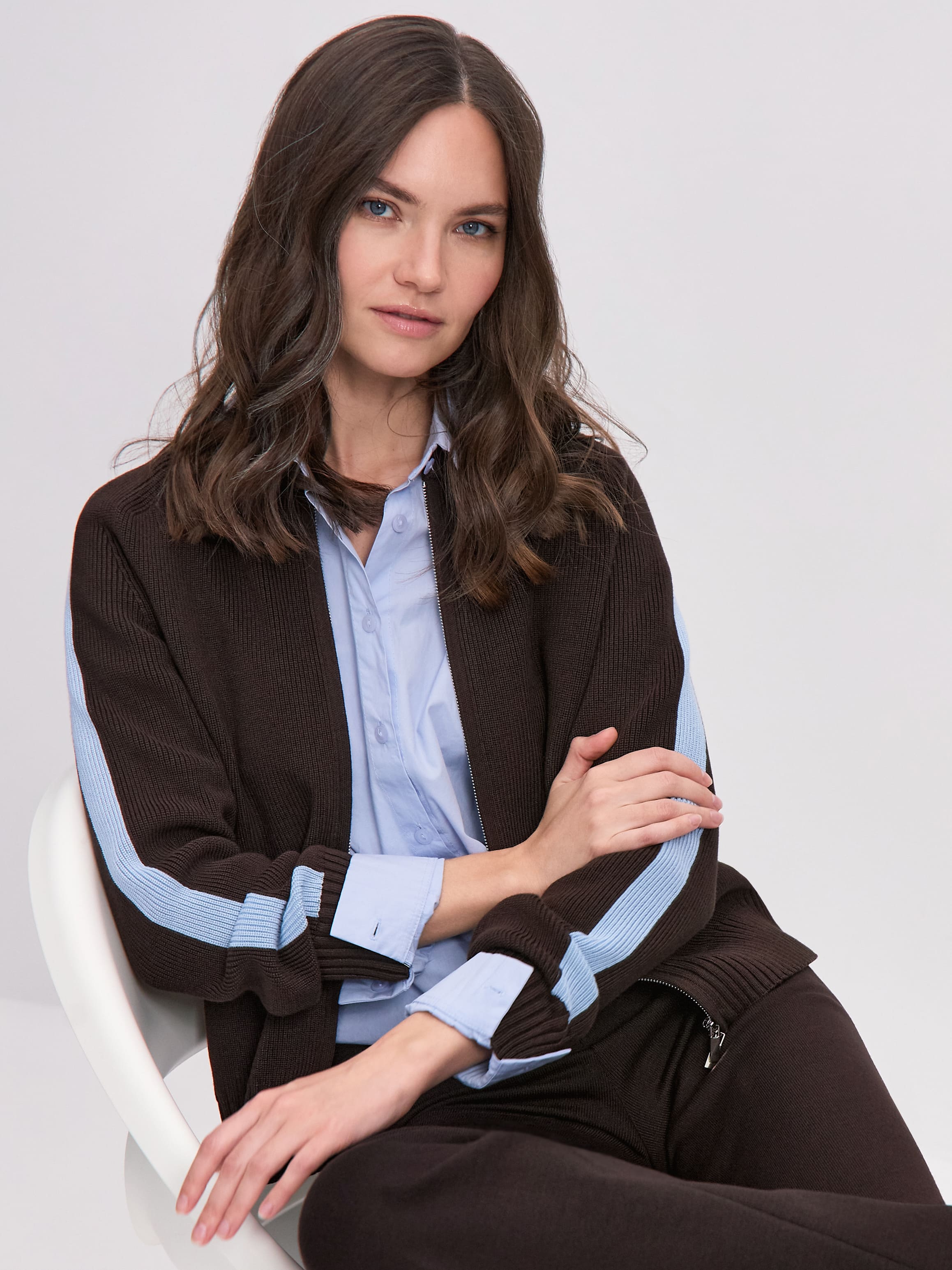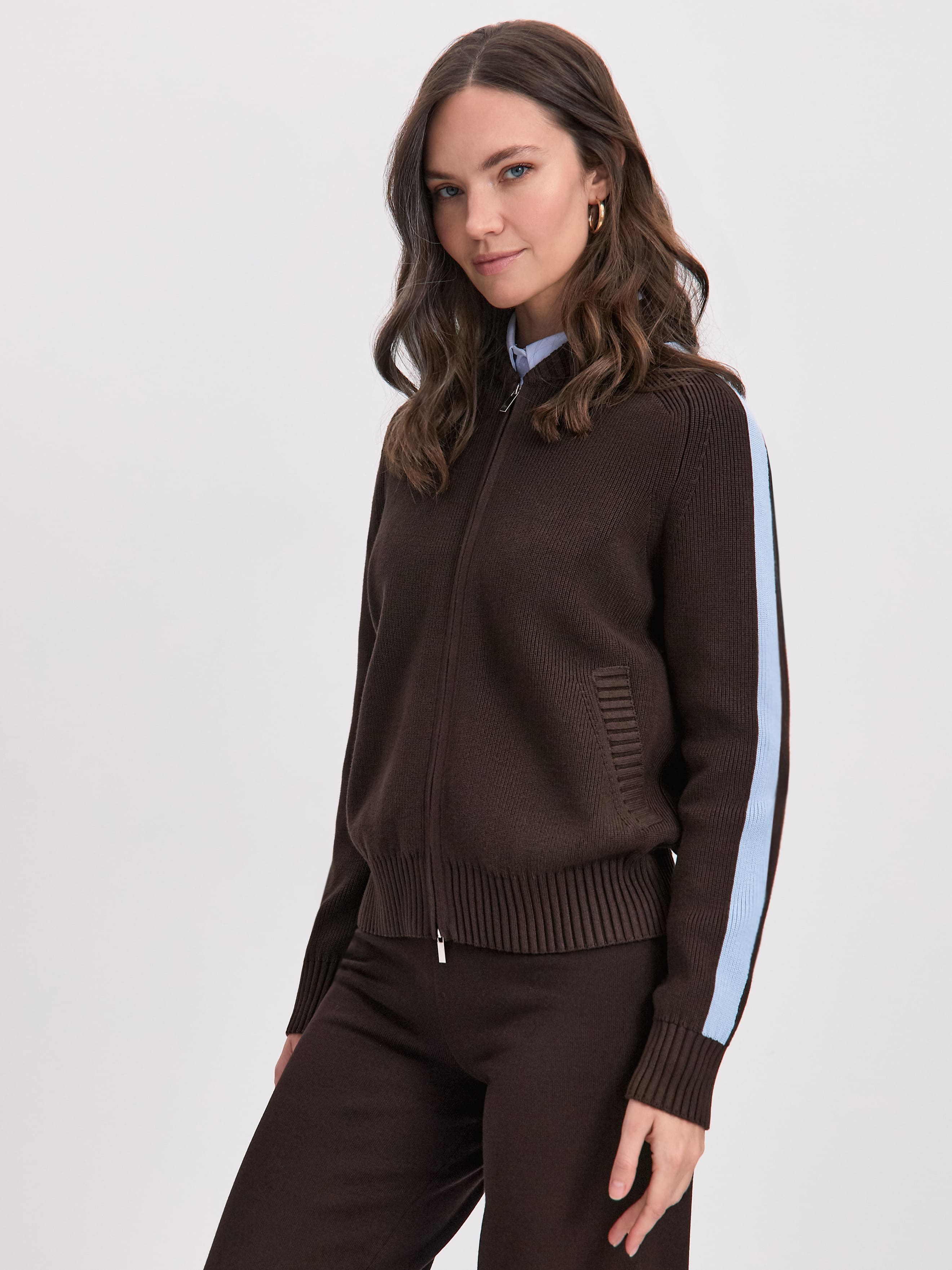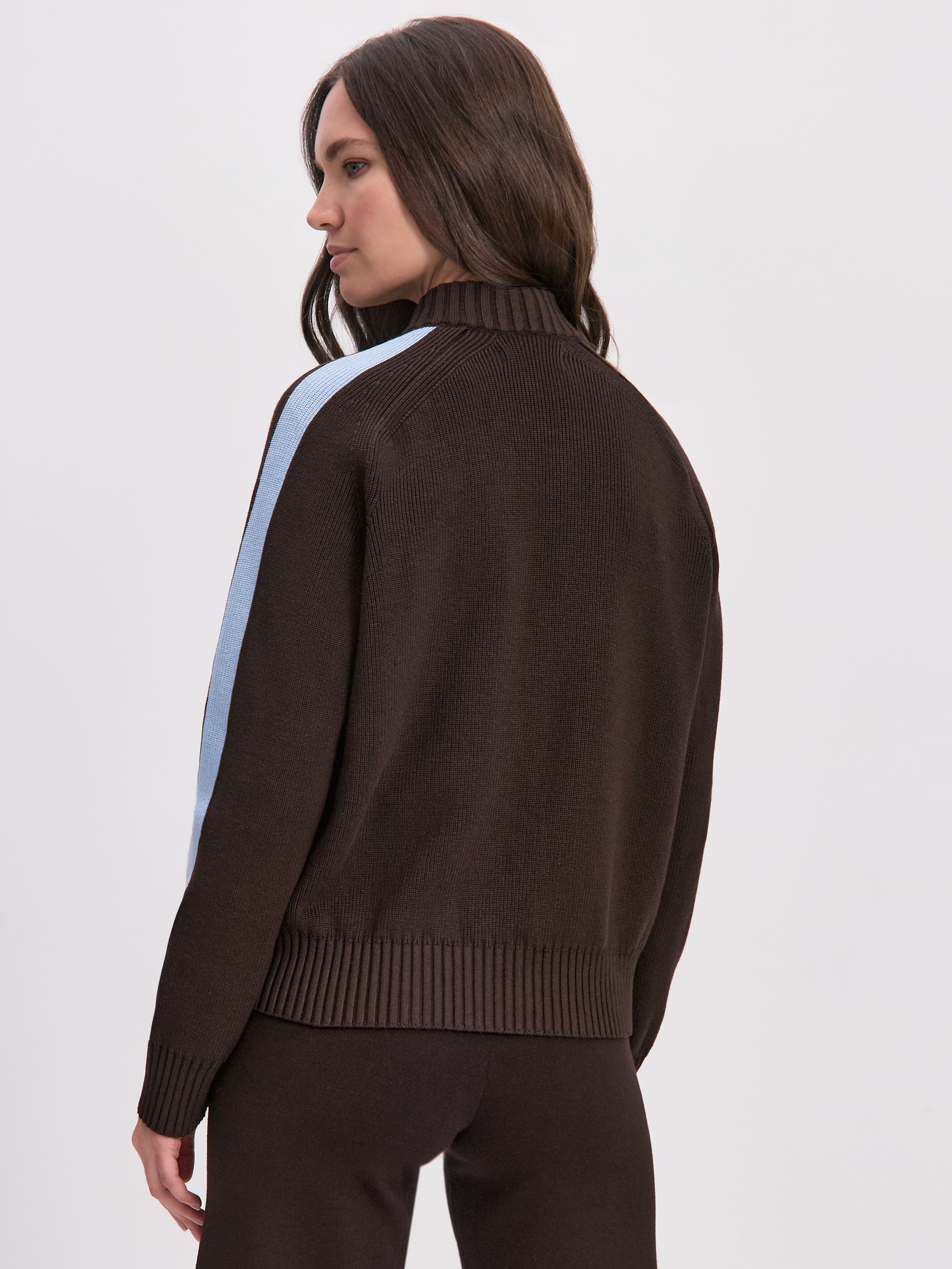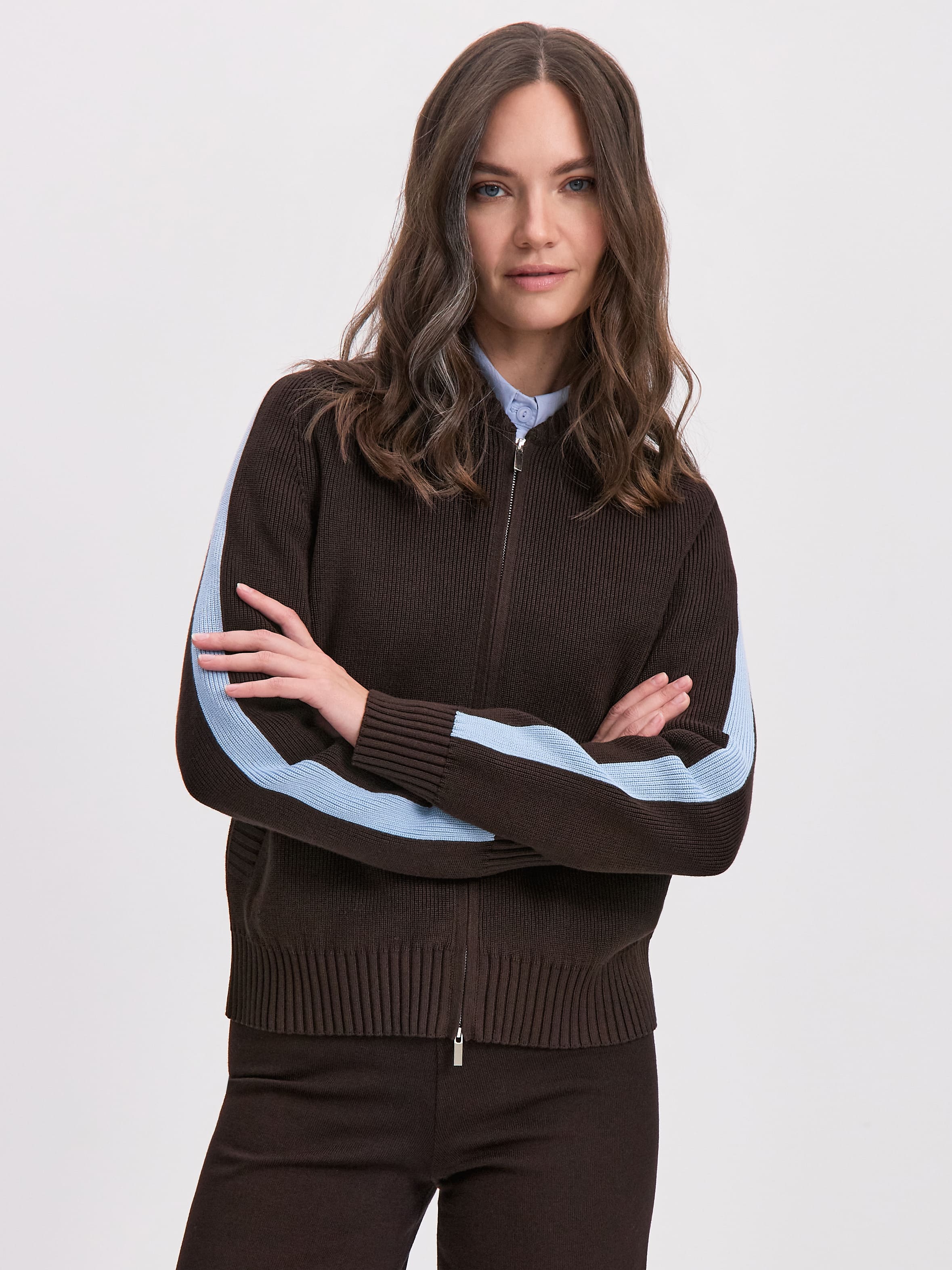 Вязаный бомбер на двойной молнии с элементами aтлейжер эстетики. Создан из формоустойчивой хлопко-вискозы плотного плетения. Конструкция рукава реглан повторяет крой классической олимпийки. Акцентные лампасы – это вдохновение отделкой винтажных спортивных ветровок. В прорезных карманах с вывязанной листочкой разместятся секретные женские мелочи. Широкие манжеты и низ оформлены свободной резинкой. Модель в меру просторная, корректного объема, сохраняющая пропорциональность силуэта.