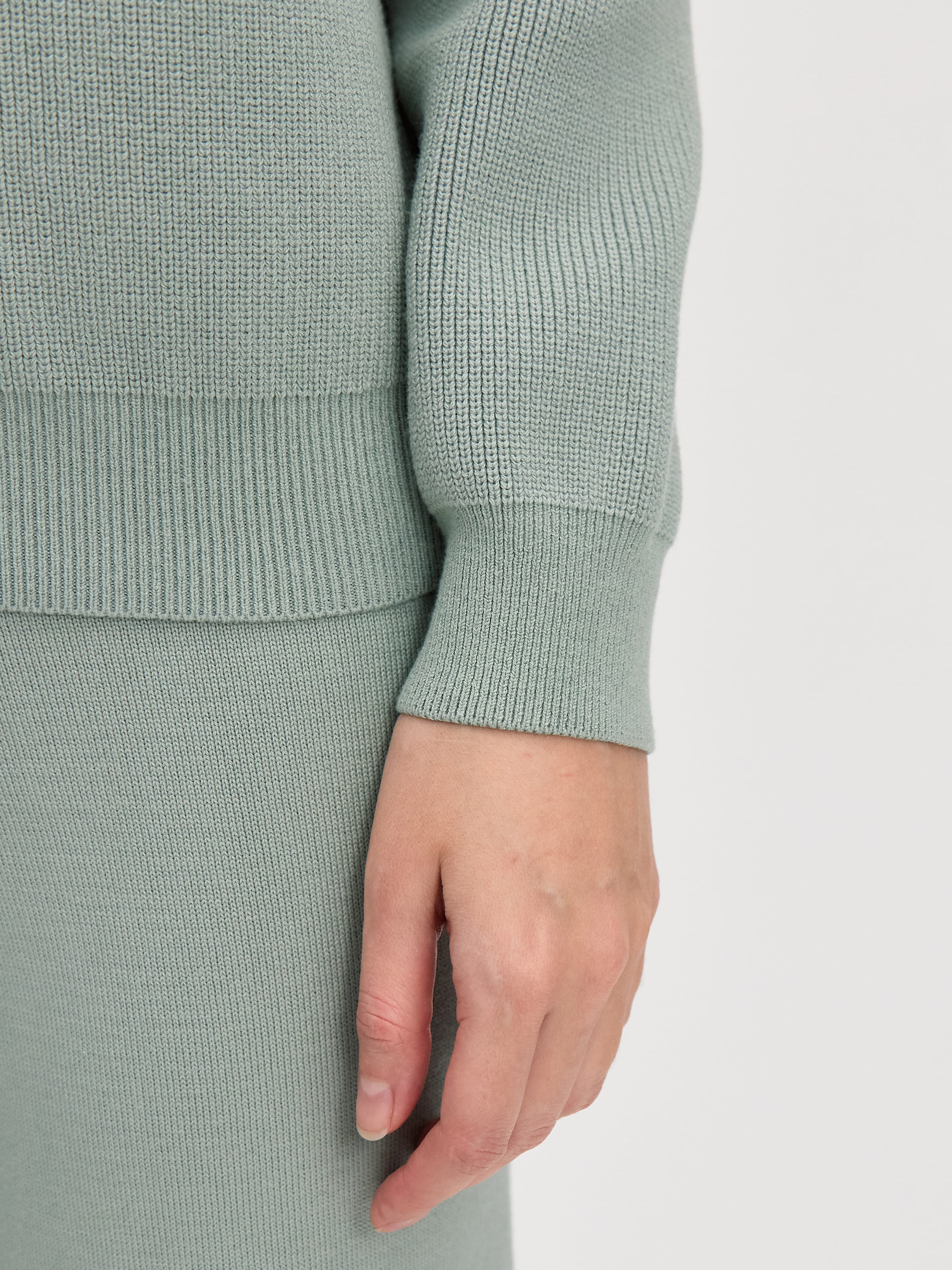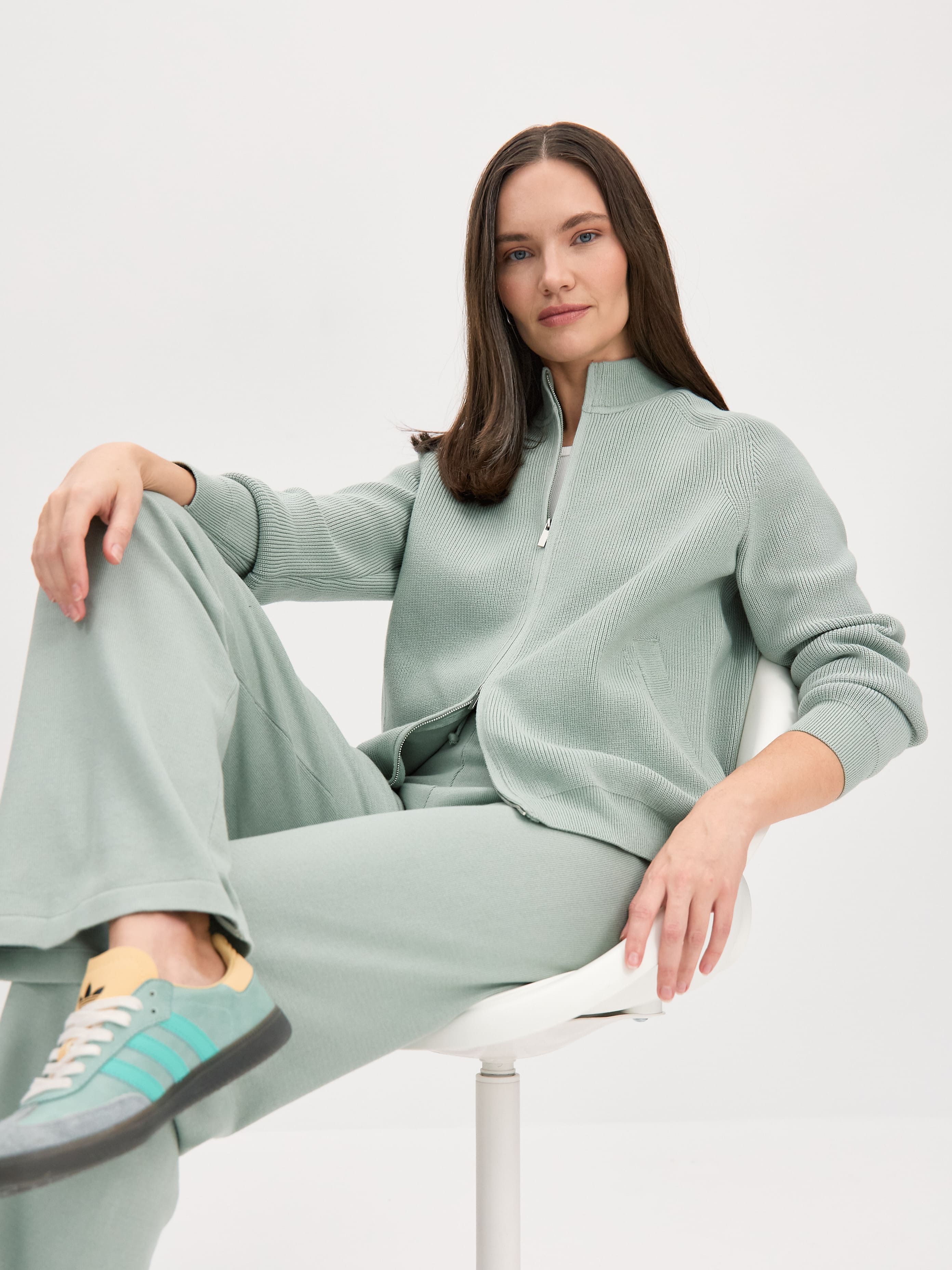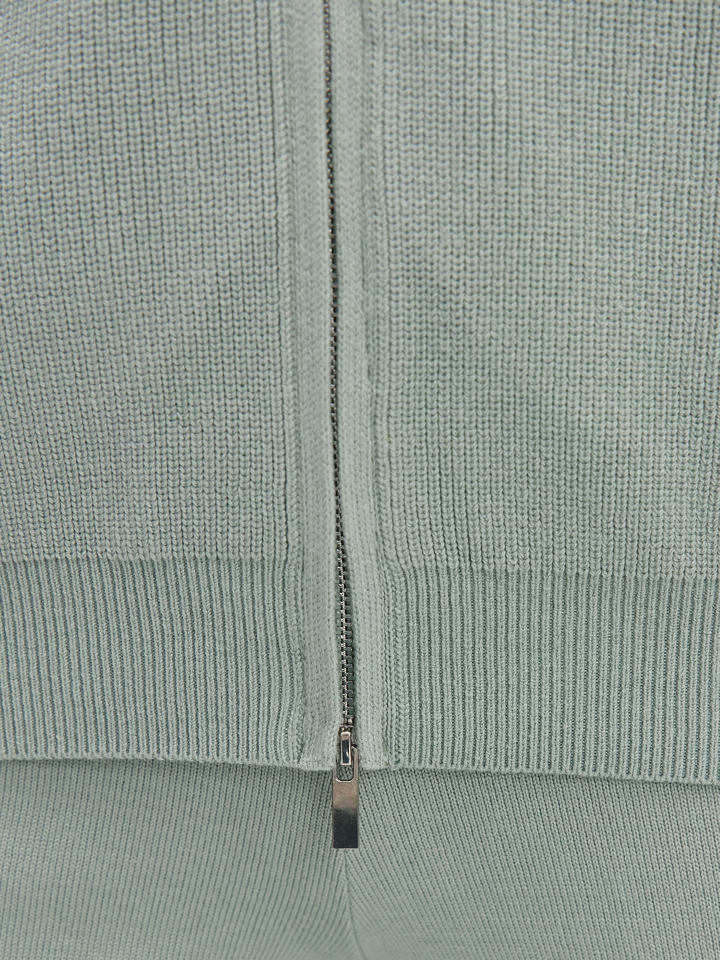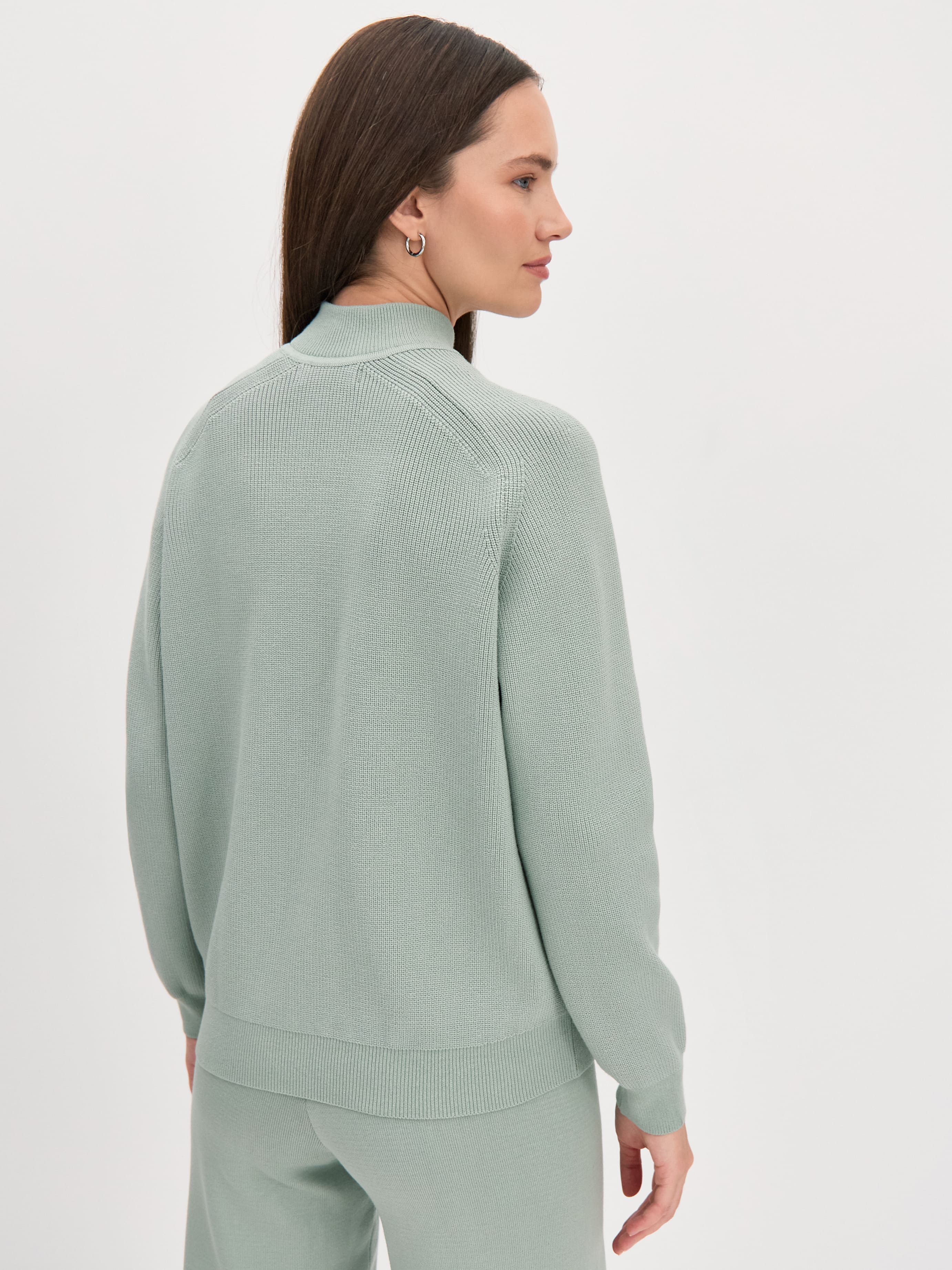 Лаконичный вязаный бомбер, созданный как альтернатива легким ветровкам. В составе джемпера – комфортная пряжа с хлопком. Главные отличия модели от остальных бомберов MONONAME – рукава реглан, удлиненный крой и высокий воротник-стойка. Модель одинаково легко «включается» в стритстайл-капсулы и в нейтральные офисные образы. Усиление хлопковой нити вискозой повысило эстетические характеристики и снизило рыхлость трикотажного полотна.