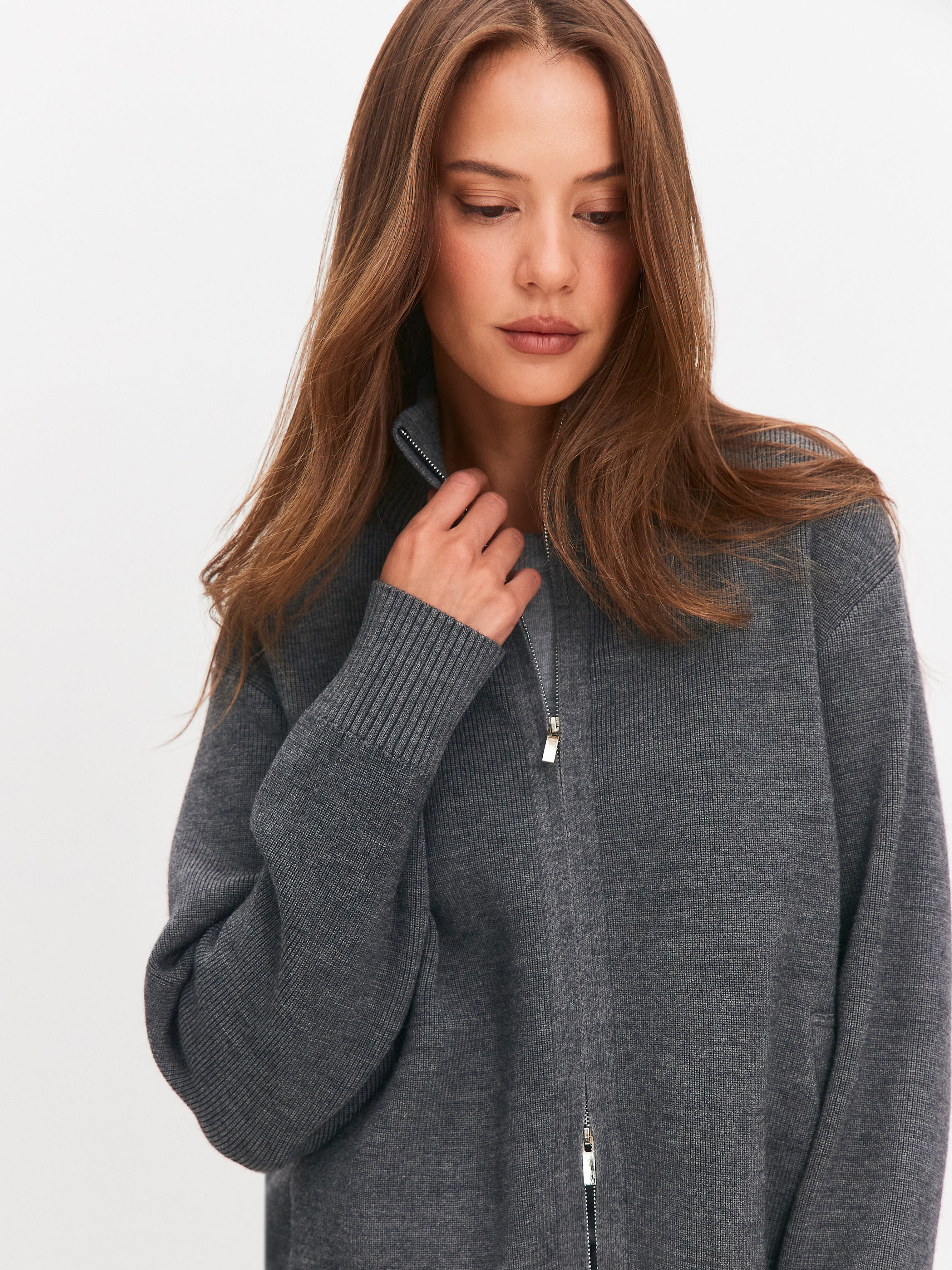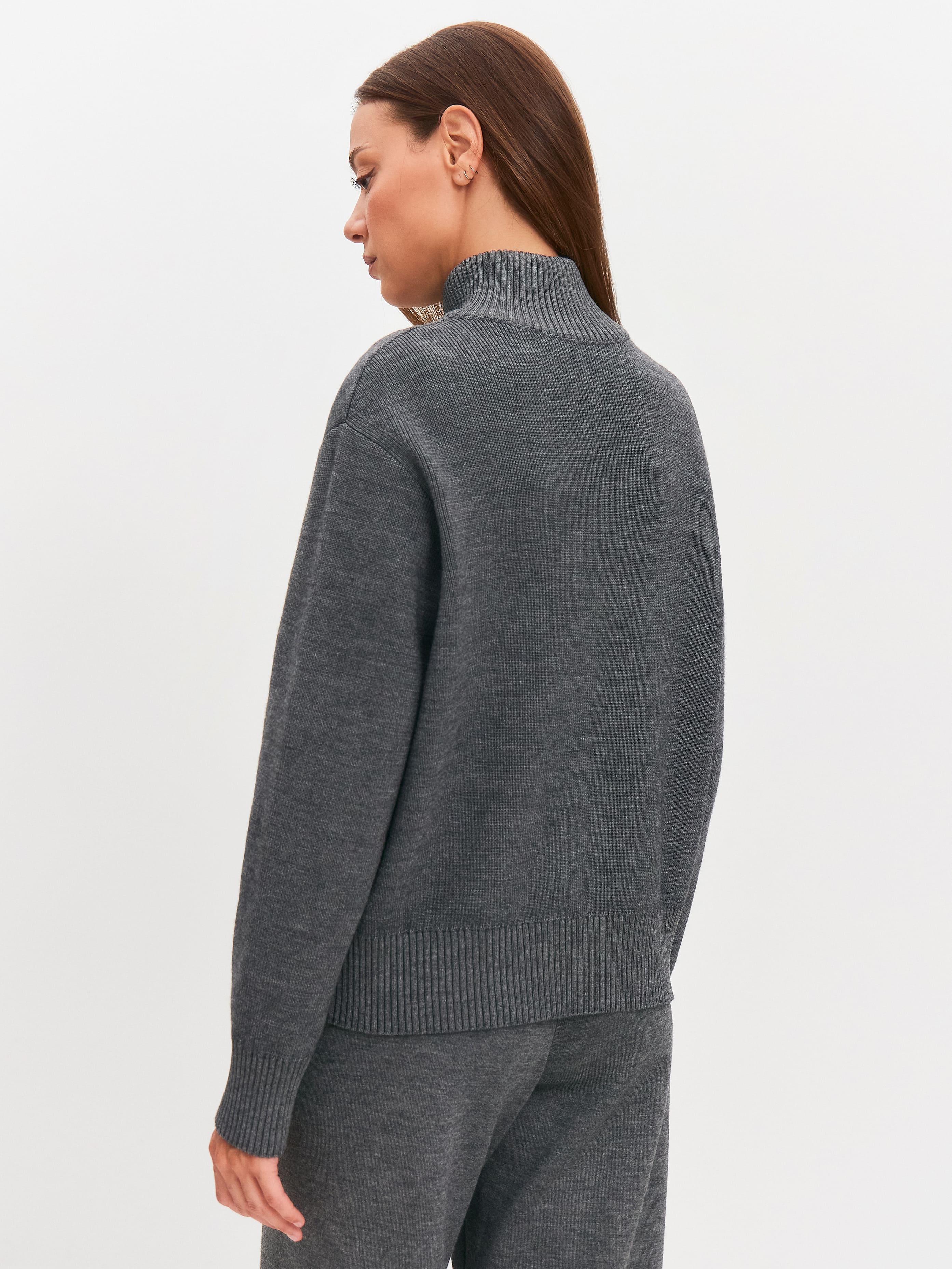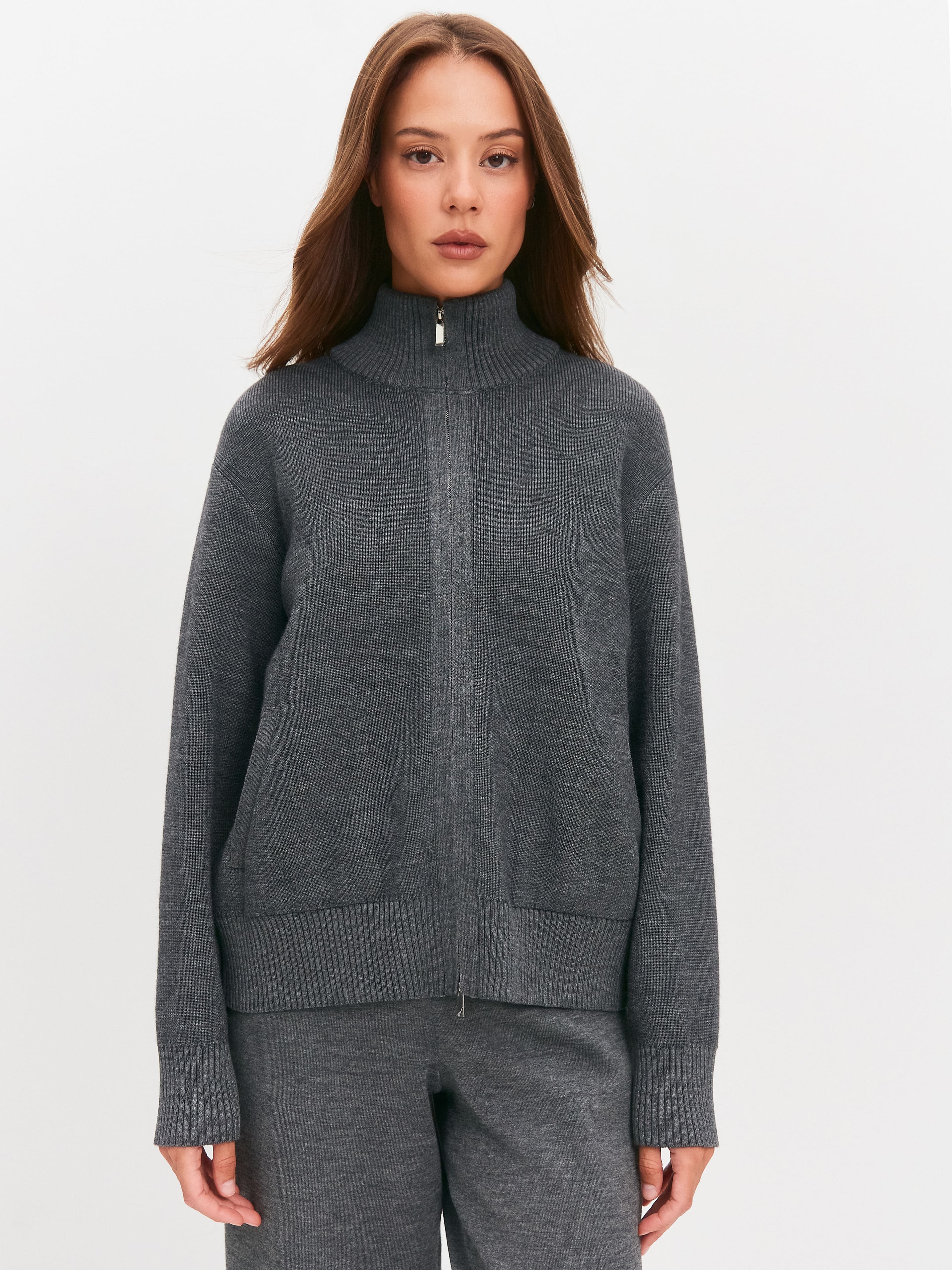 Минималистичный джемпер из мягкой мериносовой полушерсти. Такой понятный, уютно обнимающий и образующий идеальную пару с любым повседневным низом. Нюансы фасона: приспущенное плечо, застежка на металлическую молнию, широкие уплотненные манжеты и края. Высокий ворот вывязан в два слоя и по согревающим свойствам идентичен шарфу. Двухзамковая молния расстегивается в направлениях вверх-вниз. Данная модель бомбера изготавливается из шерстяной пряжи, смягченной большим процентом вискозы. Поэтому эффект покалывания, присущий изделиям из натуральной шерсти, в джемпере практически отсутствует.