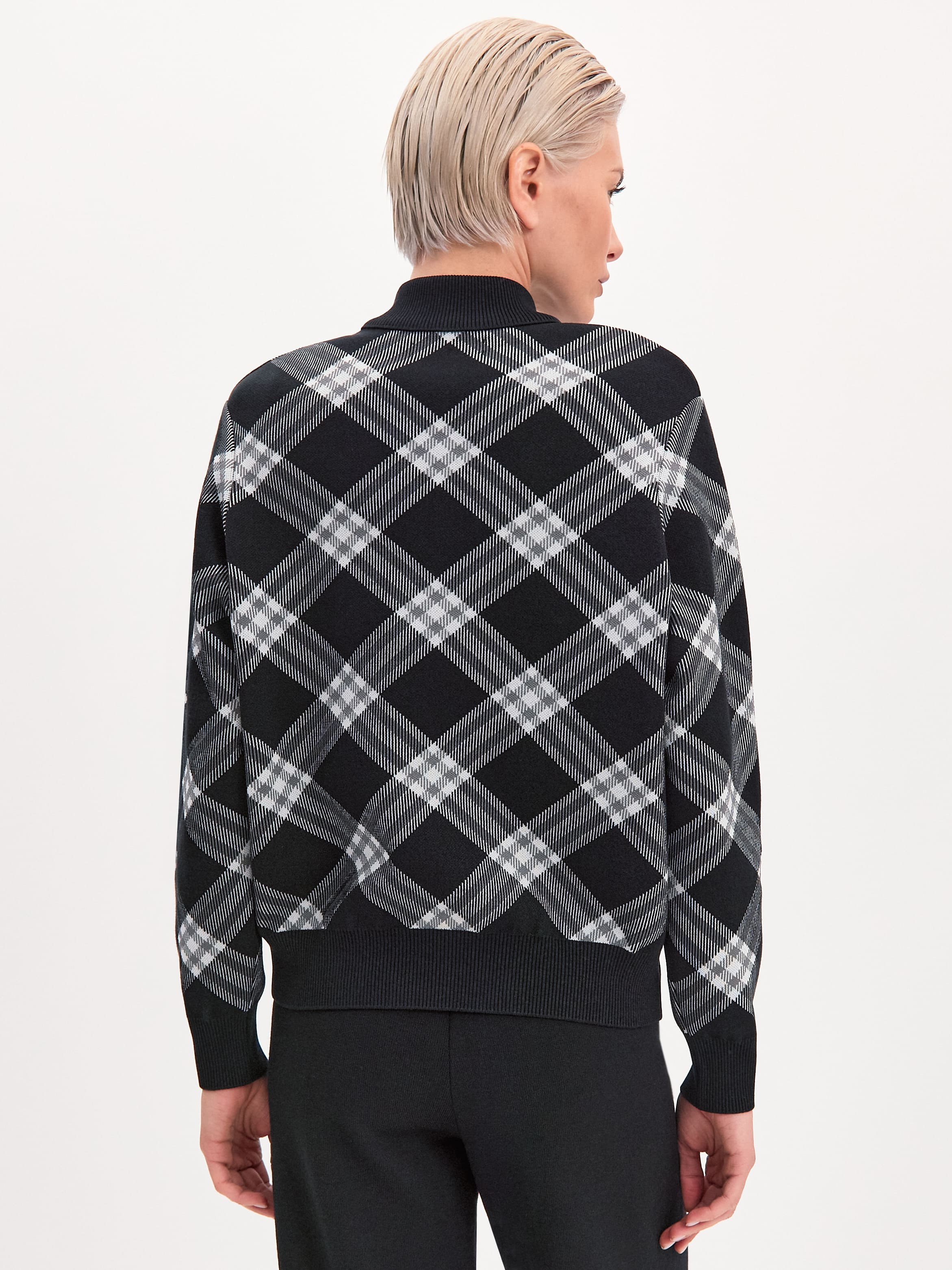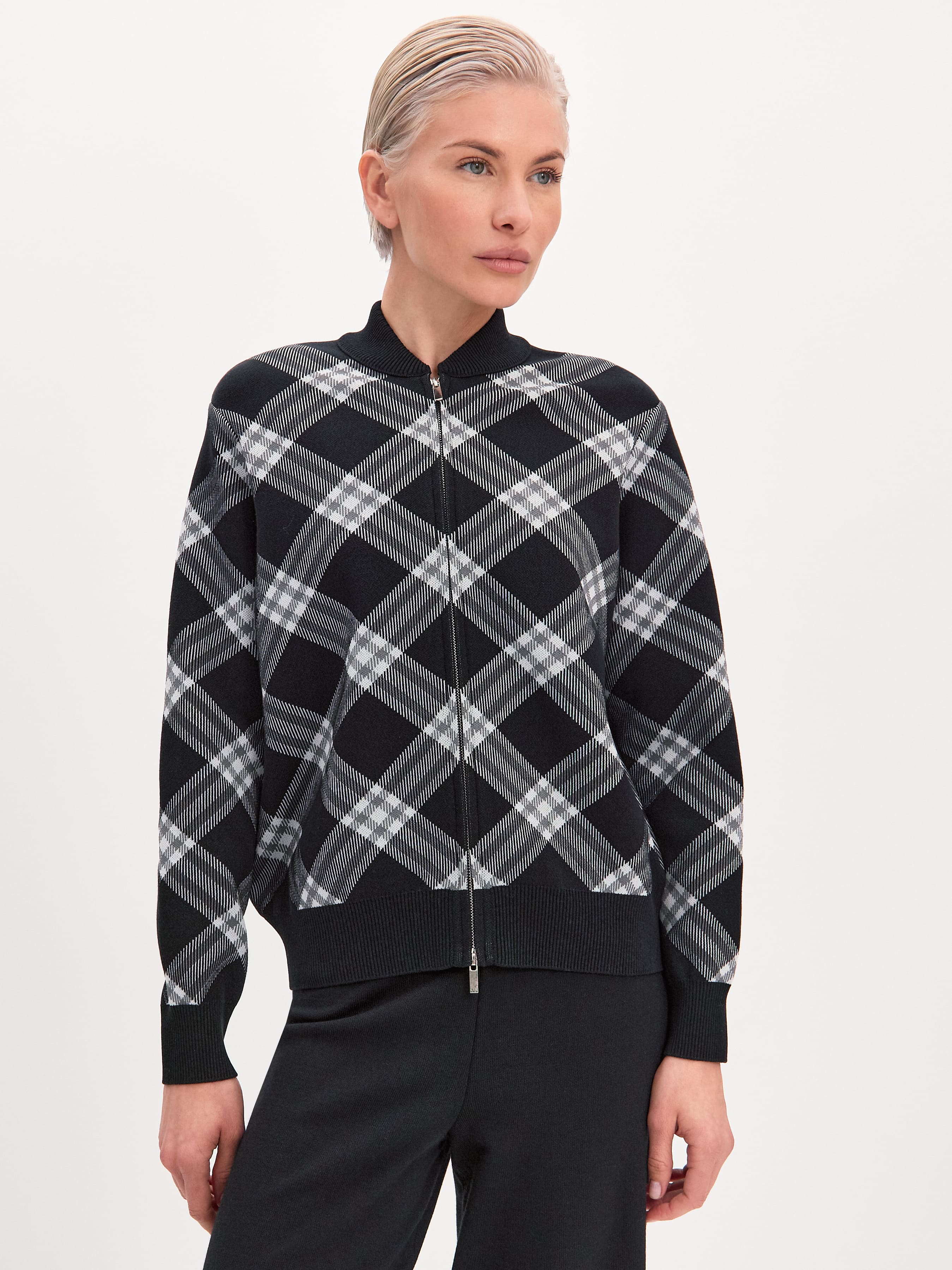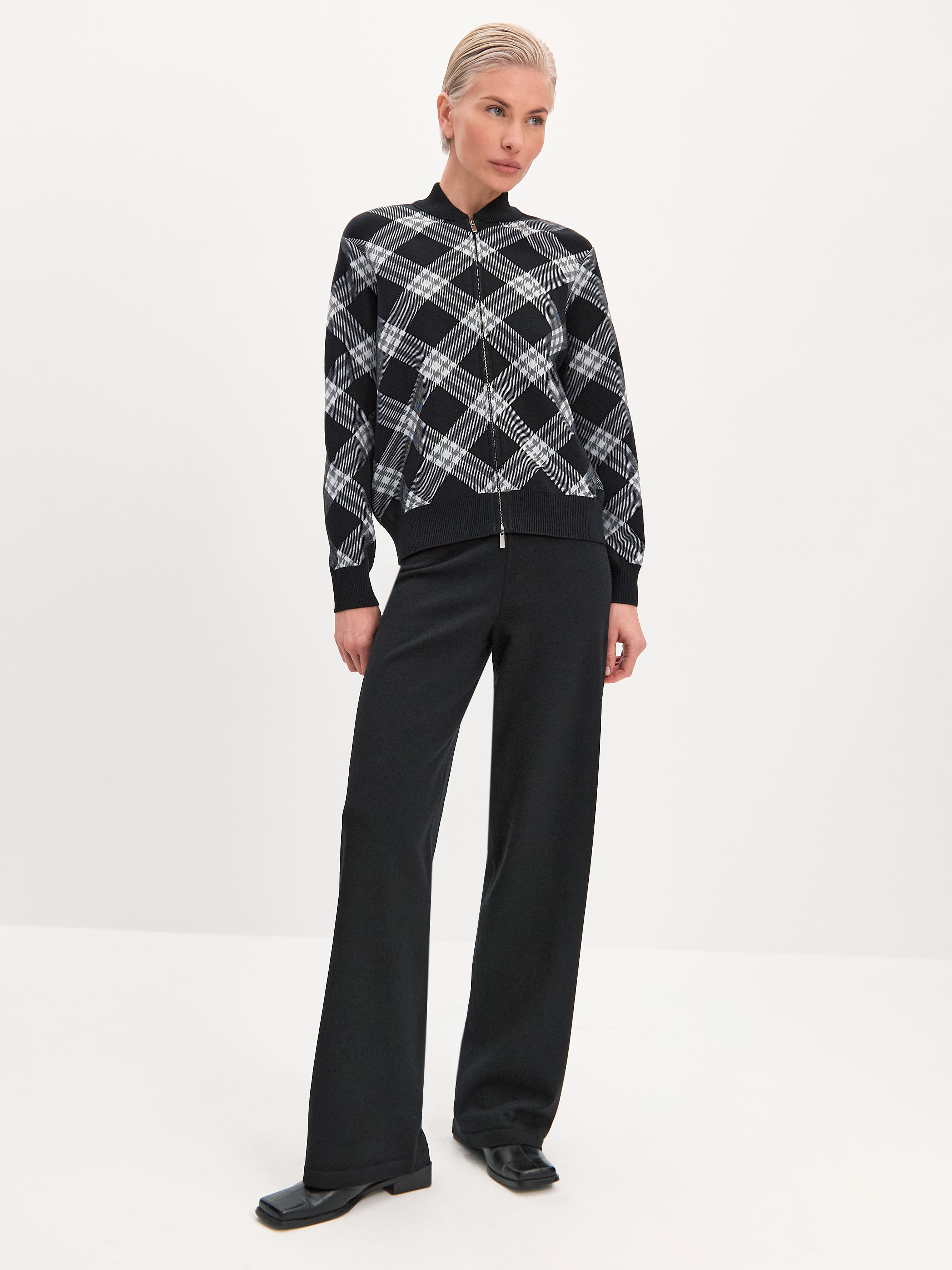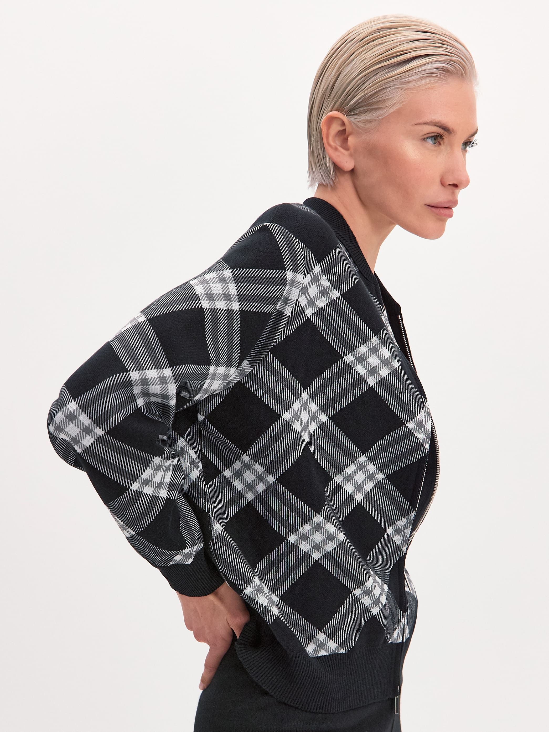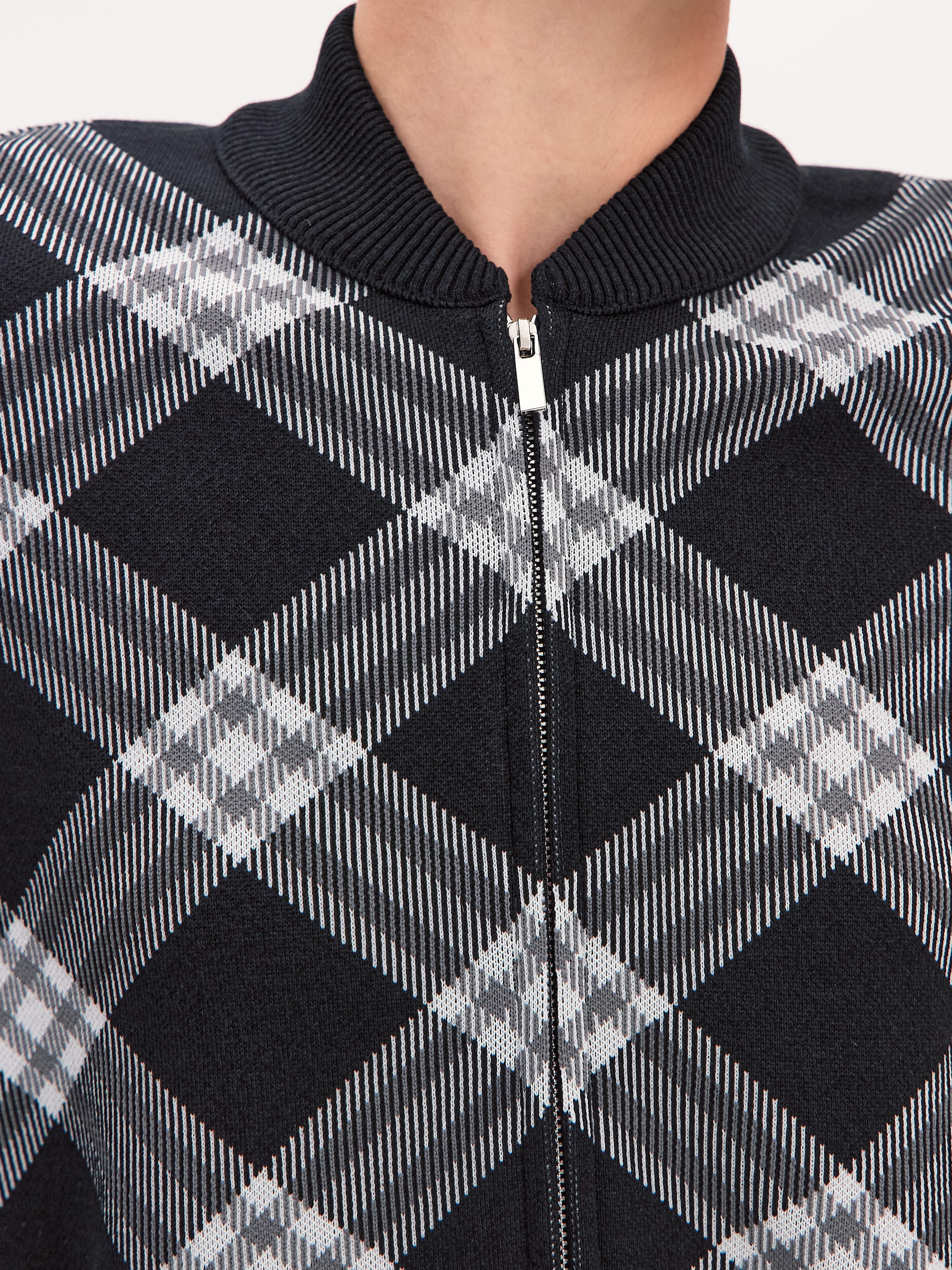 Трикотажный стилеобразующий бомбер из плотно переплетенной вискозы. Настроение модели задает акцентный принт. Диагональные линии клетки выступают корректорами фигуры, визуально удлиняя ее верхнюю часть. Для этой модели мы отобрали премиальную вискозную пряжу за её способность глубоко впитывать и удерживать в себе окрашивающий пигмент. Поэтому рисунок сохранит свою контрастность даже после многократных стирок. Бомбер на металлической двусторонней молнии. Замки расстегиваются сверху и снизу одновременно, позволяя менять степень открытости образа. Воротничок изделия вывязан в два слоя.