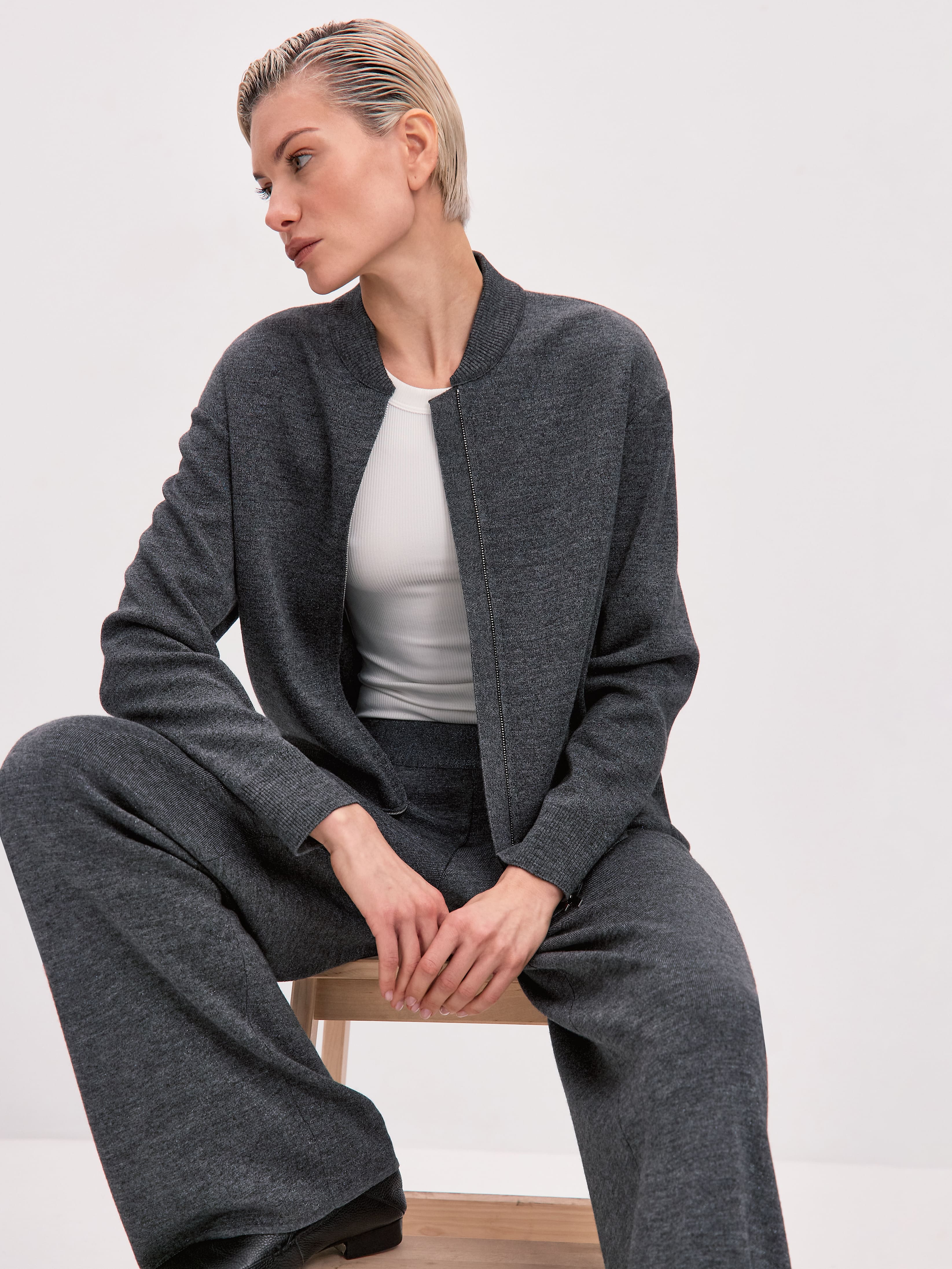Теплый кардиган-бомбер с деликатным люрексом. Уютно-мягкий, благодаря гладкой мериносовой шерсти. Подчеркнуто нарядный, благодаря звездному мерцанию металлизированной нити. Дополнен текстурированными манжетами, низом и горловиной. В этой модели мы отказались от объемного силуэта, чтобы вам было комфортно носить бомбер под пальто и пуховиком. Изделие застегивается на молнию с двойным ходом, позволяющую экспериментировать с посадкой. Для более утепленных образов рекомендуем многослойные сочетания кардигана с зимними водолазками MONONAME.<br /><br />