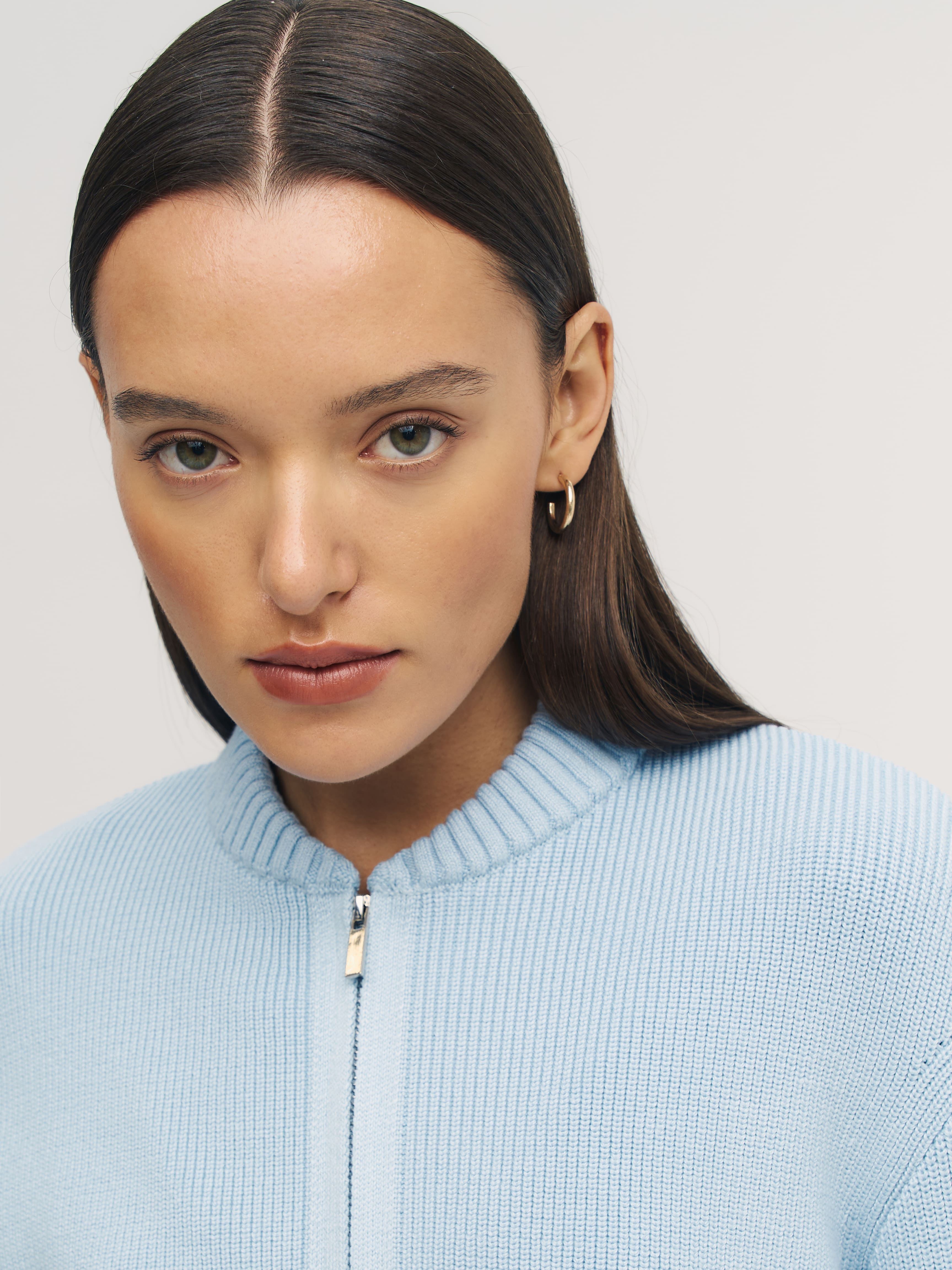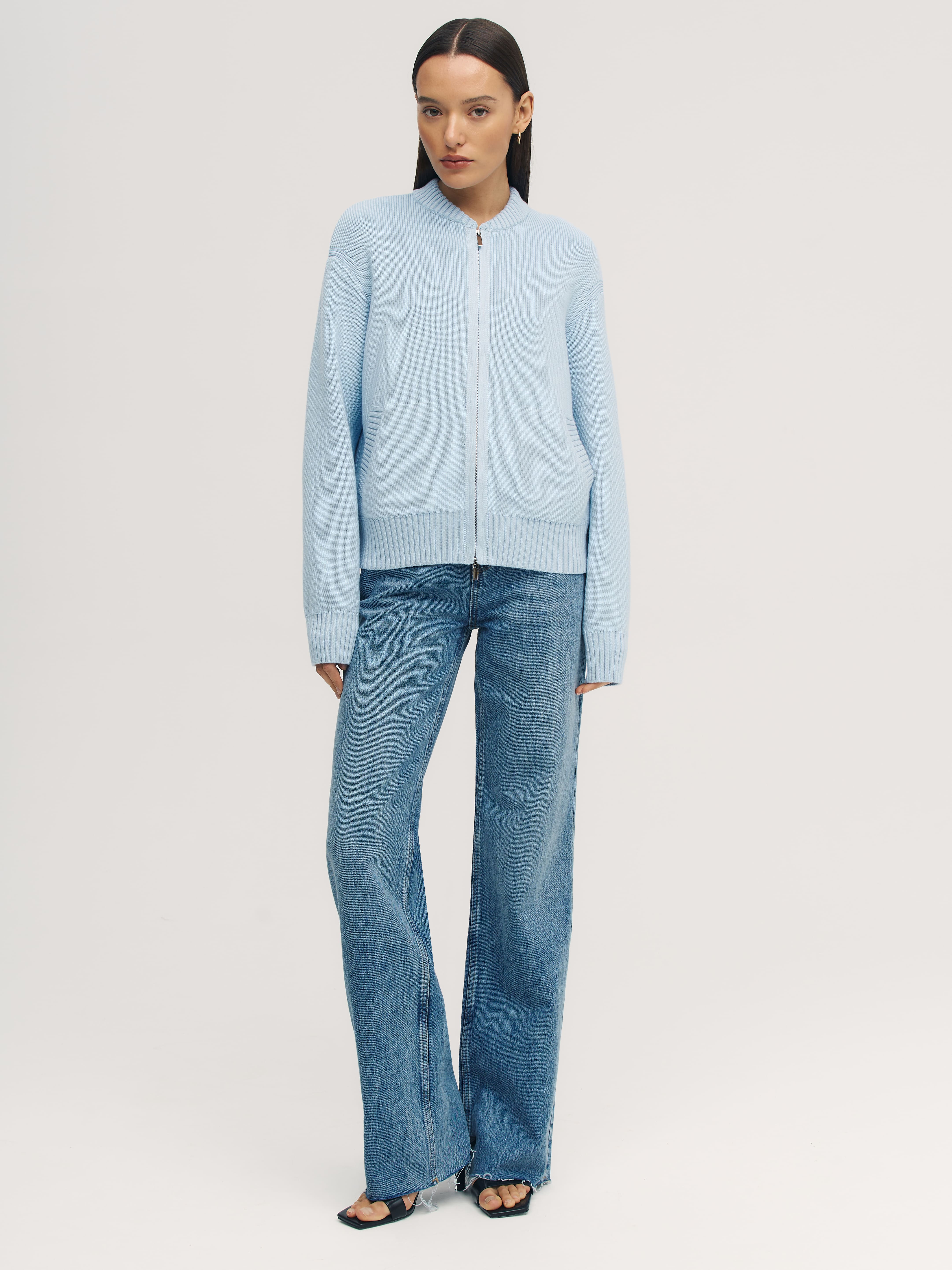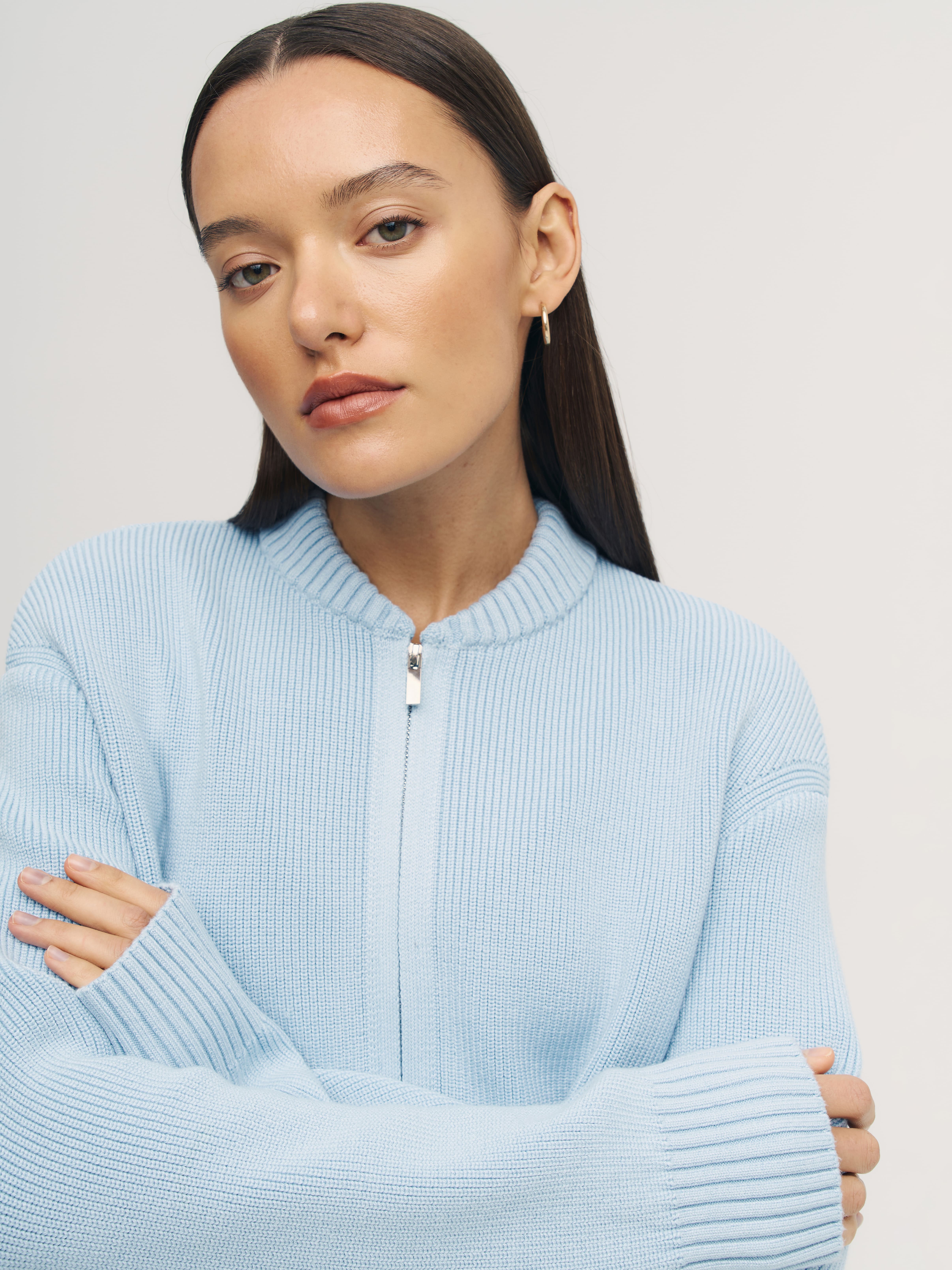 Мягкий бомбер из плотной хлопковой пряжи – приятный на ощупь, дышащий каждой петелькой, бережно хранящий тепло. Джемпер в меру объемный, усиленный добавкой из легкой вискозы и эластичного полиамида. Искусственные волокна помогают хлопку быстро восстанавливать форму. При этом они не снижают воздухопроницаемость и тактильность изделия. В качестве бонуса добавили двойную молнию, чтобы вы продолжили развивать идею сложных многослойных образов.