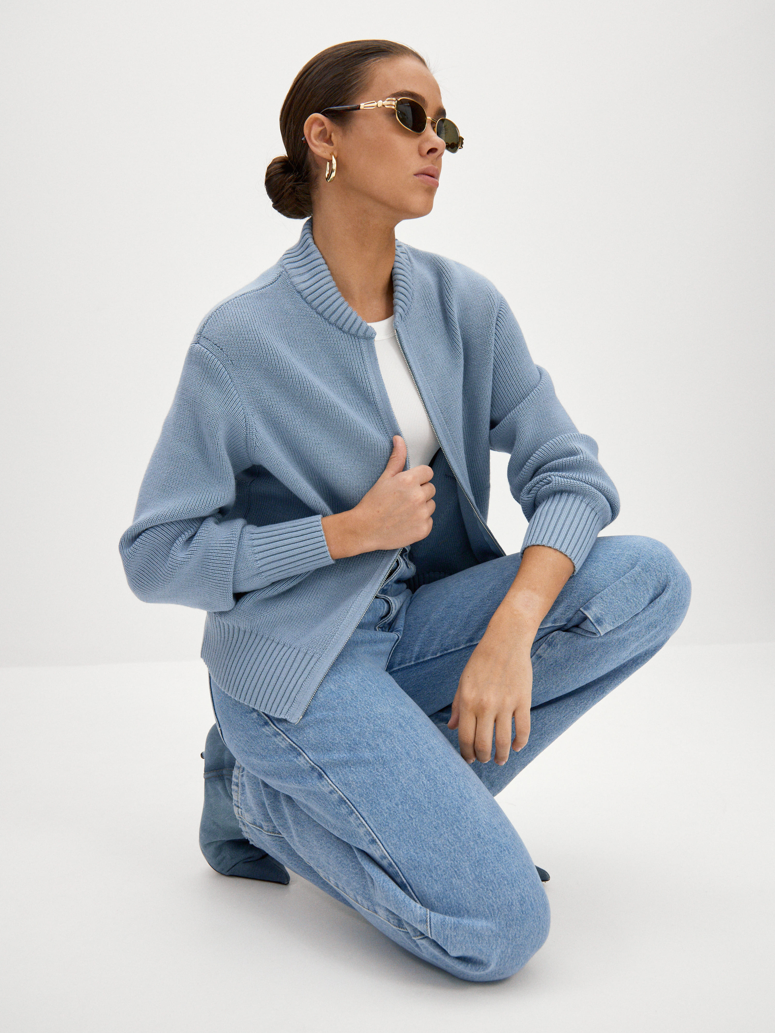 Плотный шерстяной бомбер спокойной расцветки – это одежда для дней, которые хочется посвятить только себе. Молния с двойным ходом корректирует расслабленность образа. Натуральный состав пряжи дарит уютное тепло и чувство приятной защищенности. Под джемпер рекомендуем вещи из тонкого хлопка. Они нейтрализуют покалывающий эффект натуральных шерстинок и создадут дополнительную воздушную капсулу между телом и трикотажем.
