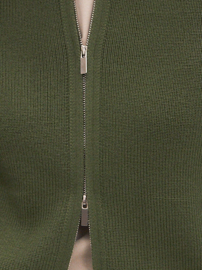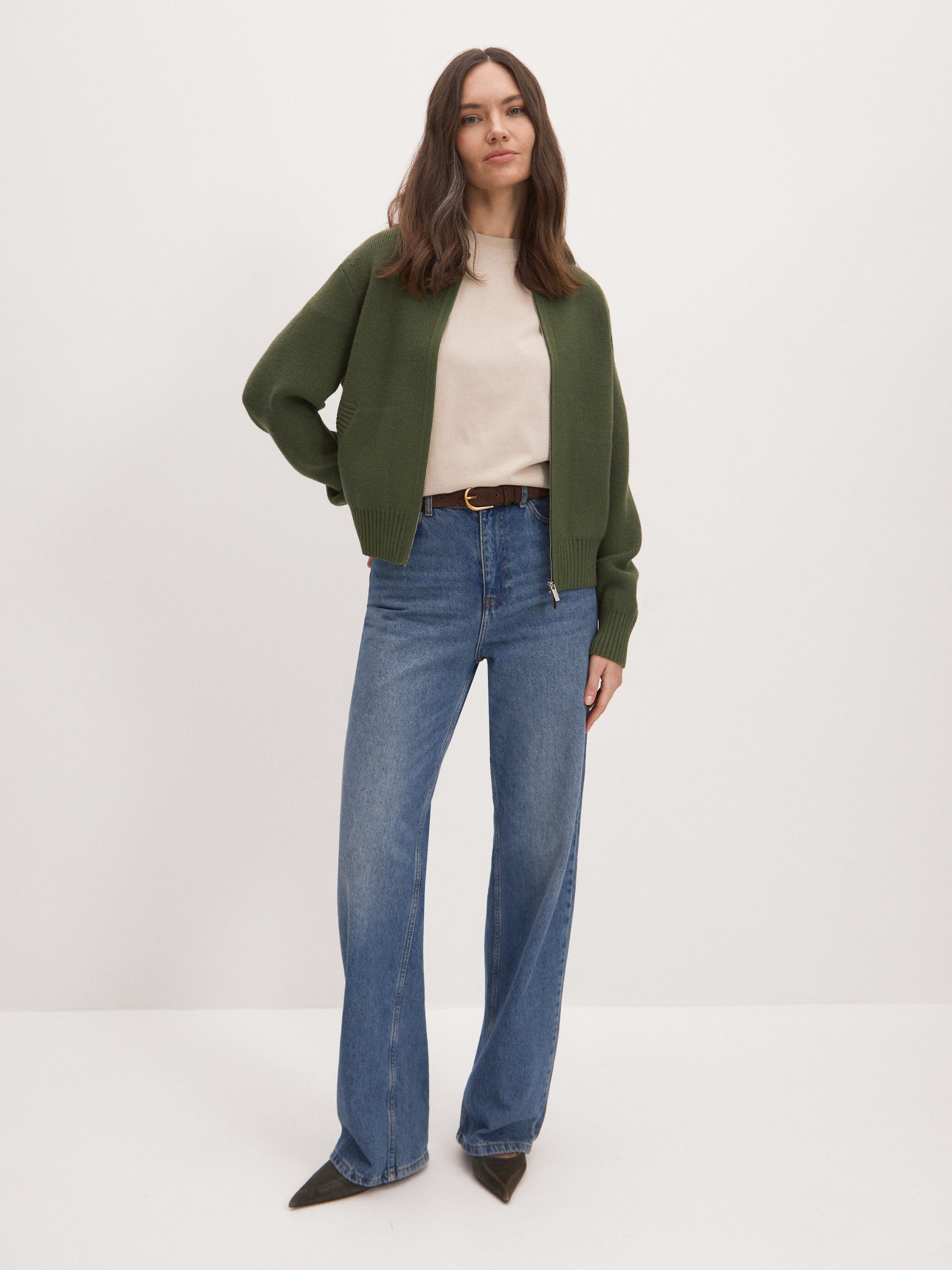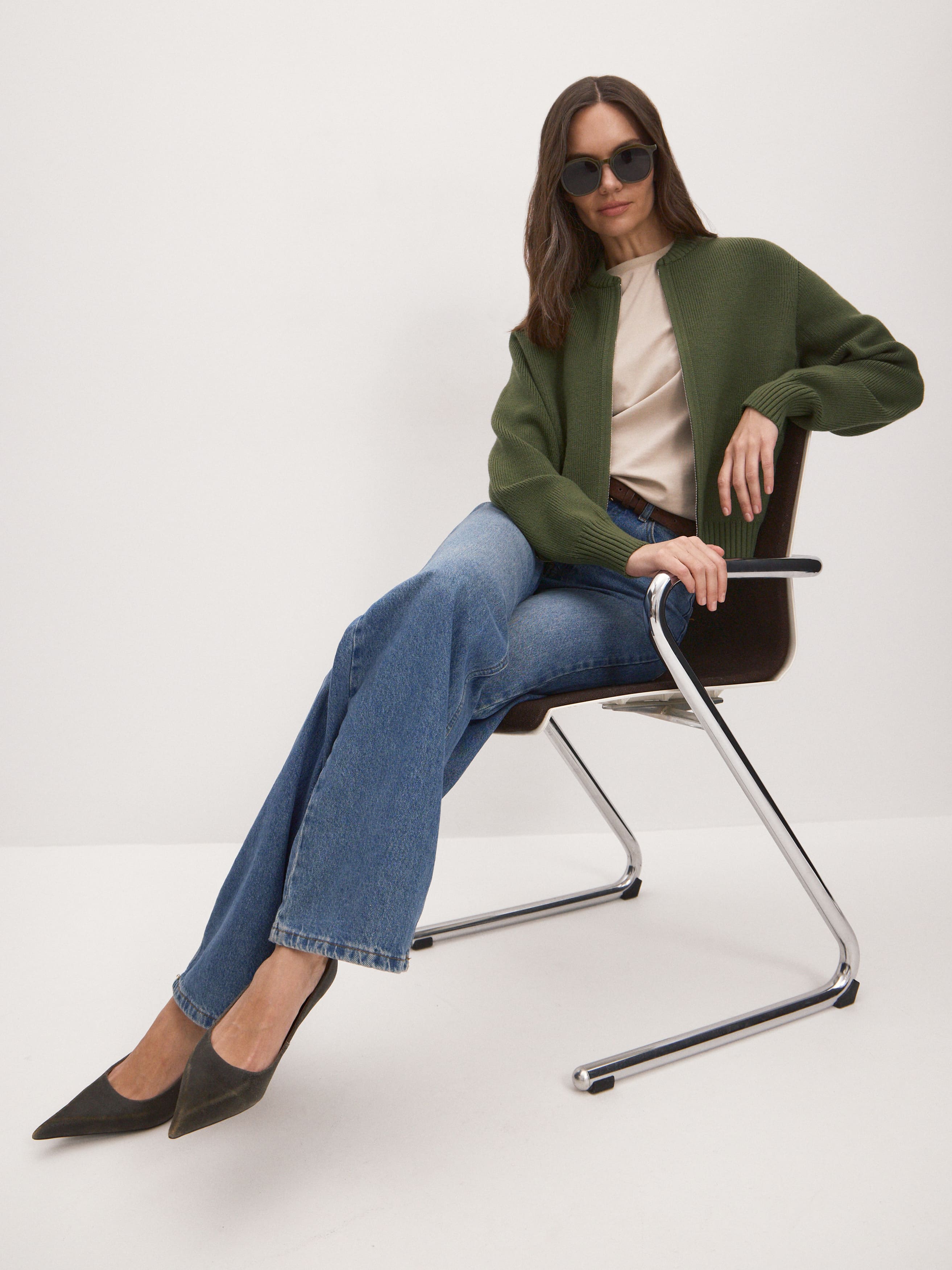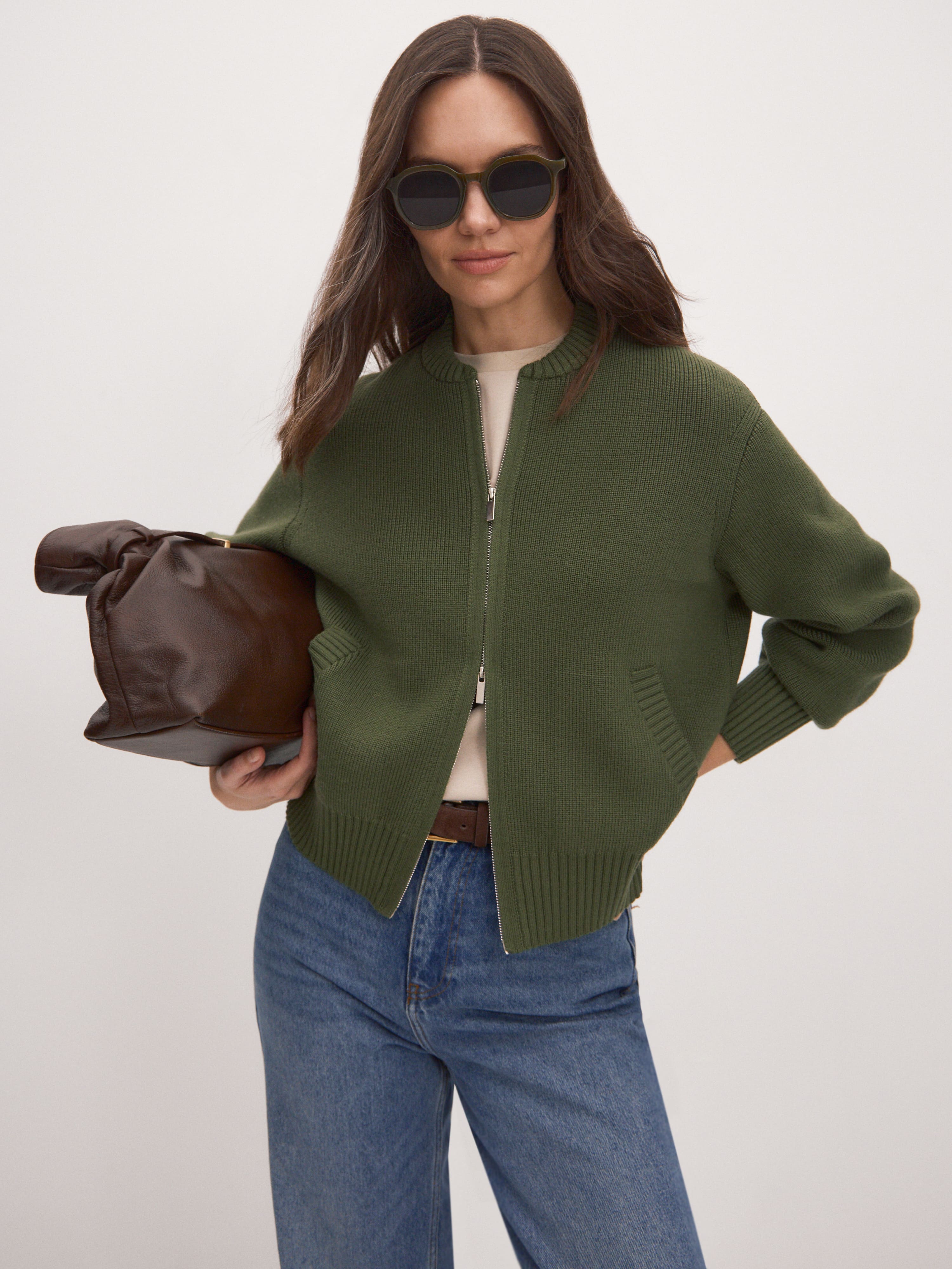 Плотный шерстяной бомбер спокойной расцветки – это одежда для дней, которые хочется посвятить только себе. Молния с двойным ходом корректирует расслабленность образа. Натуральный состав пряжи дарит уютное тепло и чувство приятной защищенности. Под джемпер рекомендуем вещи из тонкого хлопка. Они нейтрализуют покалывающий эффект натуральных шерстинок и создадут дополнительную воздушную капсулу между телом и трикотажем.