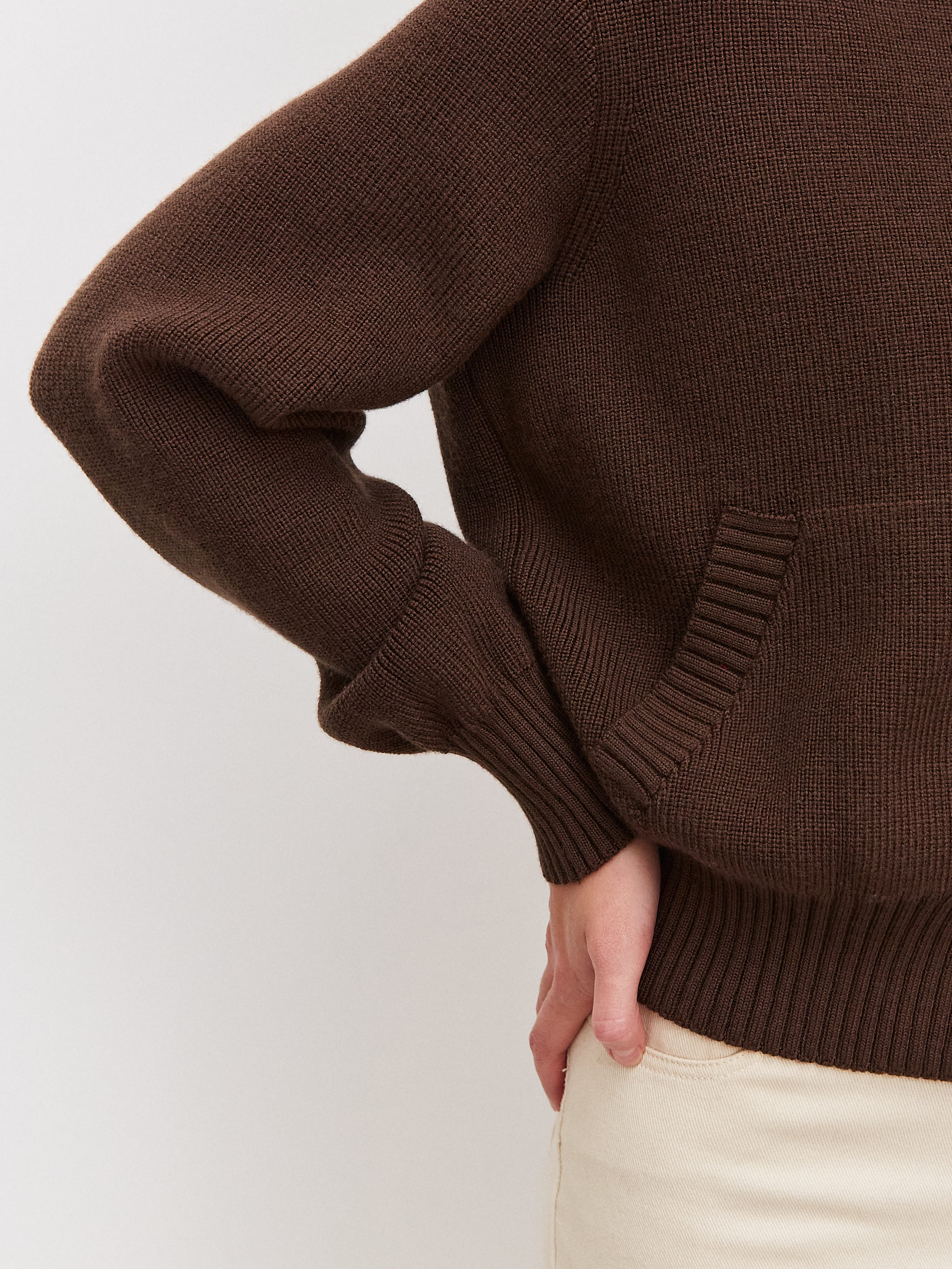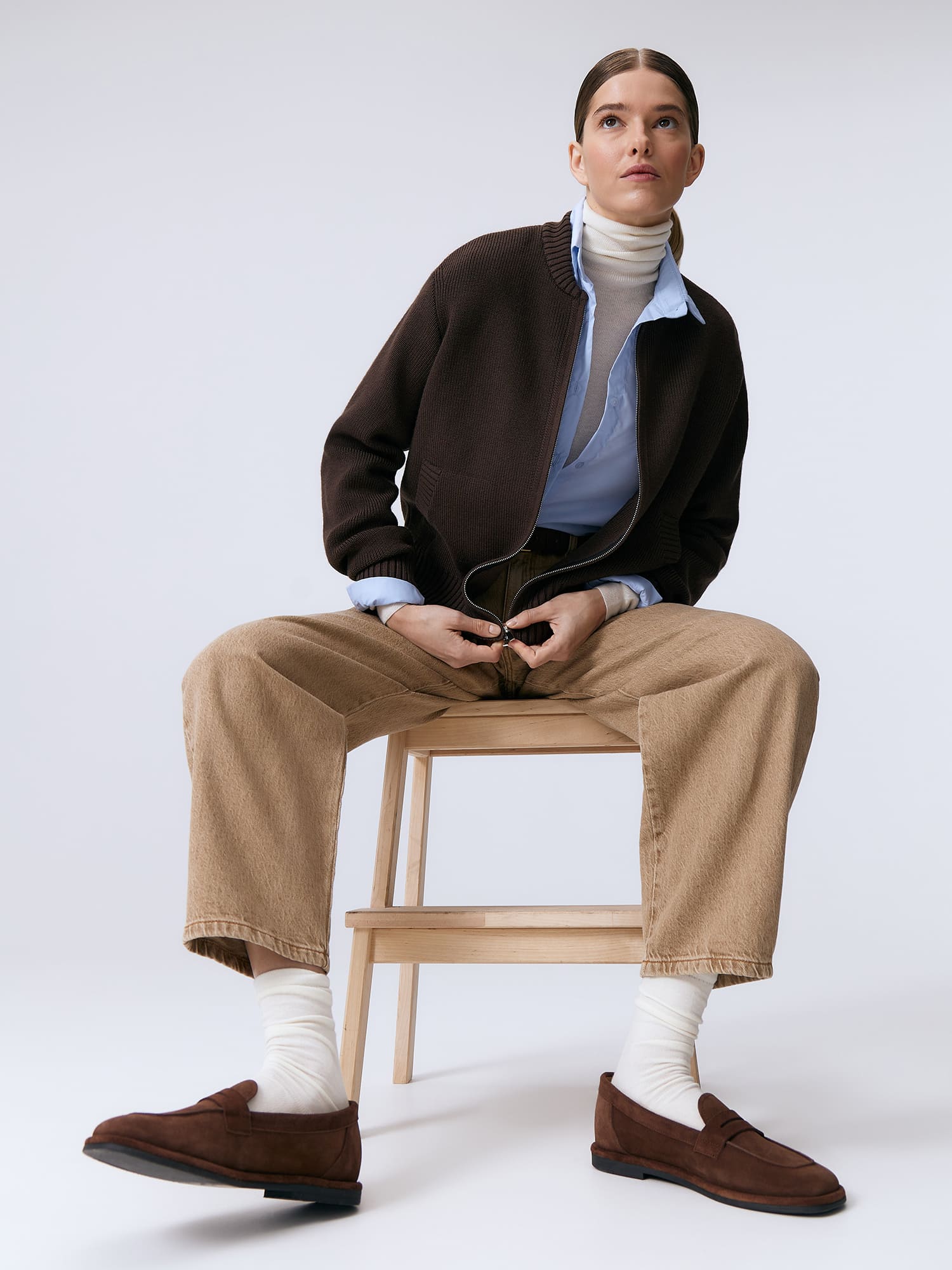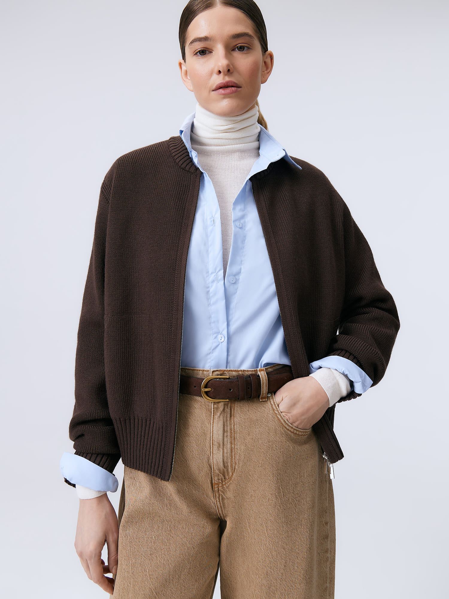 Плотный шерстяной бомбер спокойной расцветки – это одежда для дней, которые хочется посвятить только себе. Молния с двойным ходом корректирует расслабленность образа. Натуральный состав пряжи дарит уютное тепло и чувство приятной защищенности. Под джемпер рекомендуем вещи из тонкого хлопка. Они нейтрализуют покалывающий эффект натуральных шерстинок и создадут дополнительную воздушную капсулу между телом и трикотажем.