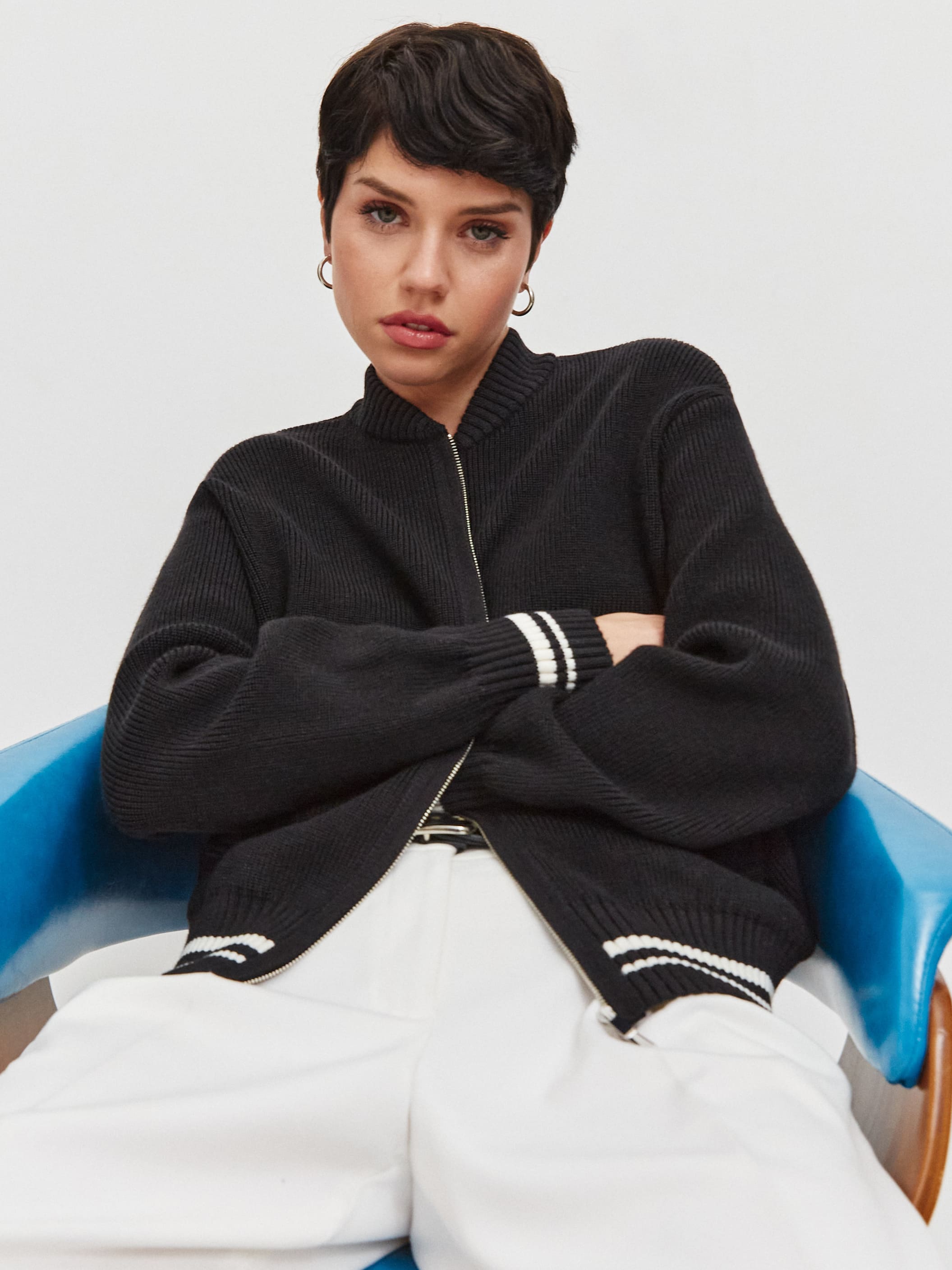 Плотный шерстяной бомбер спокойной расцветки – это одежда для дней, которые хочется посвятить только себе. Молния с двойным ходом корректирует расслабленность образа. Натуральный состав пряжи дарит уютное тепло и чувство приятной защищенности. Под джемпер рекомендуем вещи из тонкого хлопка. Они нейтрализуют покалывающий эффект натуральных шерстинок и создадут дополнительную воздушную капсулу между телом и трикотажем.