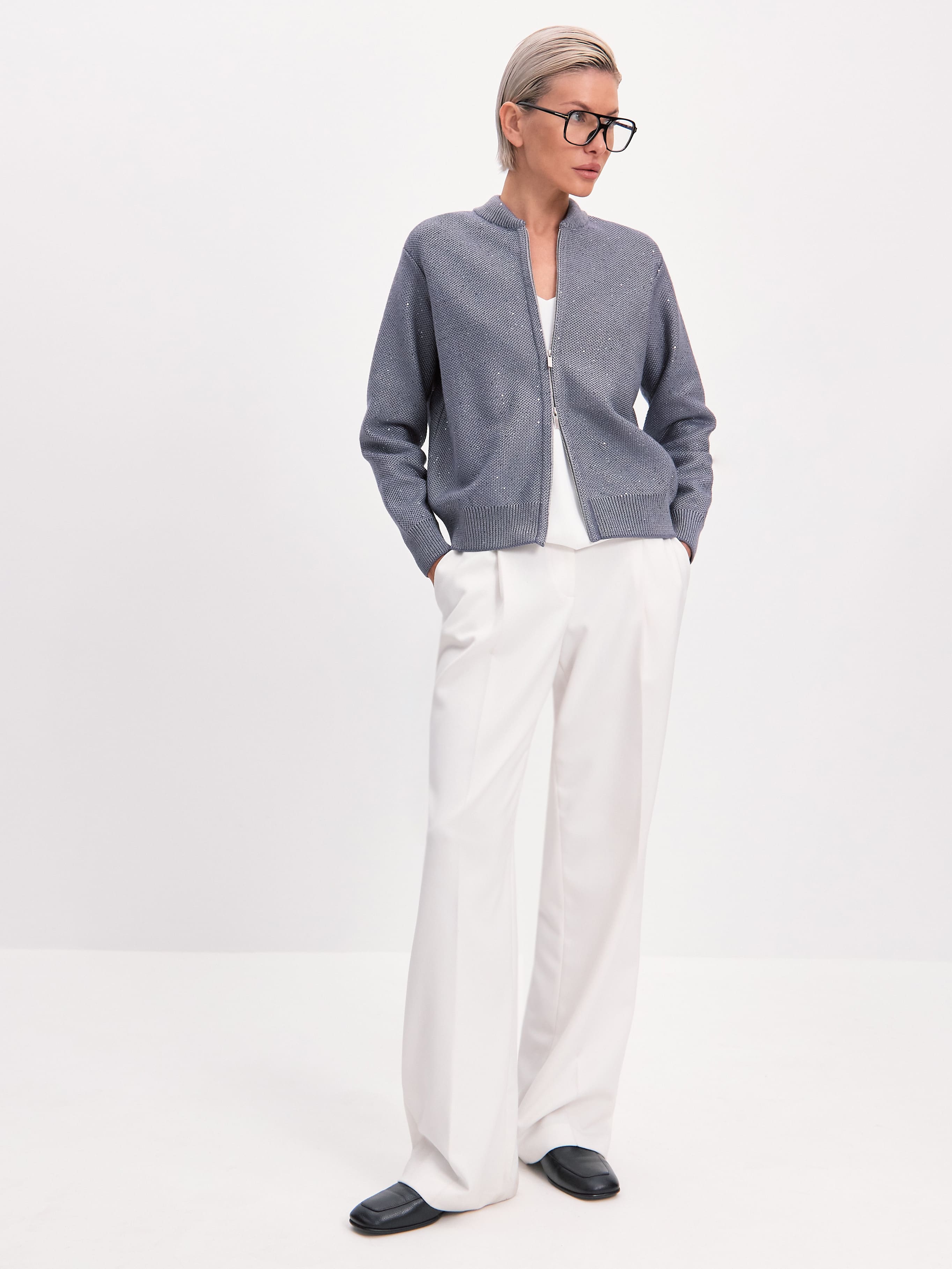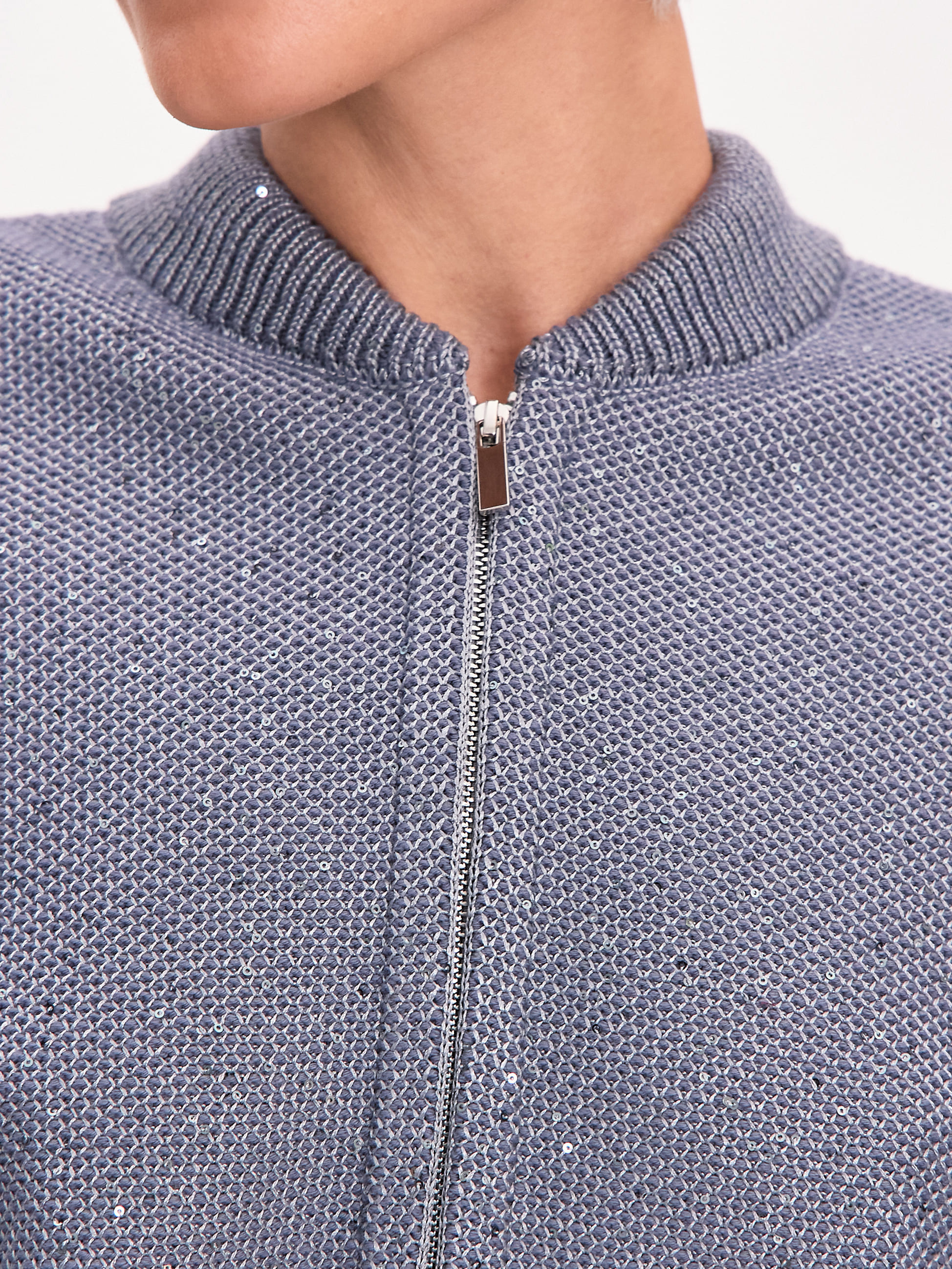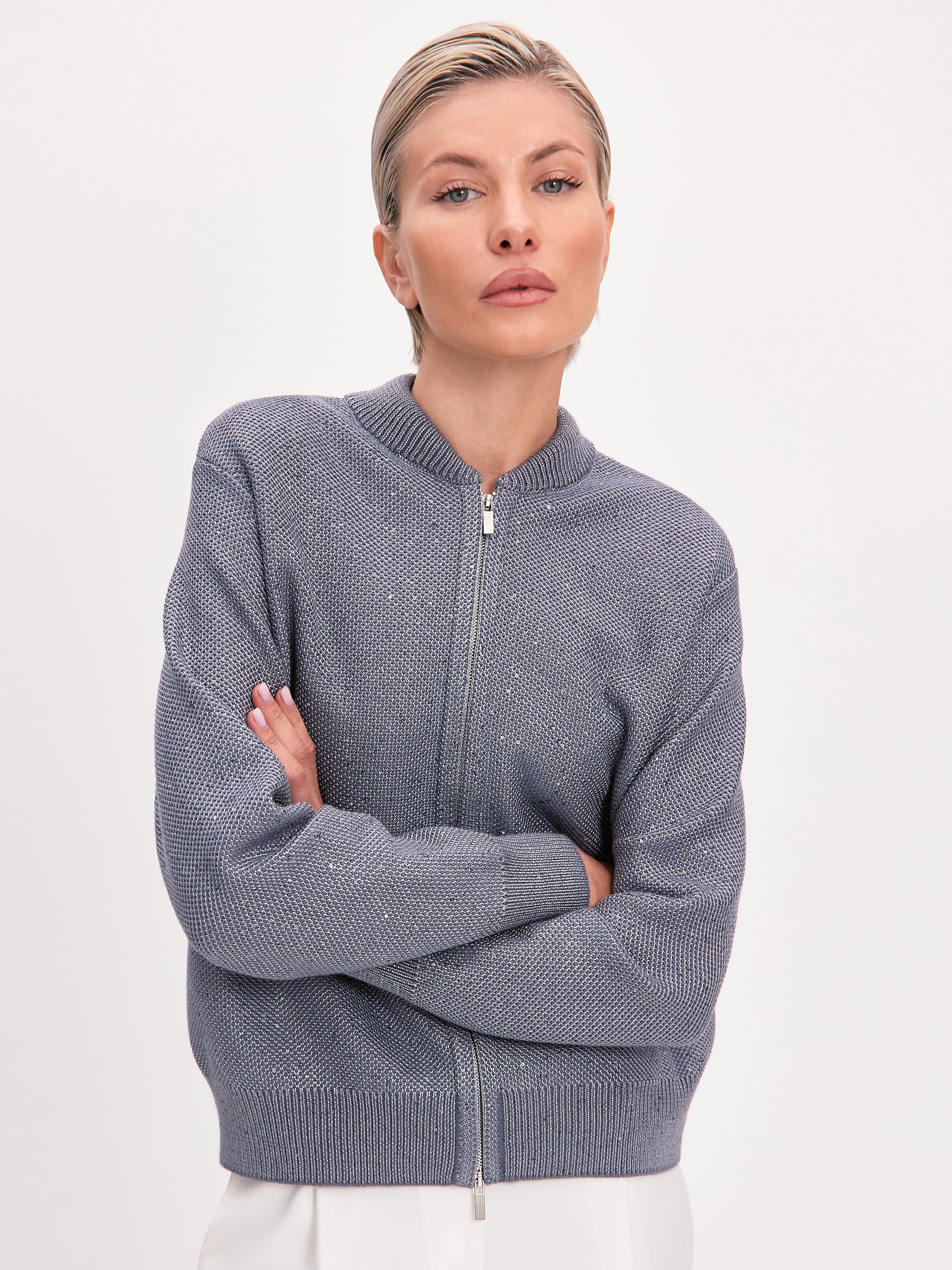 Стилеобразующий хлопковый бомбер с деликатной россыпью микропайеток и двухзамковой молнией. Гармоничный силуэт с чуть заниженной линией плеча,  широкими манжетами и воротничком-стойкой, связанным в два слоя. В данной модели задействованы пайетки с минимальным диаметром. Трикотажное полотно бомбера выполнено в технике платировки, а пайетки вплетаются в него только с лицевой стороны. Такой прием сохраняет тактильность изнанки изделия. Результат: при контакте с телом хлопковая основа кардигана продолжает дарить ощущение комфортной мягкости и тепла.