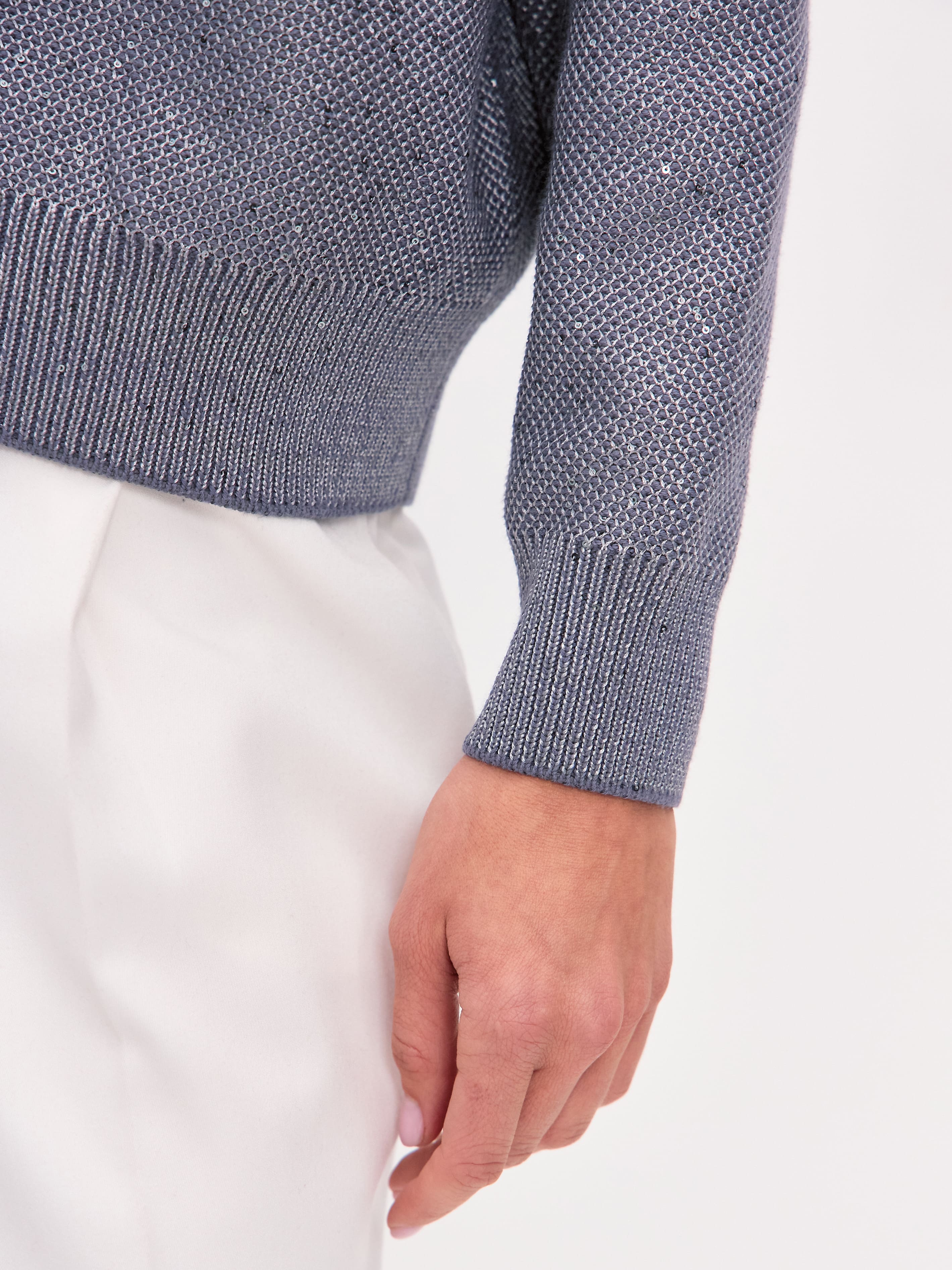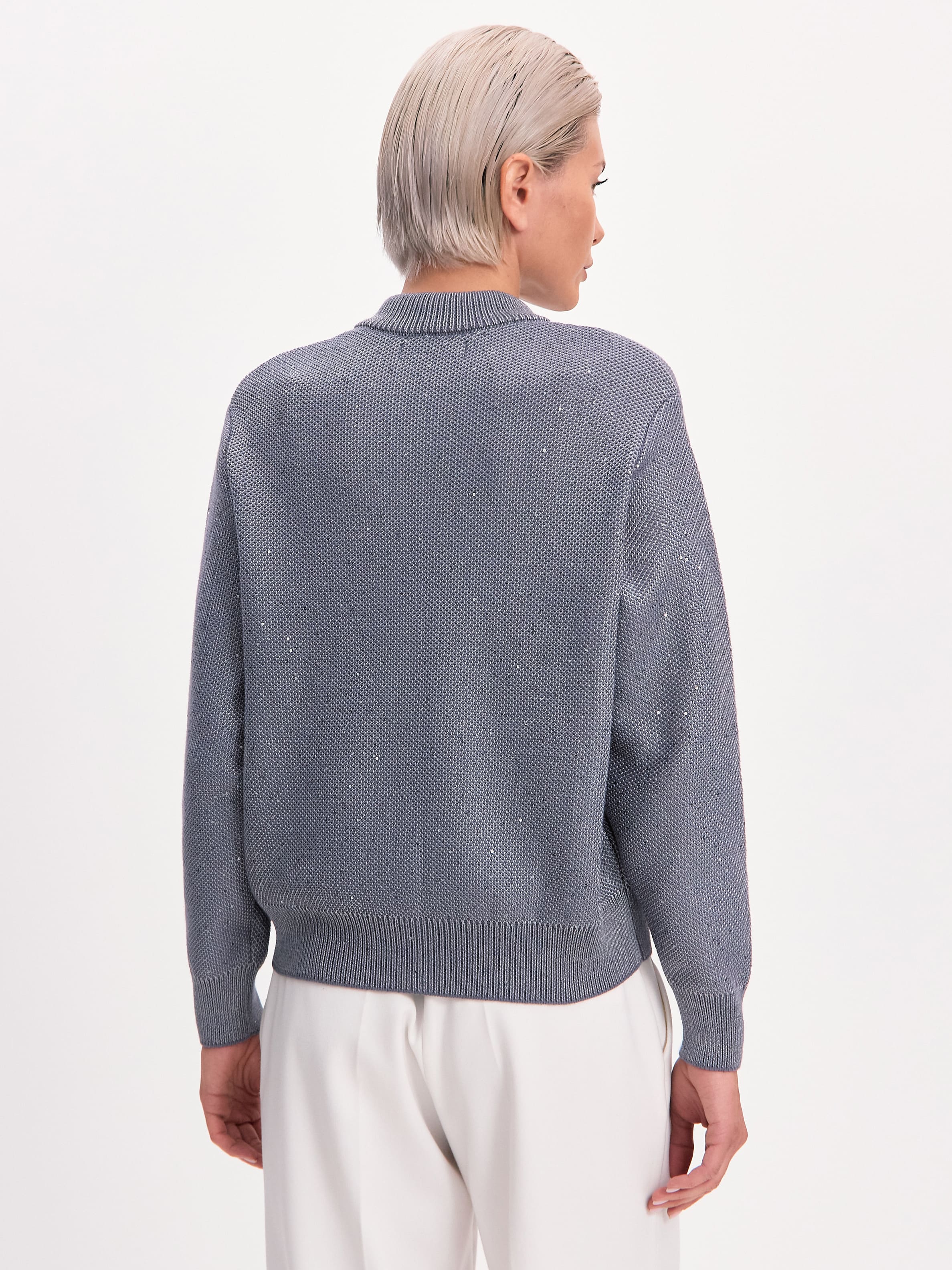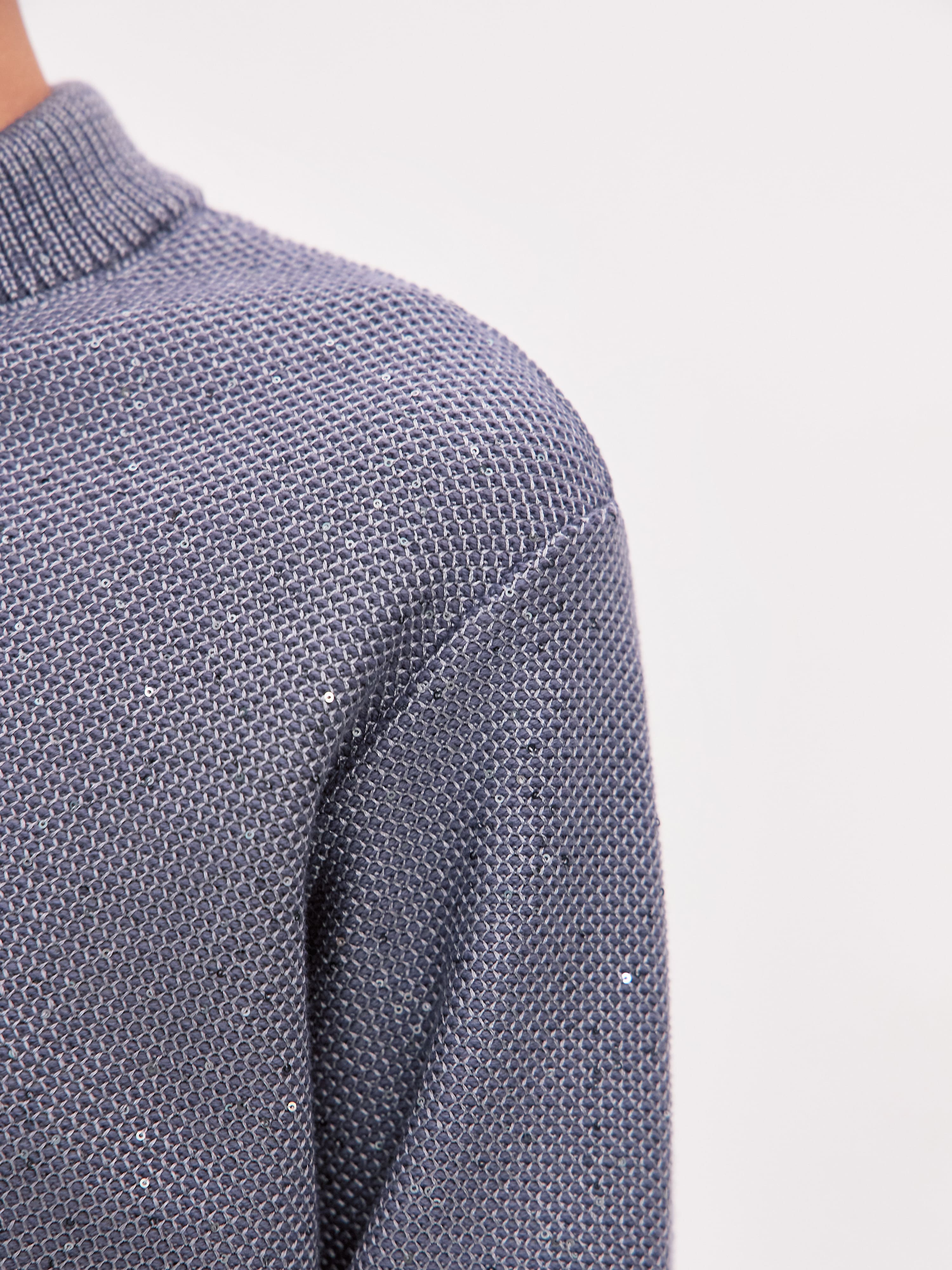 Стилеобразующий хлопковый бомбер с деликатной россыпью микропайеток и двухзамковой молнией. Гармоничный силуэт с чуть заниженной линией плеча,  широкими манжетами и воротничком-стойкой, связанным в два слоя. В данной модели задействованы пайетки с минимальным диаметром. Трикотажное полотно бомбера выполнено в технике платировки, а пайетки вплетаются в него только с лицевой стороны. Такой прием сохраняет тактильность изнанки изделия. Результат: при контакте с телом хлопковая основа кардигана продолжает дарить ощущение комфортной мягкости и тепла.