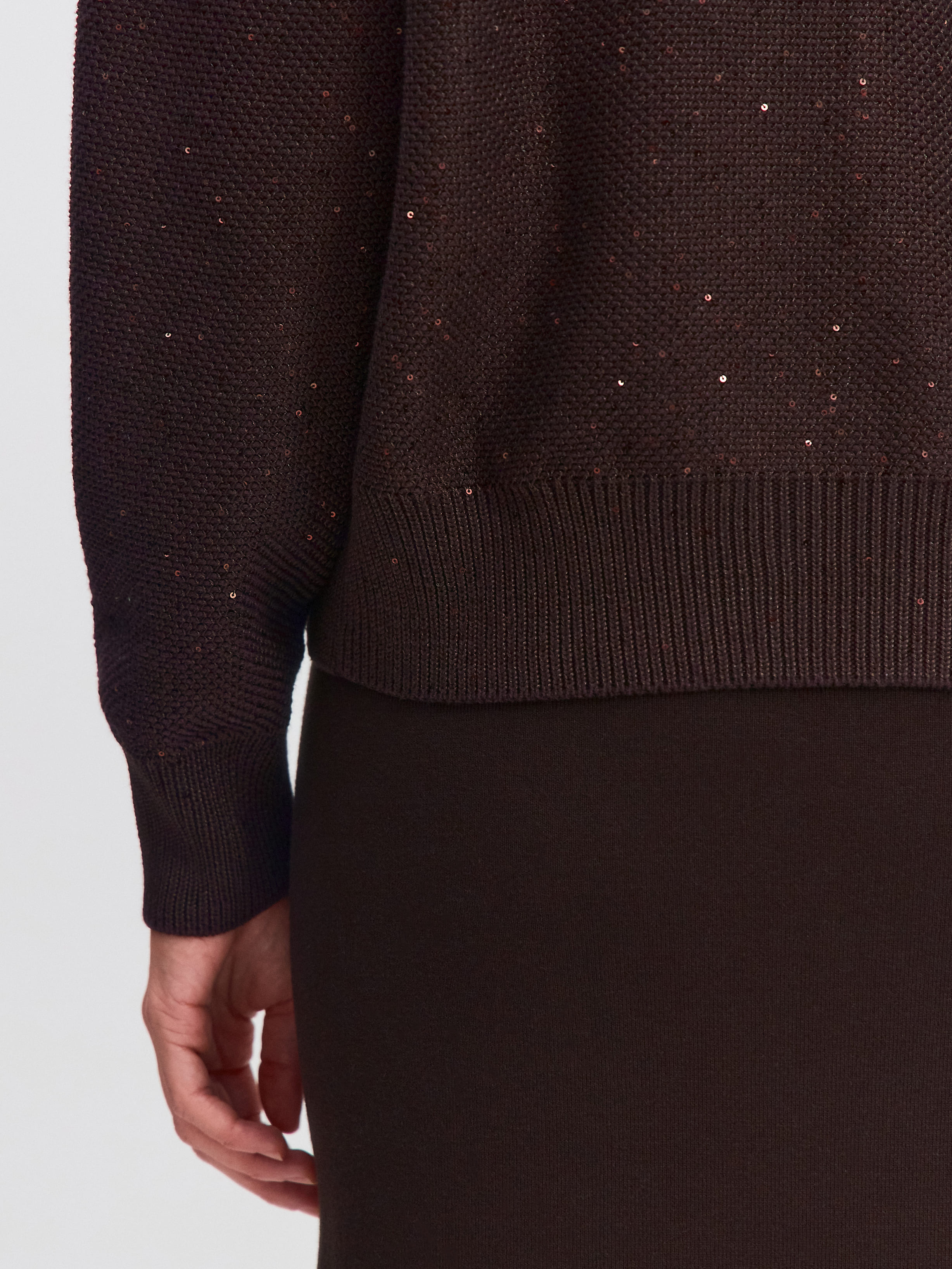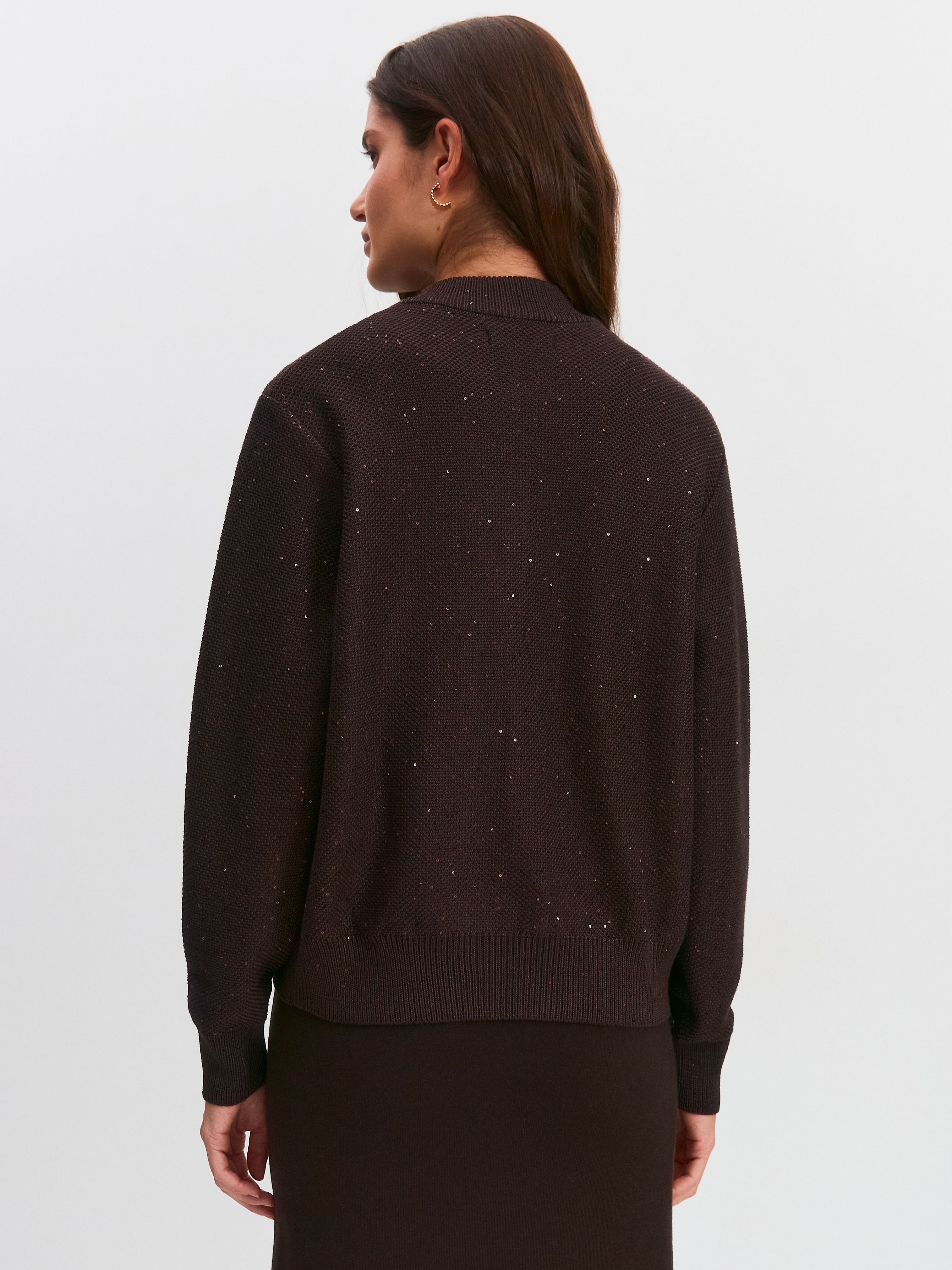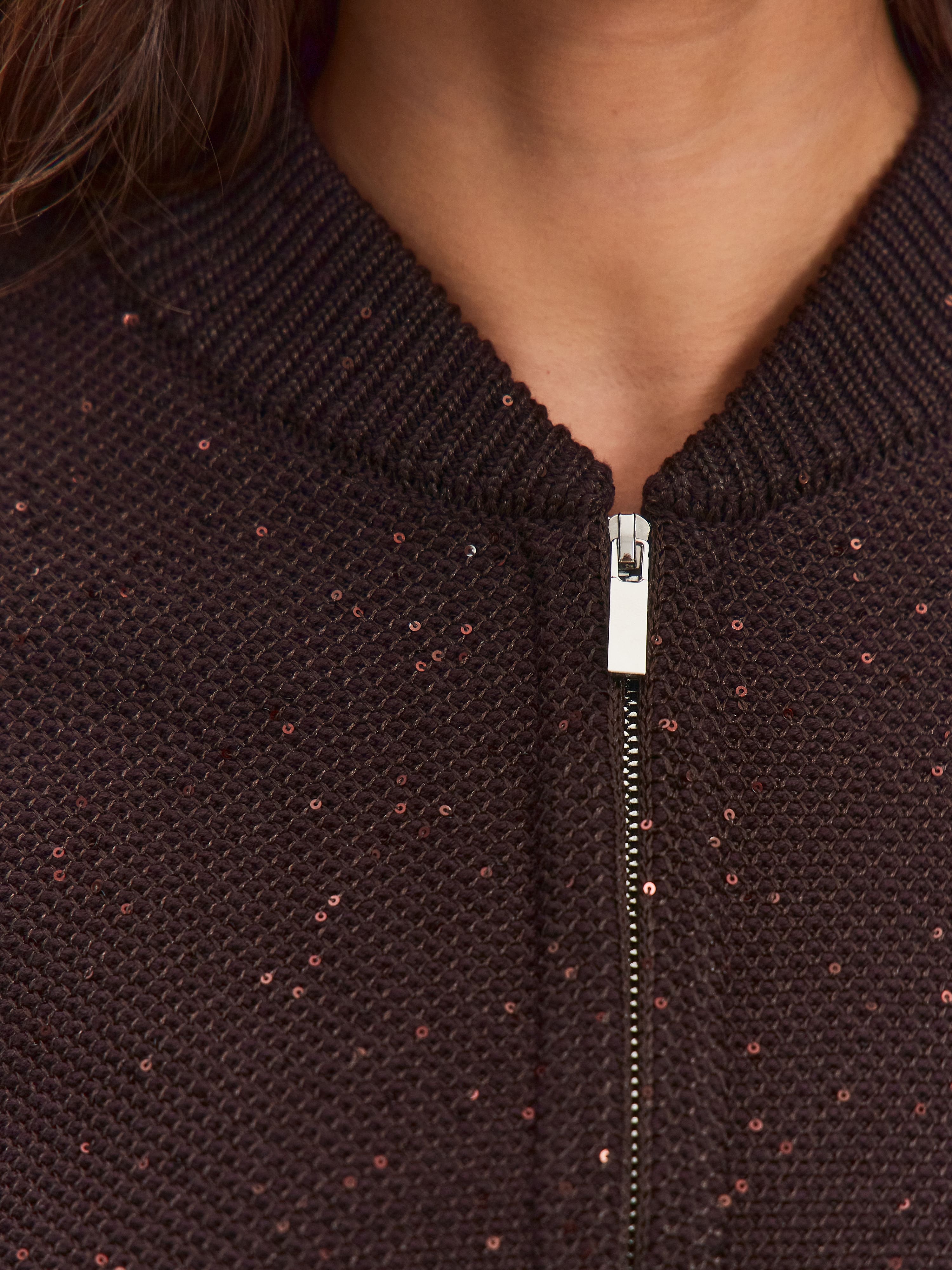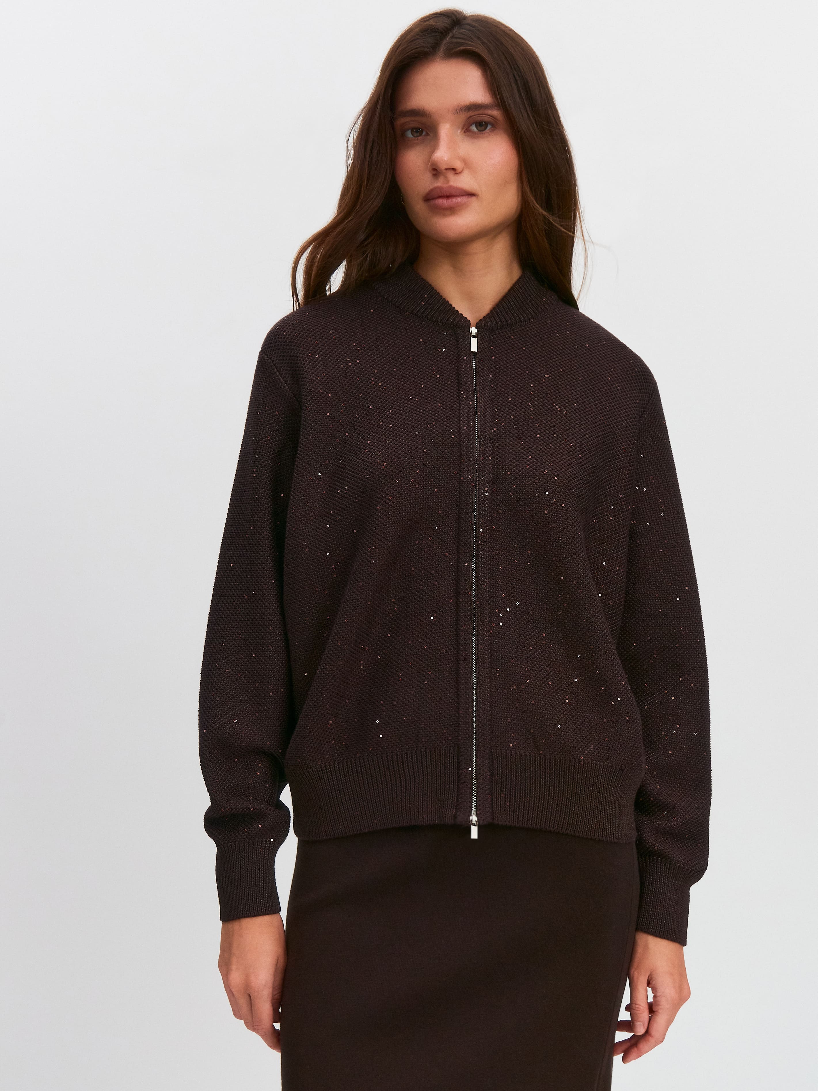 Стилеобразующий хлопковый бомбер с деликатной россыпью микропайеток и двухзамковой молнией. Гармоничный силуэт с чуть заниженной линией плеча, широкими манжетами и воротничком-стойкой, связанным в два слоя. В данной модели задействованы пайетки с минимальным диаметром. Трикотажное полотно бомбера выполнено в технике платировки, а пайетки вплетаются в него только с лицевой стороны. Такой прием сохраняет тактильность изнанки изделия. Результат: при контакте с телом хлопковая основа кардигана продолжает дарить ощущение комфортной мягкости и тепла.