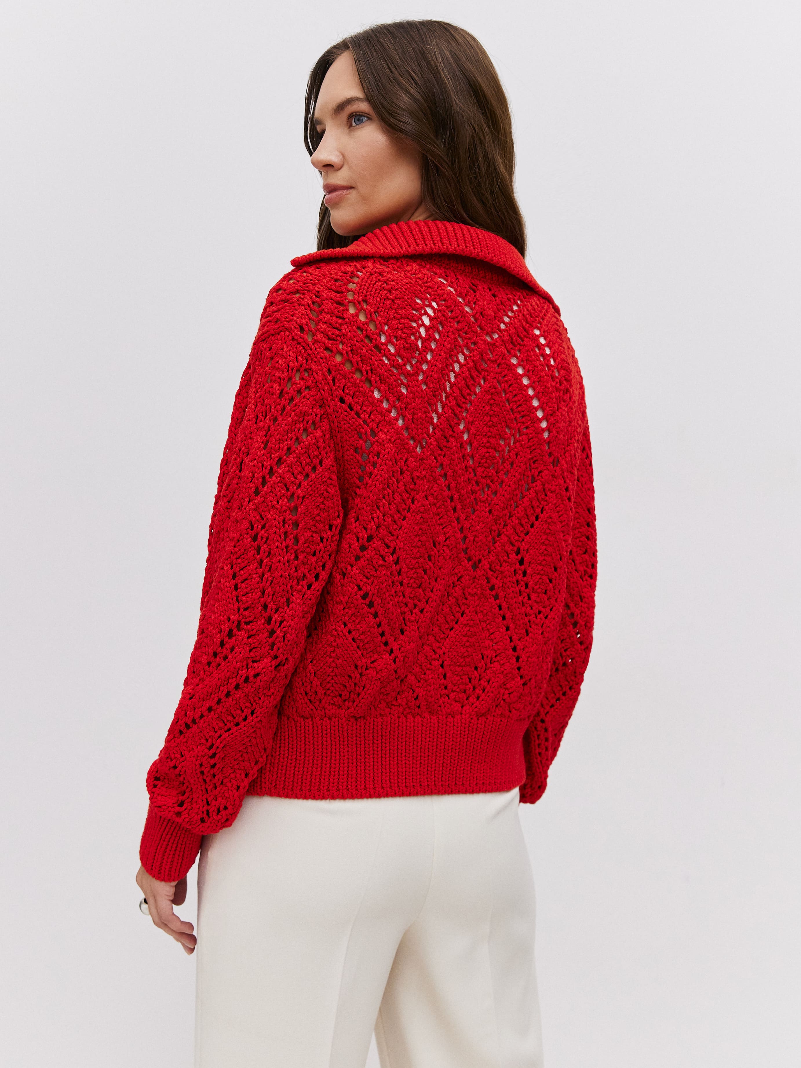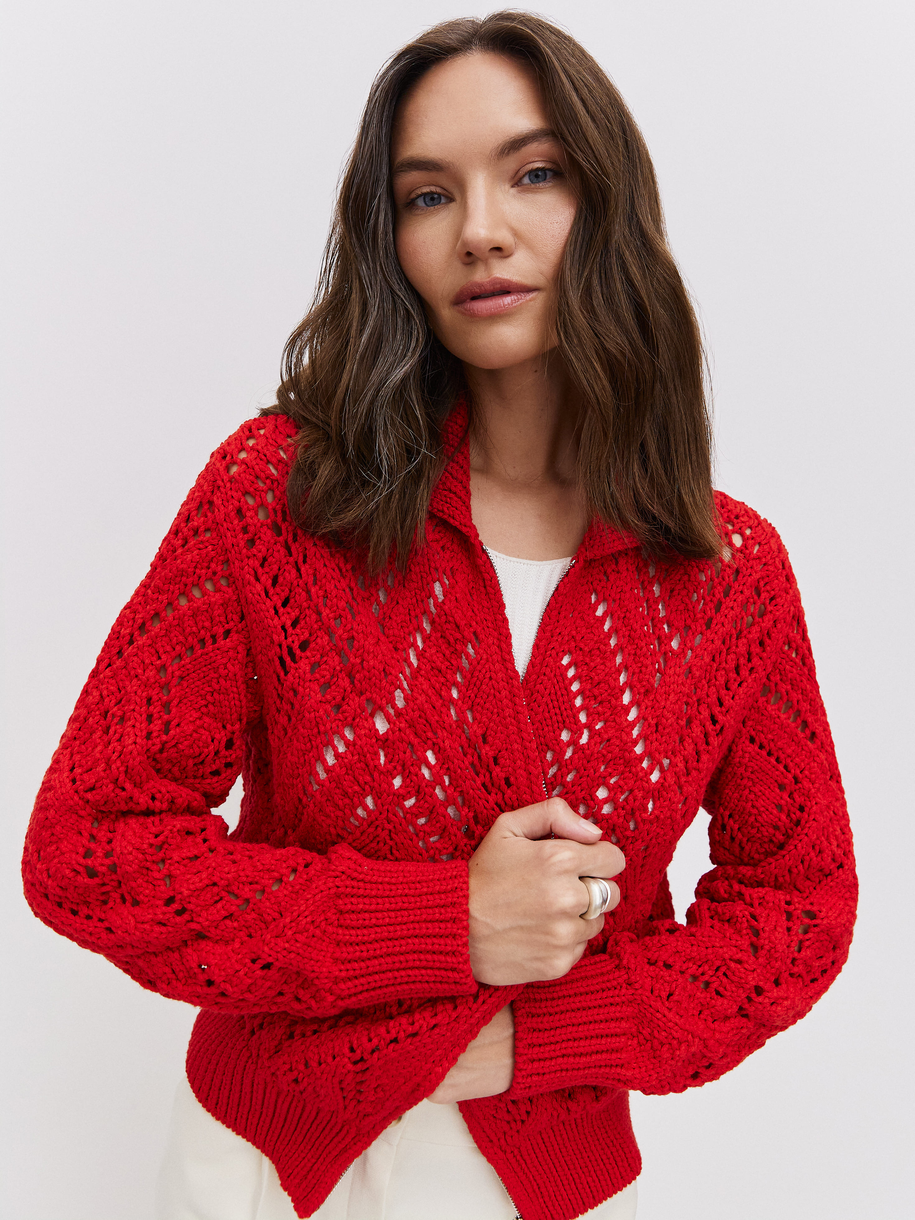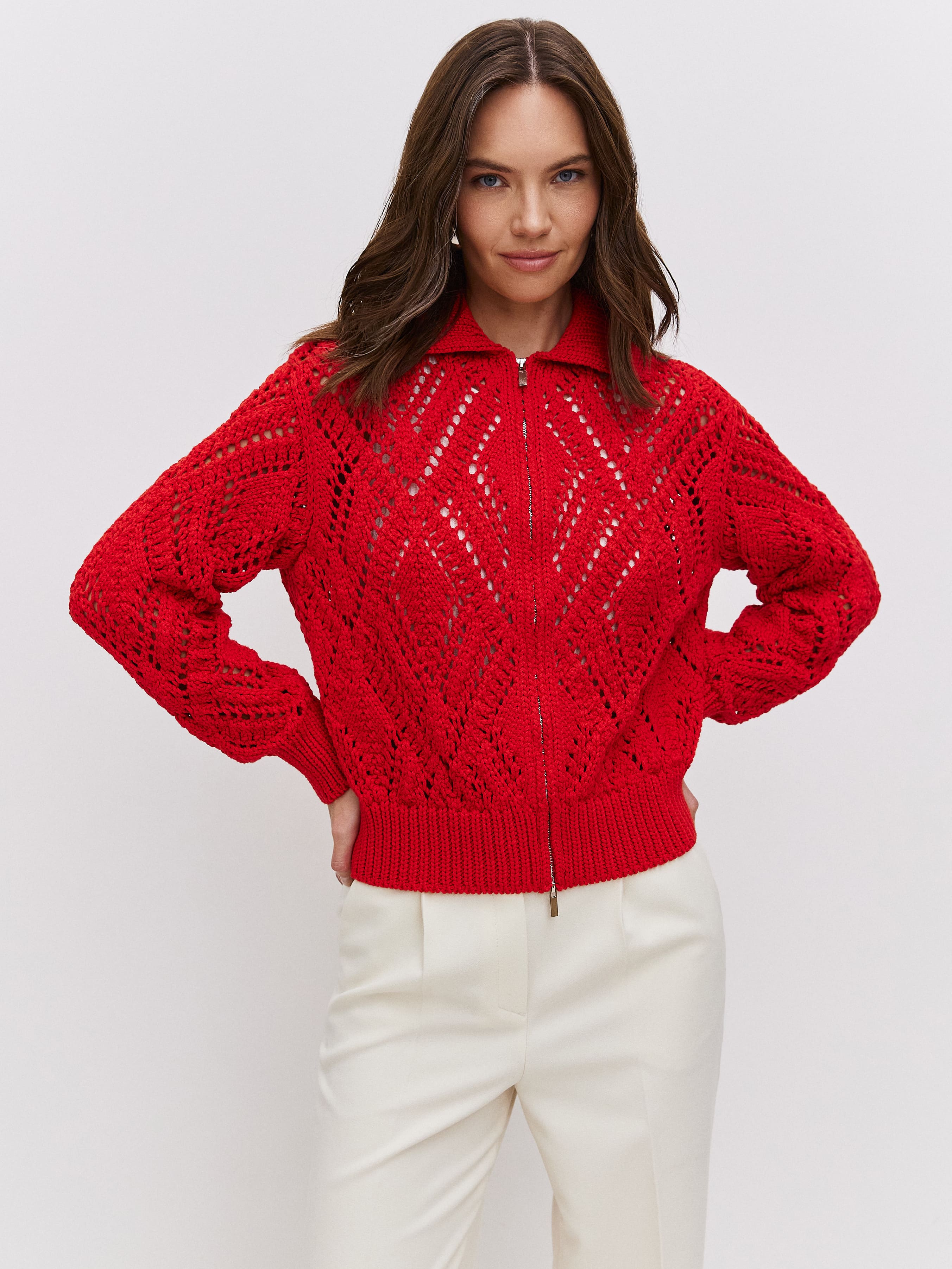 Неординарный хлопковый бомбер для ситуаций, когда так хочется произвести впечатление. Воздушное ажурное полотно обыграно плотным воротником и широкой резинкой, которые не позволят изделию утратить форму. Очаровательное дополнение к летнему прогулочному гардеробу и нарядам для романтического свидания. Вязаные петельки-паутинки реагируют на малейшее движение воздуха, заботясь о комфортном микроклимате для тела. Молния с двойным ходом позволит корректировать формальность джемпера.