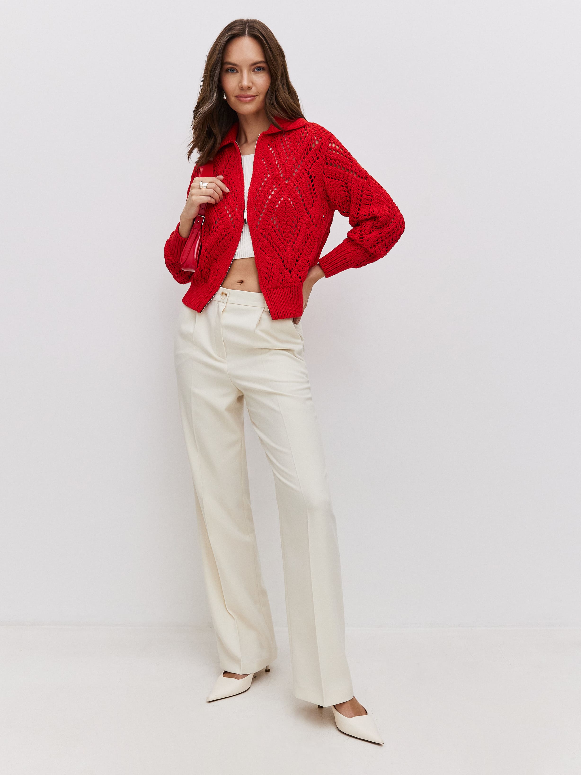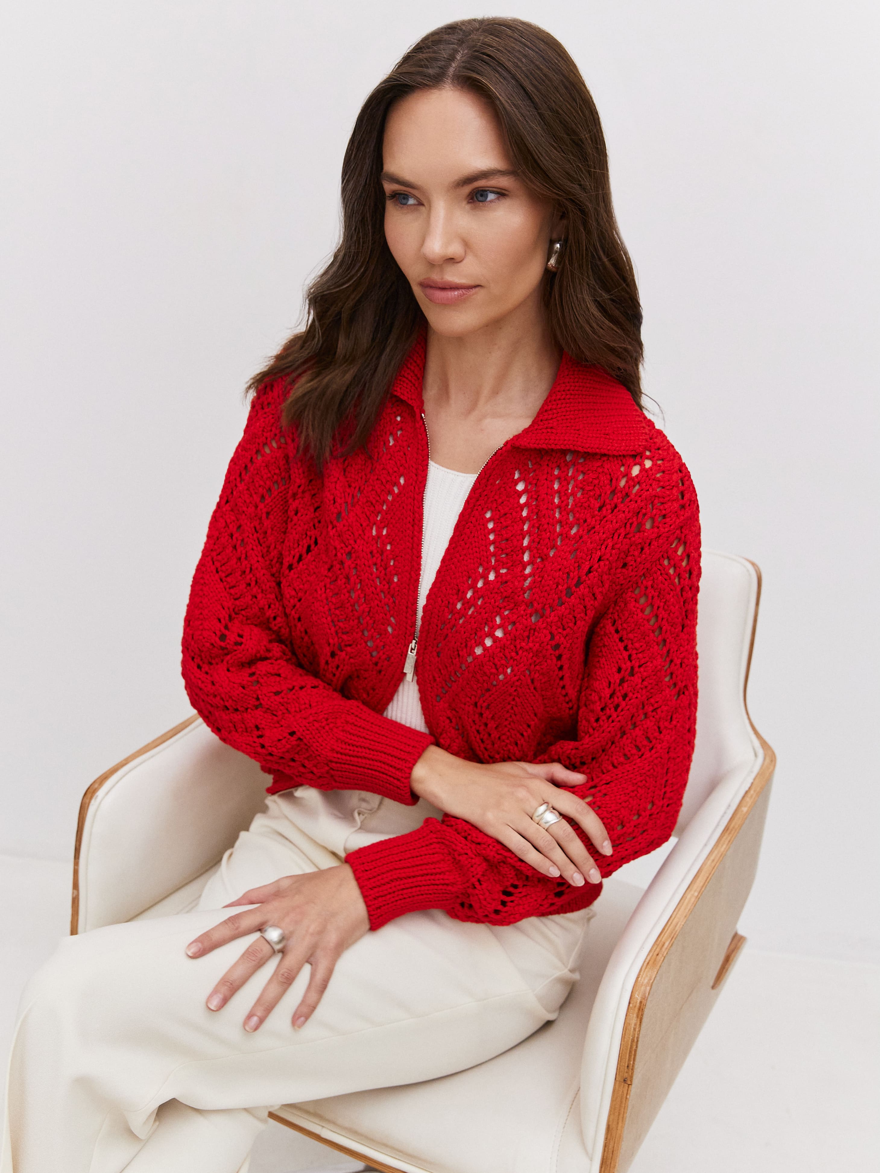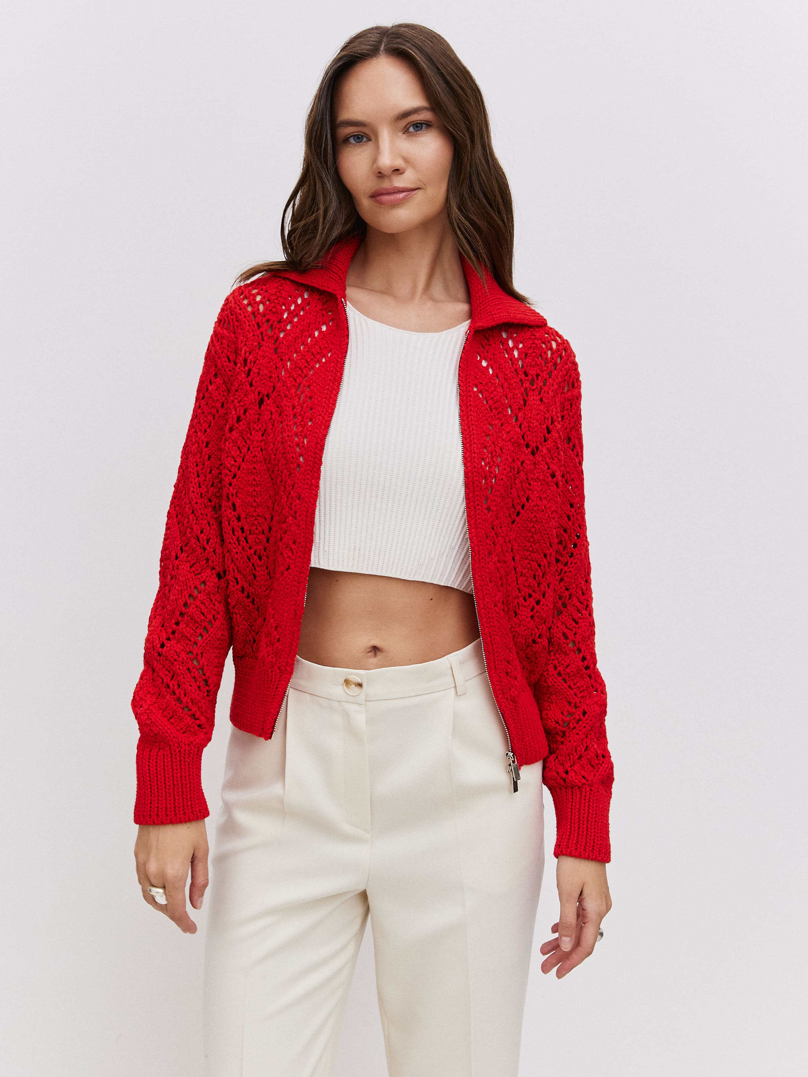 Неординарный хлопковый бомбер для ситуаций, когда так хочется произвести впечатление. Воздушное ажурное полотно обыграно плотным воротником и широкой резинкой, которые не позволят изделию утратить форму. Очаровательное дополнение к летнему прогулочному гардеробу и нарядам для романтического свидания. Вязаные петельки-паутинки реагируют на малейшее движение воздуха, заботясь о комфортном микроклимате для тела. Молния с двойным ходом позволит корректировать формальность джемпера.