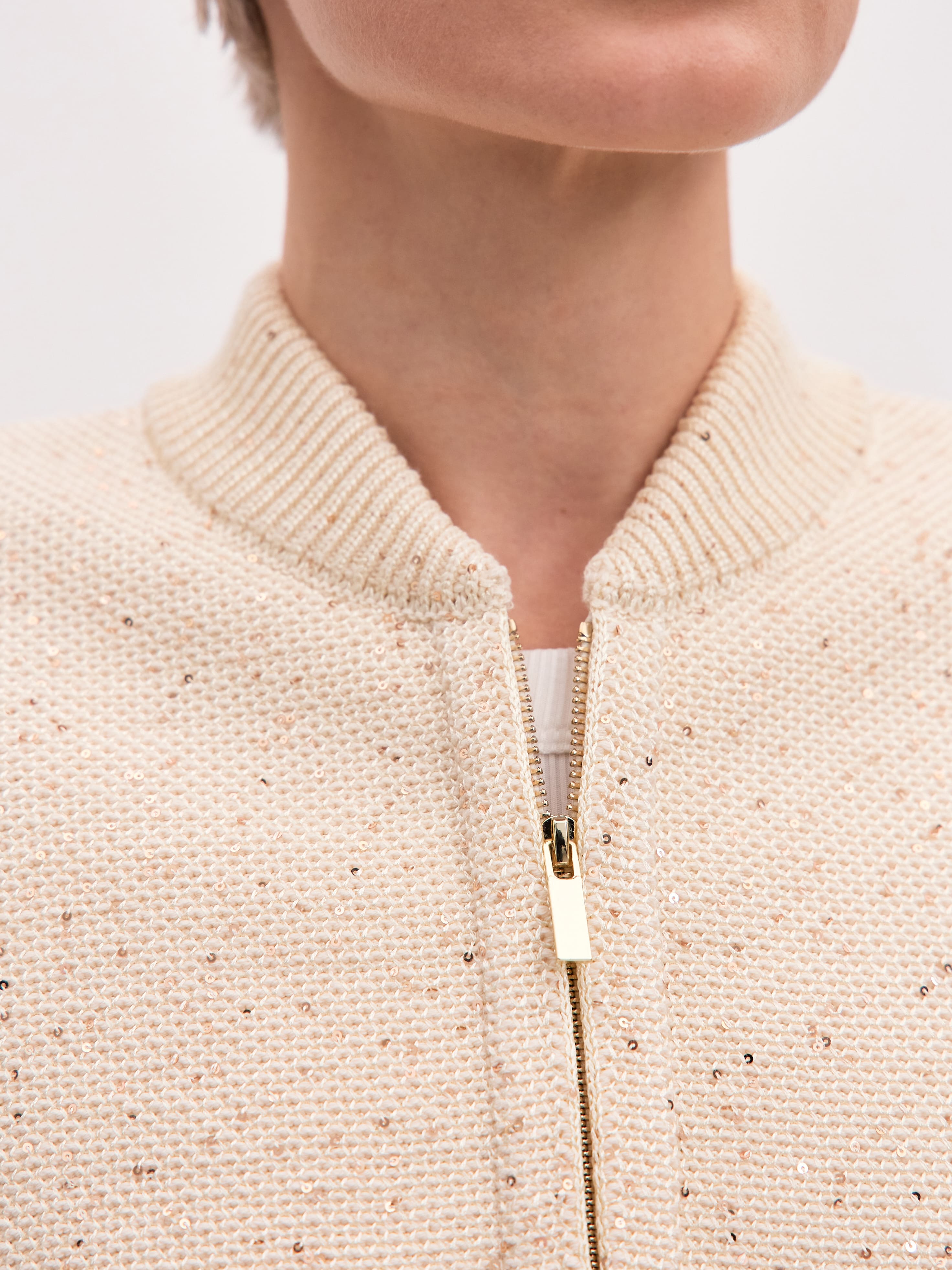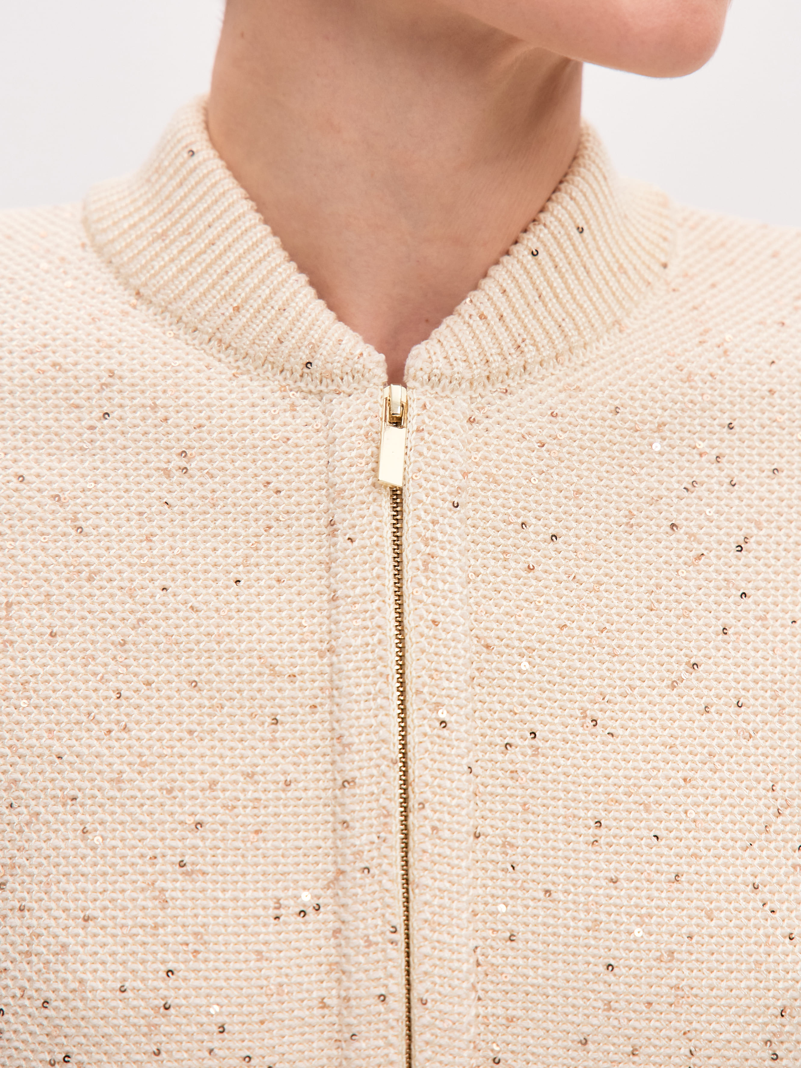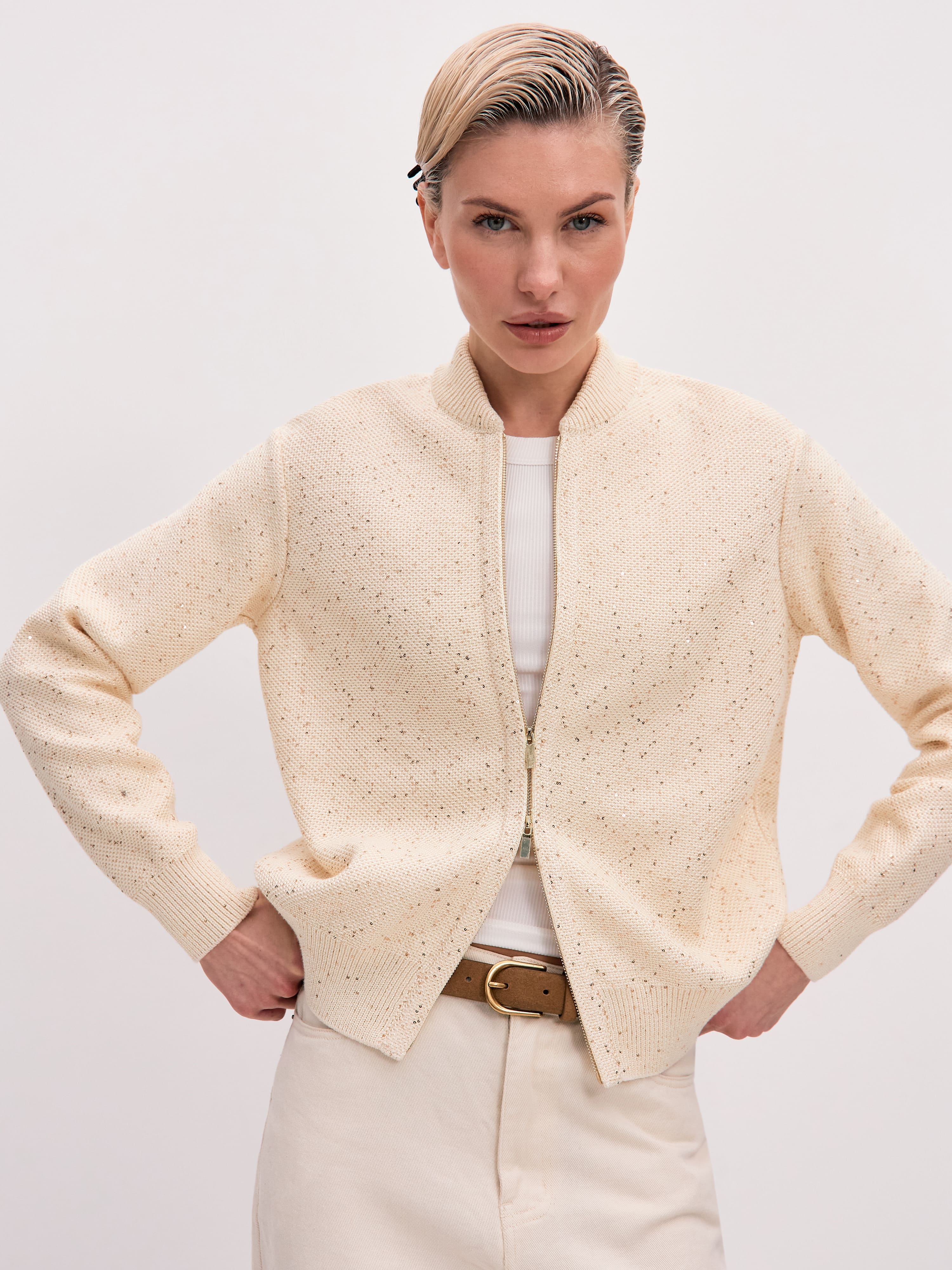 Стилеобразующий хлопковый бомбер с деликатной россыпью микропайеток и двухзамковой молнией. Гармоничный силуэт с чуть заниженной линией плеча,  широкими манжетами и воротничком-стойкой, связанным в два слоя. В данной модели задействованы пайетки с минимальным диаметром. Трикотажное полотно бомбера выполнено в технике платировки, а пайетки вплетаются в него только с лицевой стороны. Такой прием сохраняет тактильность изнанки изделия. Результат: при контакте с телом хлопковая основа кардигана продолжает дарить ощущение комфортной мягкости и тепла.