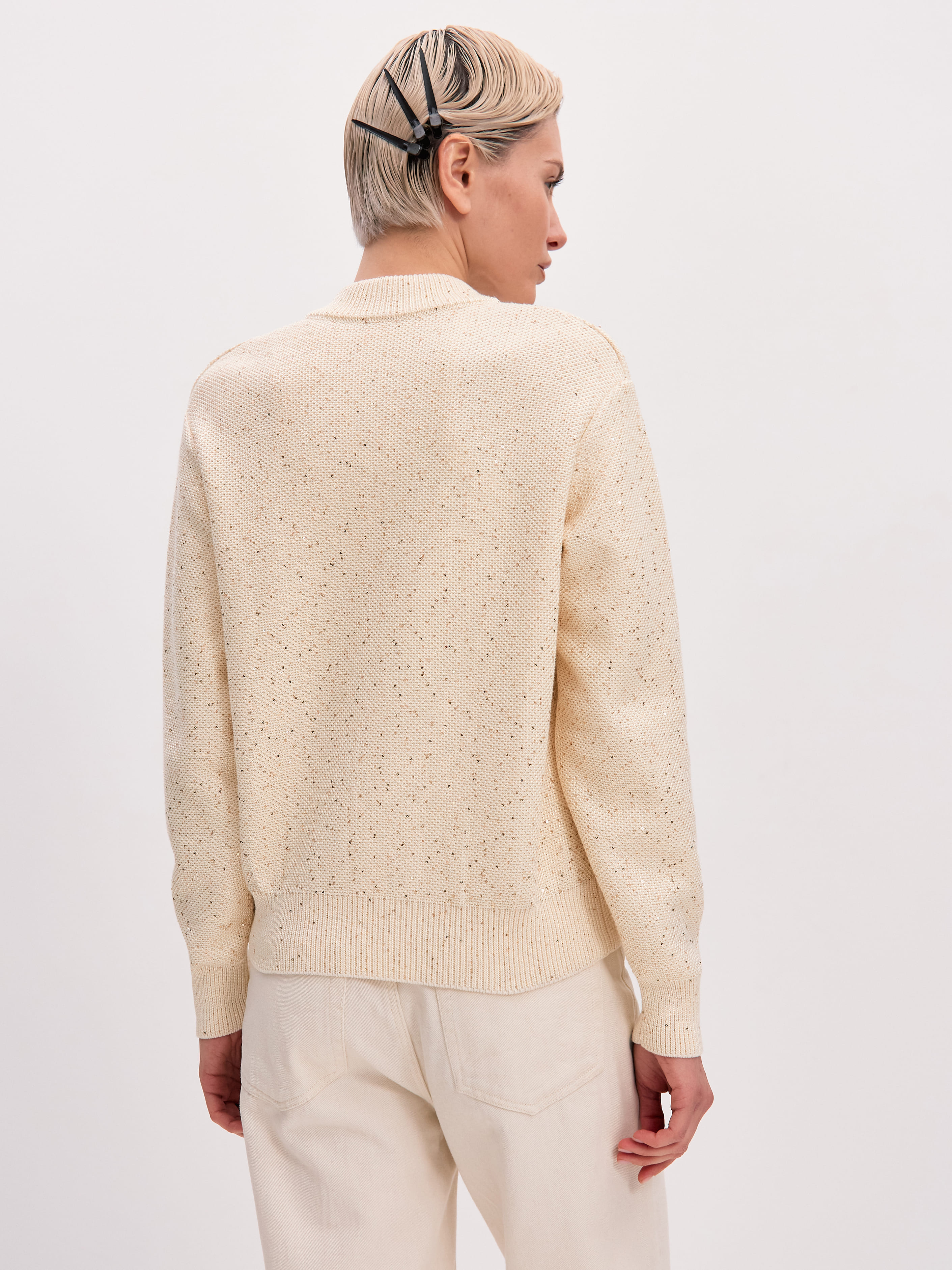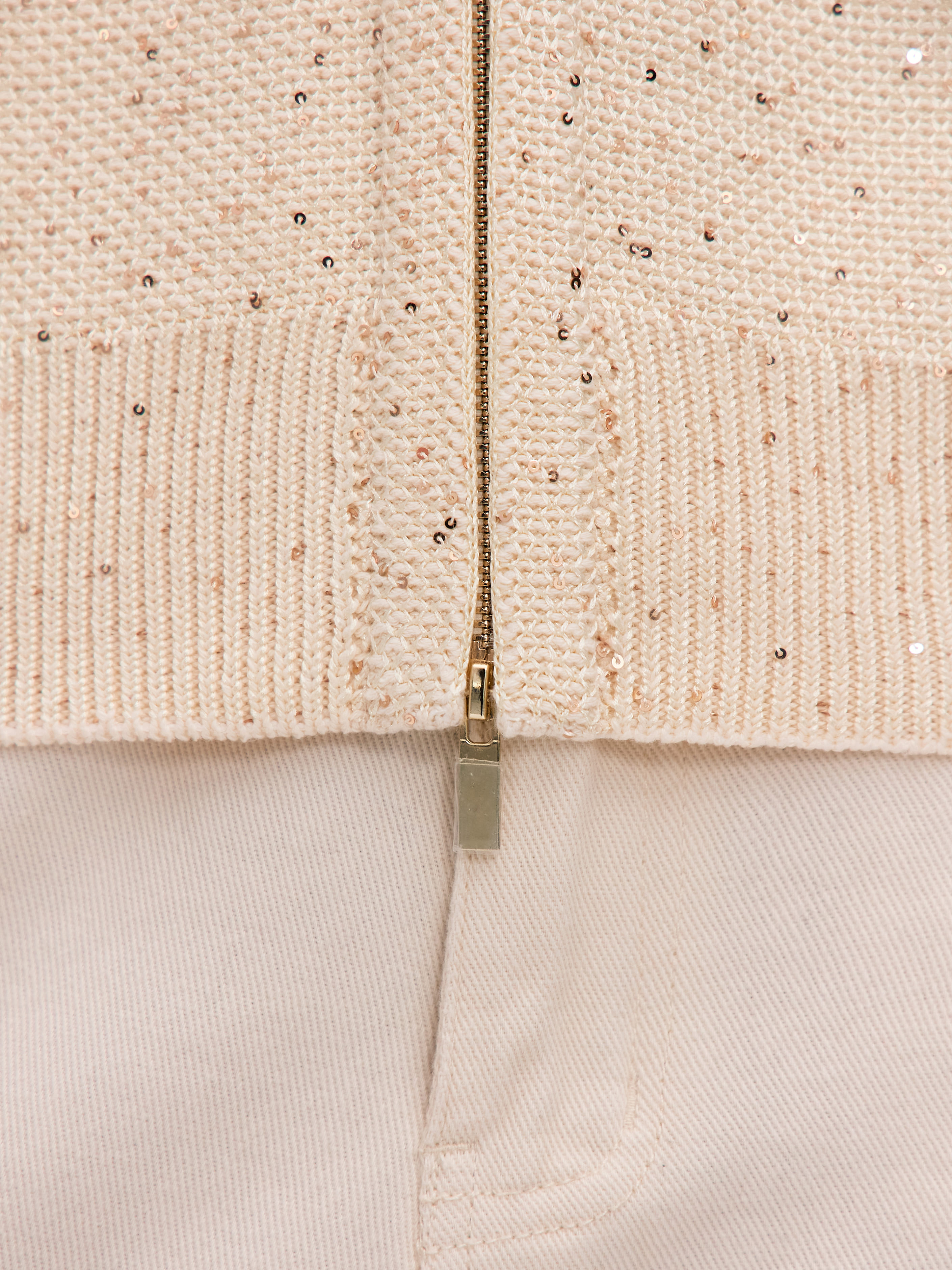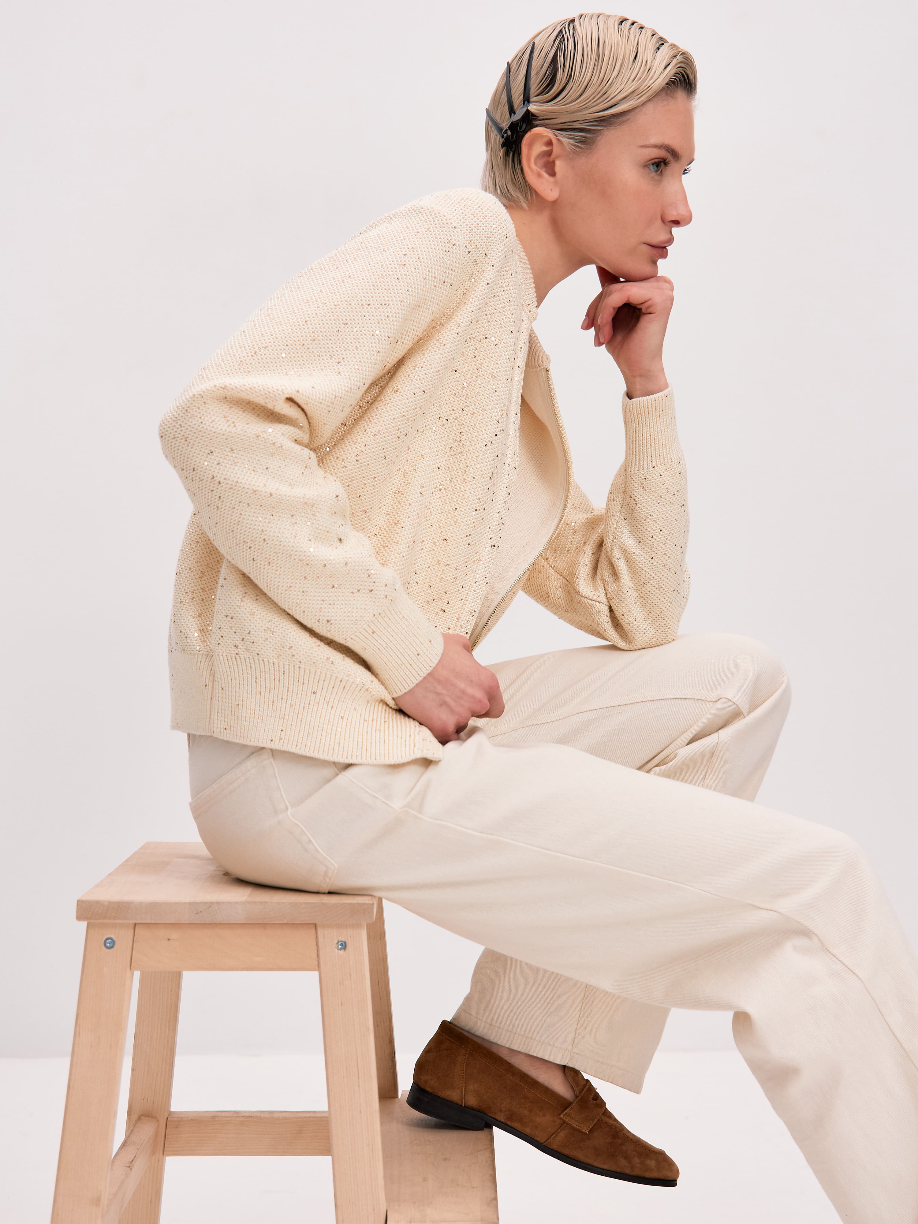 Стилеобразующий хлопковый бомбер с деликатной россыпью микропайеток и двухзамковой молнией. Гармоничный силуэт с чуть заниженной линией плеча,  широкими манжетами и воротничком-стойкой, связанным в два слоя. В данной модели задействованы пайетки с минимальным диаметром. Трикотажное полотно бомбера выполнено в технике платировки, а пайетки вплетаются в него только с лицевой стороны. Такой прием сохраняет тактильность изнанки изделия. Результат: при контакте с телом хлопковая основа кардигана продолжает дарить ощущение комфортной мягкости и тепла.