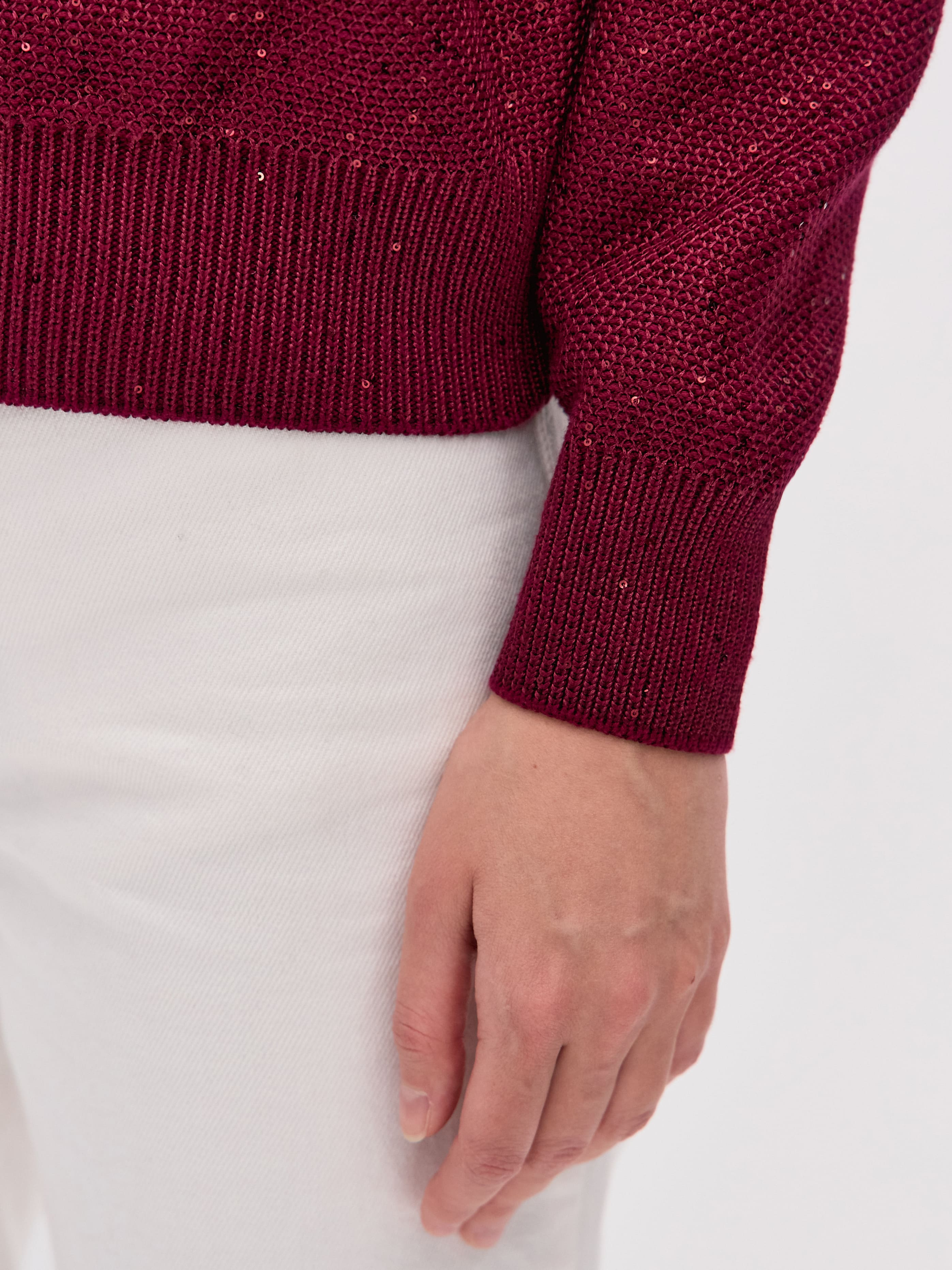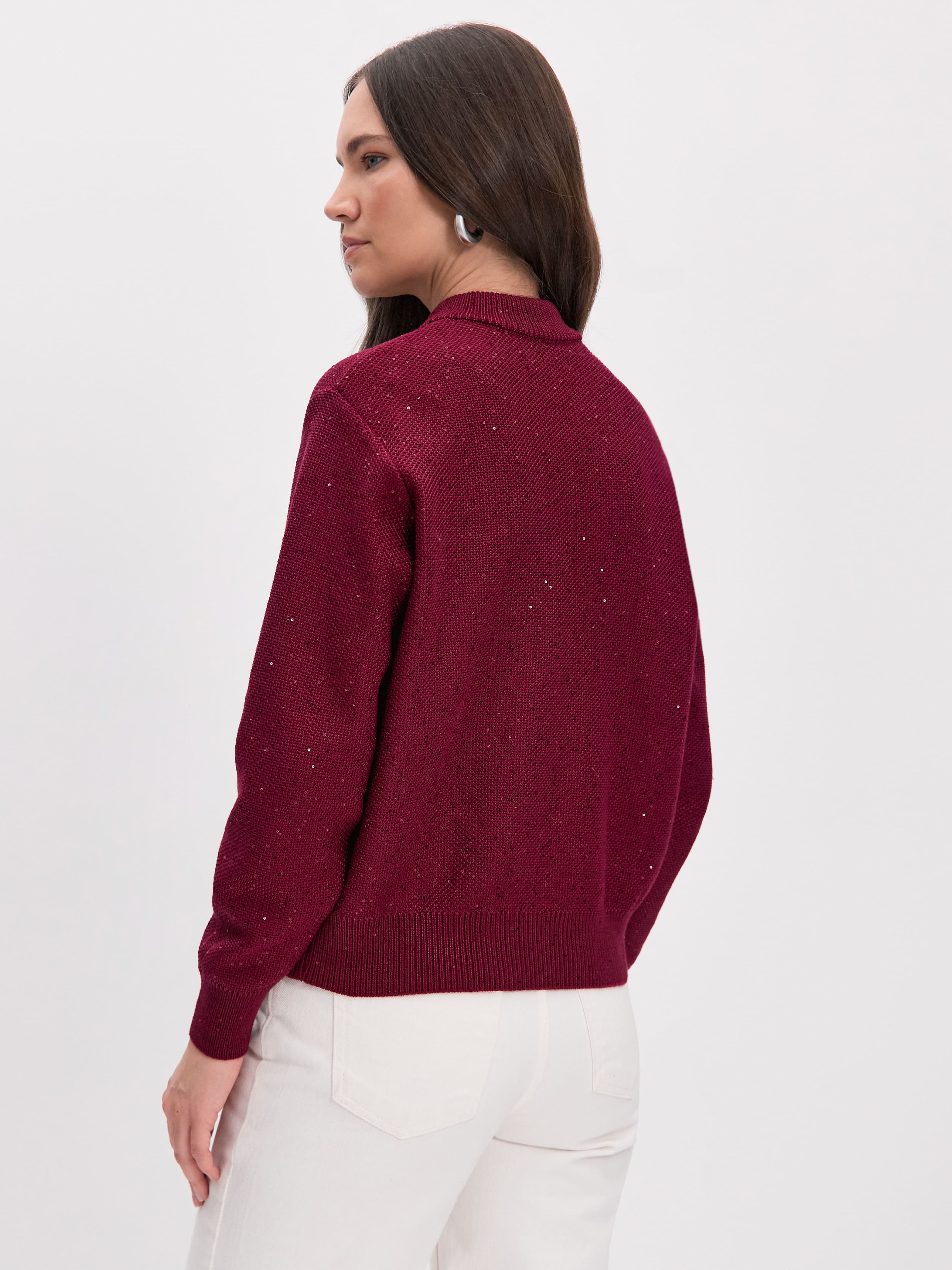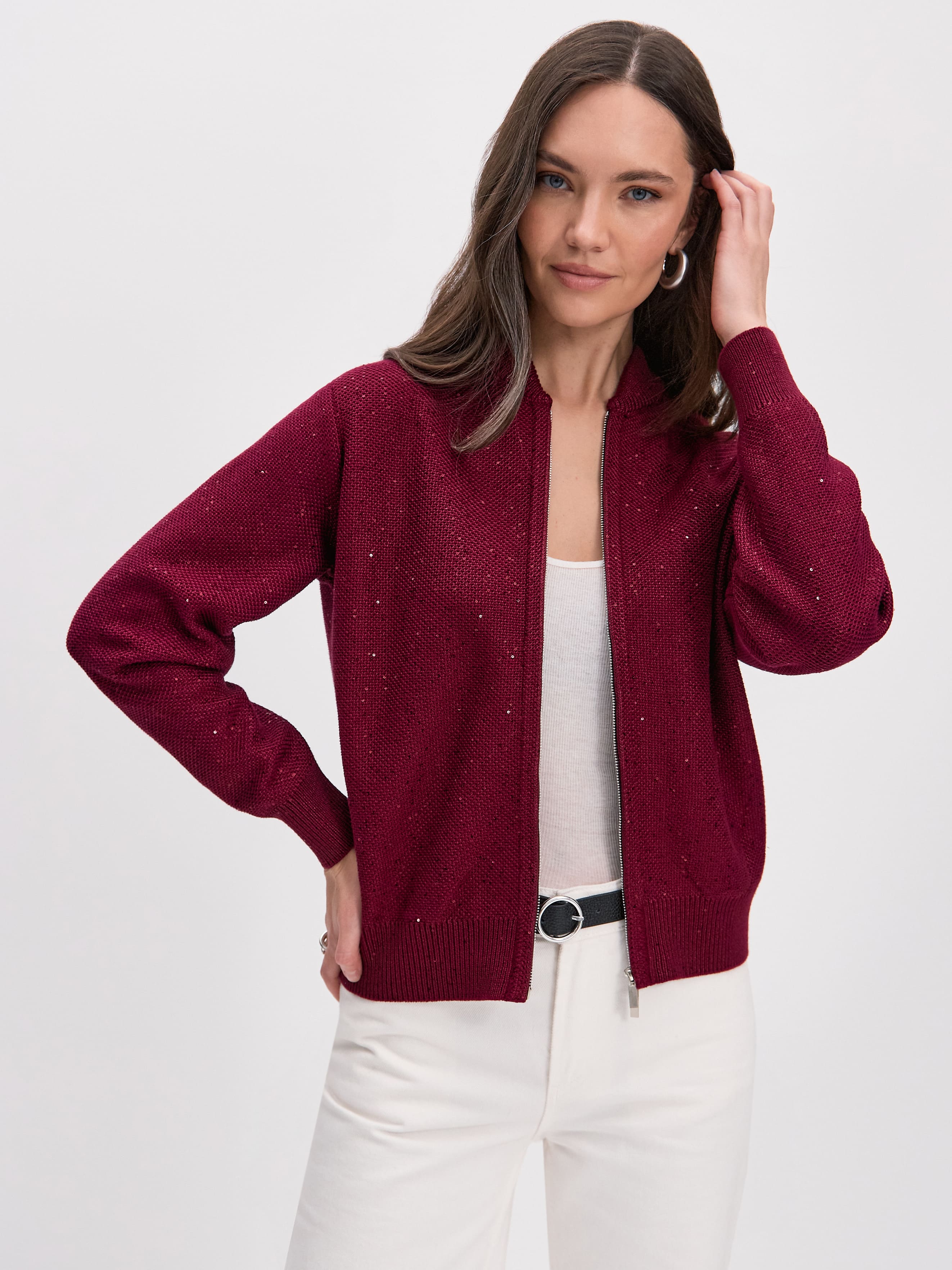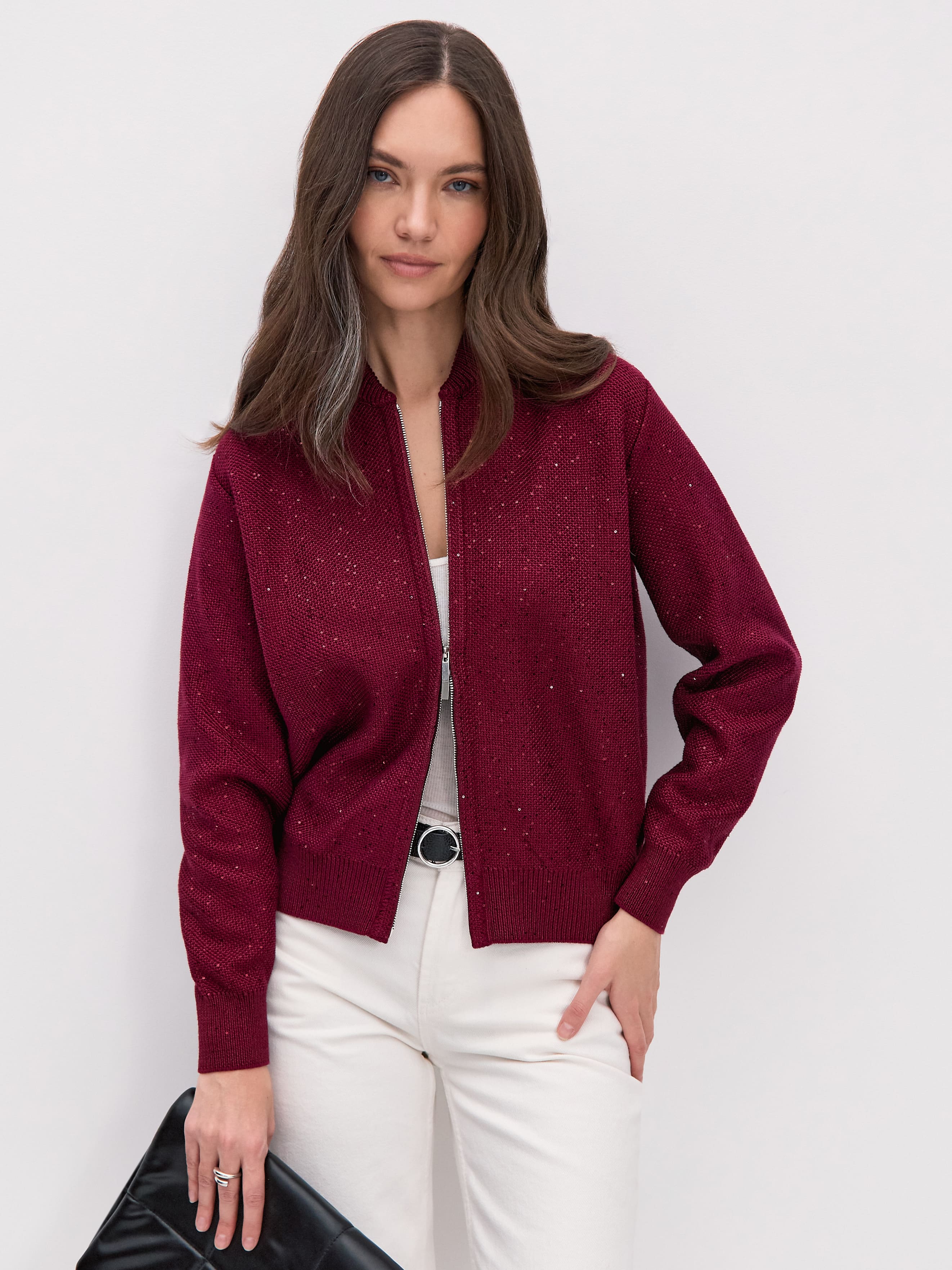 Стилеобразующий хлопковый бомбер с деликатной россыпью микропайеток и двухзамковой молнией. Гармоничный силуэт с чуть заниженной линией плеча,  широкими манжетами и воротничком-стойкой, связанным в два слоя. В данной модели задействованы пайетки с минимальным диаметром. Трикотажное полотно бомбера выполнено в технике платировки, а пайетки вплетаются в него только с лицевой стороны. Такой прием сохраняет тактильность изнанки изделия. Результат: при контакте с телом хлопковая основа кардигана продолжает дарить ощущение комфортной мягкости и тепла.