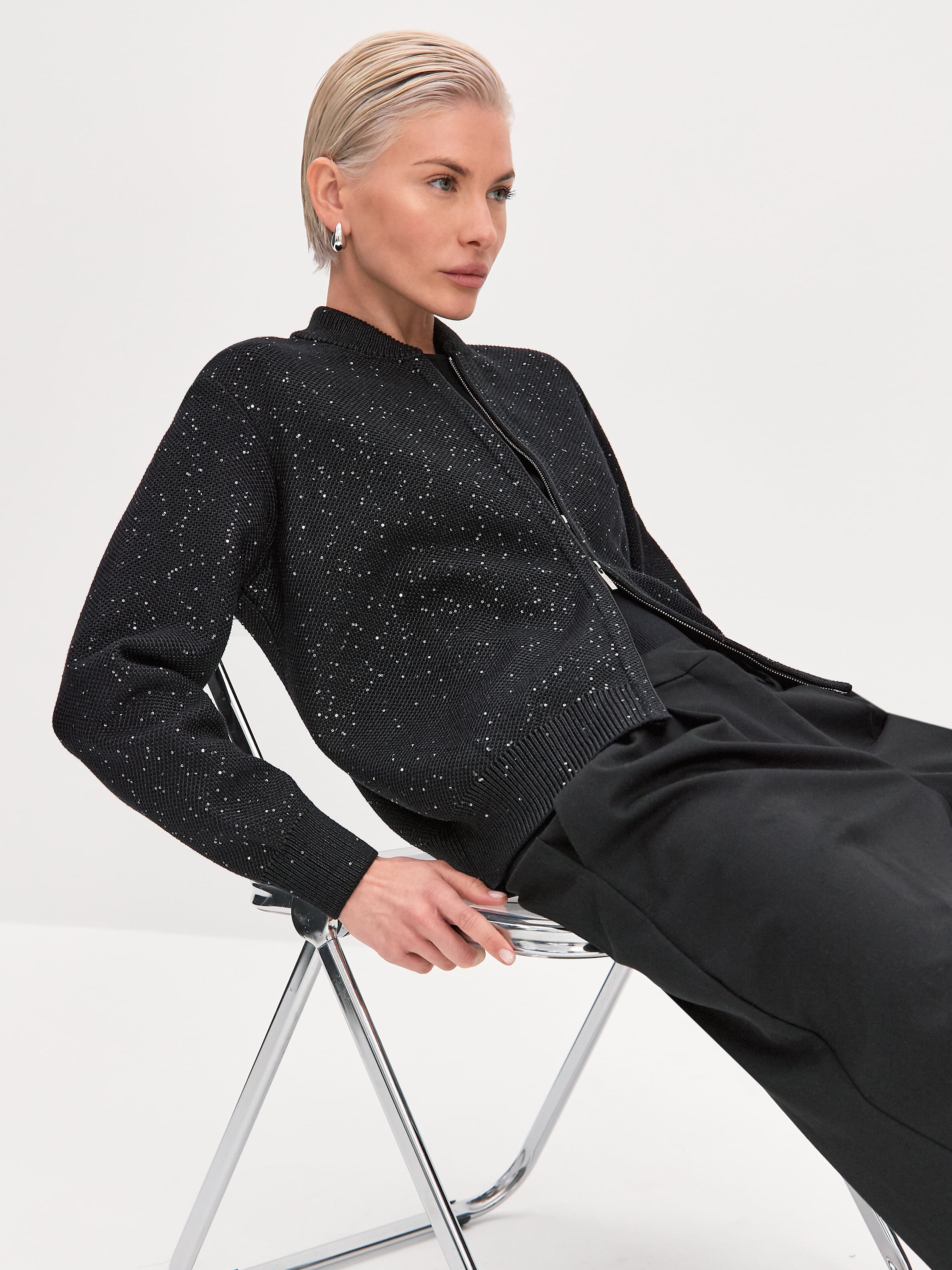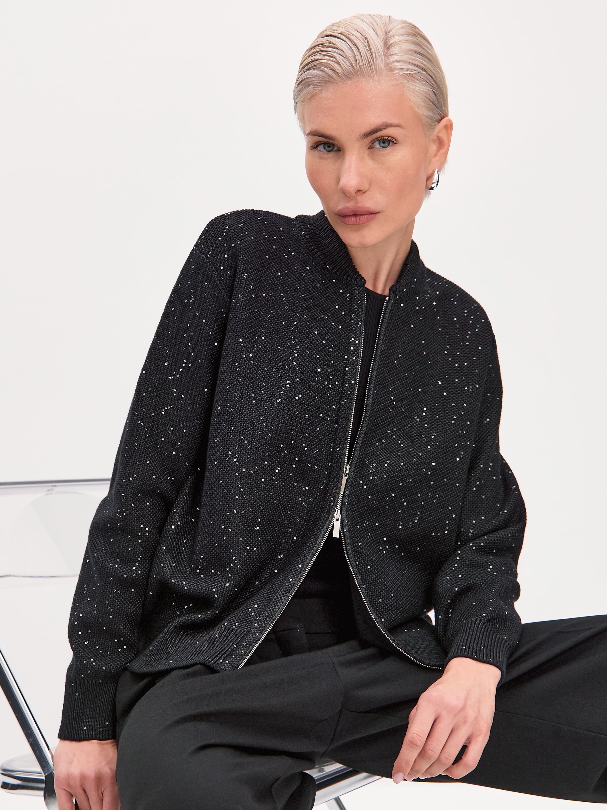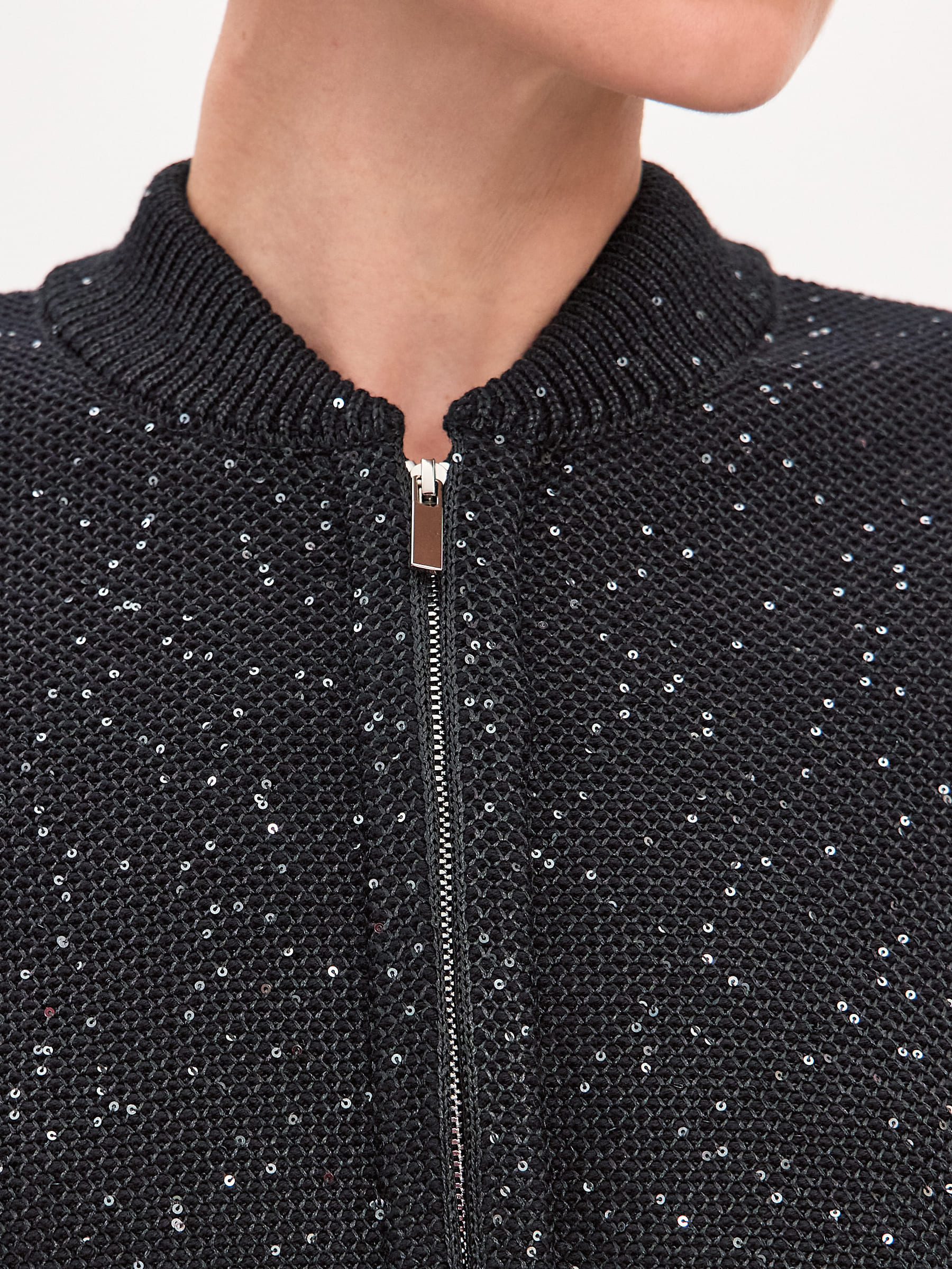Стилеобразующий хлопковый бомбер с деликатной россыпью микропайеток и двухзамковой молнией. Гармоничный силуэт с чуть заниженной линией плеча, широкими манжетами и воротничком-стойкой, связанным в два слоя. В данной модели задействованы пайетки с минимальным диаметром. Трикотажное полотно бомбера выполнено в технике платировки, а пайетки вплетаются в него только с лицевой стороны. Такой прием сохраняет тактильность изнанки изделия. Результат: при контакте с телом хлопковая основа кардигана продолжает дарить ощущение комфортной мягкости и тепла.