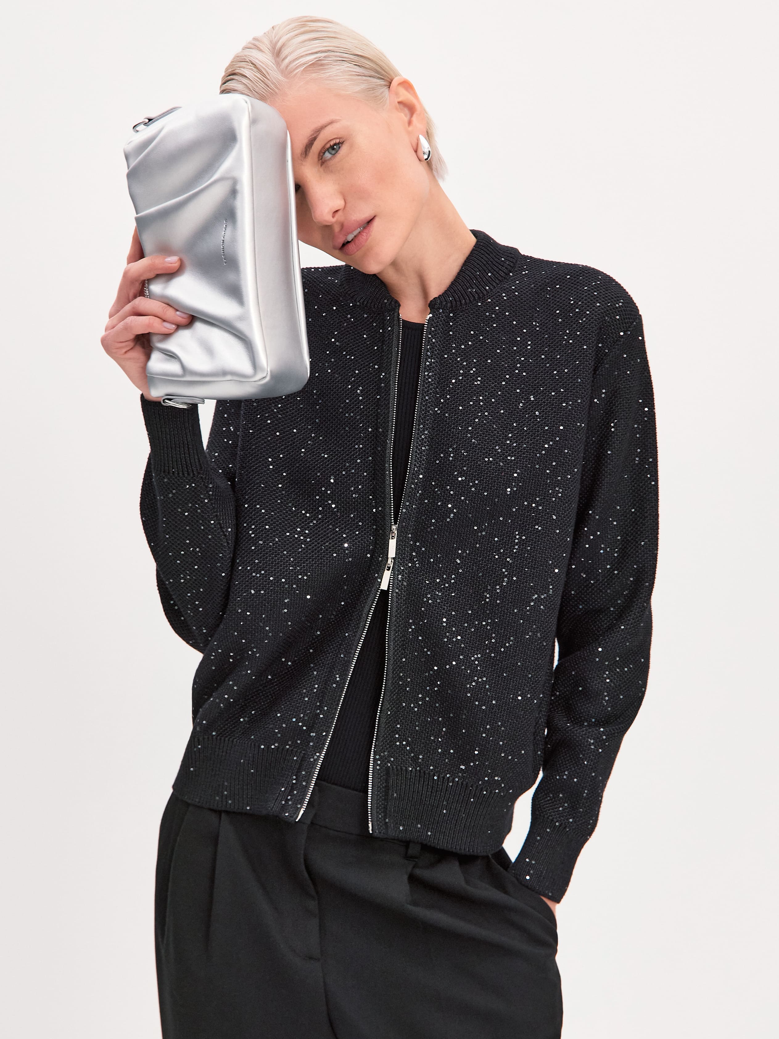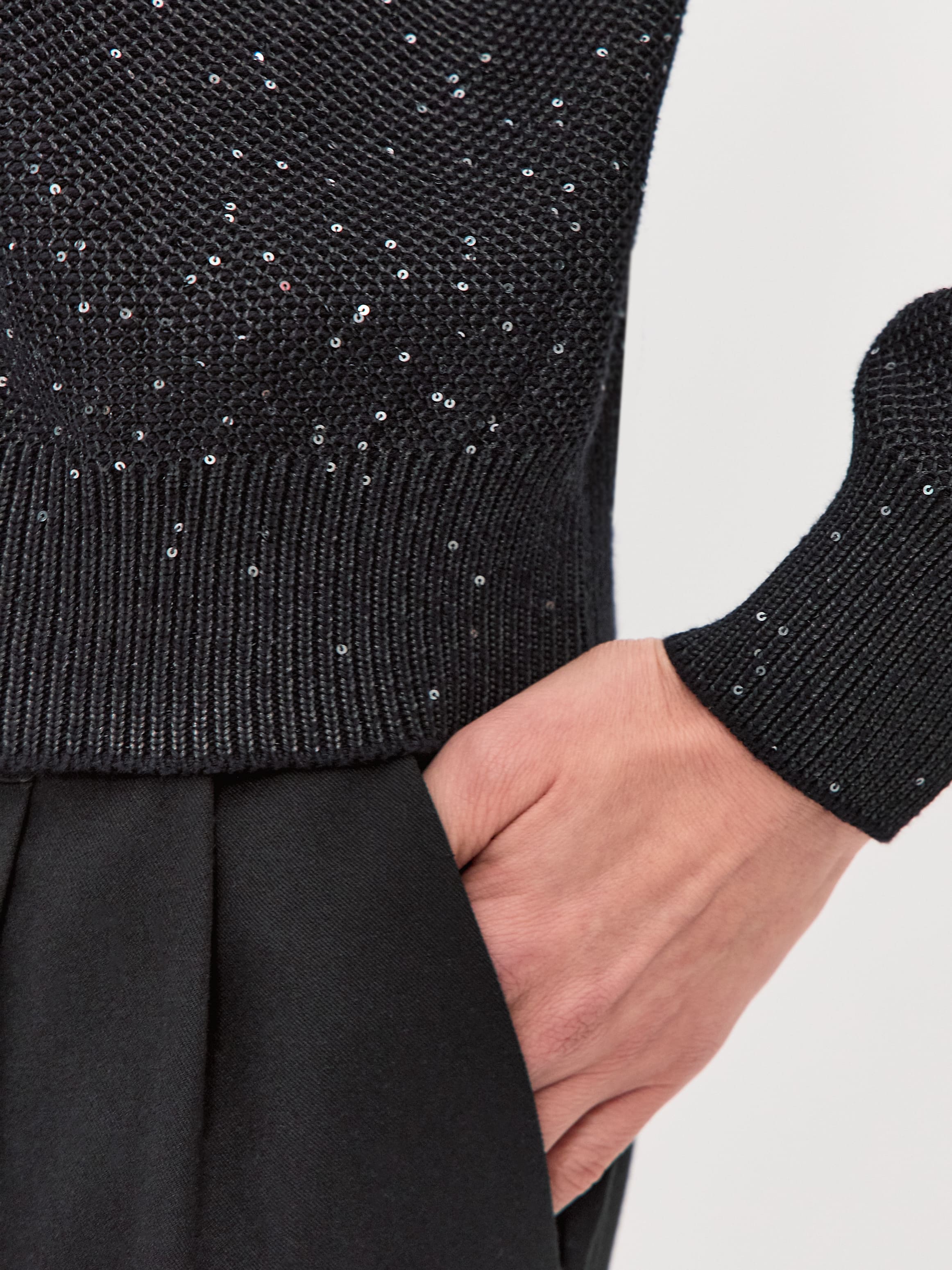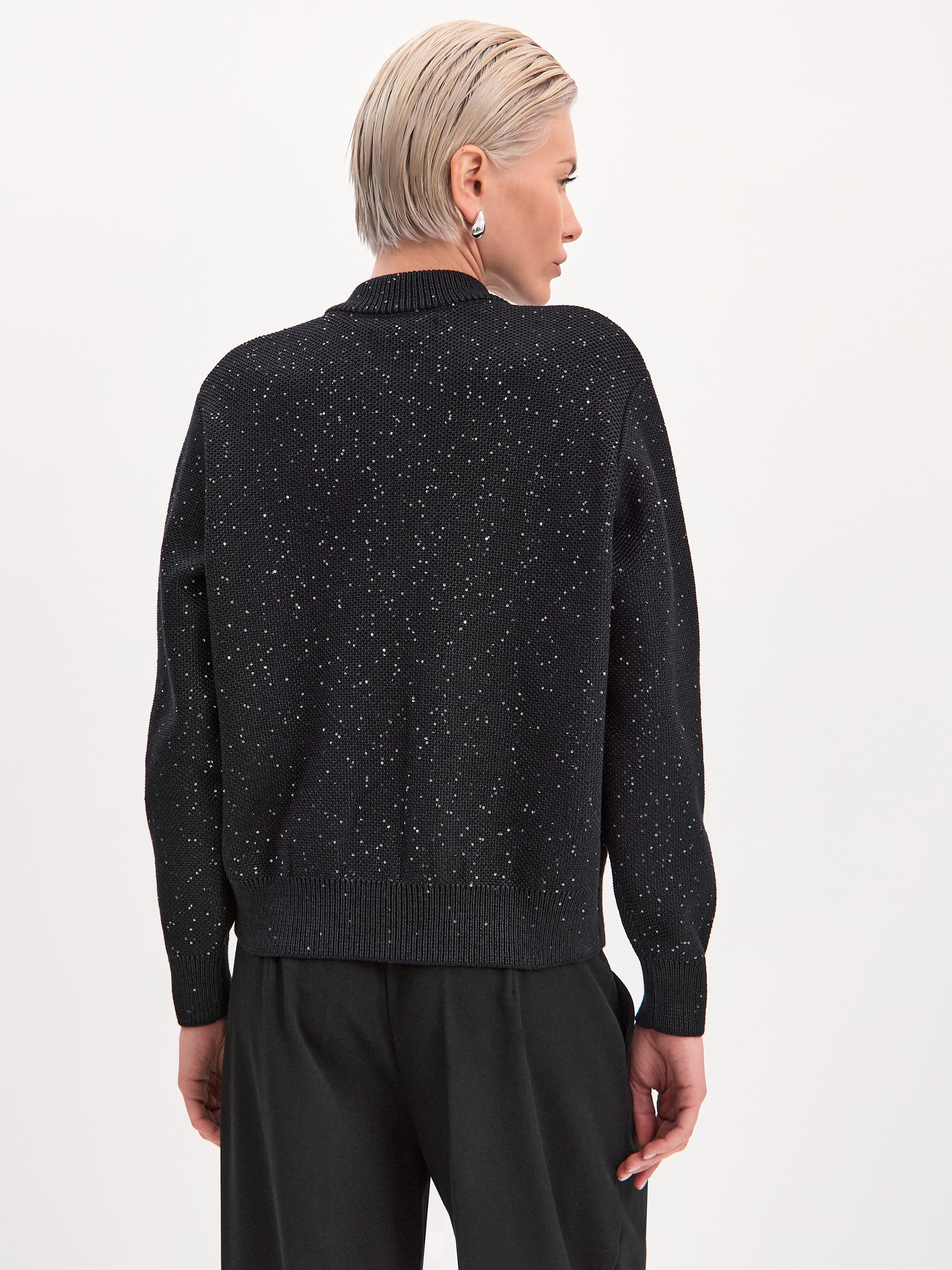 Стилеобразующий хлопковый бомбер с деликатной россыпью микропайеток и двухзамковой молнией. Гармоничный силуэт с чуть заниженной линией плеча, широкими манжетами и воротничком-стойкой, связанным в два слоя. В данной модели задействованы пайетки с минимальным диаметром. Трикотажное полотно бомбера выполнено в технике платировки, а пайетки вплетаются в него только с лицевой стороны. Такой прием сохраняет тактильность изнанки изделия. Результат: при контакте с телом хлопковая основа кардигана продолжает дарить ощущение комфортной мягкости и тепла.