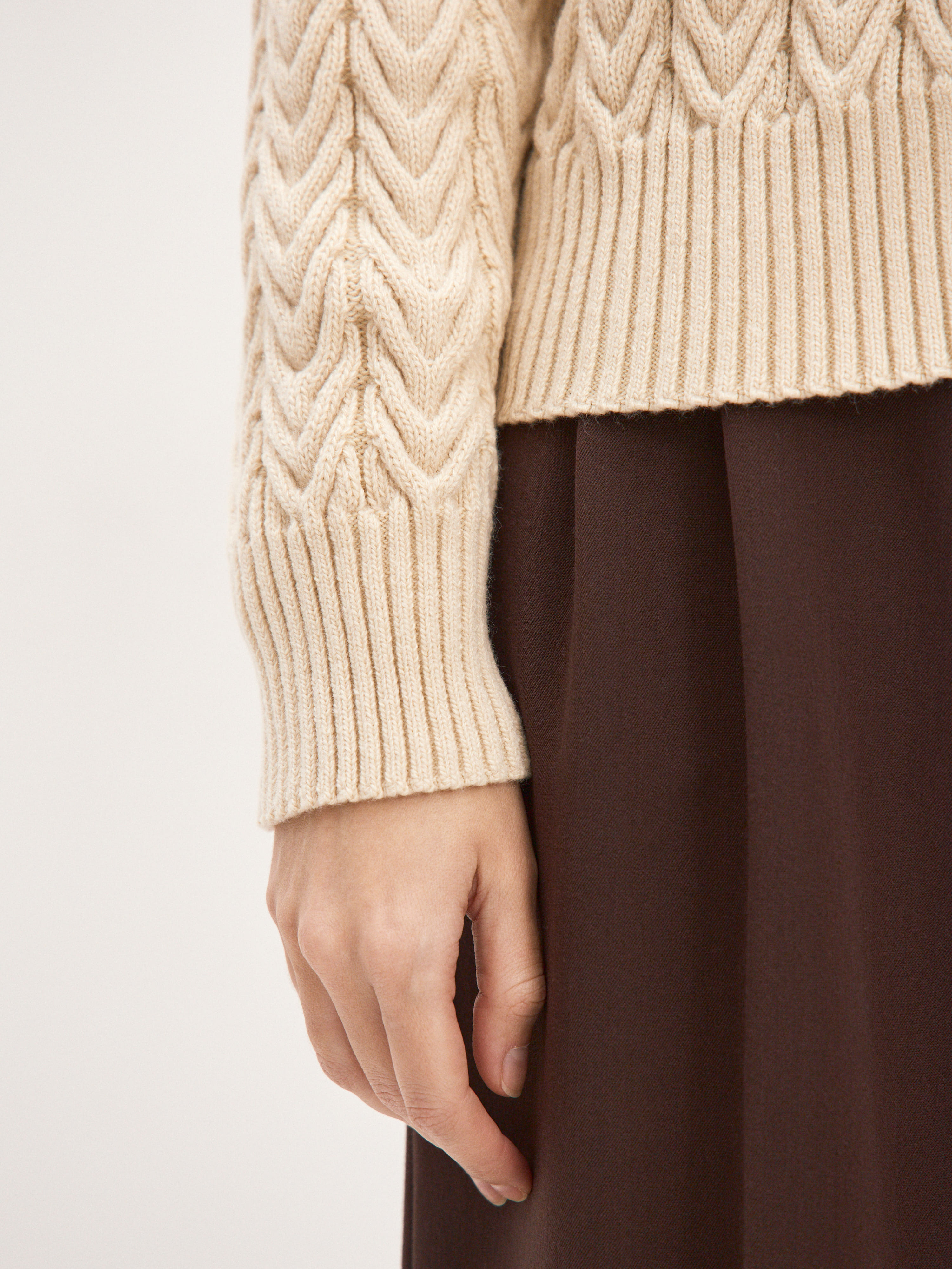 Согревающий фактурный джемпер для ситуаций, когда фокусной зоной образа должен выступить именно верх. V–образный узор полочек, спинки и рукавов дополняют низ, горловина и манжеты, связанные плотно прилегающей резинкой. Модель выполнена из тщательно обработанной шерсти мериноса, которая превосходно противостоит холоду и делает уютной самую долгую осеннюю прогулку. Отличный джемпер для утепляющих зимних капсул. Хорошо стилизуется с изделиями контрастных текстур – гладкими кожей и трикотажем, полупрозрачным текстилем, денимом.
