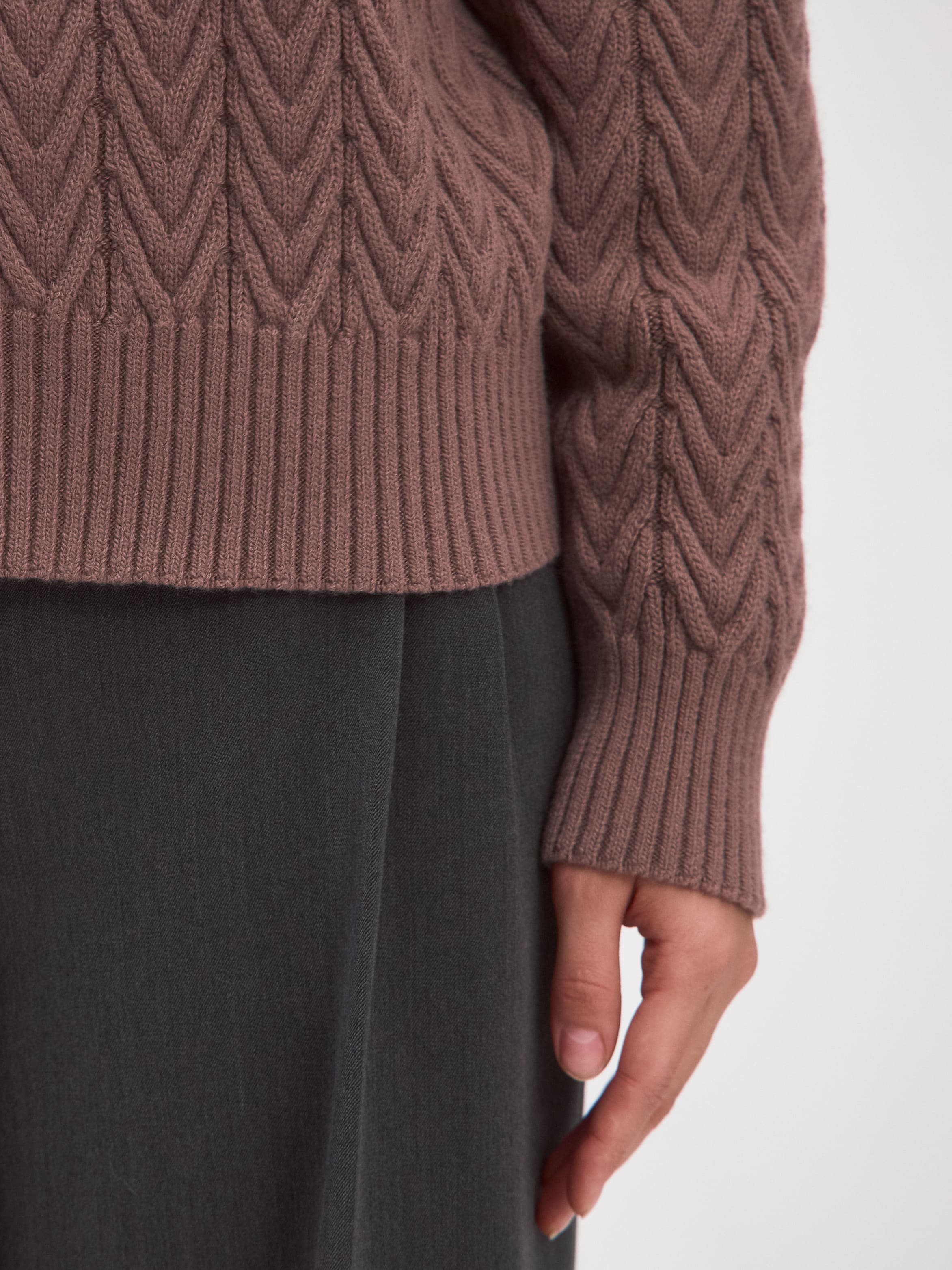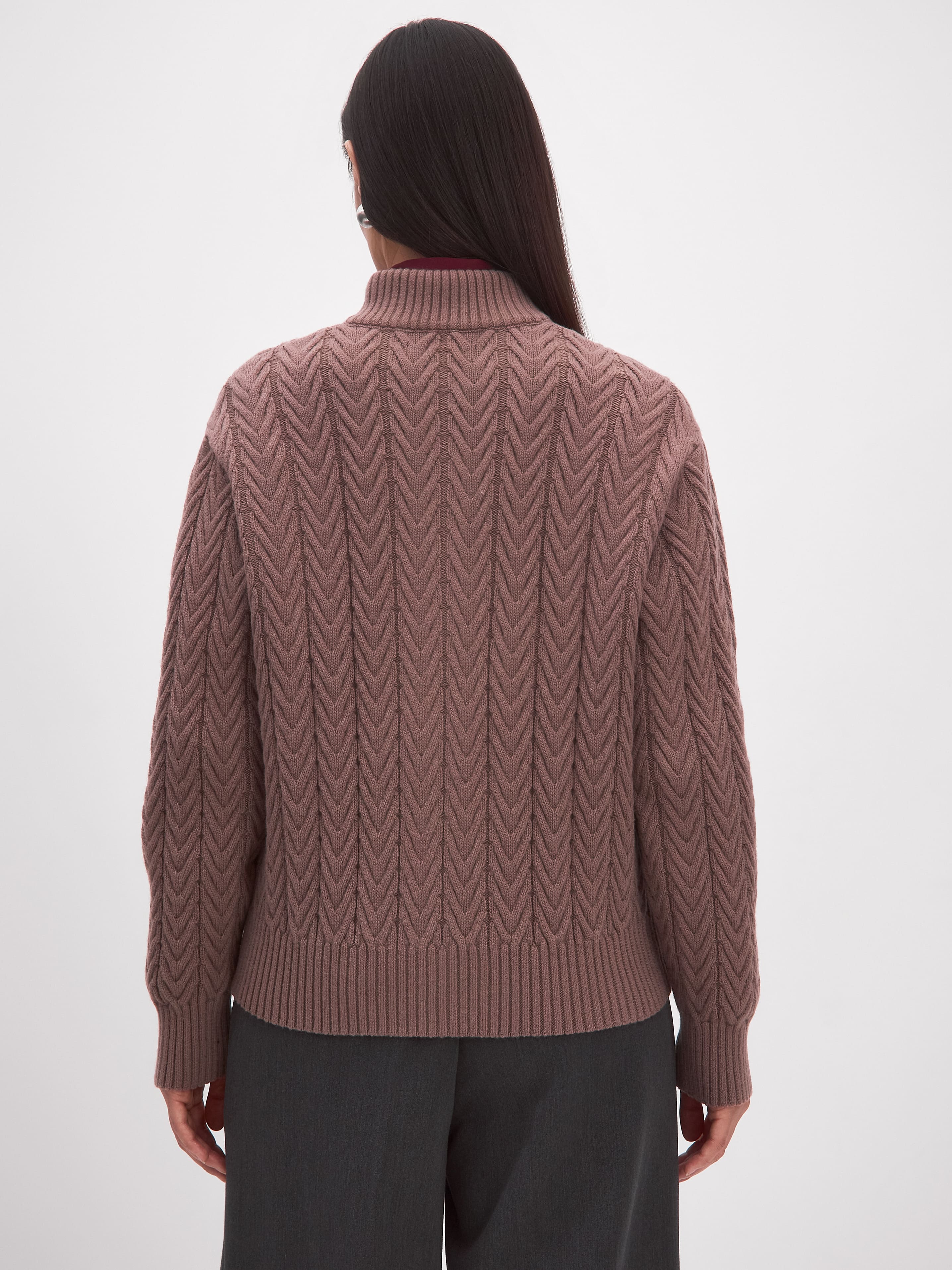 Согревающий фактурный джемпер для ситуаций, когда фокусной зоной образа должен выступить именно верх. V–образный узор полочек, спинки и рукавов дополняют низ, горловина и манжеты, связанные плотно прилегающей резинкой. Модель выполнена из тщательно обработанной шерсти мериноса, которая превосходно противостоит холоду и делает уютной самую долгую осеннюю прогулку. Отличный джемпер для утепляющих зимних капсул. Хорошо стилизуется с изделиями контрастных текстур – гладкими кожей и трикотажем, полупрозрачным текстилем, денимом.