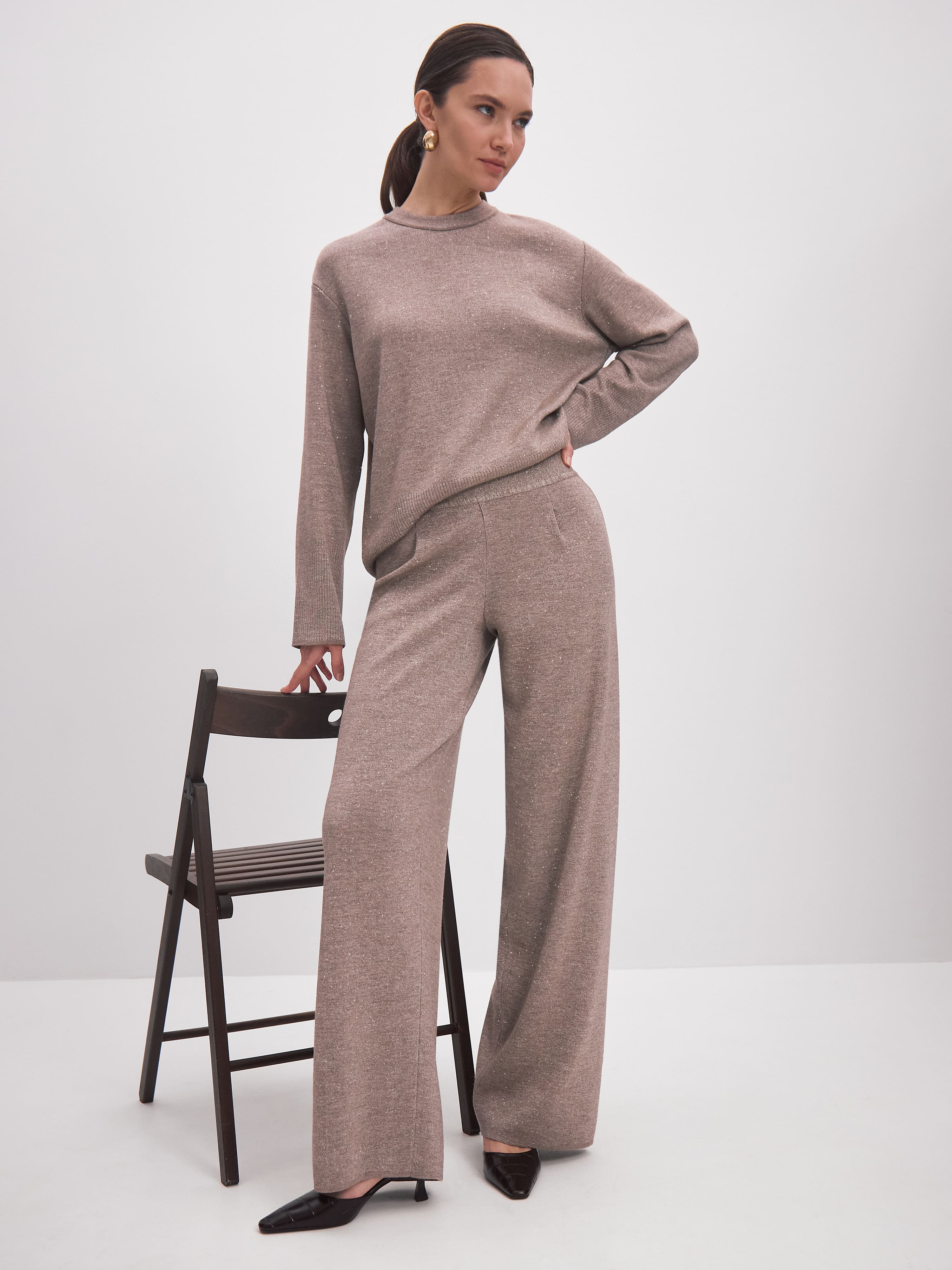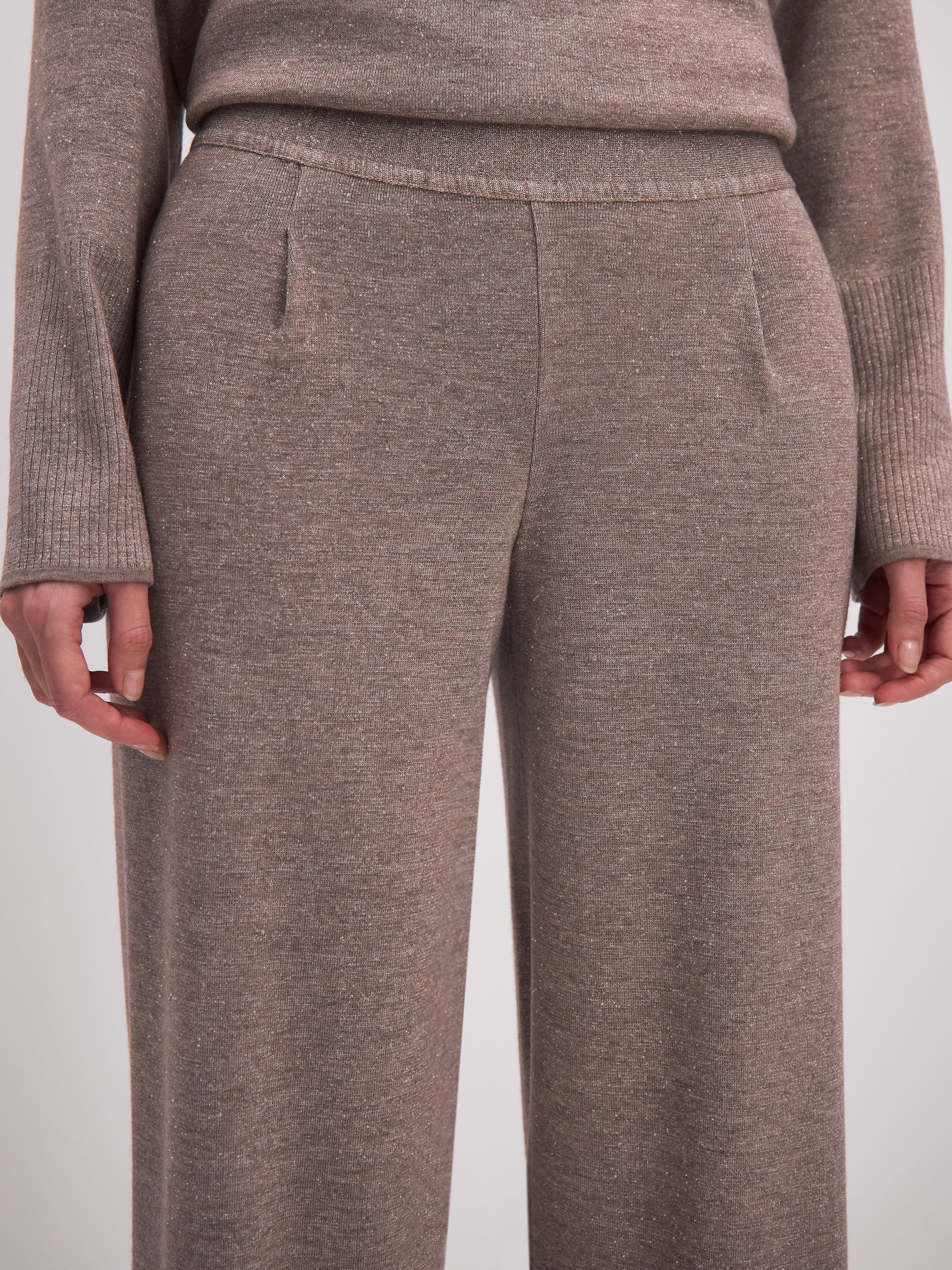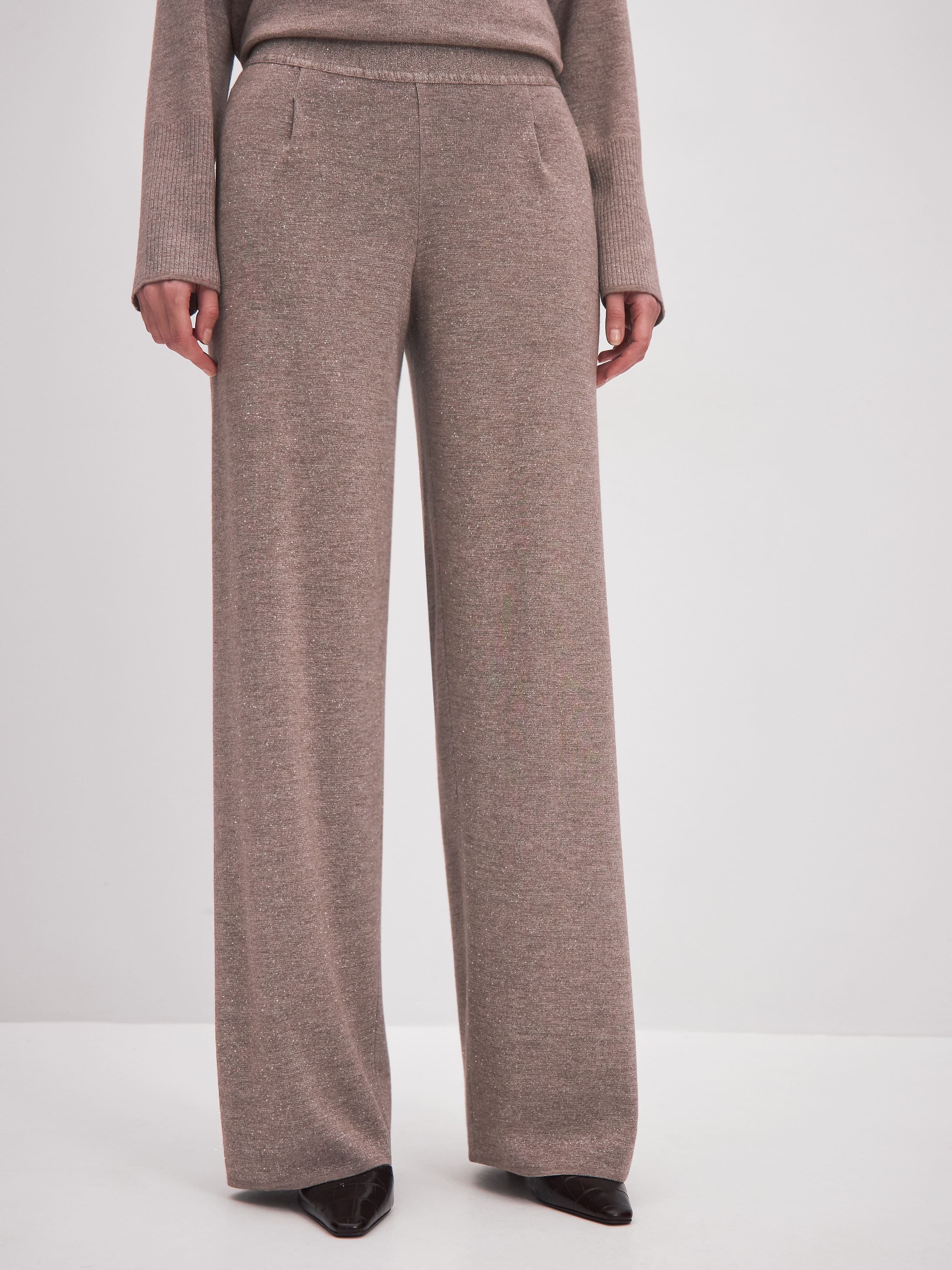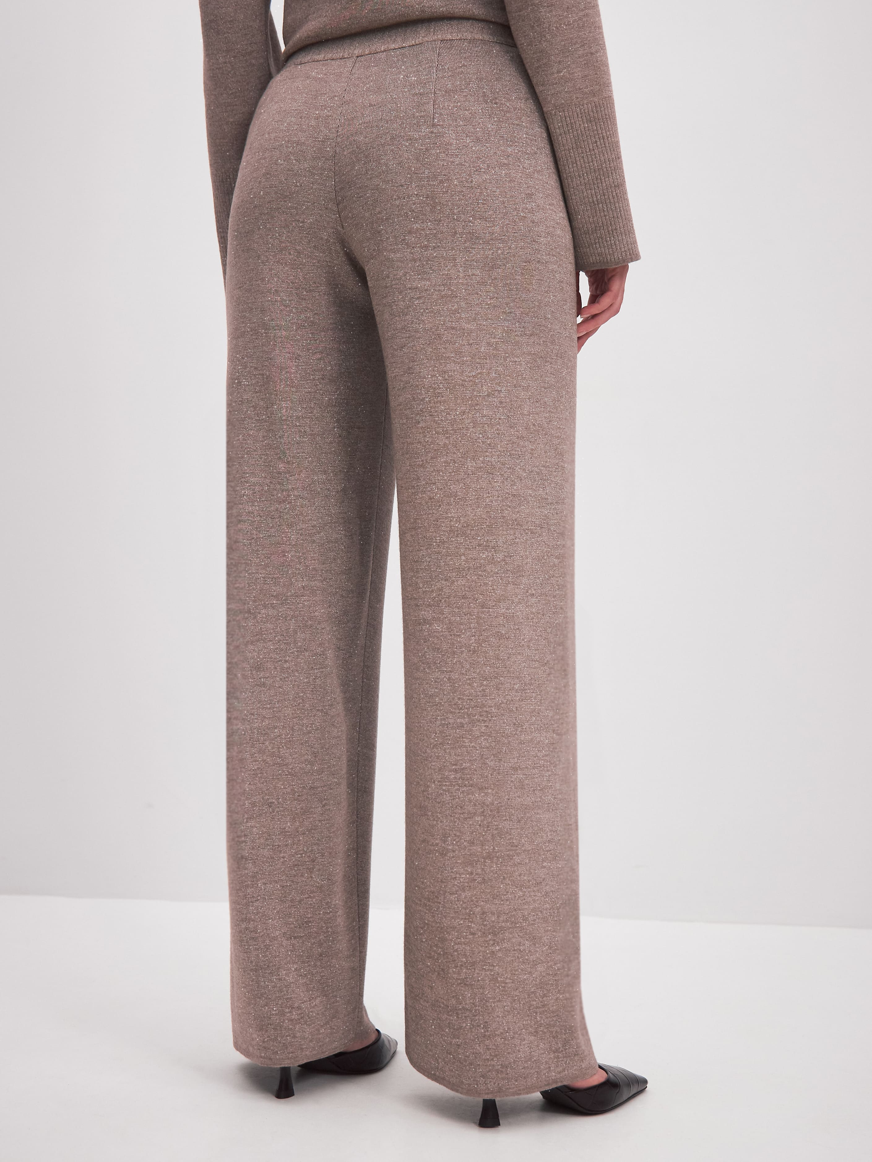 Брюки из вязаного шерстяного трикотажа с включением нежного софт люрекса – элегантная основа всех праздничных и торжественных образов. Ключевые особенности: просторные брючины с защипами, струящиеся от бедра, широкий пояс, средняя высота посадки. Обладают высшей степенью комфортности, благодаря свободному, не сковывающего движения крою. При создании модели используется люрекс софт-категории, обладающий повышенной пластичностью. Он сохраняет приятный обволакивающий эффект трикотажа, придает нарядное мерцание и совершенно не колется. Шерстяное полотно брюк защищено от деформаций и натяжения прочной нитью вискозы.