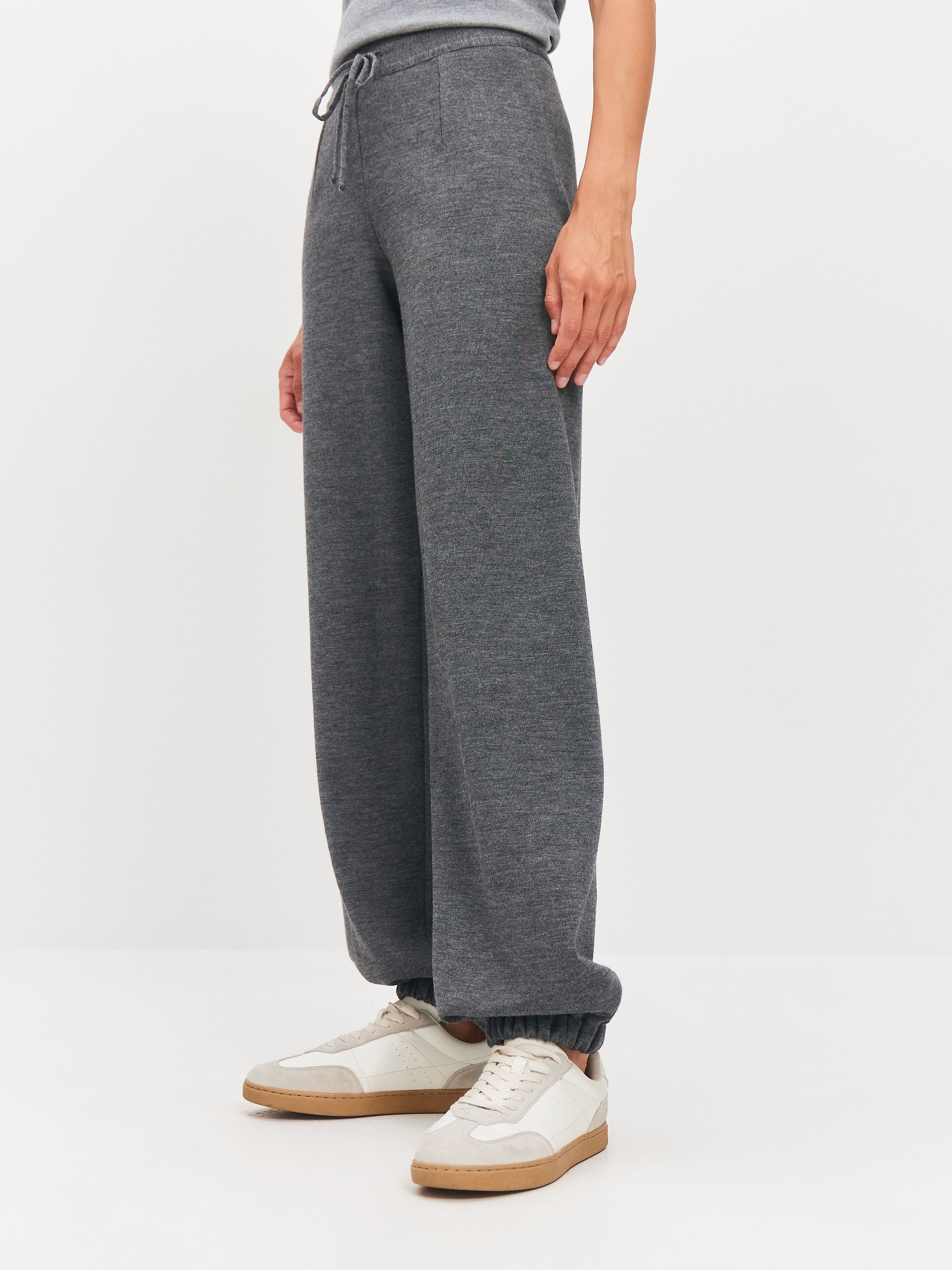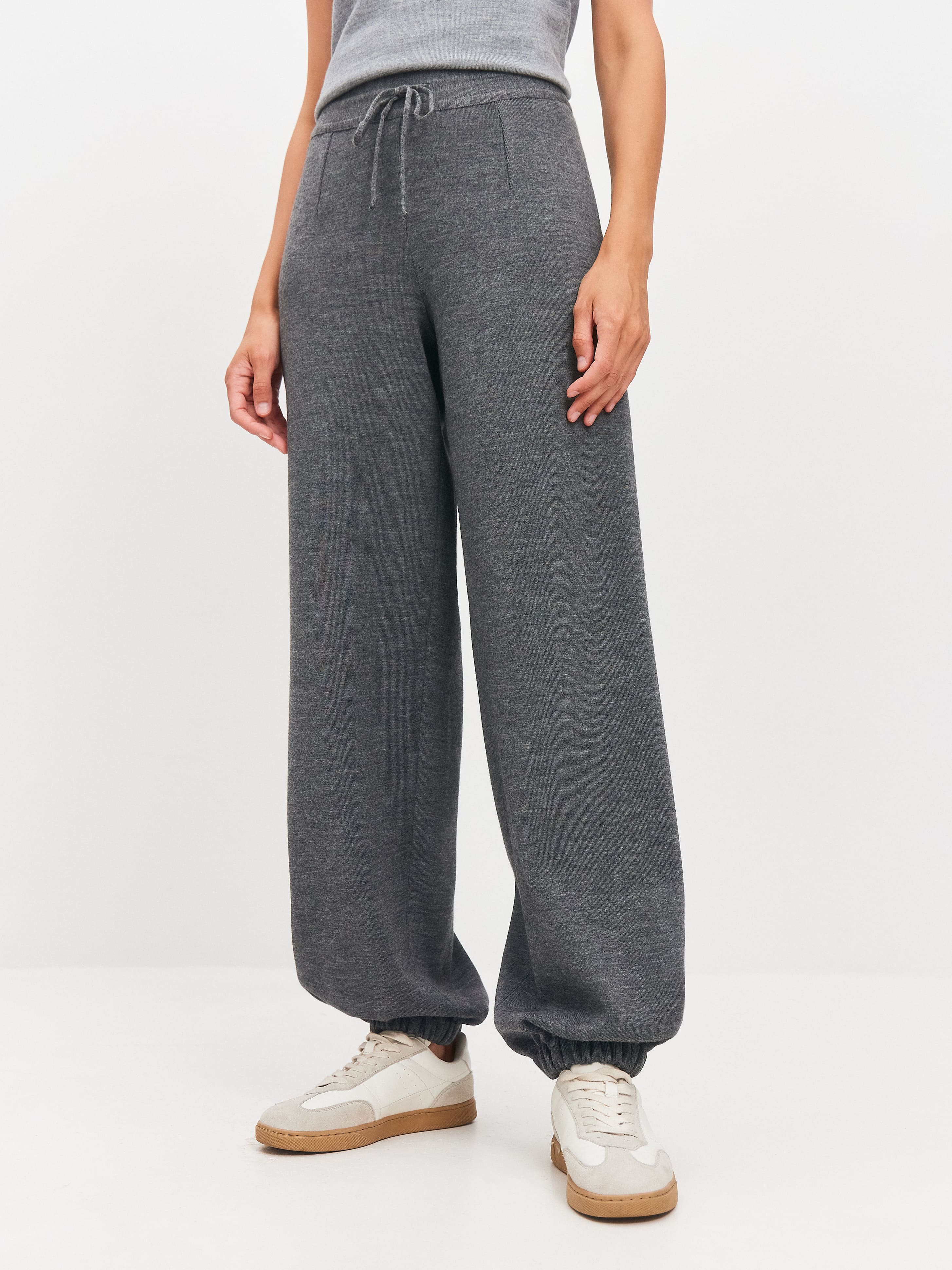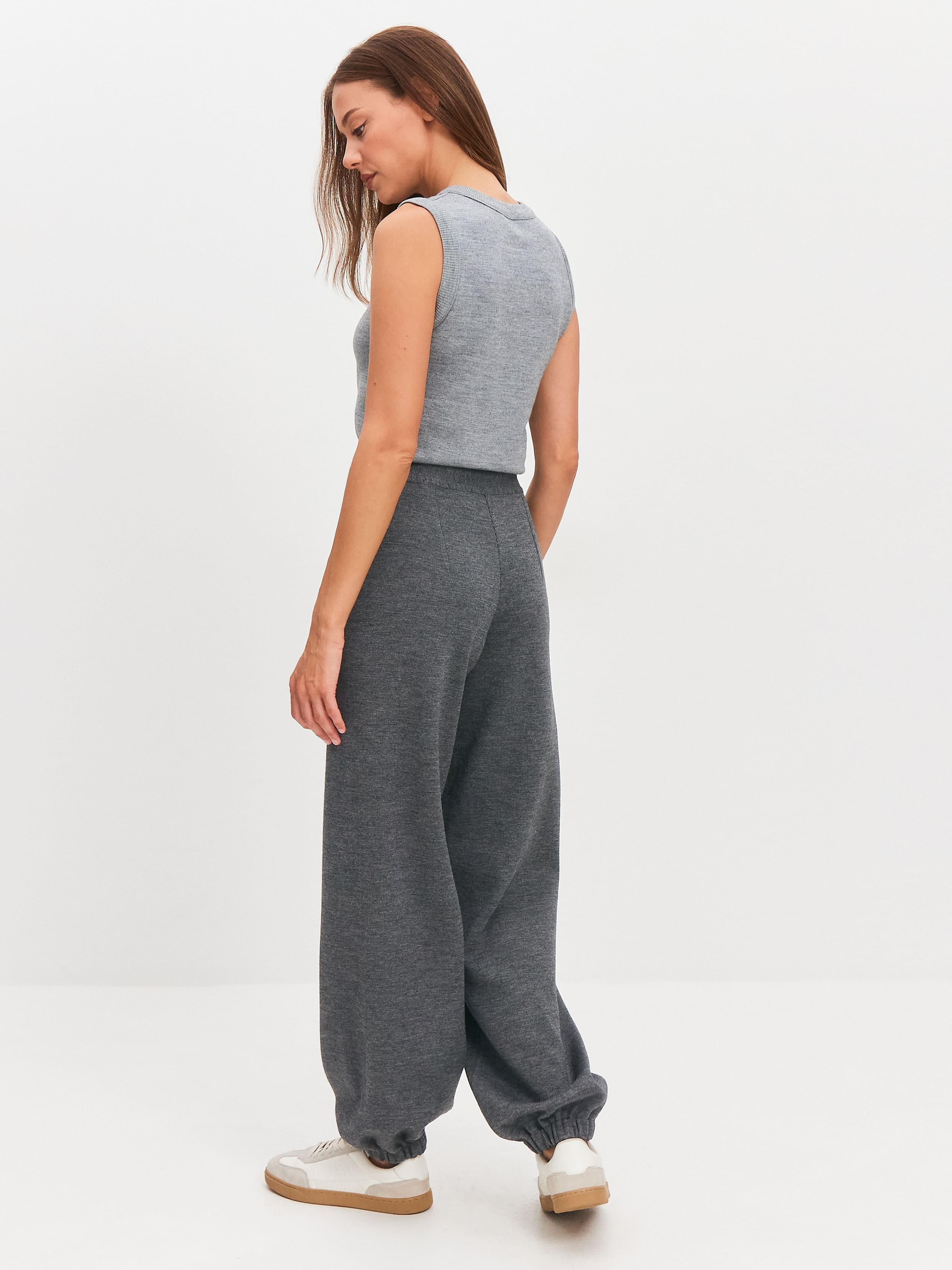 Широкие утепленные брюки для влюбленных в расслабленную посадку и пластичный трикотаж. Широкий пояс на кулиске обеспечивает коррекцию прилегания модели в талии. Внизу брюки присборены. Такой прием исключает запачкивание краев штанин в комбинациях с обувью на плоском ходу. Устойчивость формы достигается за счет сбалансированного состава. Модель изготавливается из согревающей пряжи, в которой поровну мериносовой шерсти и вискозы. Такой микс волокон придает брюкам оптимальную прочность, препятствующую растяжению штанин.