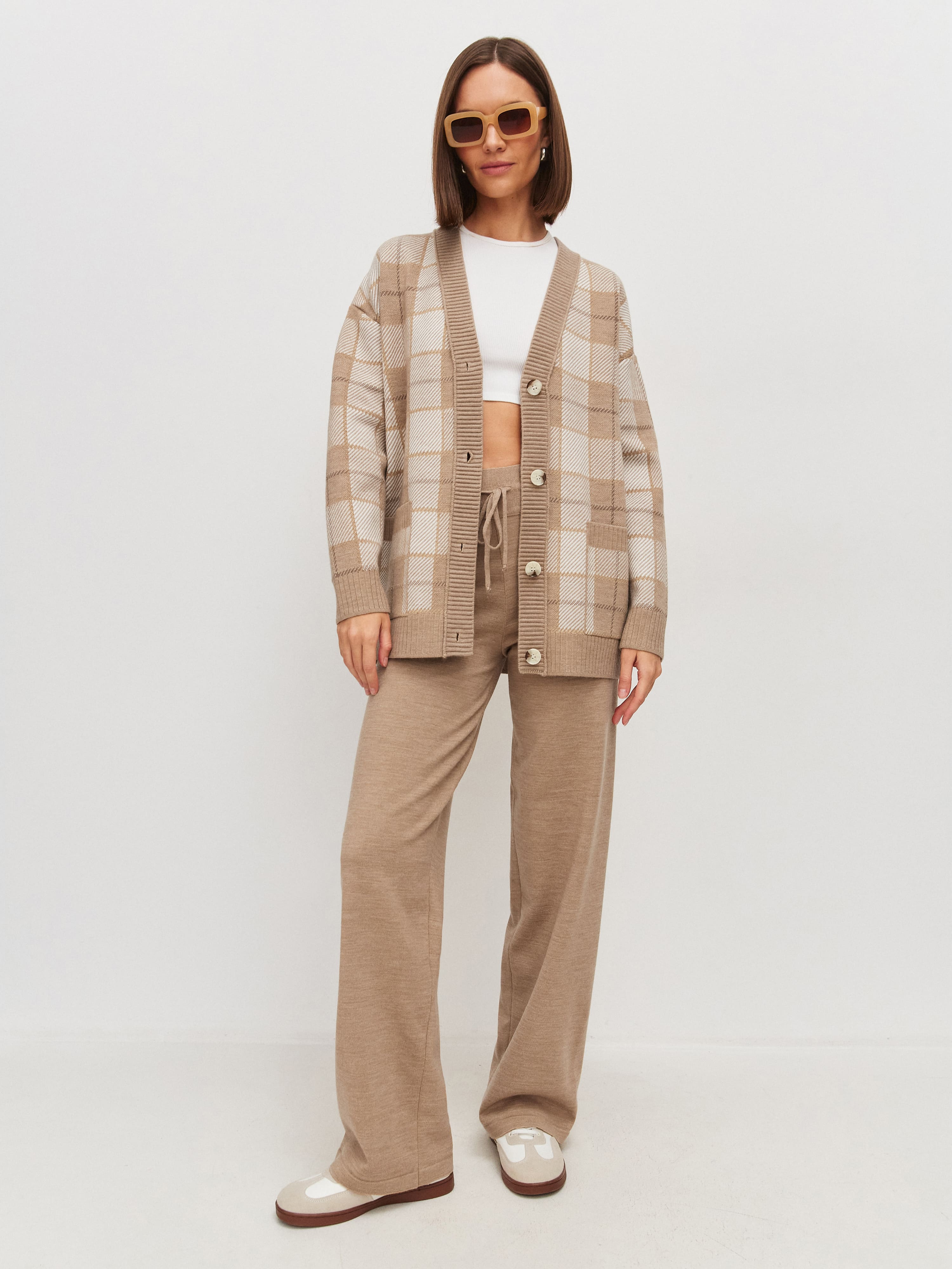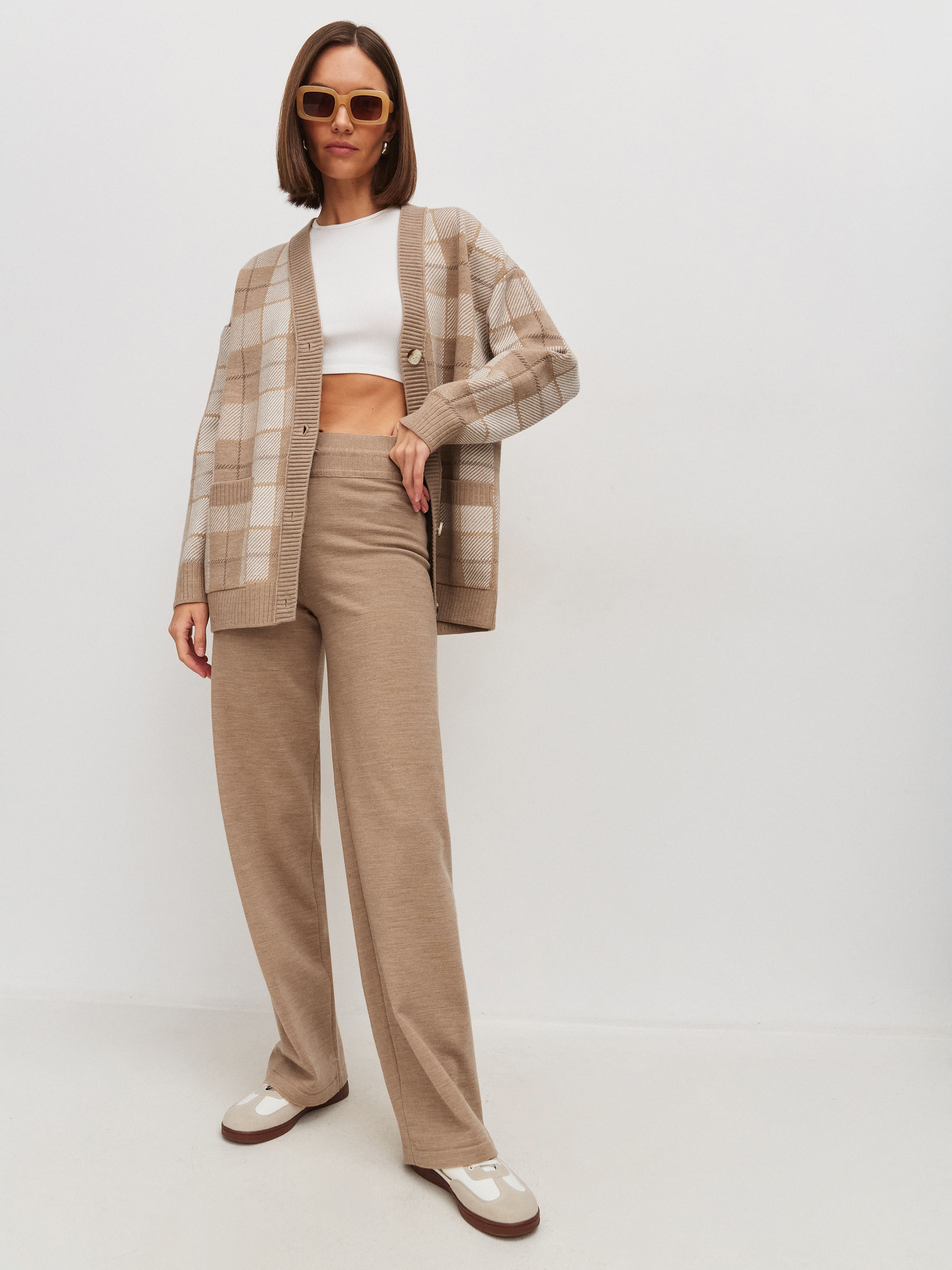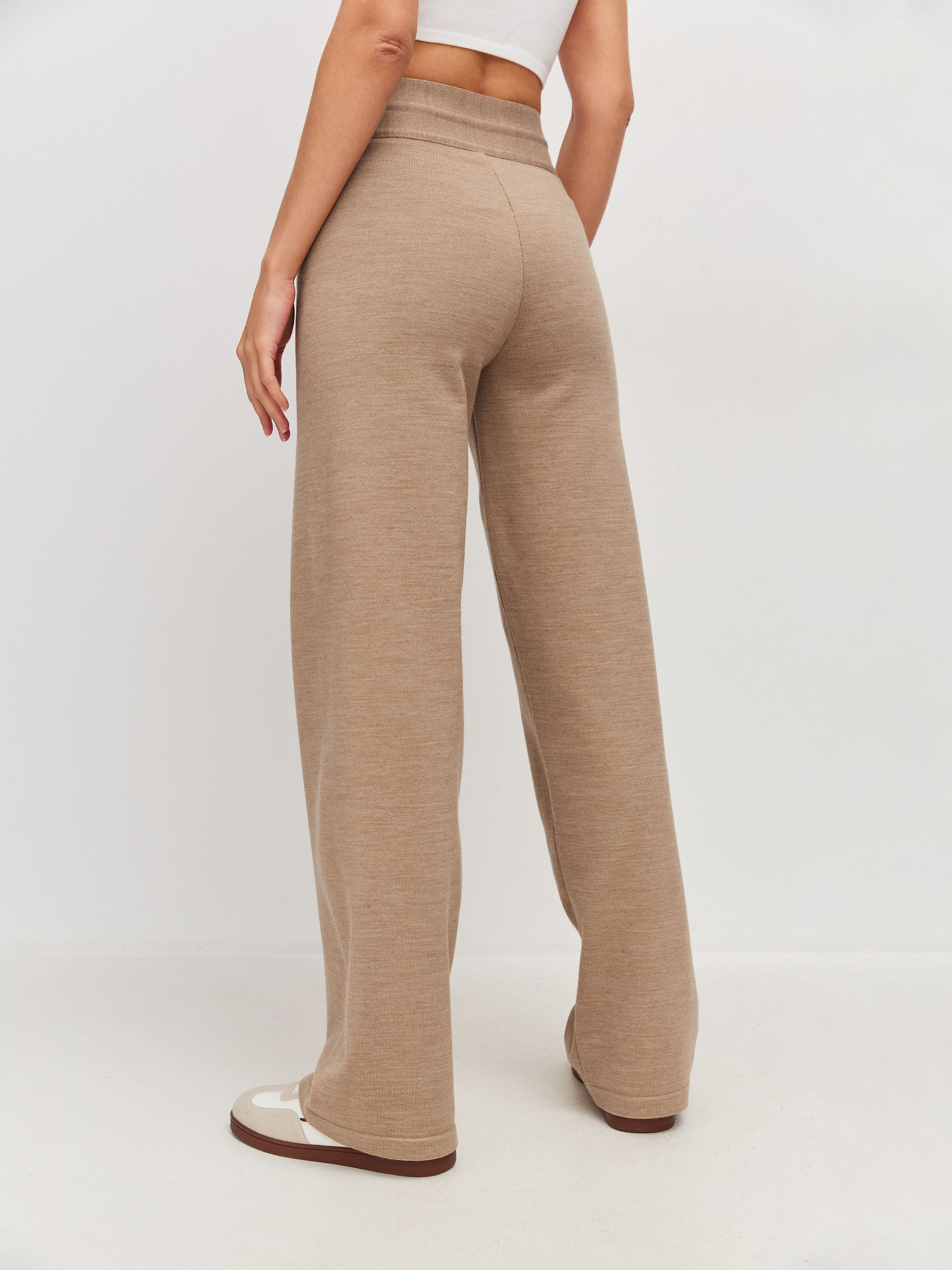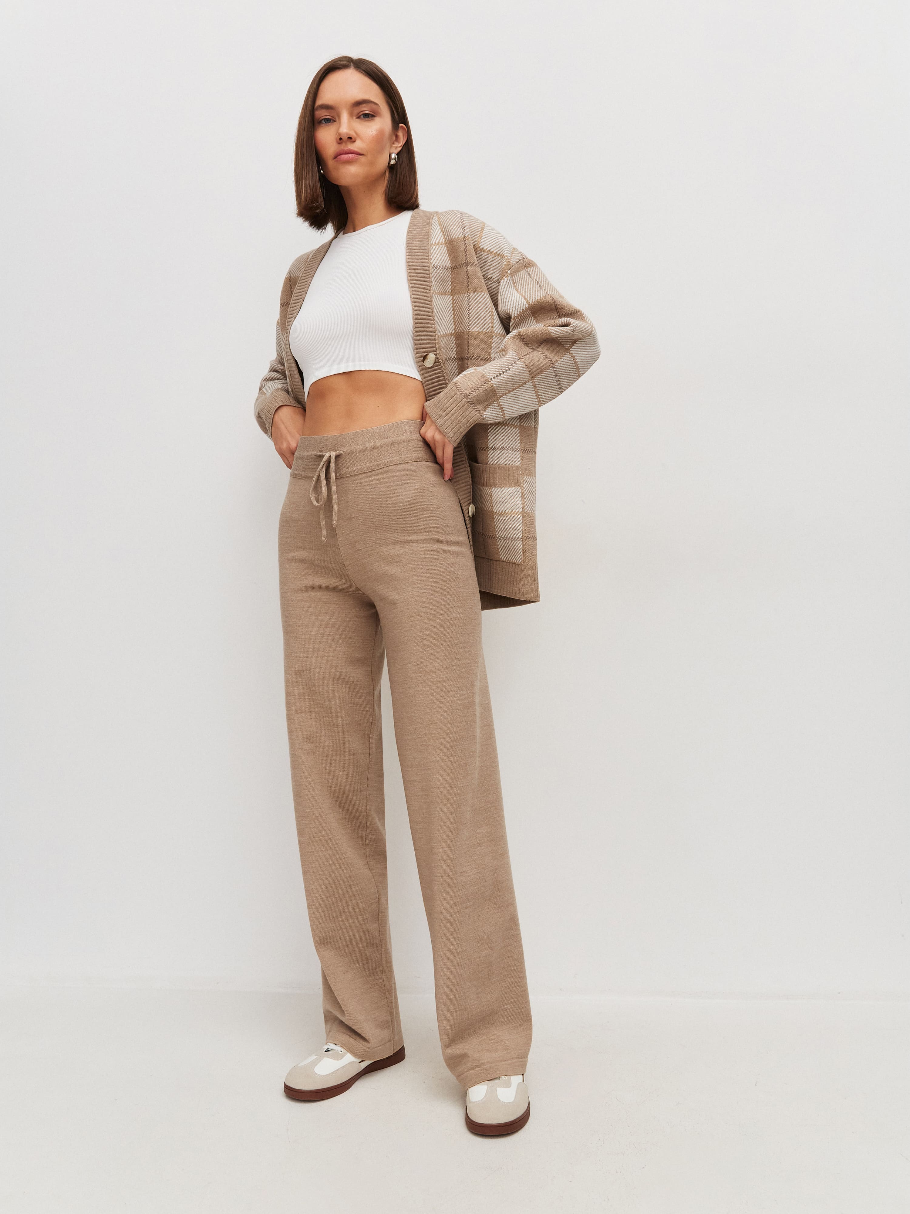 Милые расслабленные брюки на регулирующейся кулиске – любовь на все времена. Модель с высокой посадкой для визуального увеличения длины ног. За счет шерстяной нити брюки изумительно теплые и плотные, но при этом легкие и не колючие, благодаря включению шелковистого акрила. Трикотаж мягко ложится по линии бедра, формируя красивый переход. Для создания интересных женственных луков в компанию рекомендуем нежные кроп-топы из летней линейки и объемные кардиганы в качестве верхнего слоя.
