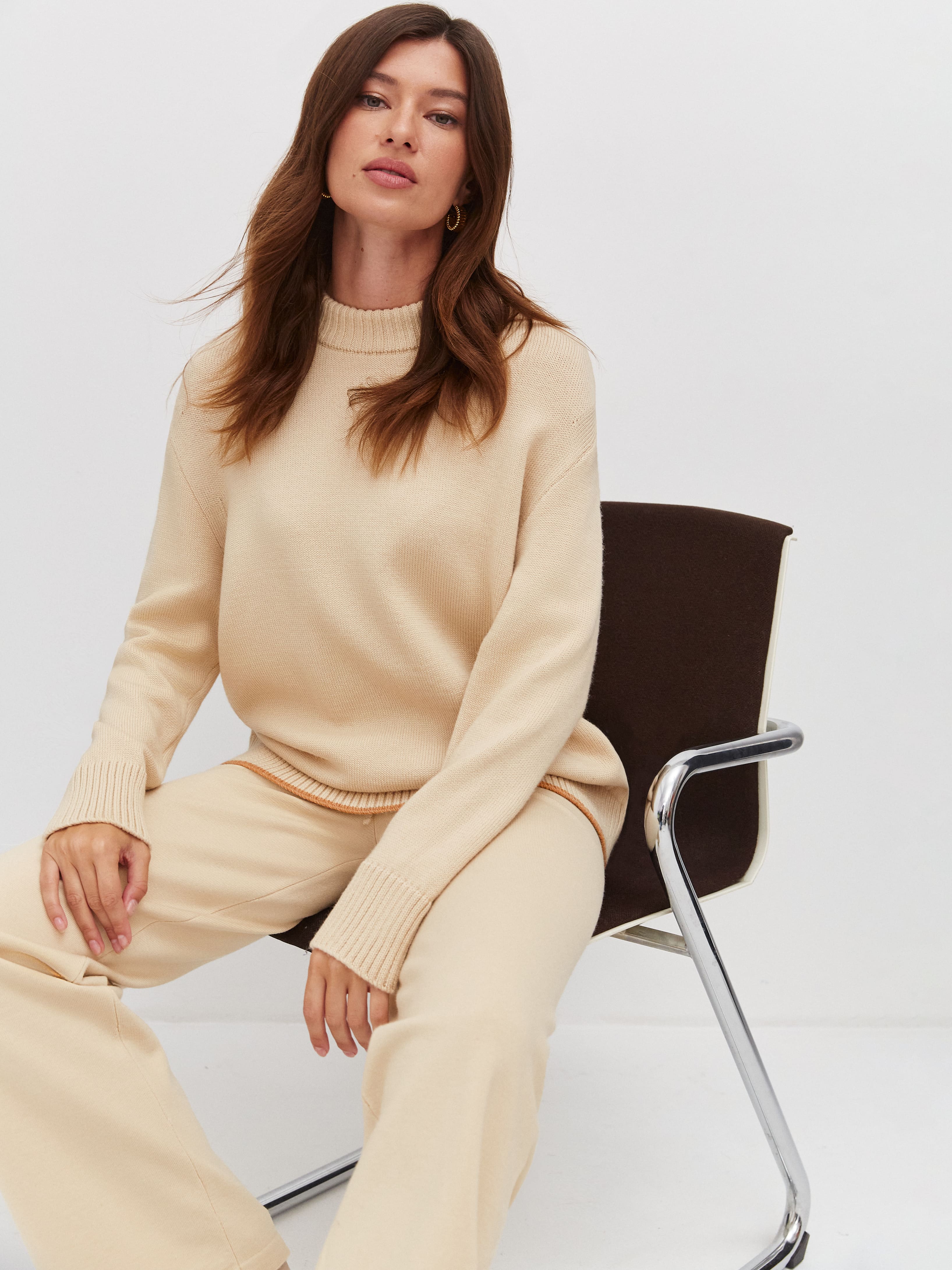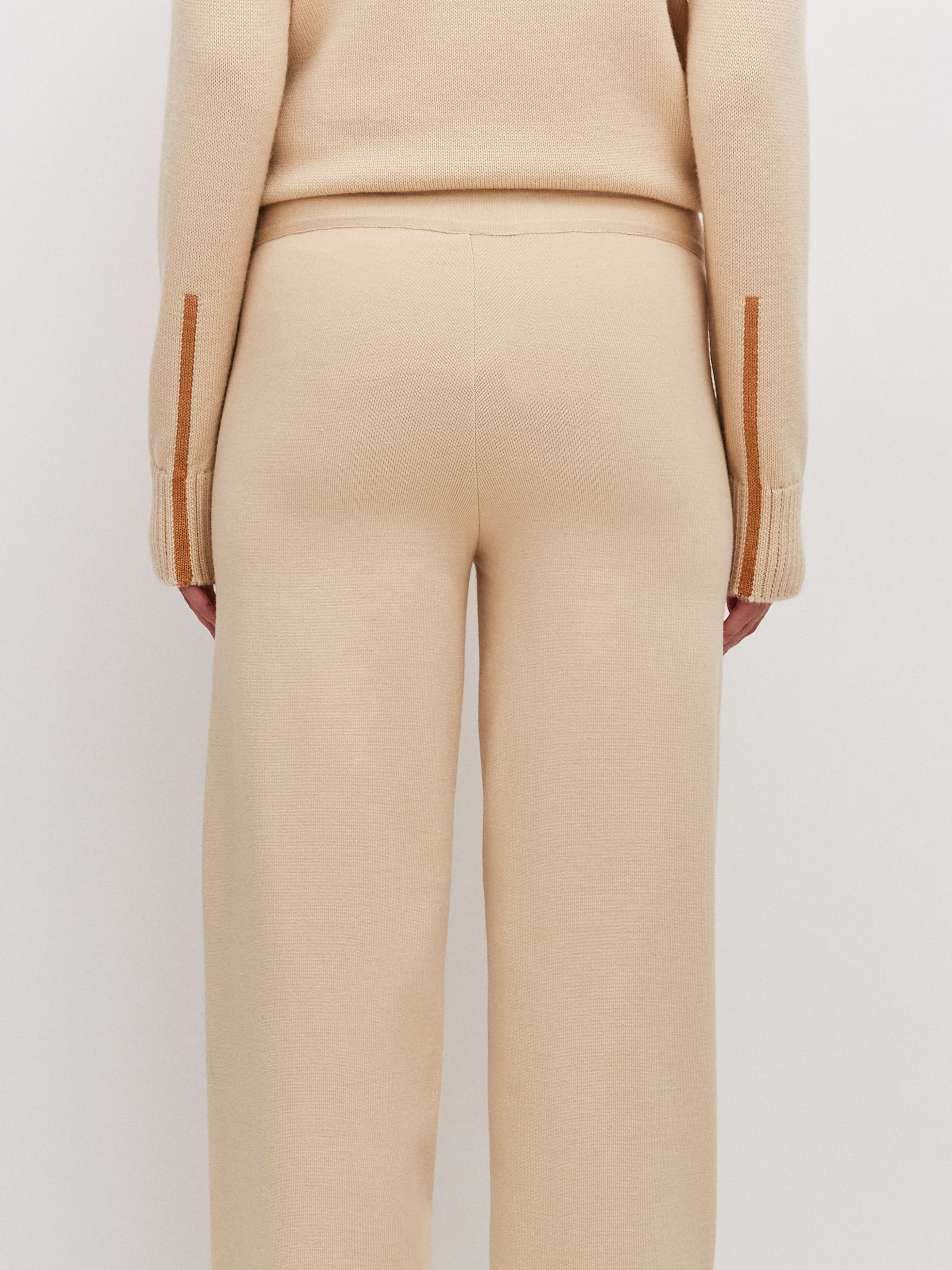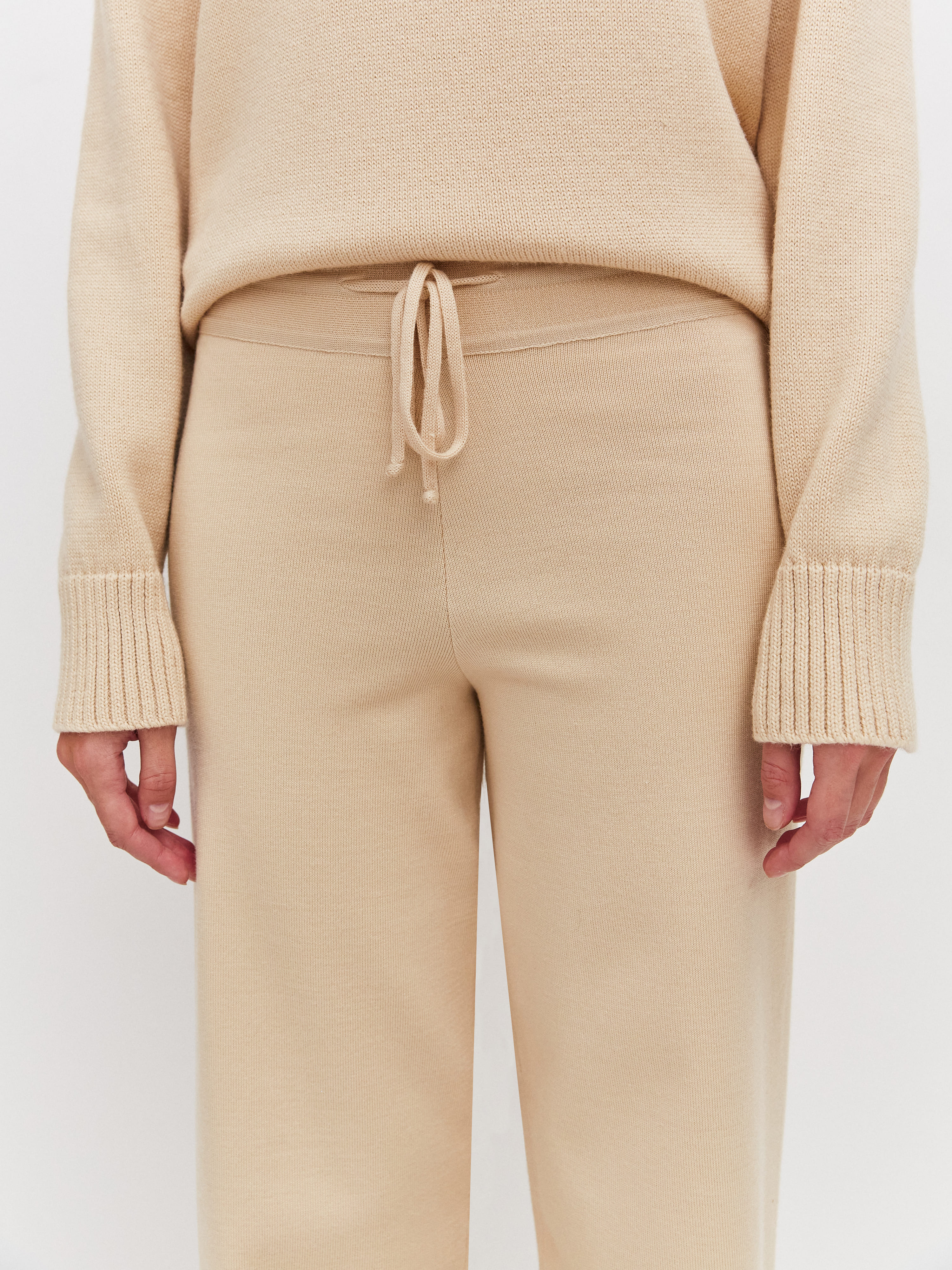 Милые расслабленные брюки на регулирующейся кулиске – любовь на все времена. Модель с высокой посадкой для визуального увеличения длины ног. За счет шерстяной нити брюки изумительно теплые и плотные, но при этом легкие и не колючие, благодаря включению шелковистого акрила. Трикотаж мягко ложится по линии бедра, формируя красивый переход. Для создания интересных женственных луков в компанию рекомендуем нежные кроп-топы из летней линейки и объемные кардиганы в качестве верхнего слоя.
