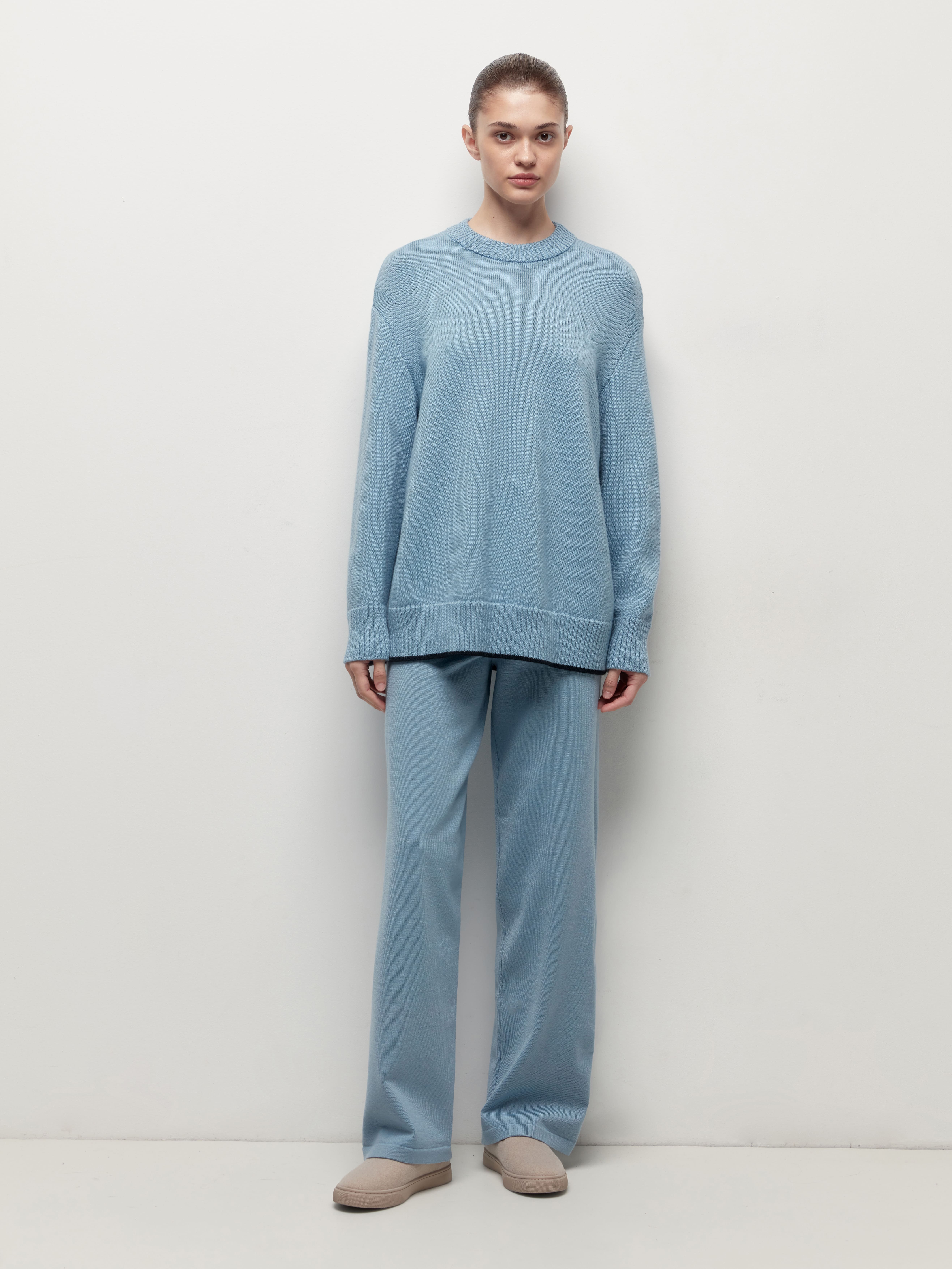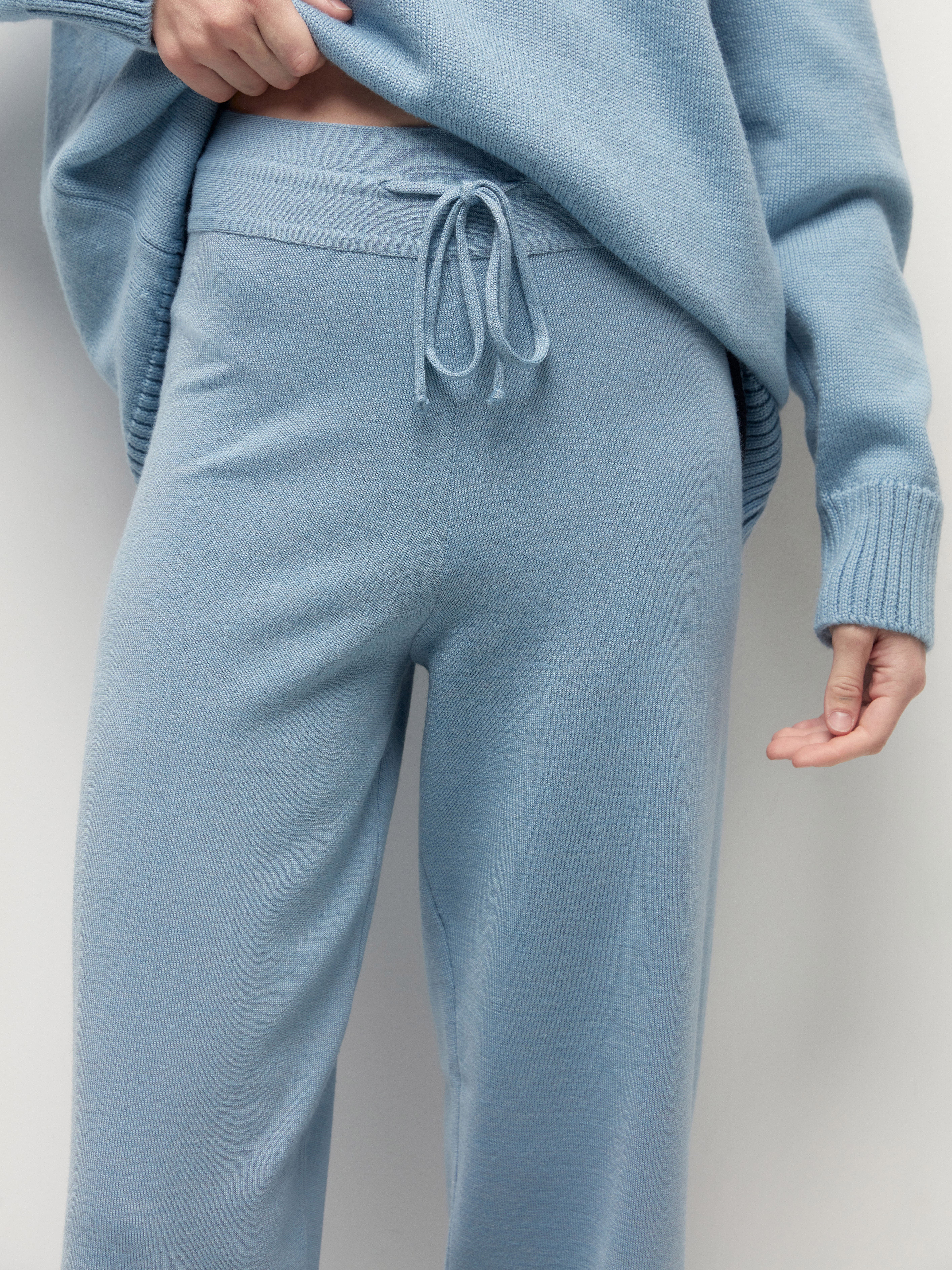 Милые расслабленные брюки на регулирующейся кулиске – любовь на все времена. Модель с высокой посадкой для визуального увеличения длины ног. За счет шерстяной нити брюки изумительно теплые и плотные, но при этом легкие и не колючие, благодаря включению шелковистого акрила. Трикотаж мягко ложится по линии бедра, формируя красивый переход. Для создания интересных женственных луков в компанию рекомендуем нежные кроп-топы из летней линейки и объемные кардиганы в качестве верхнего слоя.