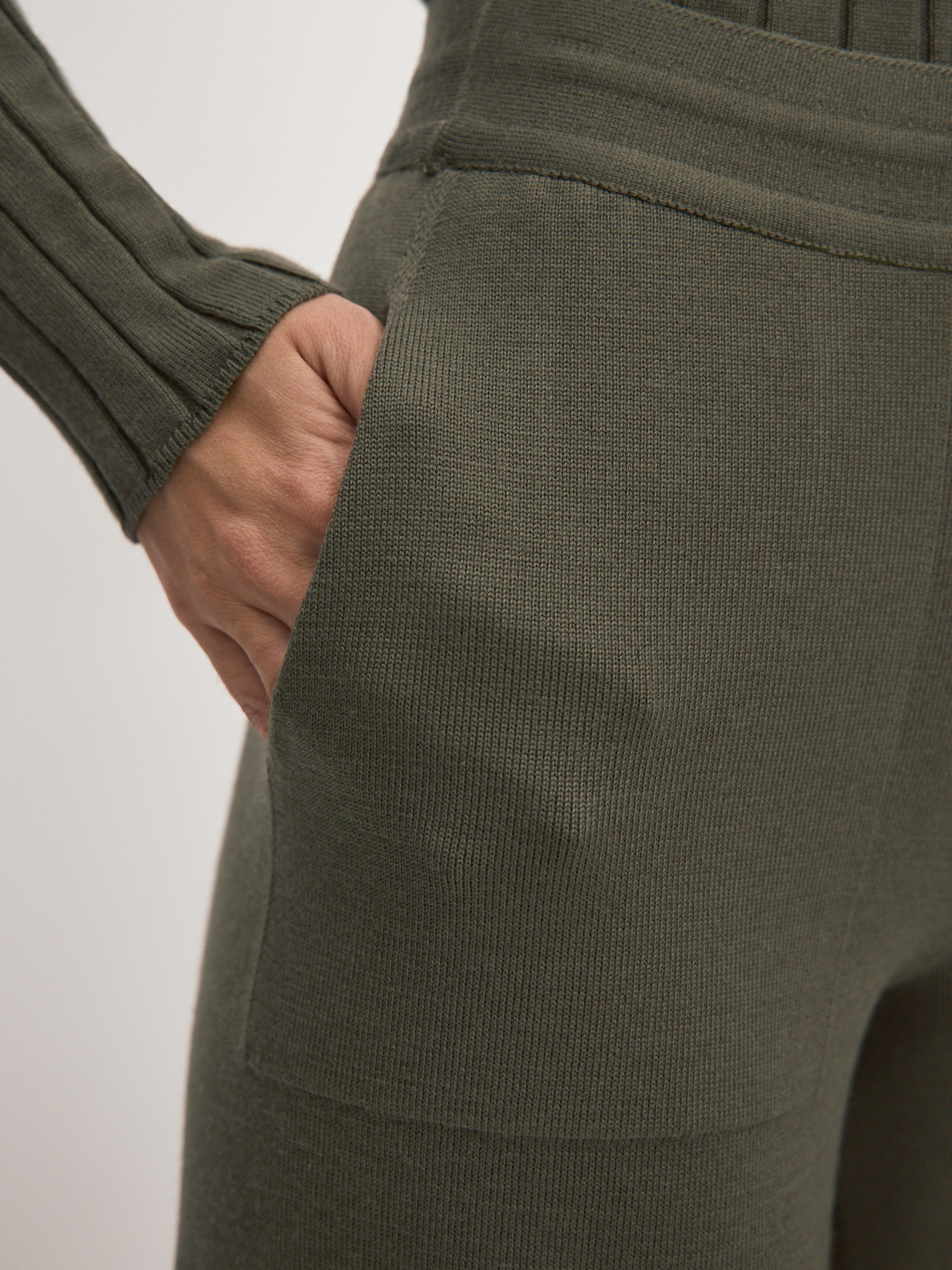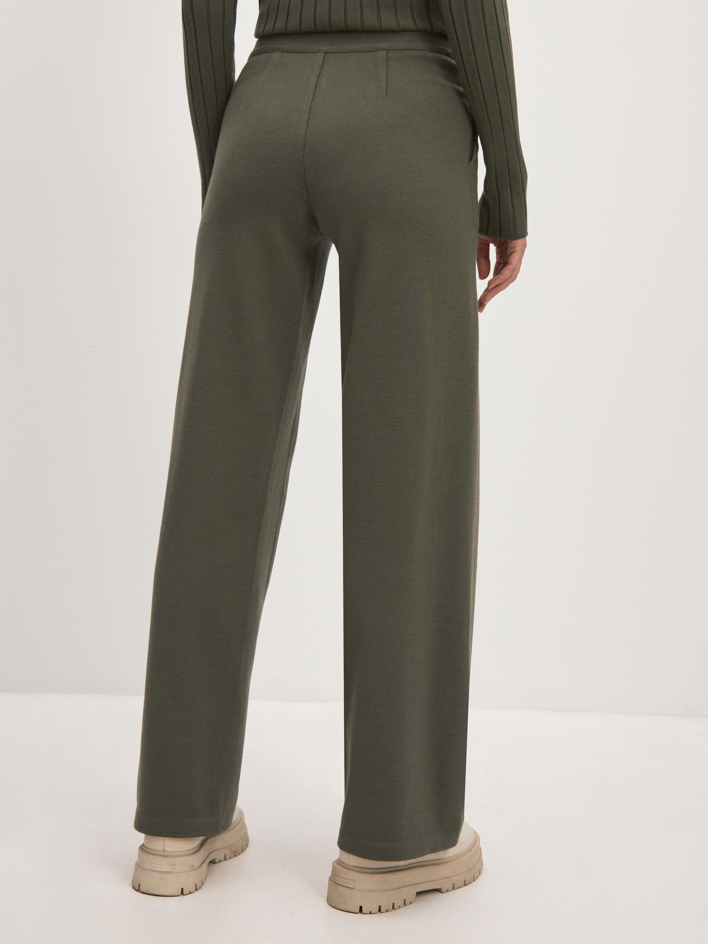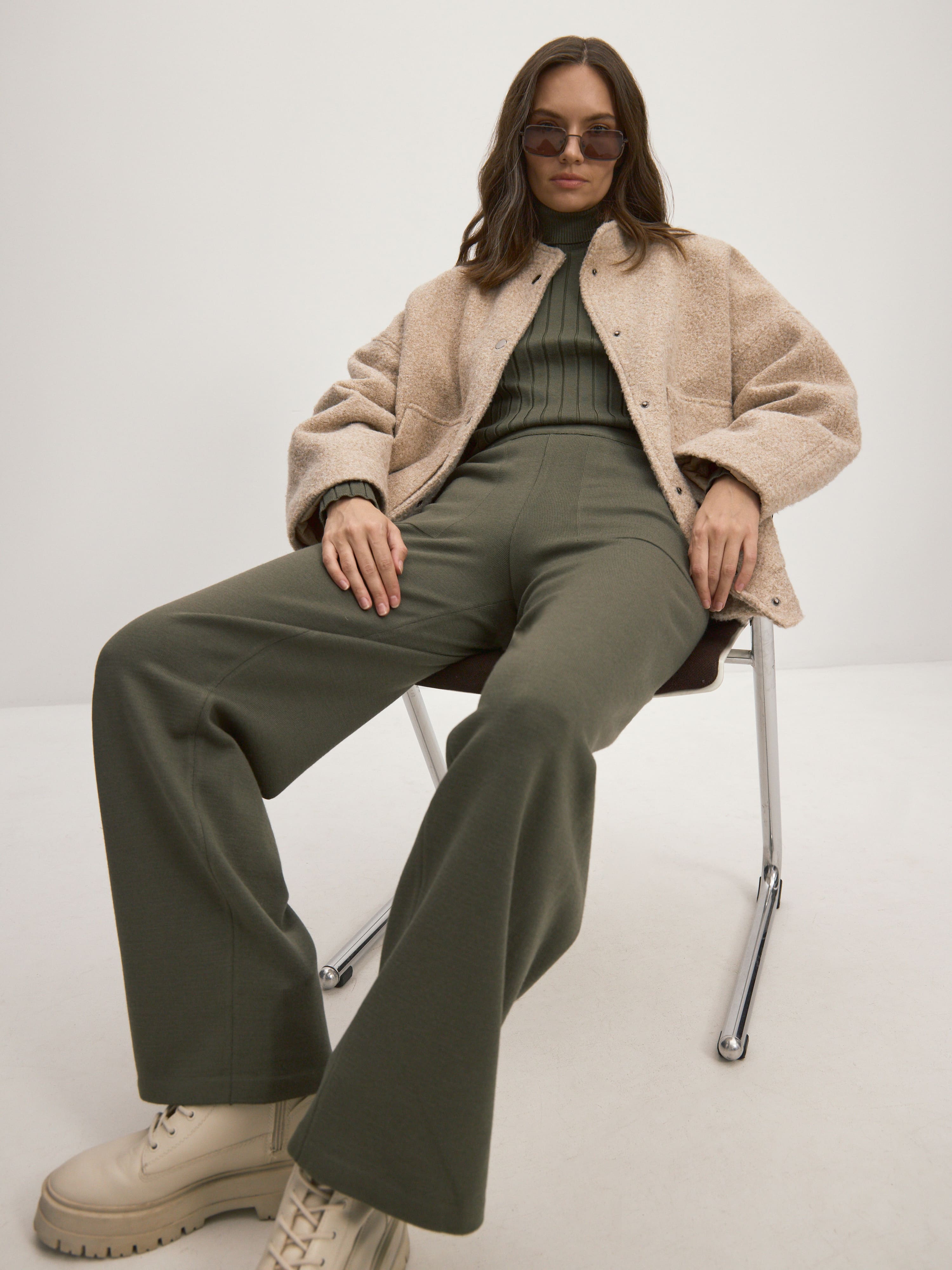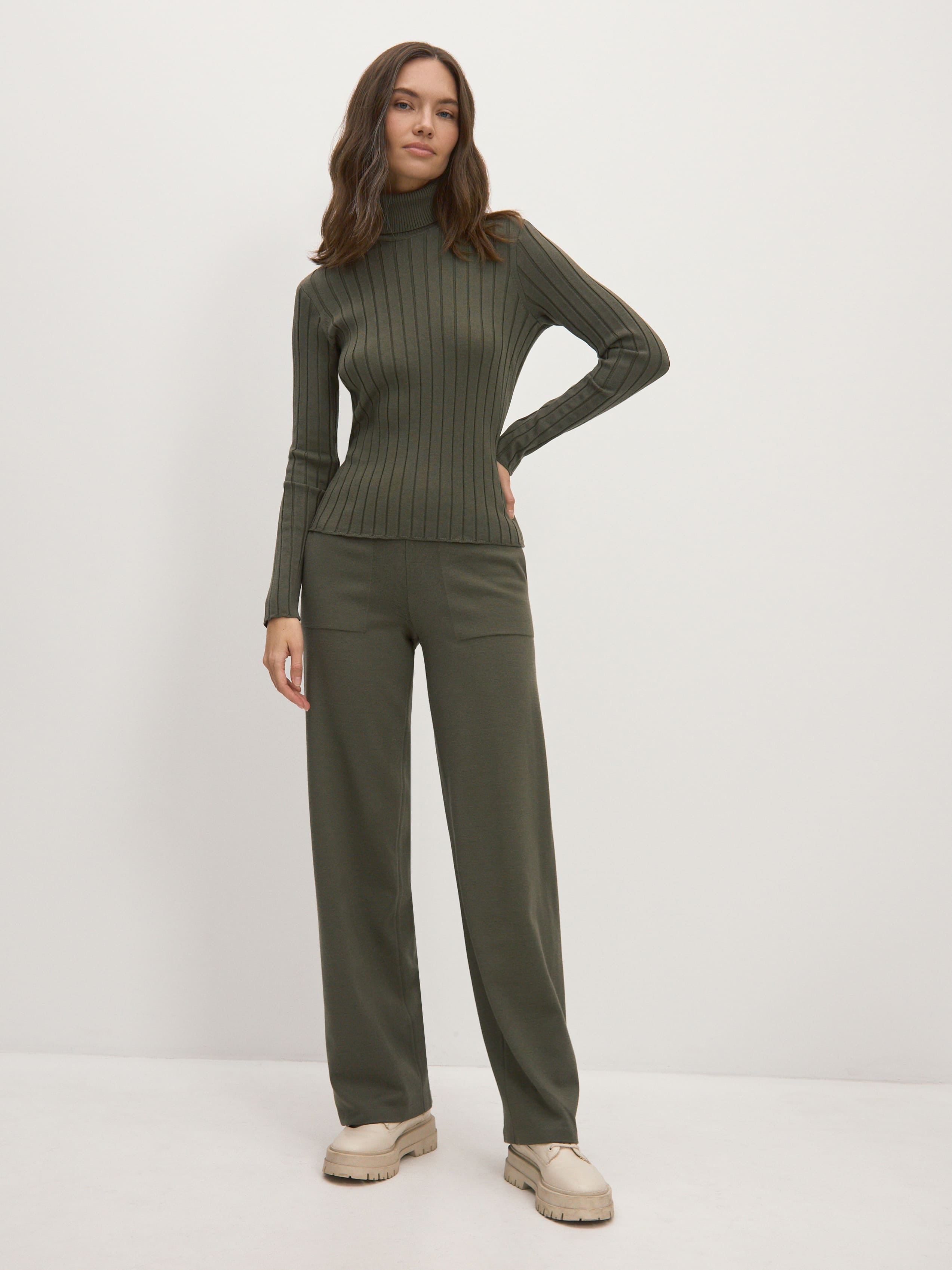 Свободные прямые брюки из трикотажа плотного плетения. Всесезонная база, преимущества которой раскрываются с первым похолоданием. Создадут гармоничный осенний сет с жакетами и бомберами бренда. Основной материал брюк: мериносовая шерсть в равных пропорциях с вискозой. Каждый тип волокон выполняет отдельную задачу. Меринос удерживает тепло, проводит воздух, испаряет влагу с тела. Вискоза выступает в качестве смягчителя шерсти, защищает от перегрева.