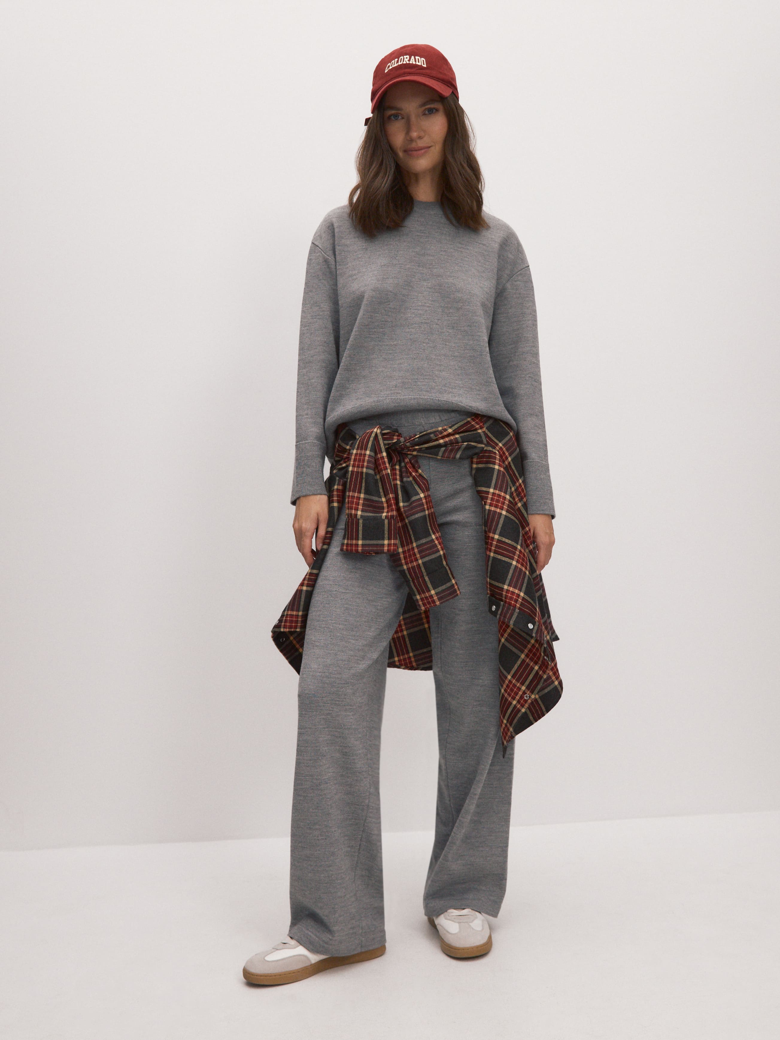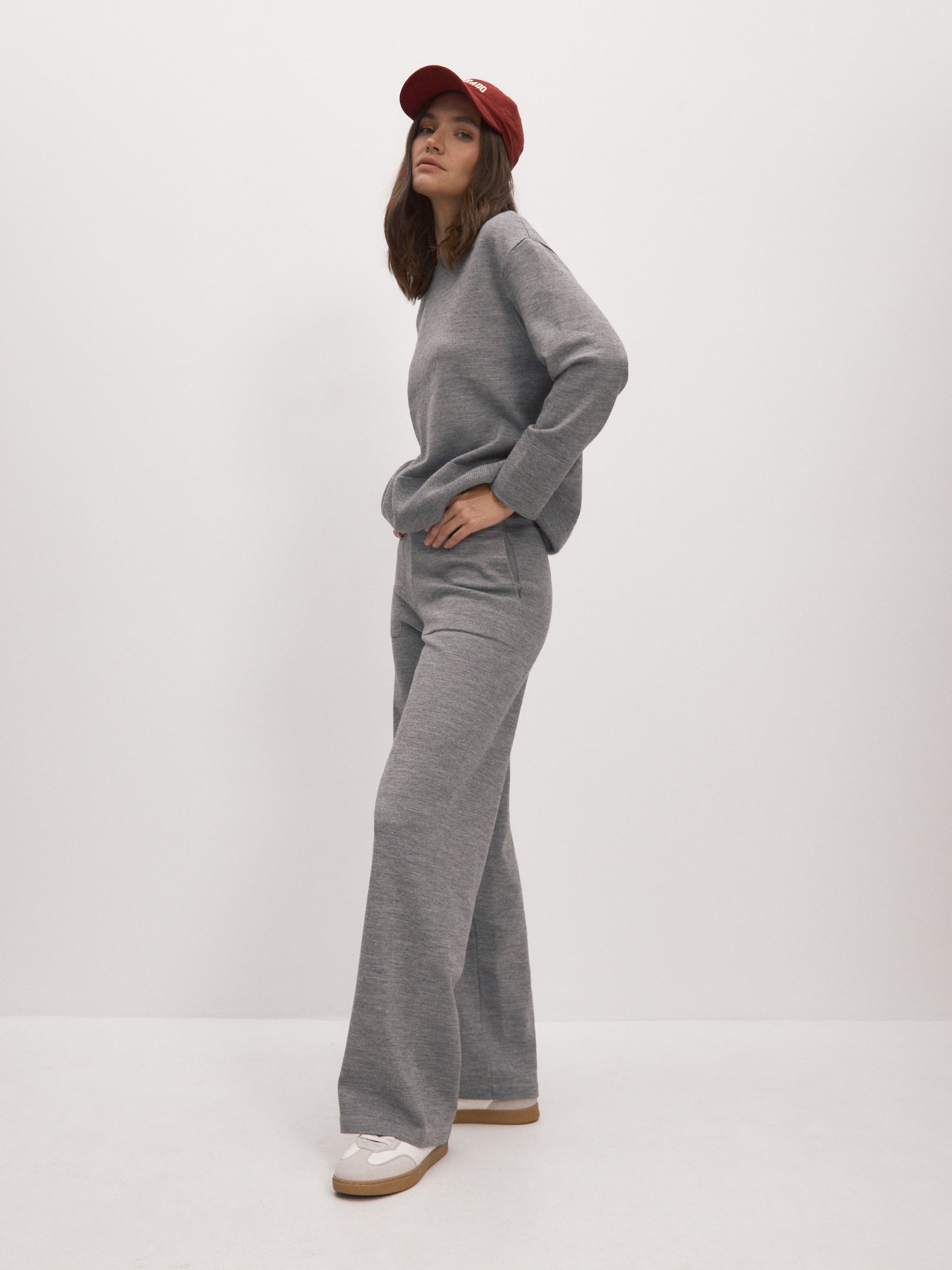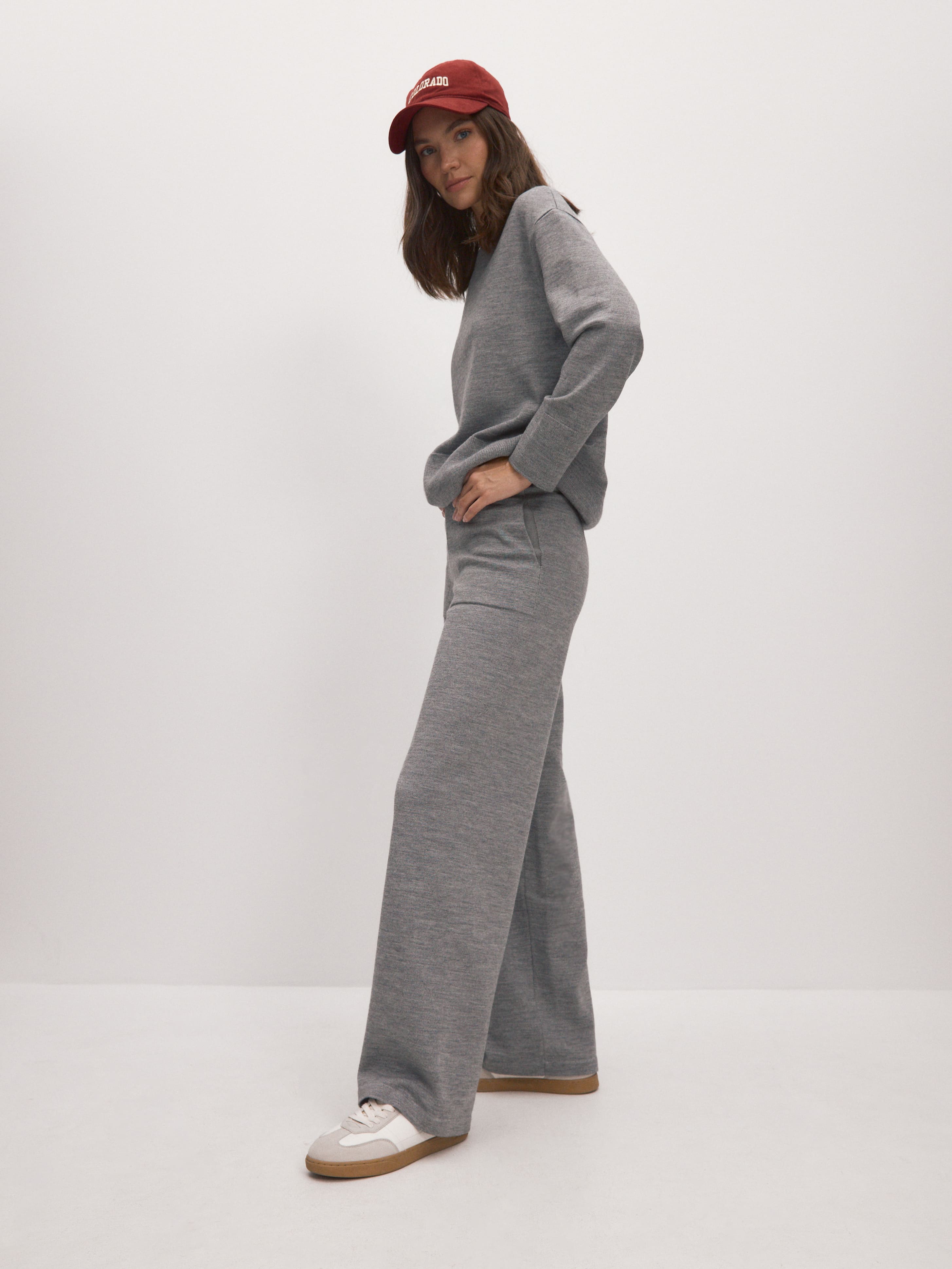 Свободные прямые брюки из трикотажа плотного плетения. Всесезонная база, преимущества которой раскрываются с первым похолоданием. Создадут гармоничный осенний сет с жакетами и бомберами бренда. Основной материал брюк: мериносовая шерсть в равных пропорциях с вискозой. Каждый тип волокон выполняет отдельную задачу. Меринос удерживает тепло, проводит воздух, испаряет влагу с тела. Вискоза выступает в качестве смягчителя шерсти, защищает от перегрева.