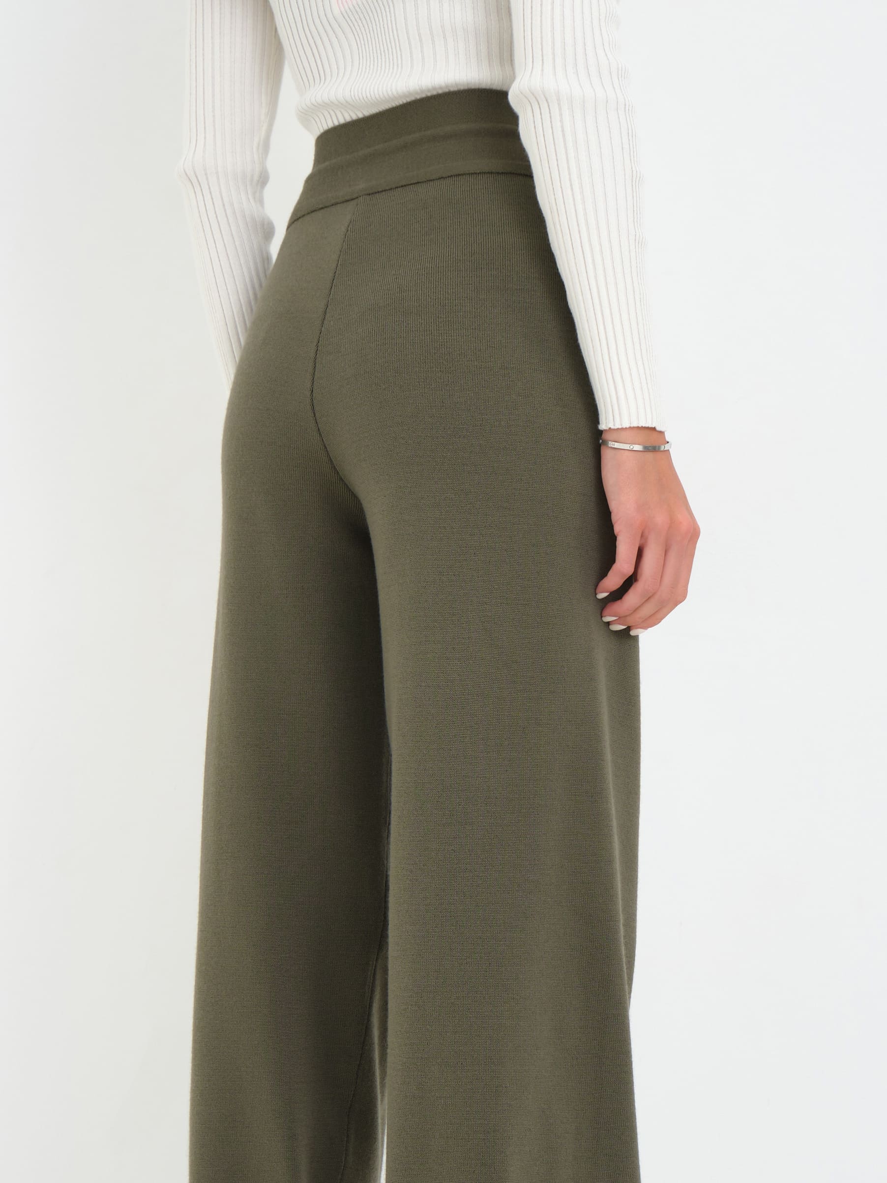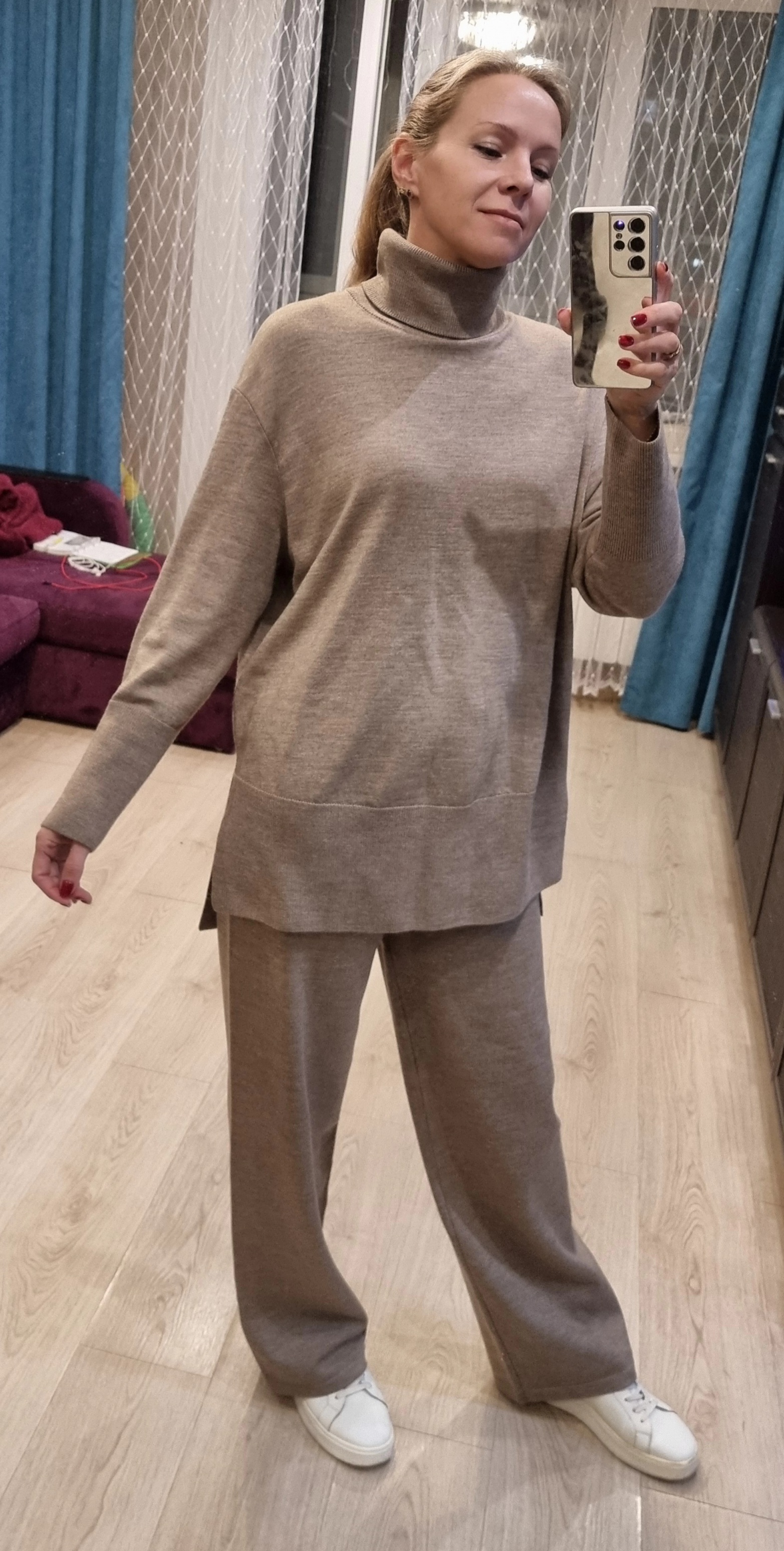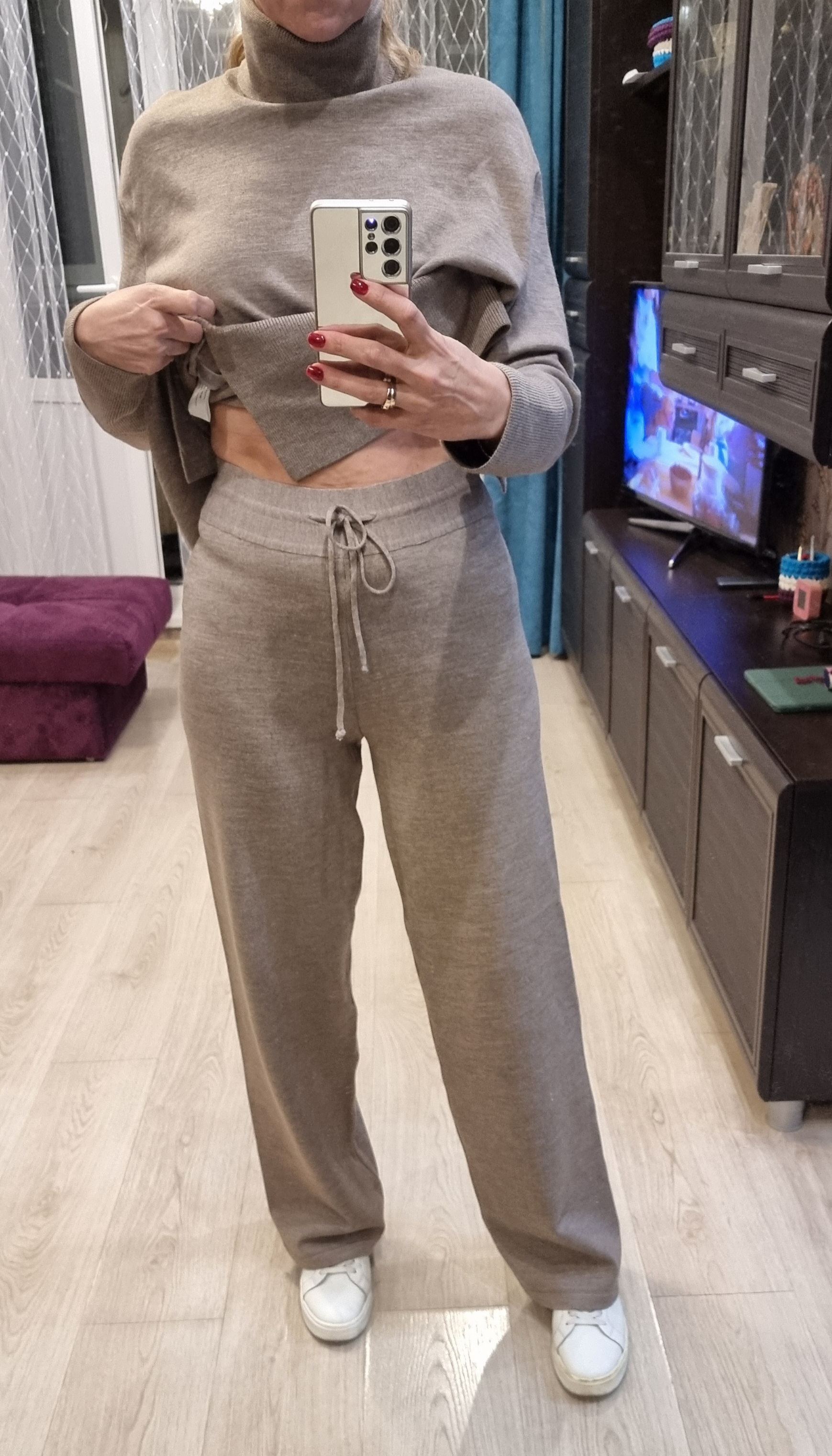 Лаконичные базовые брюки палаццо из мягкой полушерсти – это история про легкую расслабленность и уютное тепло в хмурые осенние дни. Кулиску на талии можно затянуть на максимум или оставить в свободном состоянии для более комфортных ощущений. И не волнуйтесь за формоустойчивость. Мы включили в трикотаж сверхпрочную модифицированную вискозу, предохраняющую структуру брюк от неэстетичных деформаций.
