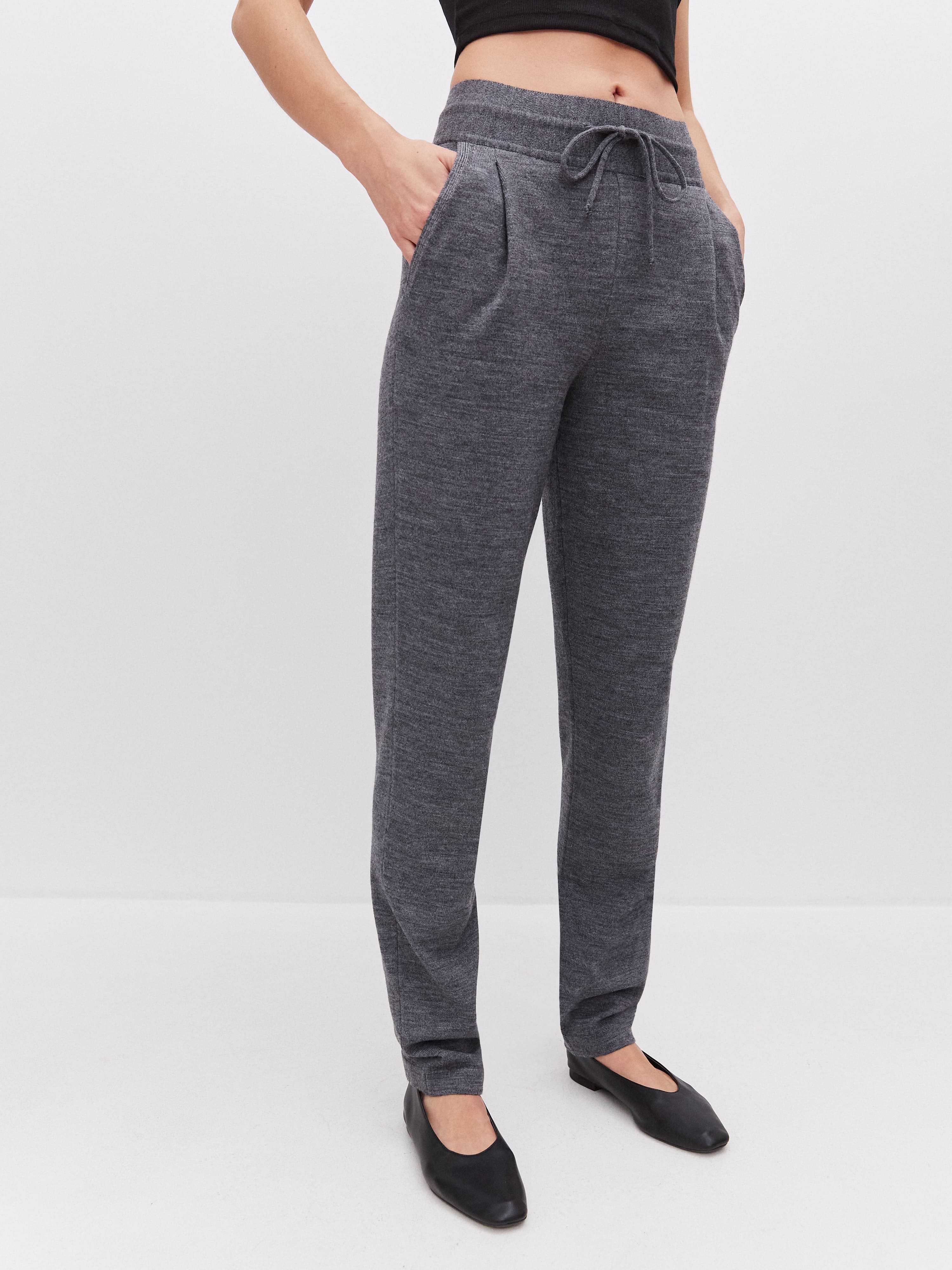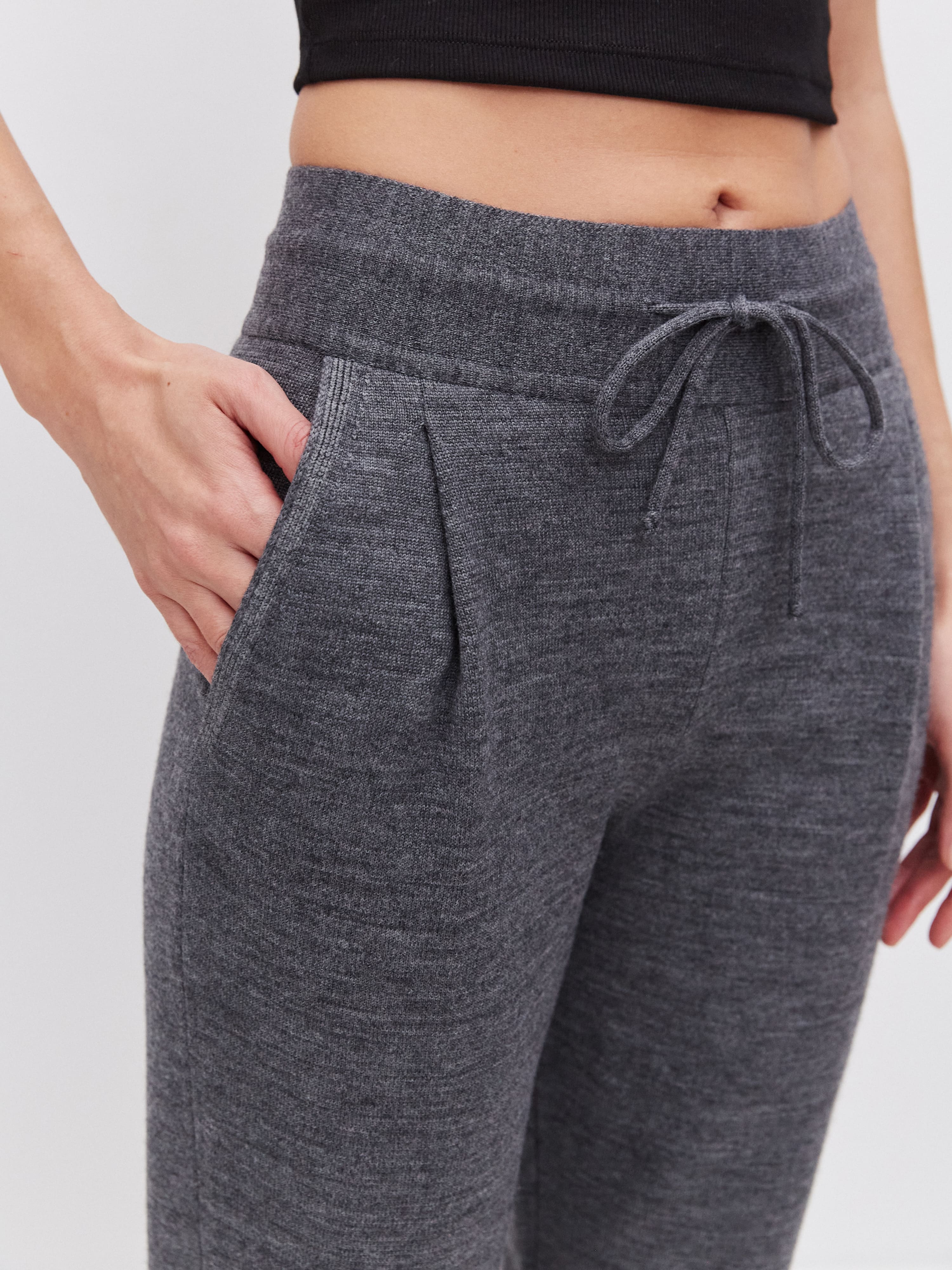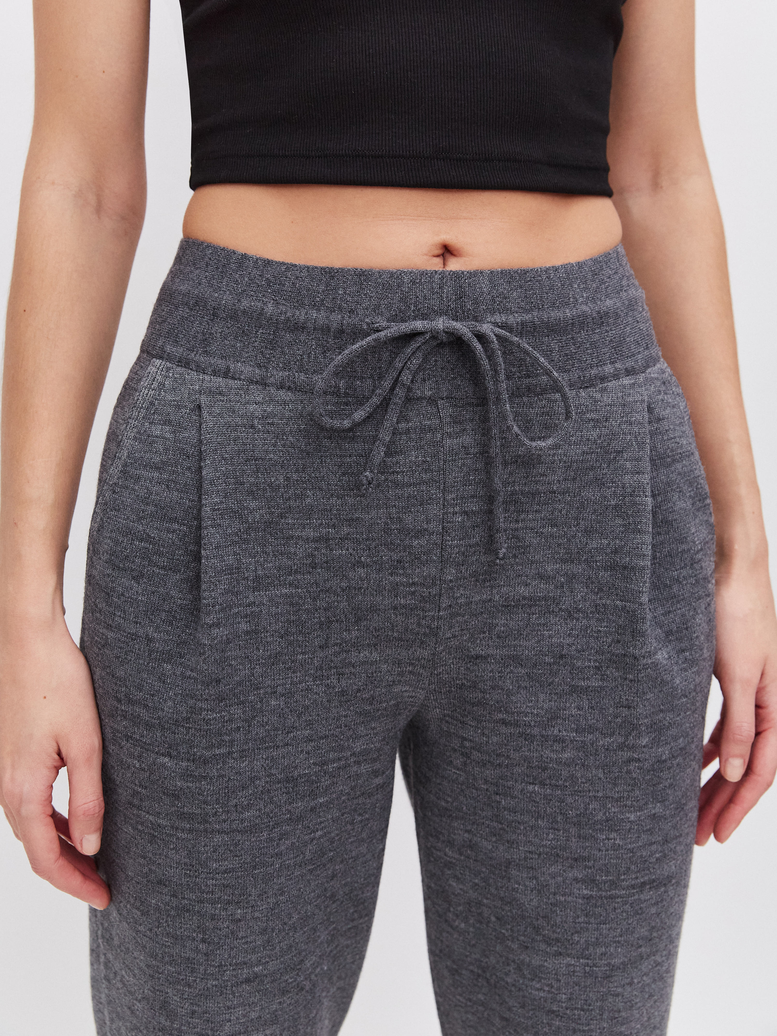 У этих теплых брючек багги есть два неоспоримых достоинства. Они выполнены из чесаной мериносовой шерсти и легко адаптируются под размер талии за счет кулиски. Защипы в верхней части и зауженные к низу брючины моделируют комфортный силуэт. От деформаций модель защищена полиамидом. Именно он придает тяжелому зимнему трикотажу необходимую пластичность. Результат: даже после дня, проведенного в офисном кресле, брюки сохраняют первоначальную форму и не вытягиваются в коленной зоне.