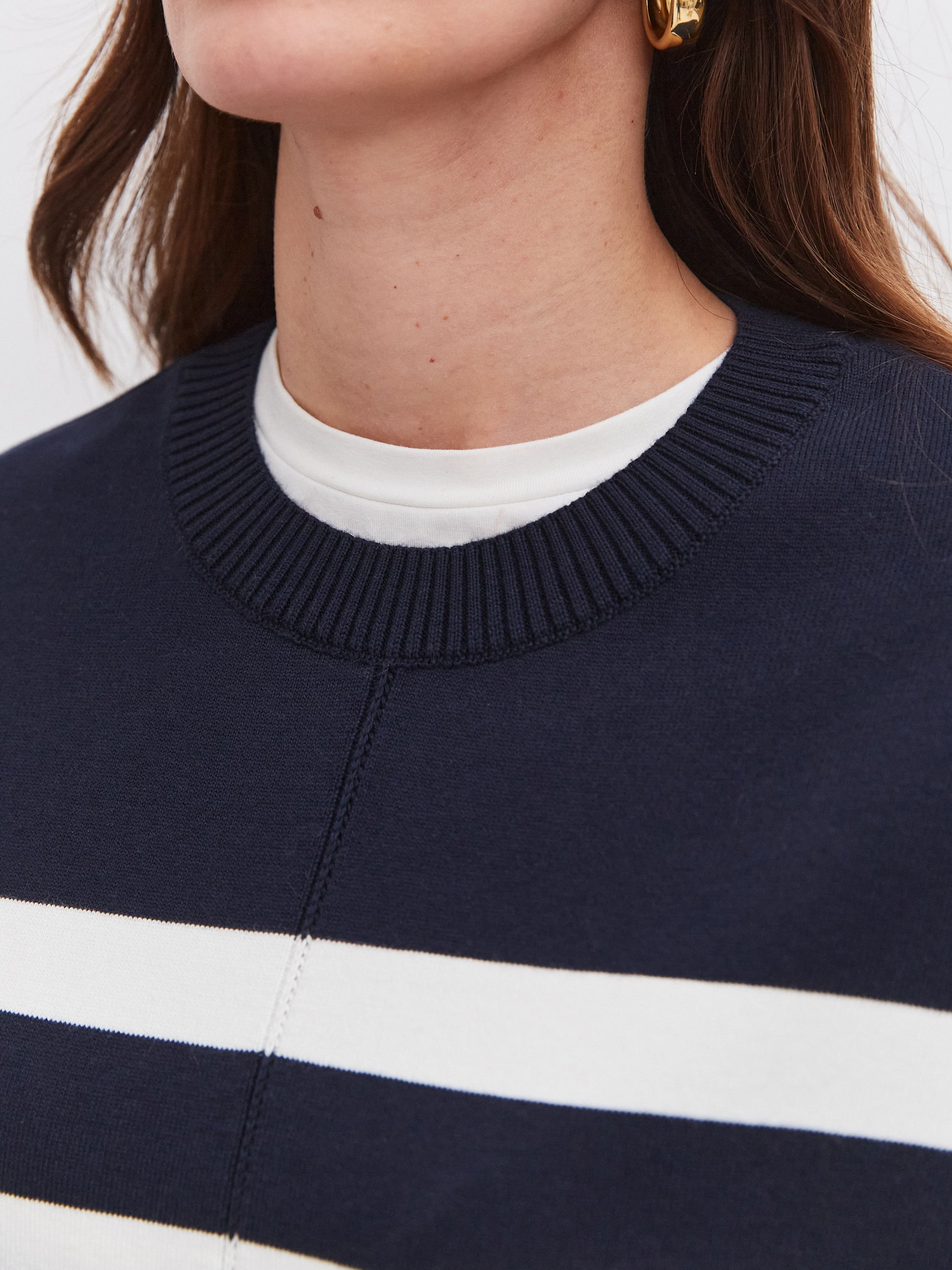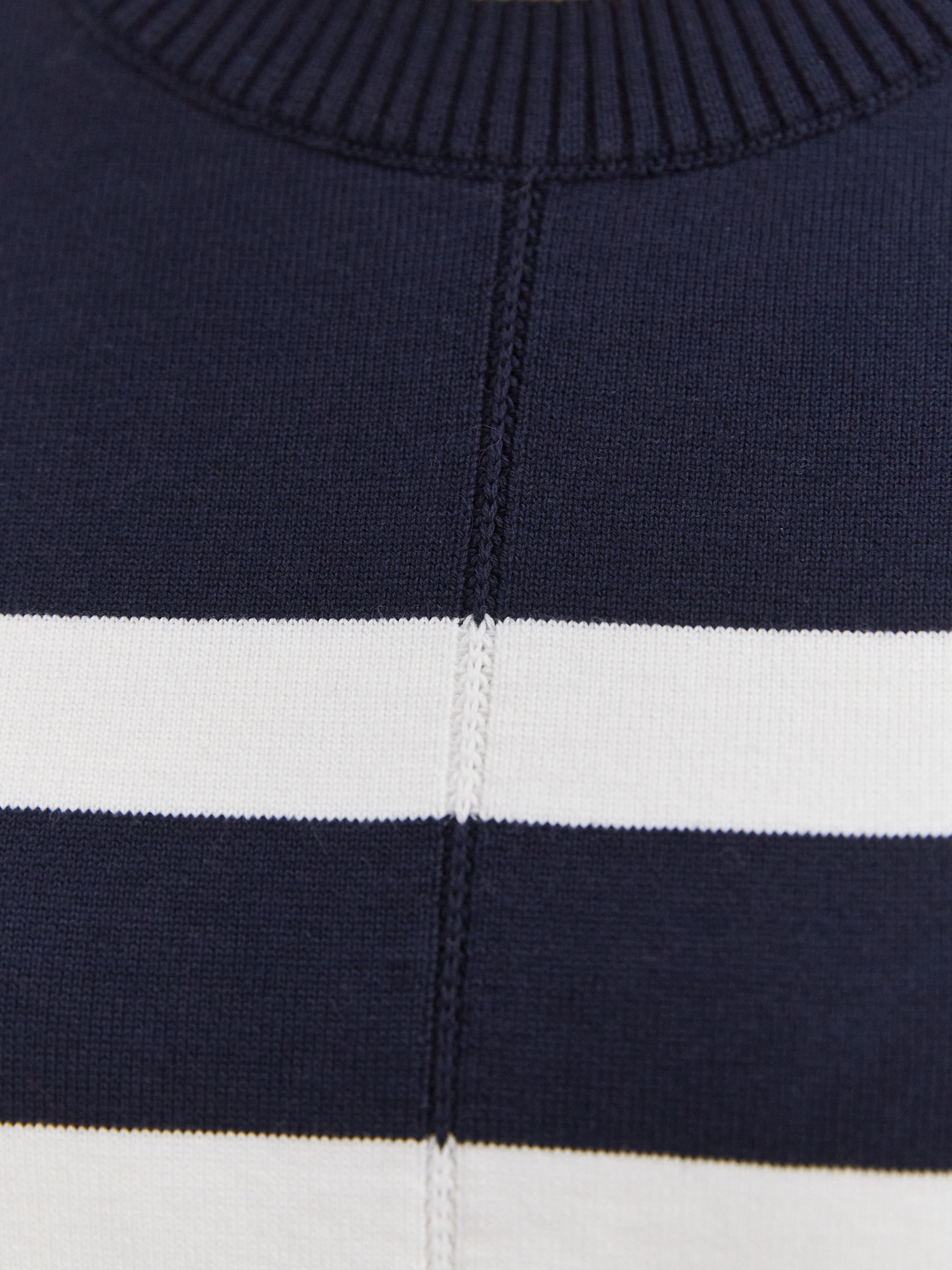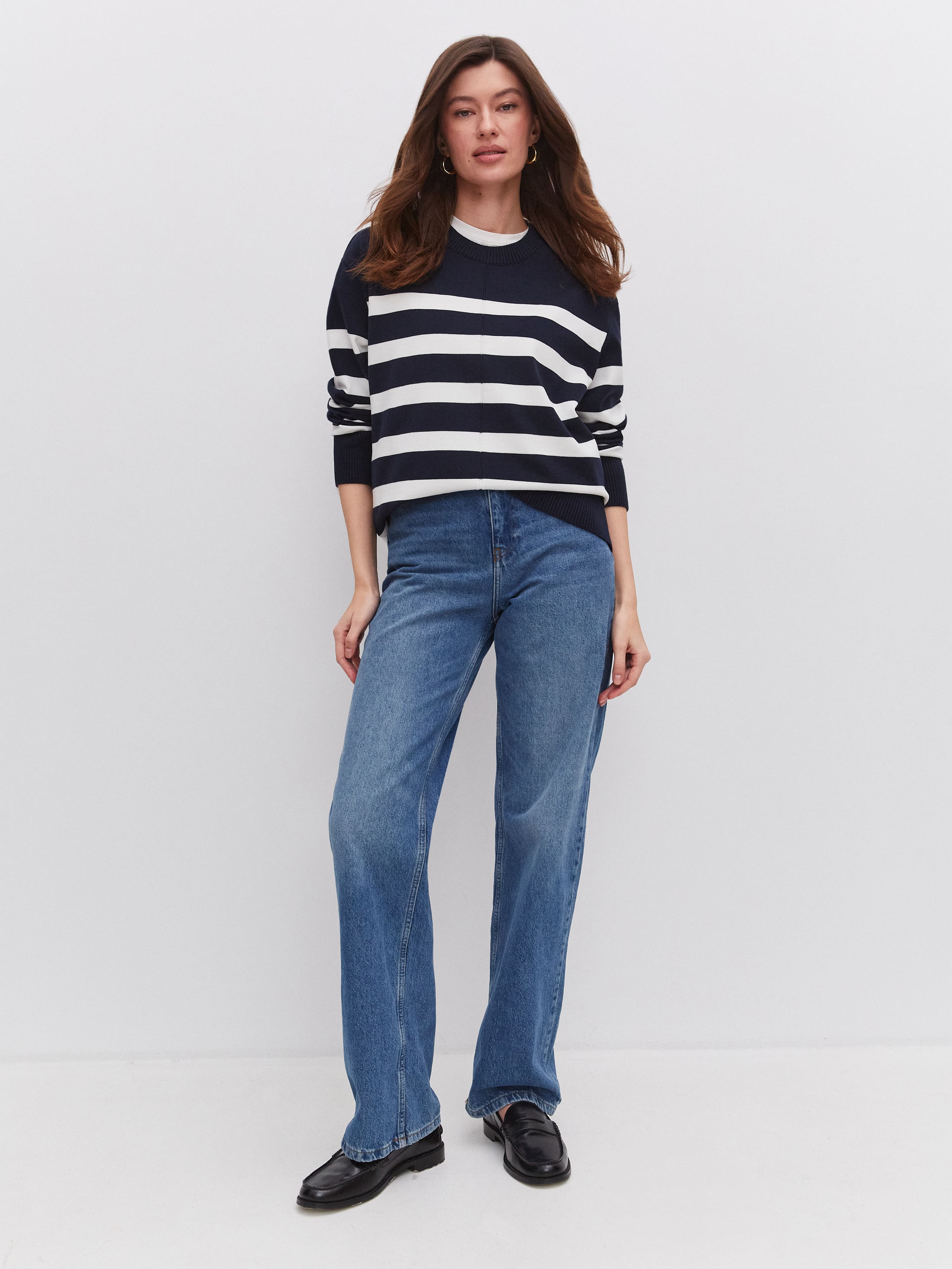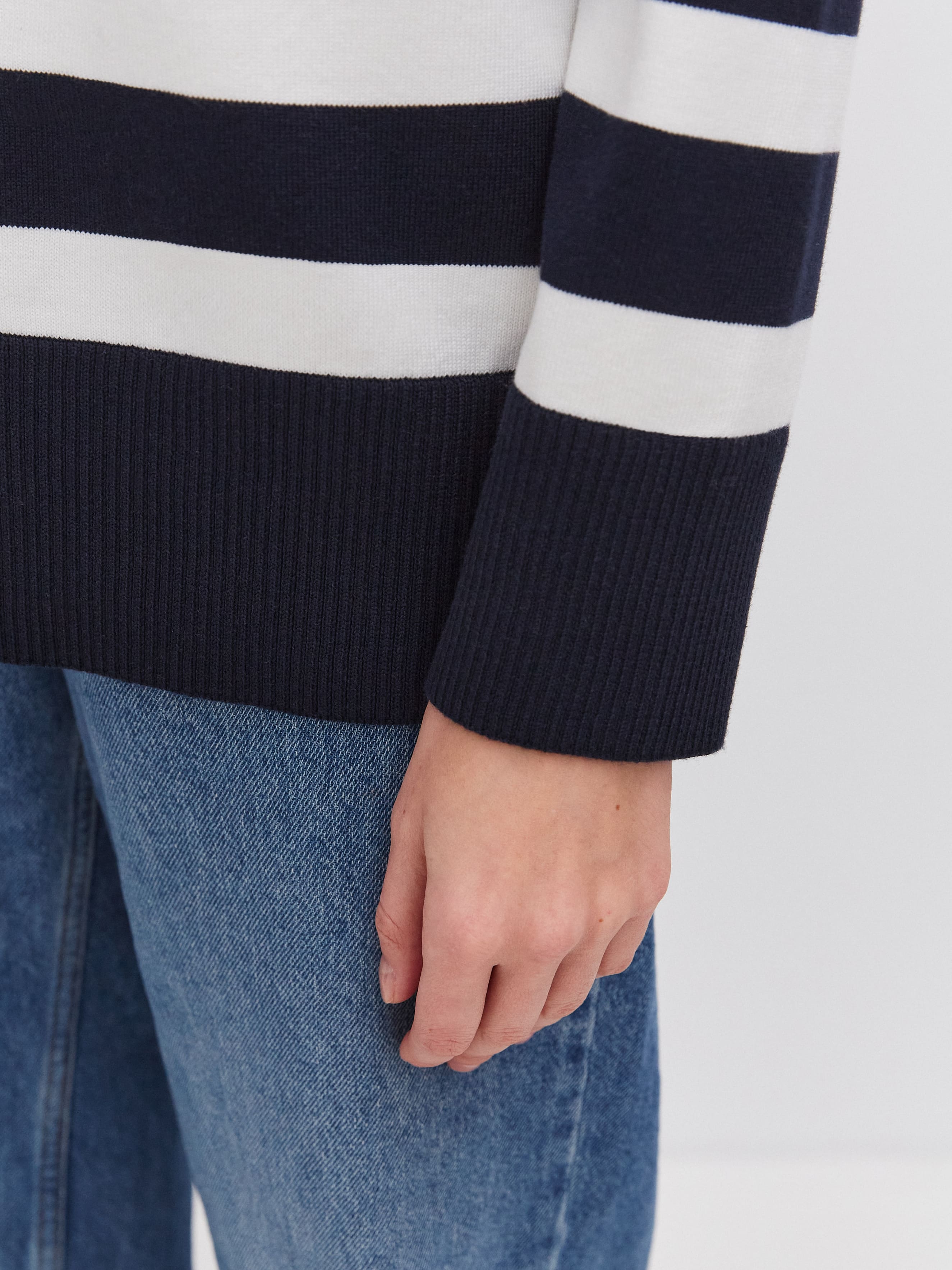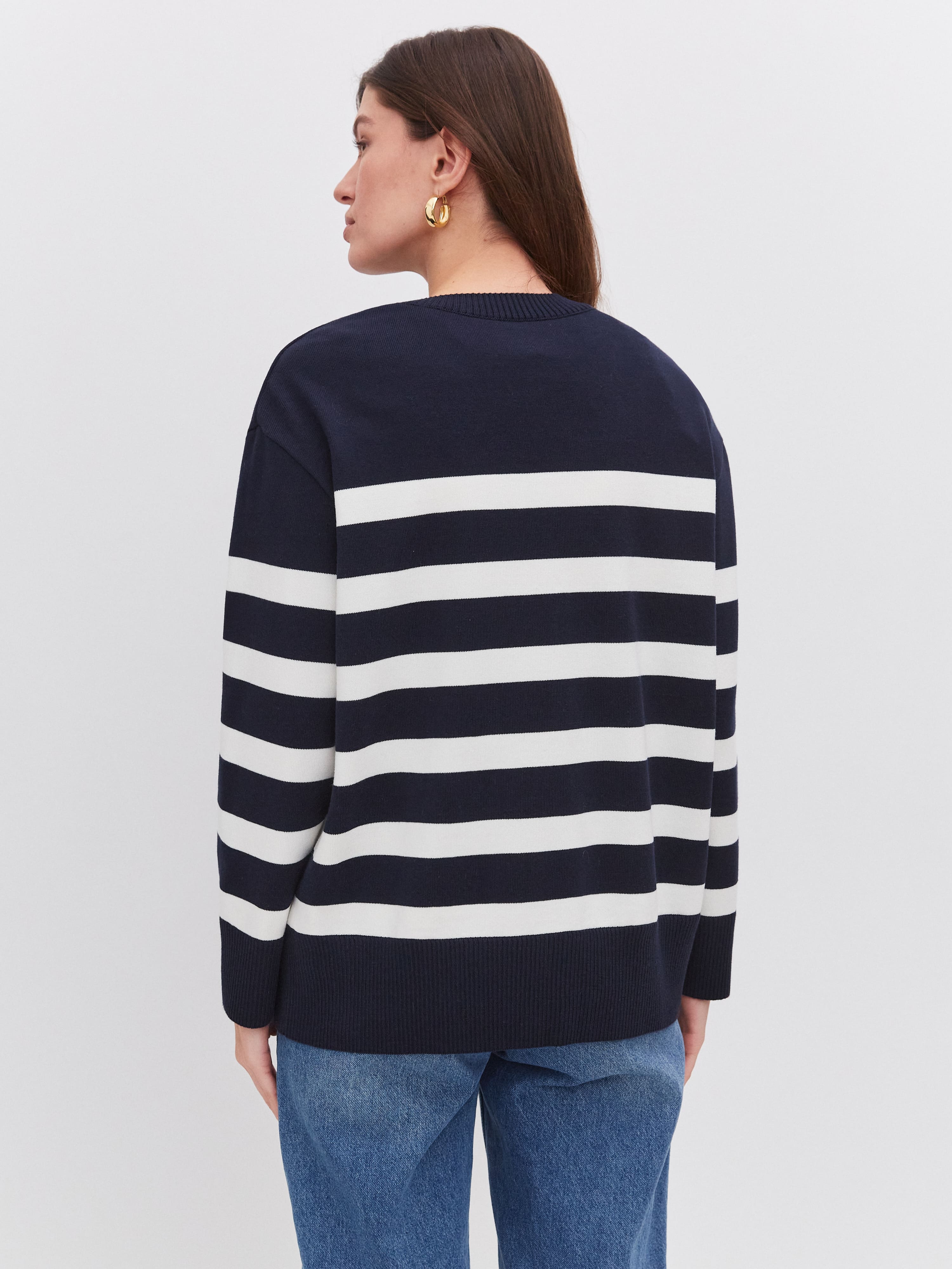 Фишка этого пластичного джемпера в стиле лаундж-вир – широкая полоска, продублированная на рукавах. Чтобы горизонтальный принт смотрелся менее объемно, по центру добавлена вертикальная строчка. Она визуально “собирает” и вытягивает силуэт. Идеальный джемпер для летнего отпуска, объединяющий в себе мягкость натурального хлопка и нежную прохладу вискозы.