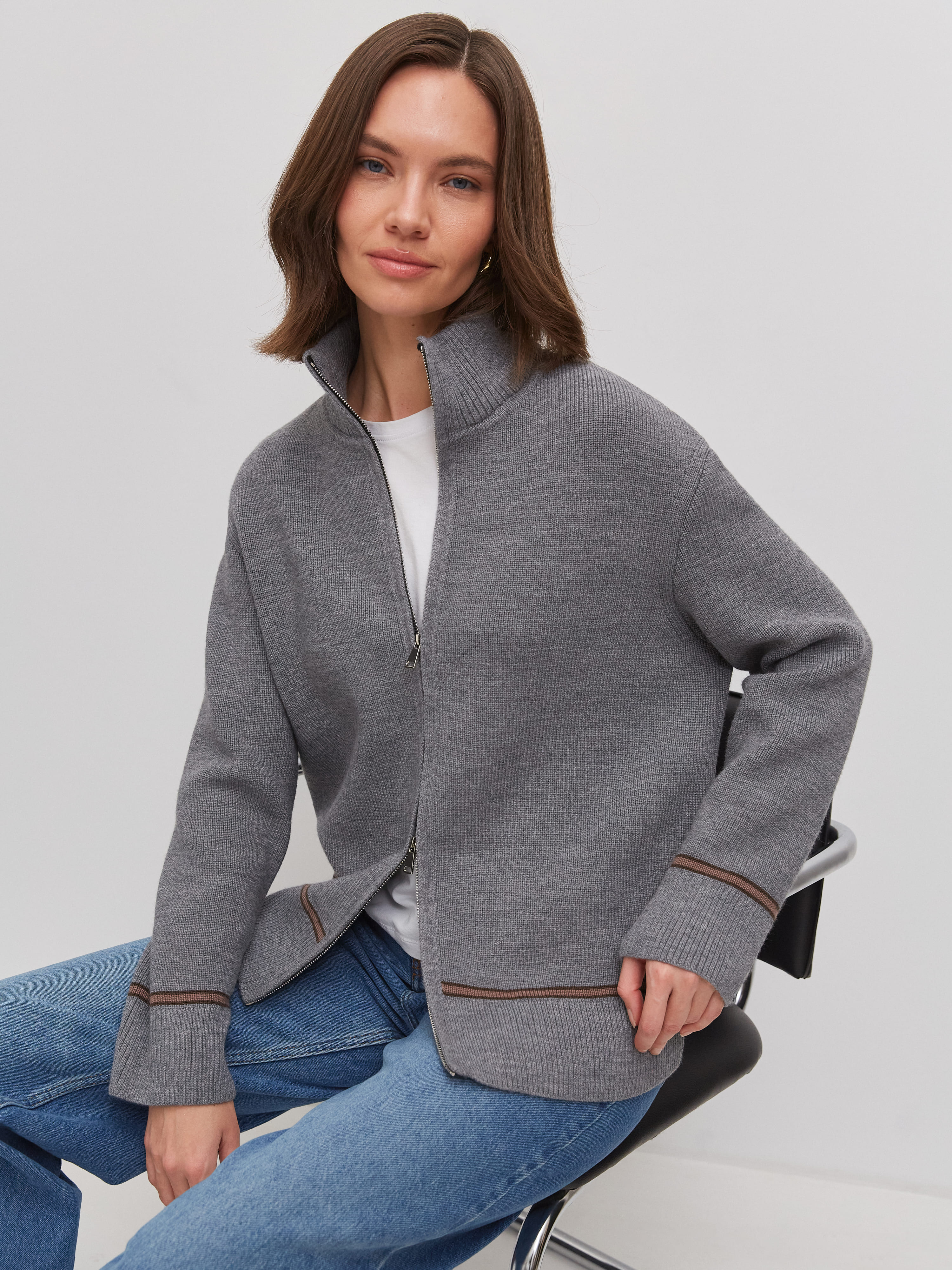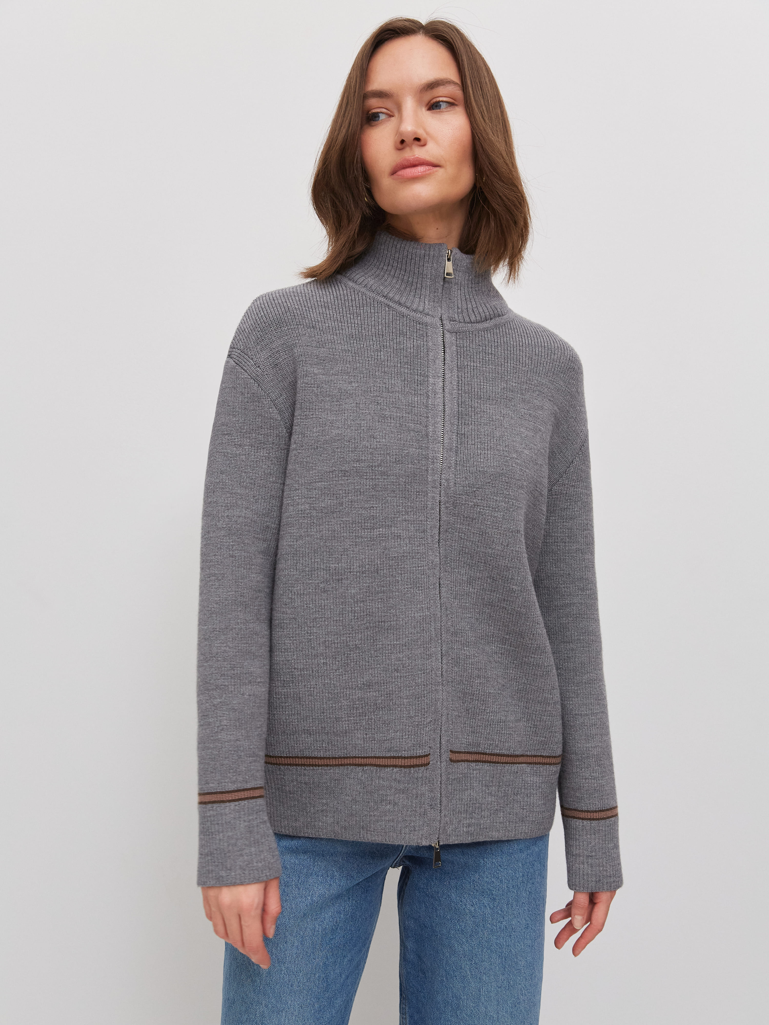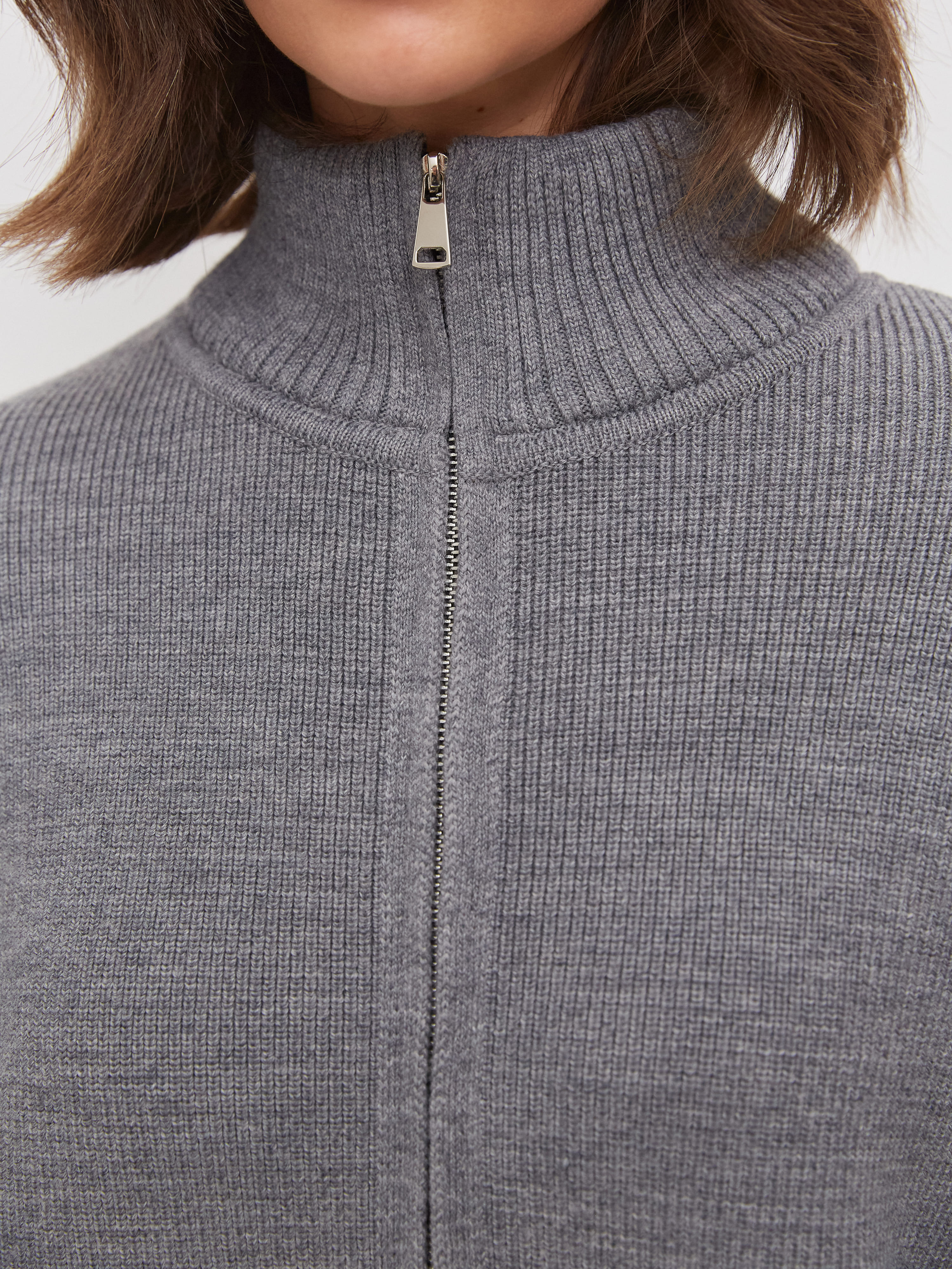 Супер теплый апре-ски джемпер, задача которого – укутывать, создавать тактильную магию и защищать шею высокой горловиной. Простота силуэта модели компенсируется несколькими вариантами застежки. Двойная молния позволяет расстегивать изделие снизу и сверху одновременно. Обратите внимание: джемпер не уходит в экстремальный оверсайз, но под ним достаточно места для красивого нижнего слоя. Основу трикотажа составляет натуральная шерсть австралийского мериноса – лучший вид пряжи для зимних прогулок и активного отдыха на горнолыжном курорте.