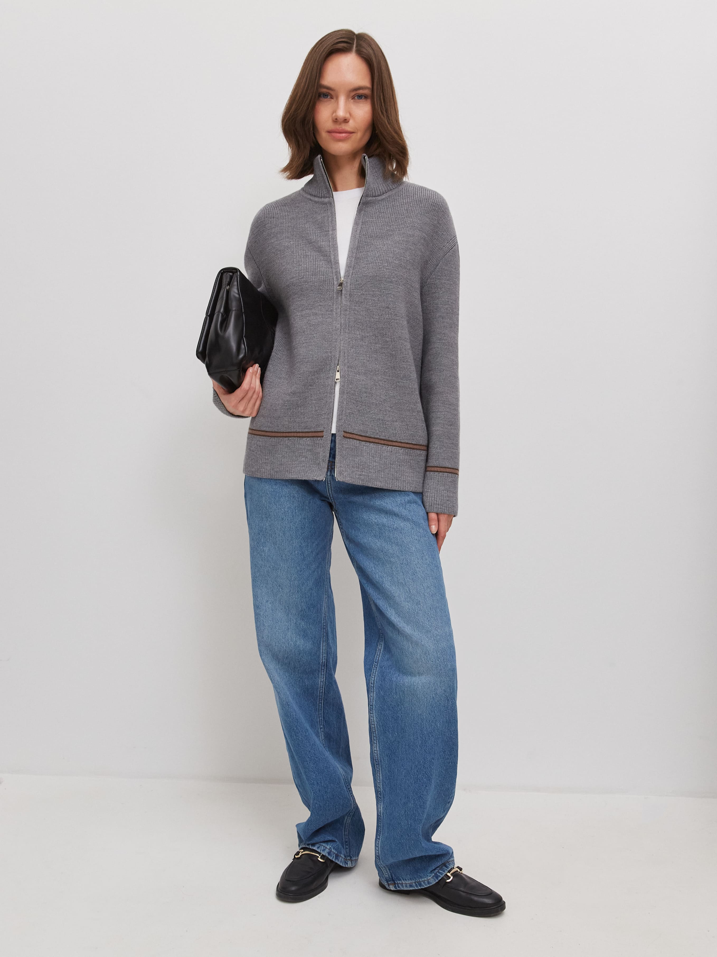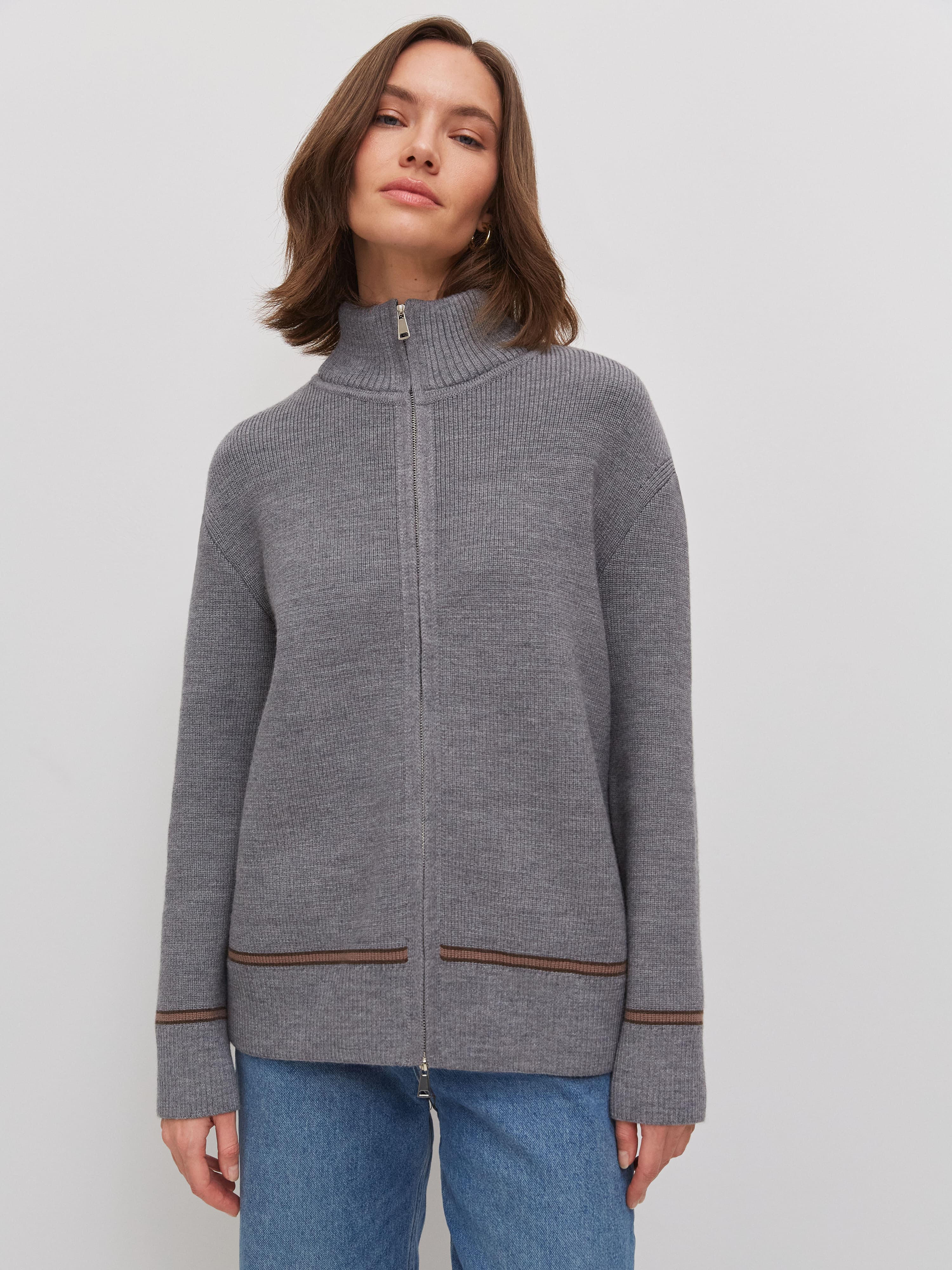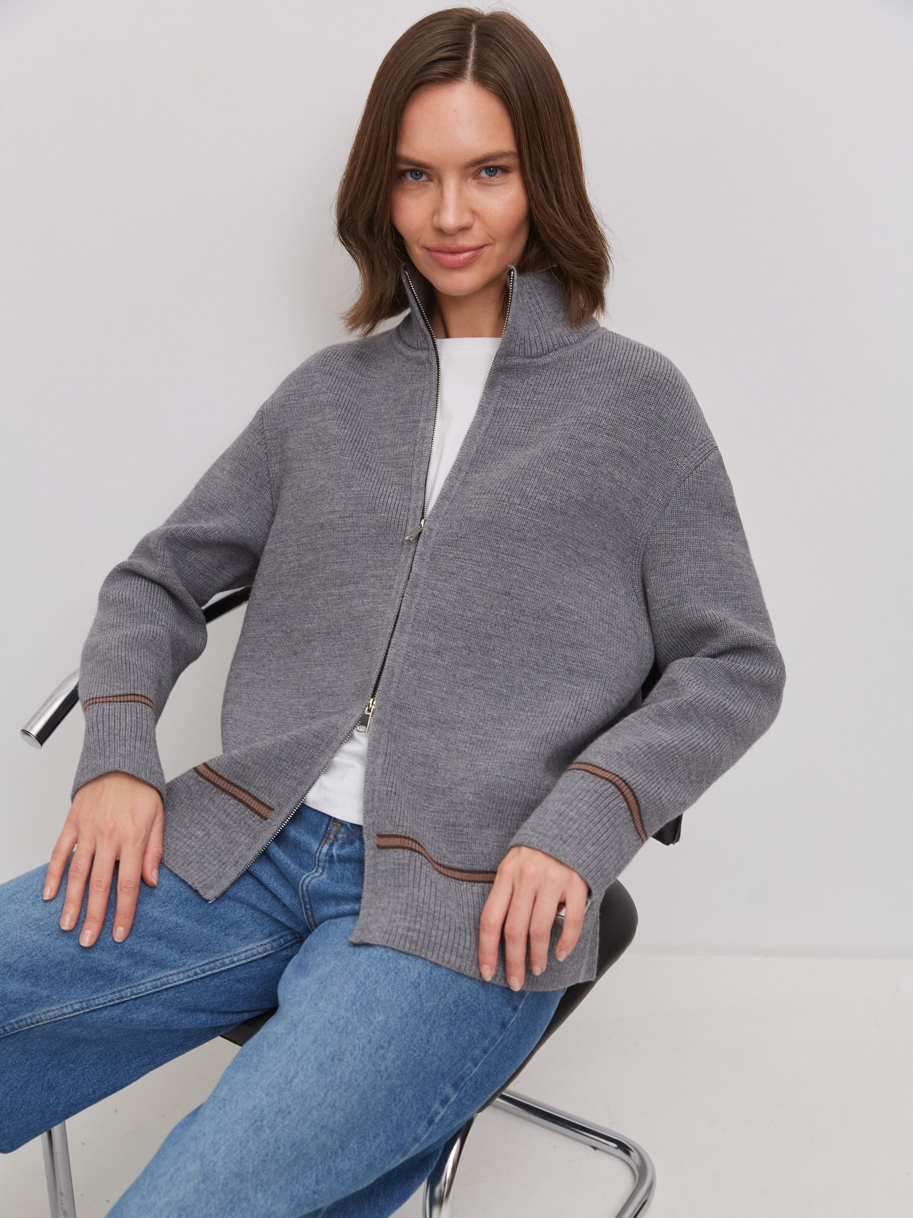 Супер теплый апре-ски джемпер, задача которого – укутывать, создавать тактильную магию и защищать шею высокой горловиной. Простота силуэта модели компенсируется несколькими вариантами застежки. Двойная молния позволяет расстегивать изделие снизу и сверху одновременно. Обратите внимание: джемпер не уходит в экстремальный оверсайз, но под ним достаточно места для красивого нижнего слоя. Основу трикотажа составляет натуральная шерсть австралийского мериноса – лучший вид пряжи для зимних прогулок и активного отдыха на горнолыжном курорте.