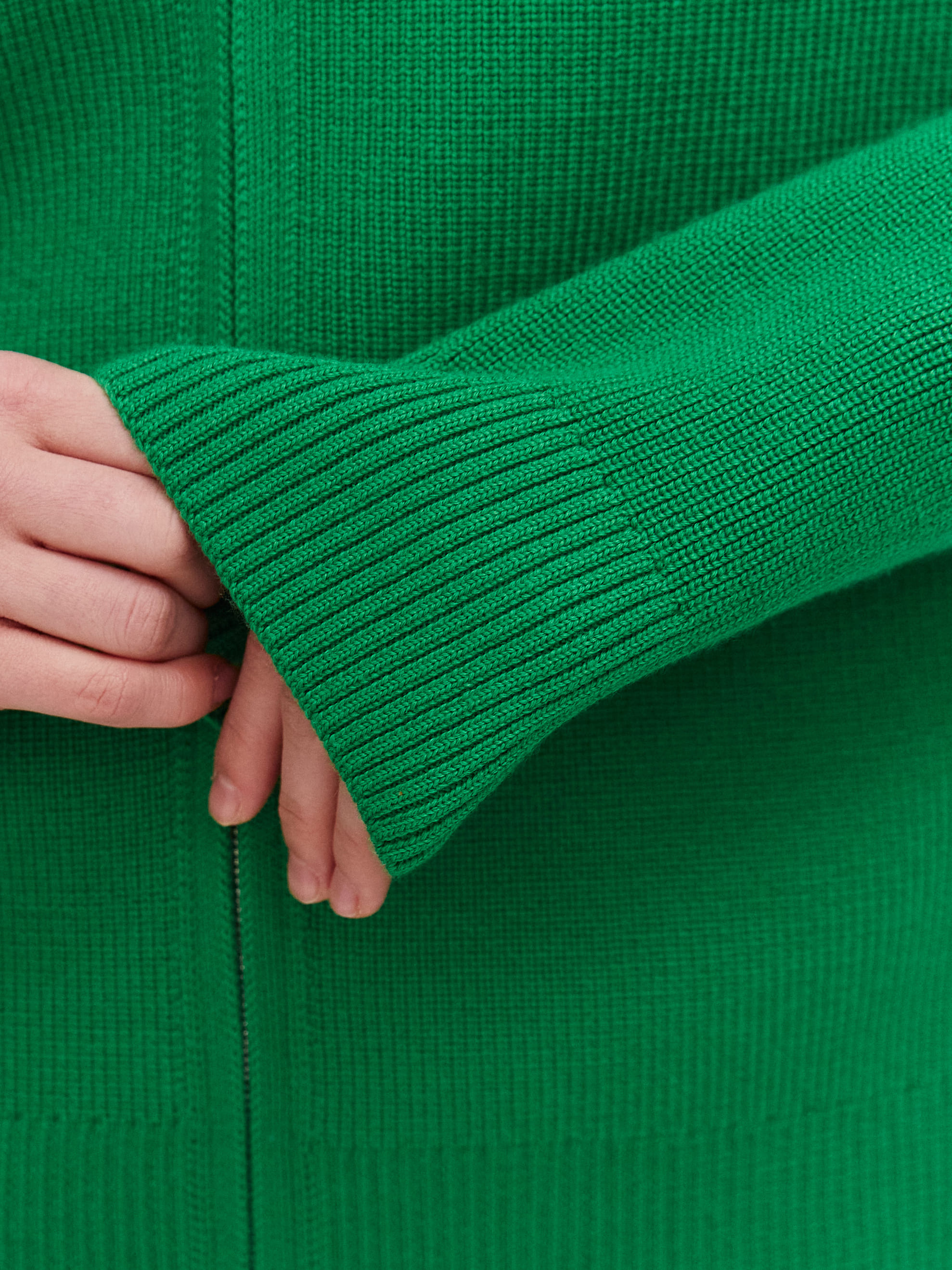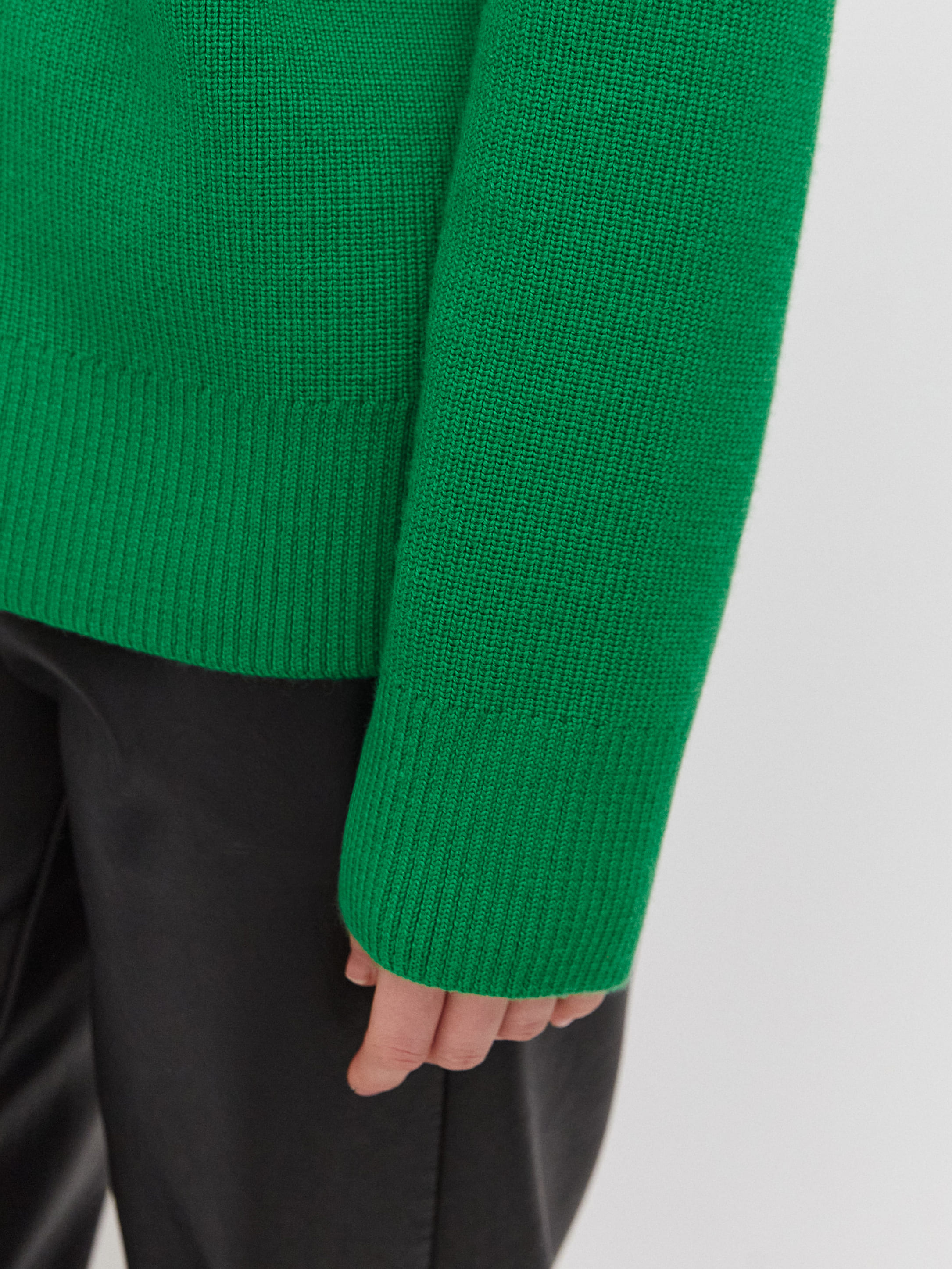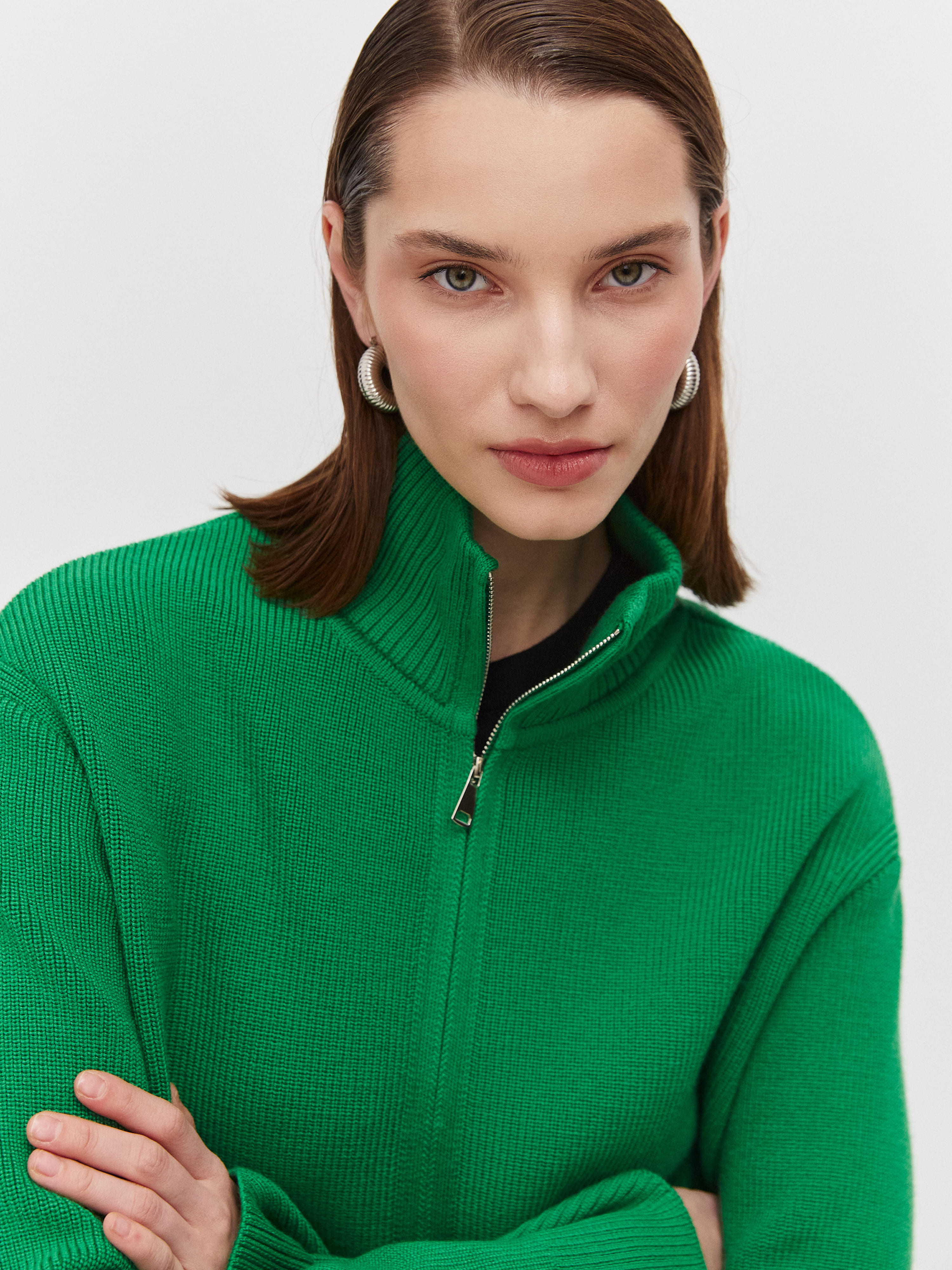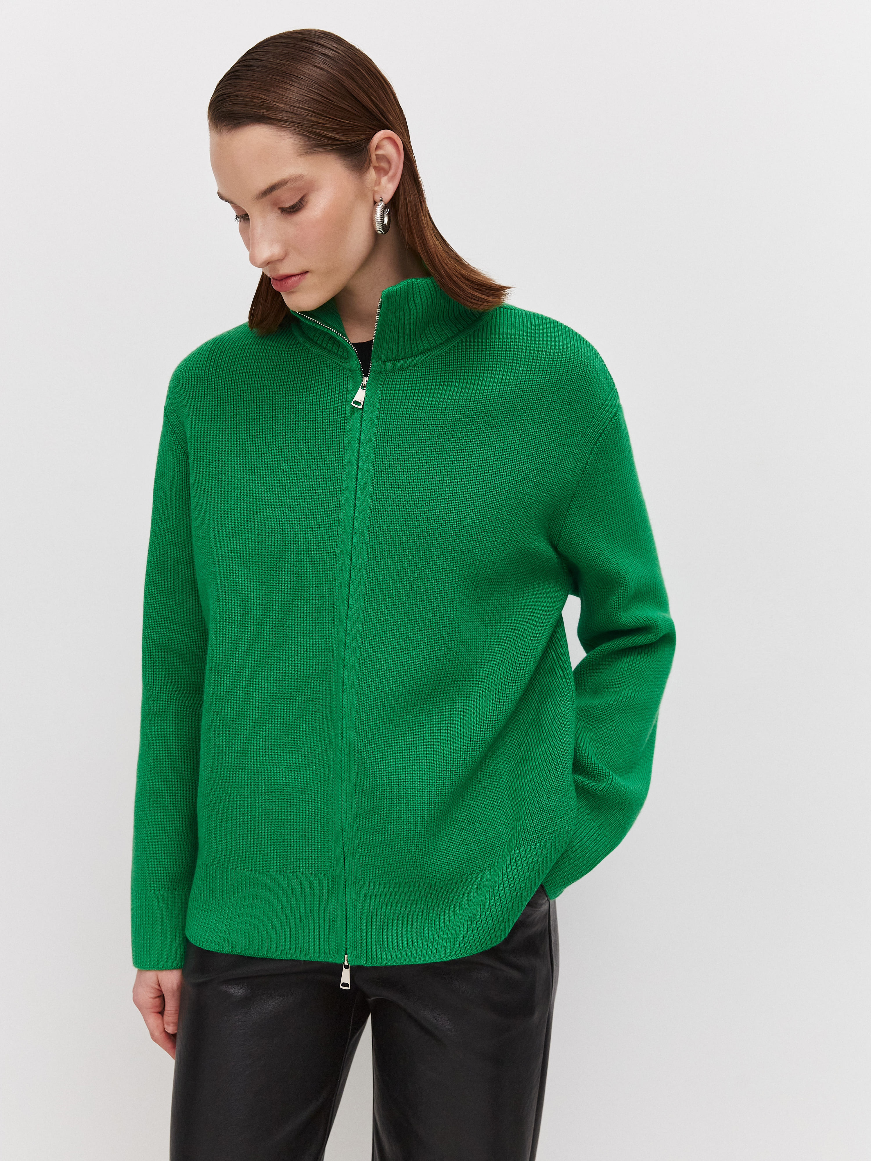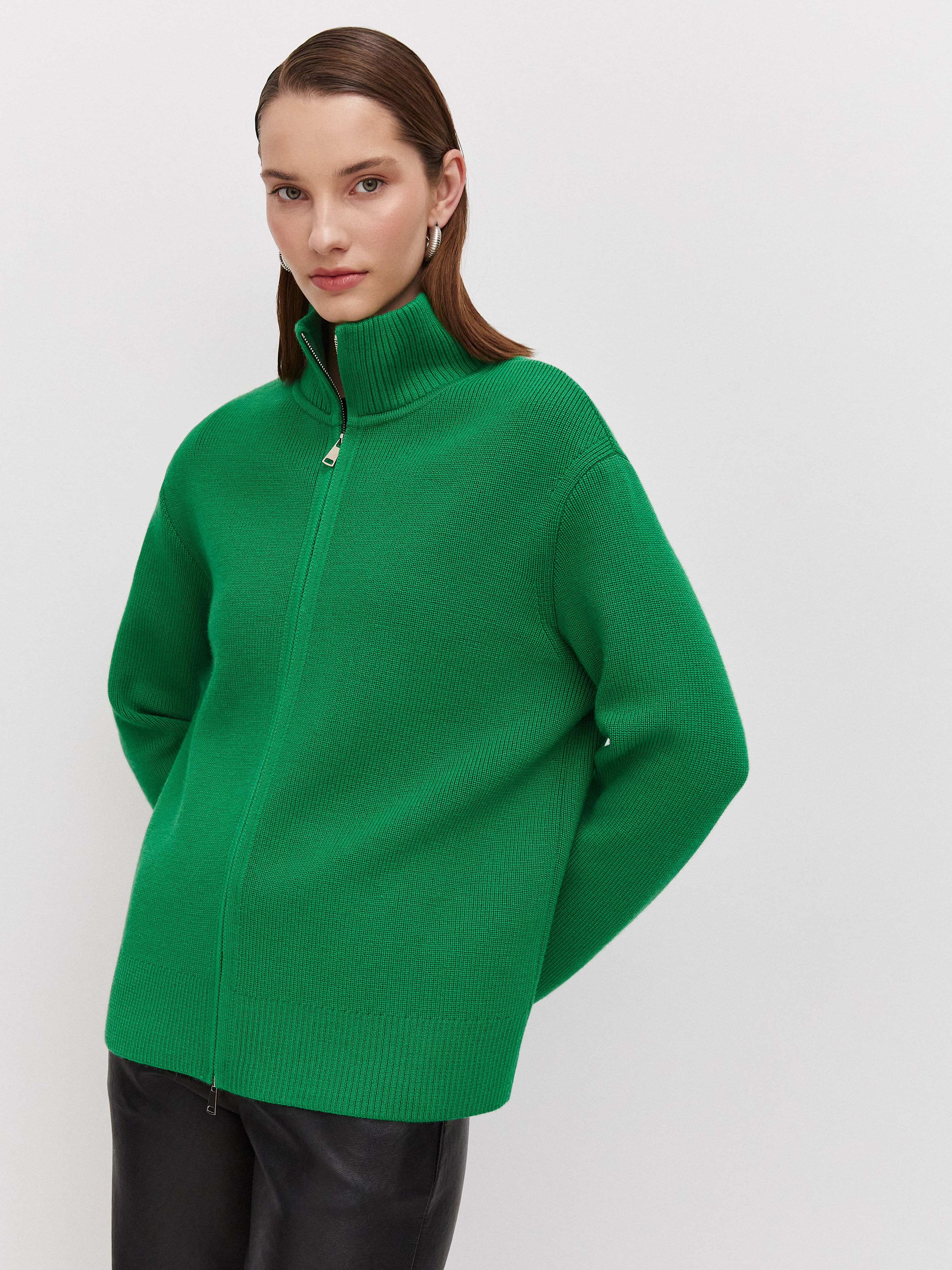 Супер теплый апре-ски джемпер, задача которого – укутывать, создавать тактильную магию и защищать шею высокой горловиной. Простота силуэта модели компенсируется несколькими вариантами застежки. Двойная молния позволяет расстегивать изделие снизу и сверху одновременно. Обратите внимание: джемпер не уходит в экстремальный оверсайз, но под ним достаточно места для красивого нижнего слоя. Основу трикотажа составляет натуральная шерсть австралийского мериноса – лучший вид пряжи для зимних прогулок и активного отдыха на горнолыжном курорте.