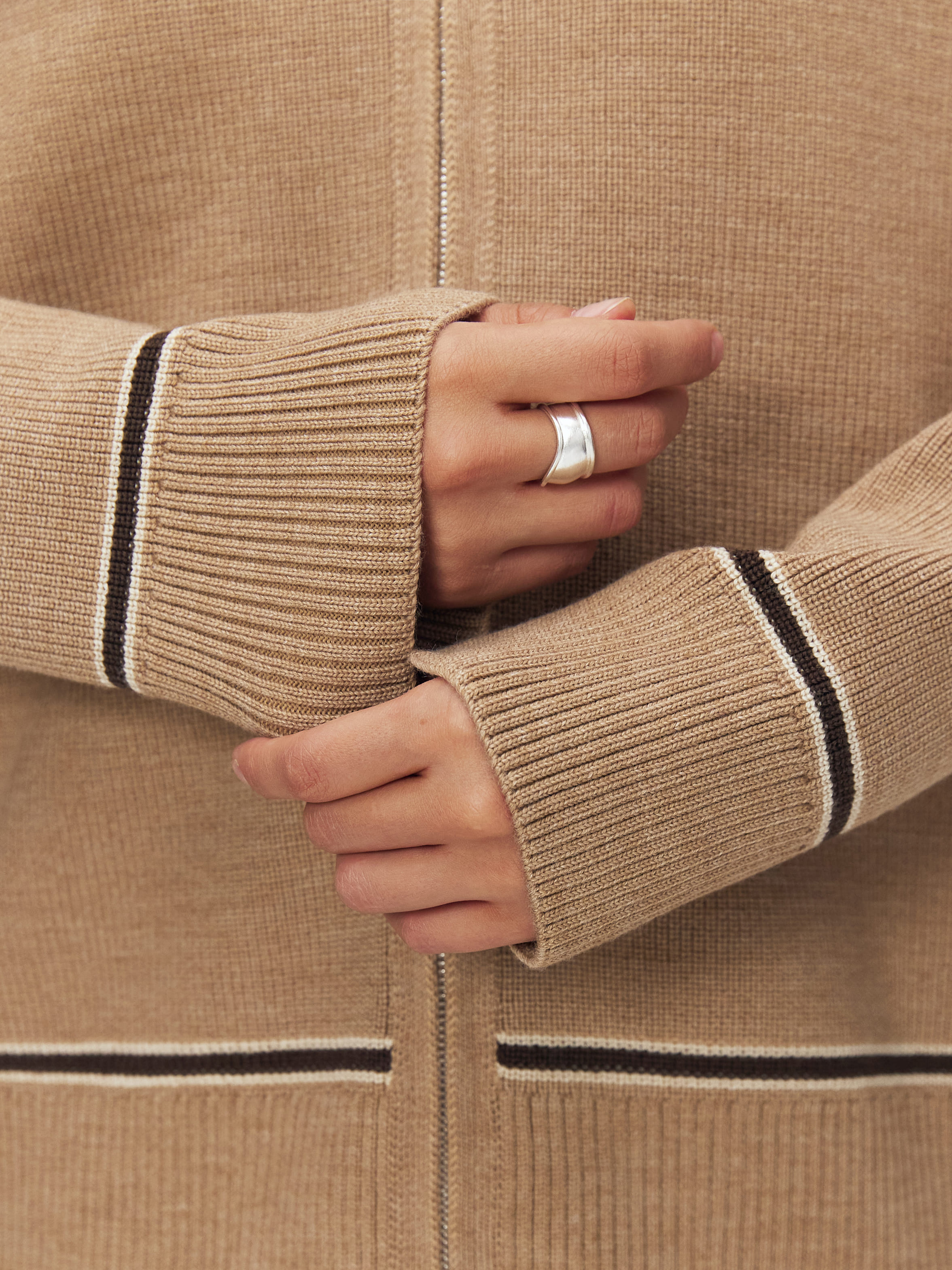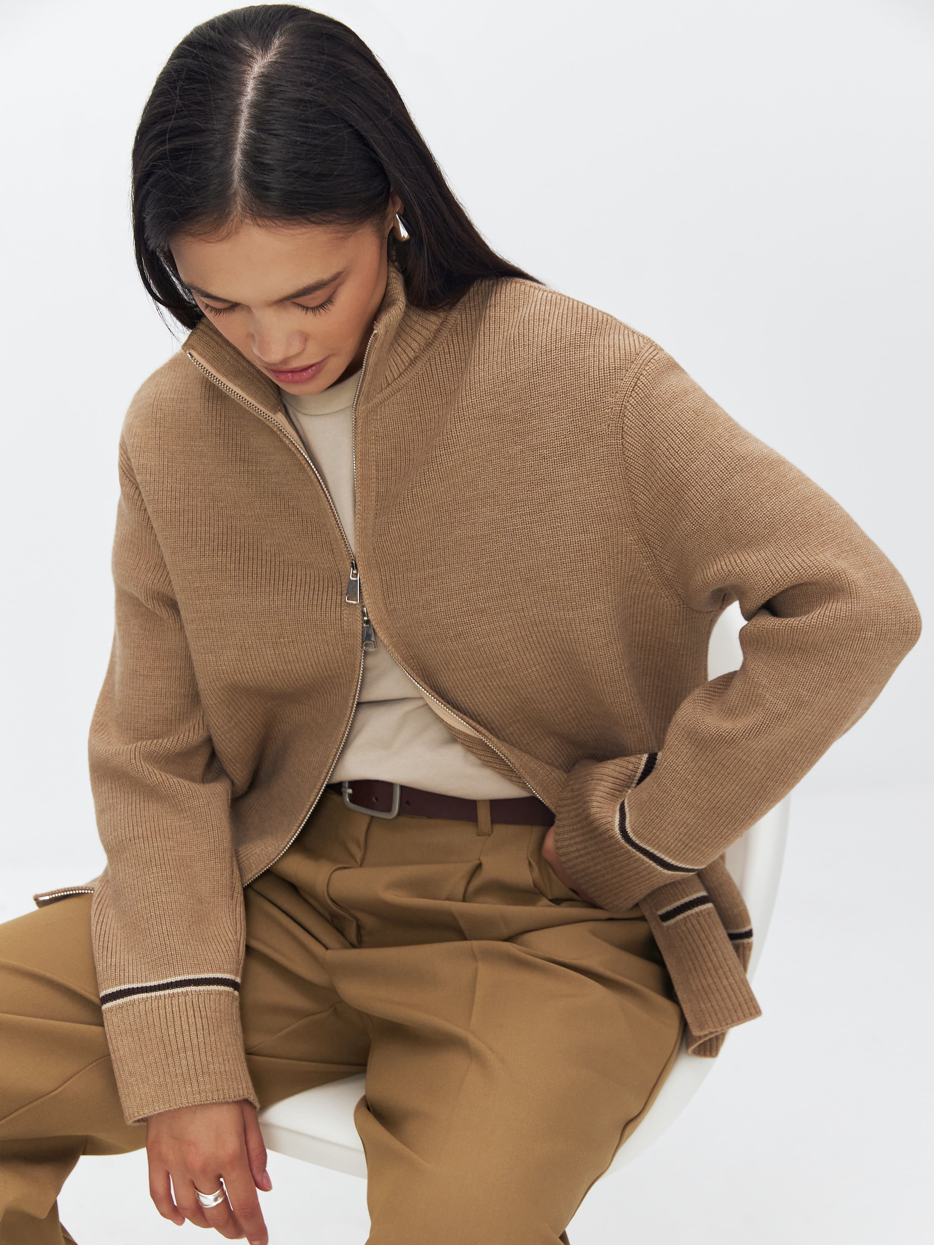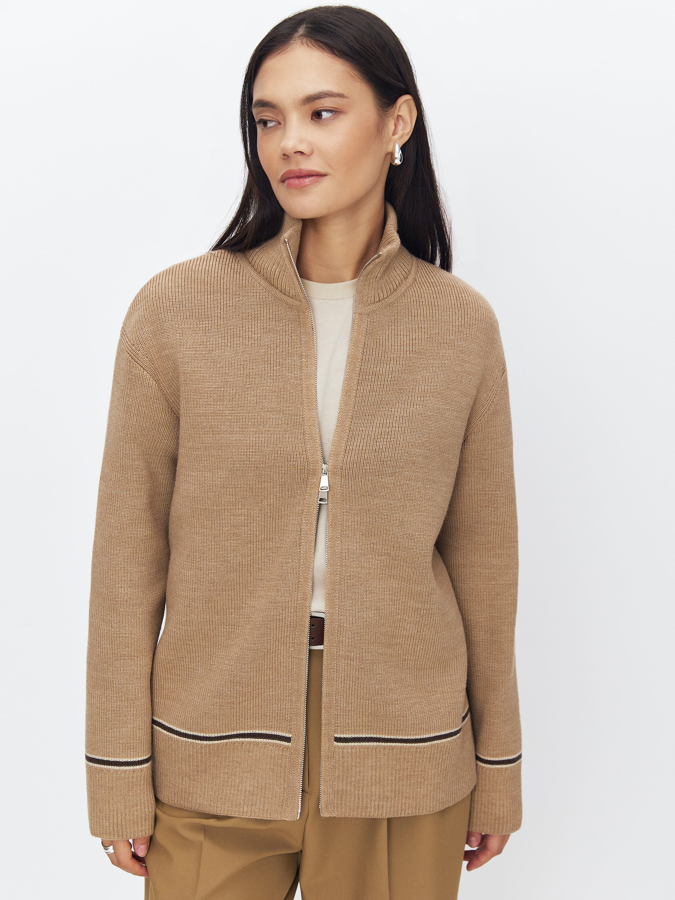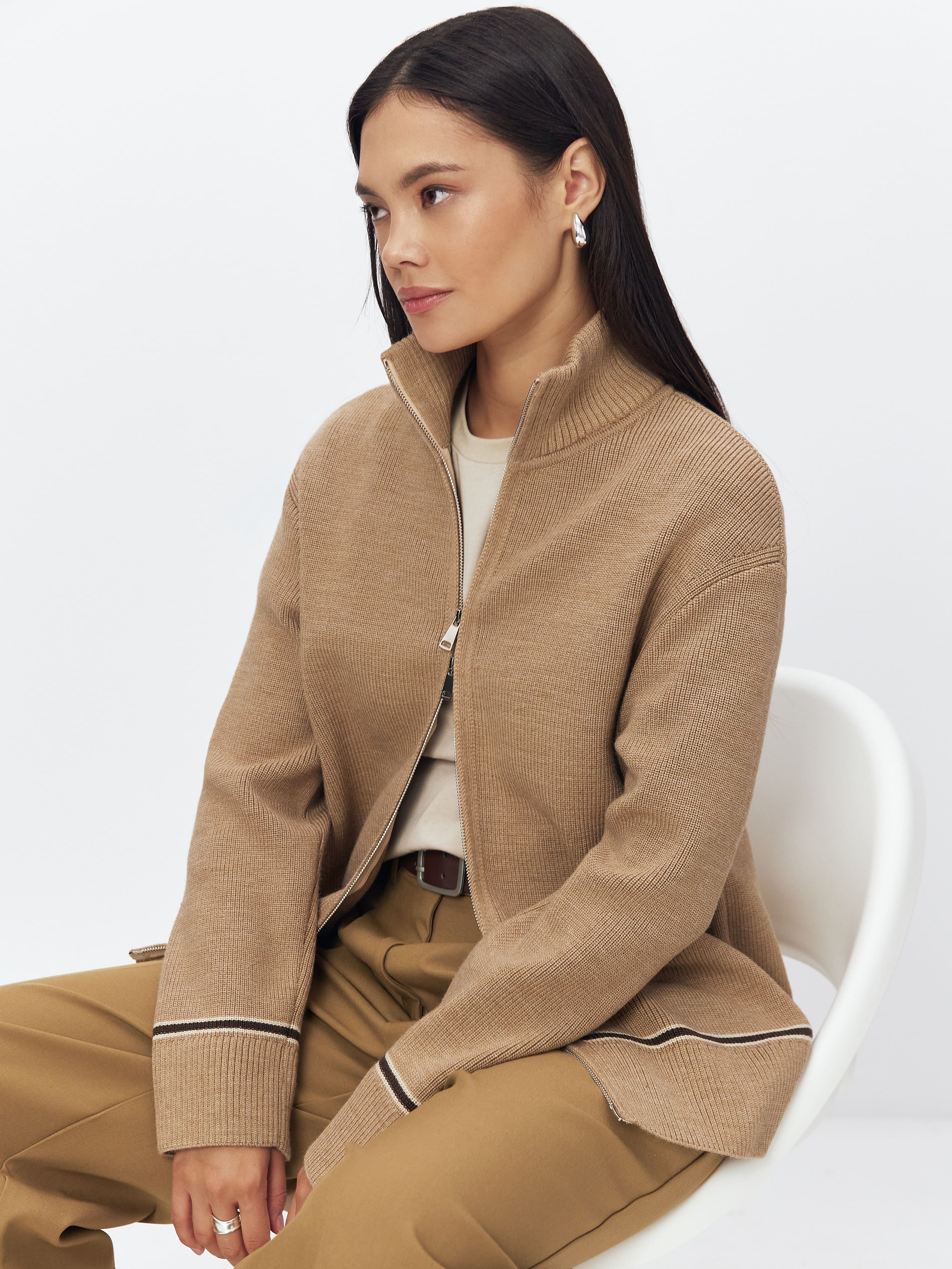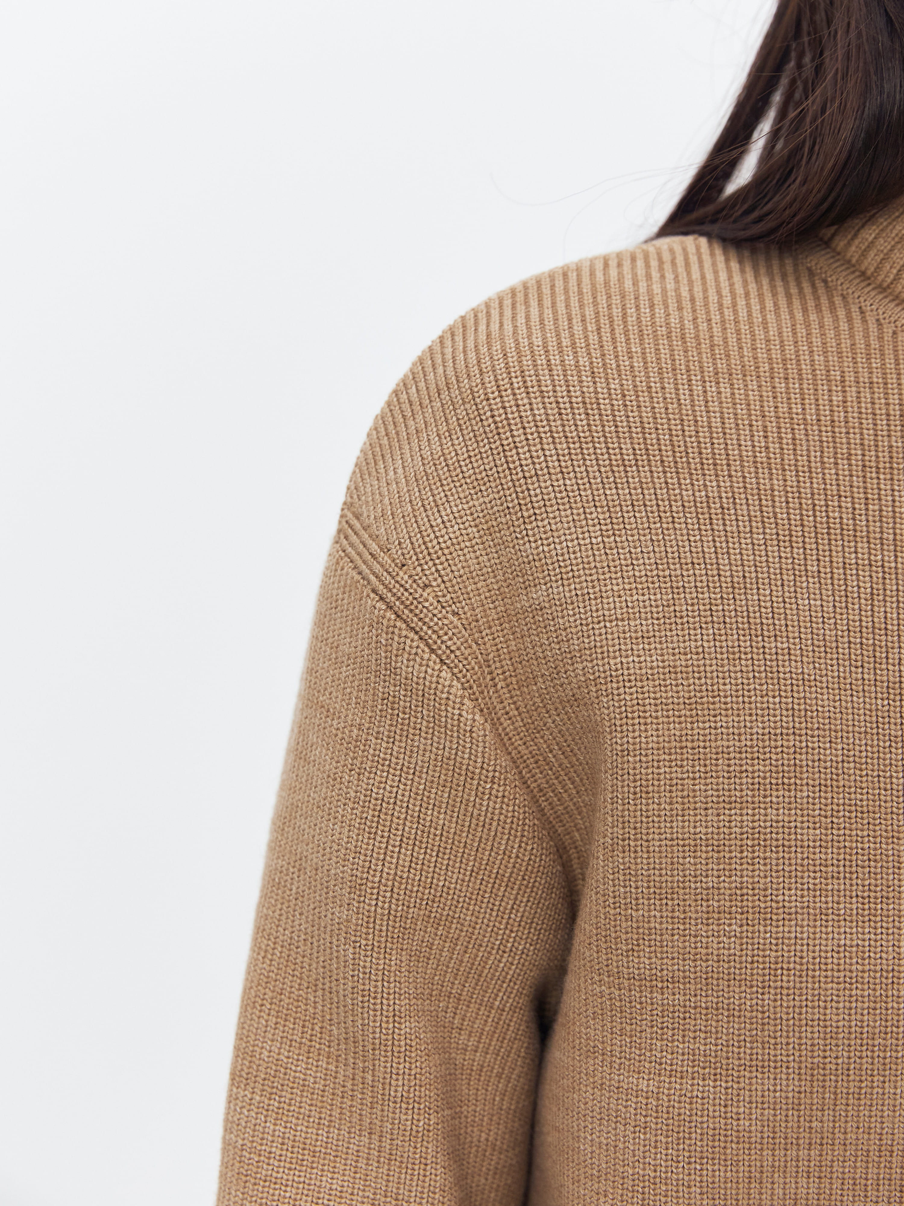 Супер теплый апре-ски джемпер, задача которого – укутывать, создавать тактильную магию и защищать шею высокой горловиной. Простота силуэта модели компенсируется несколькими вариантами застежки. Двойная молния позволяет расстегивать изделие снизу и сверху одновременно. Обратите внимание: джемпер не уходит в экстремальный оверсайз, но под ним достаточно места для красивого нижнего слоя. Основу трикотажа составляет натуральная шерсть австралийского мериноса – лучший вид пряжи для зимних прогулок и активного отдыха на горнолыжном курорте.